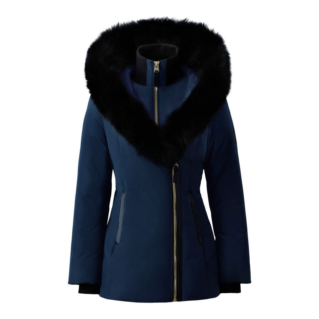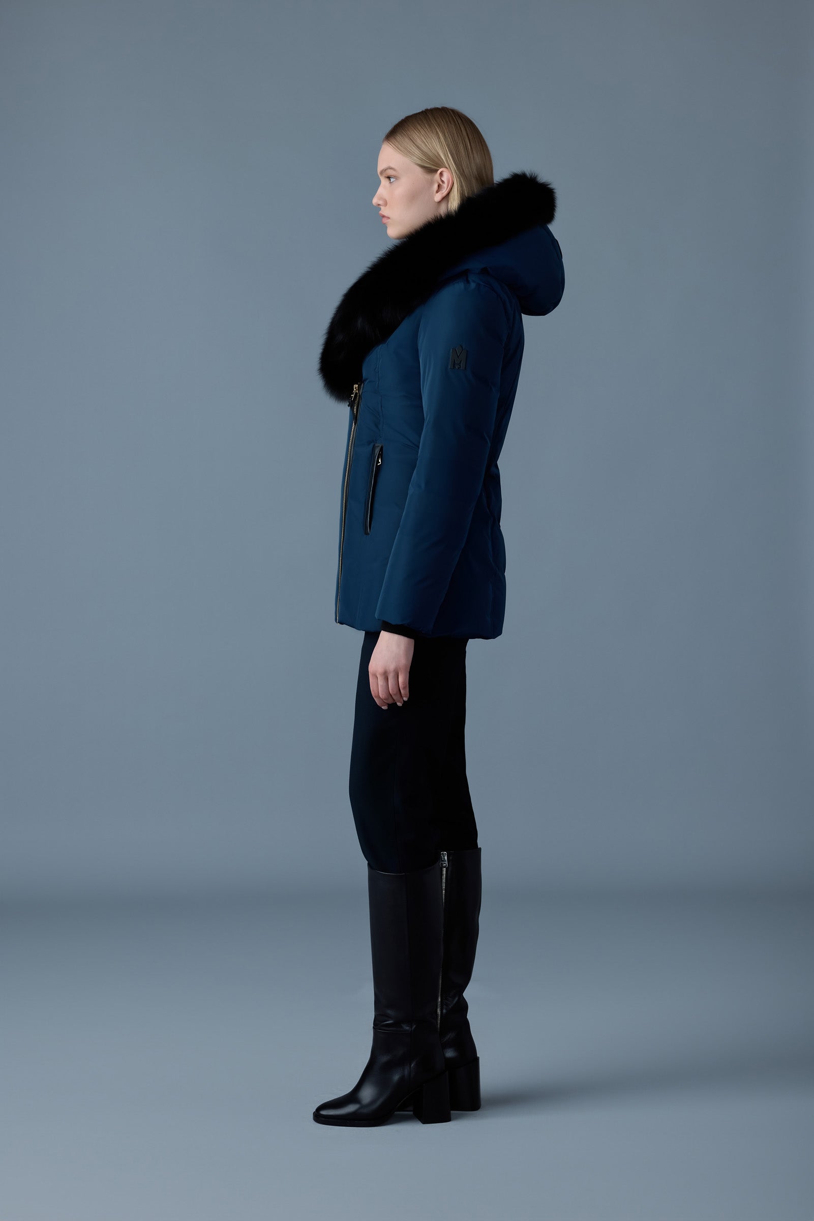 ADALI-BX is a recycled down coat for women featuring our Signature Collar with blue fox fur and an asymmetrical zip closure. Lab tested to protect with weight-to-protection ratio, it has an inner bib with rib collar, hidden hood toggle, and storm cuffs. Water resistant, repellent, and windproof, insulated leather welt pockets add warmth and protection. A design-forward winter essential elevated with thoughtful tailoring.