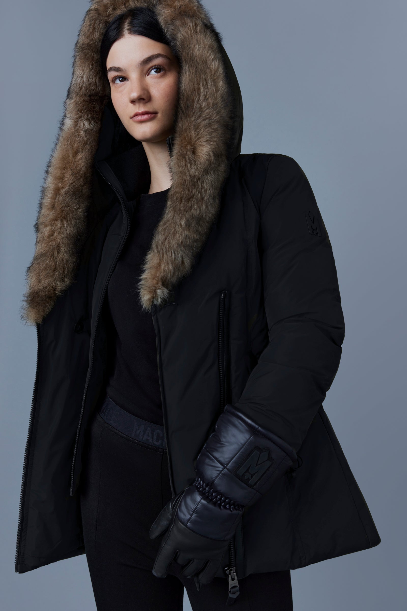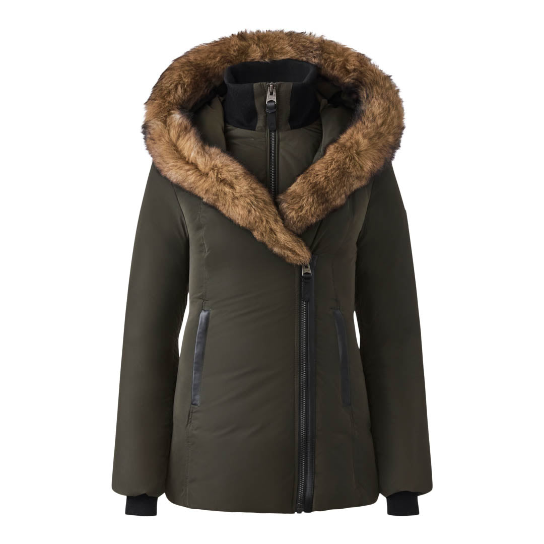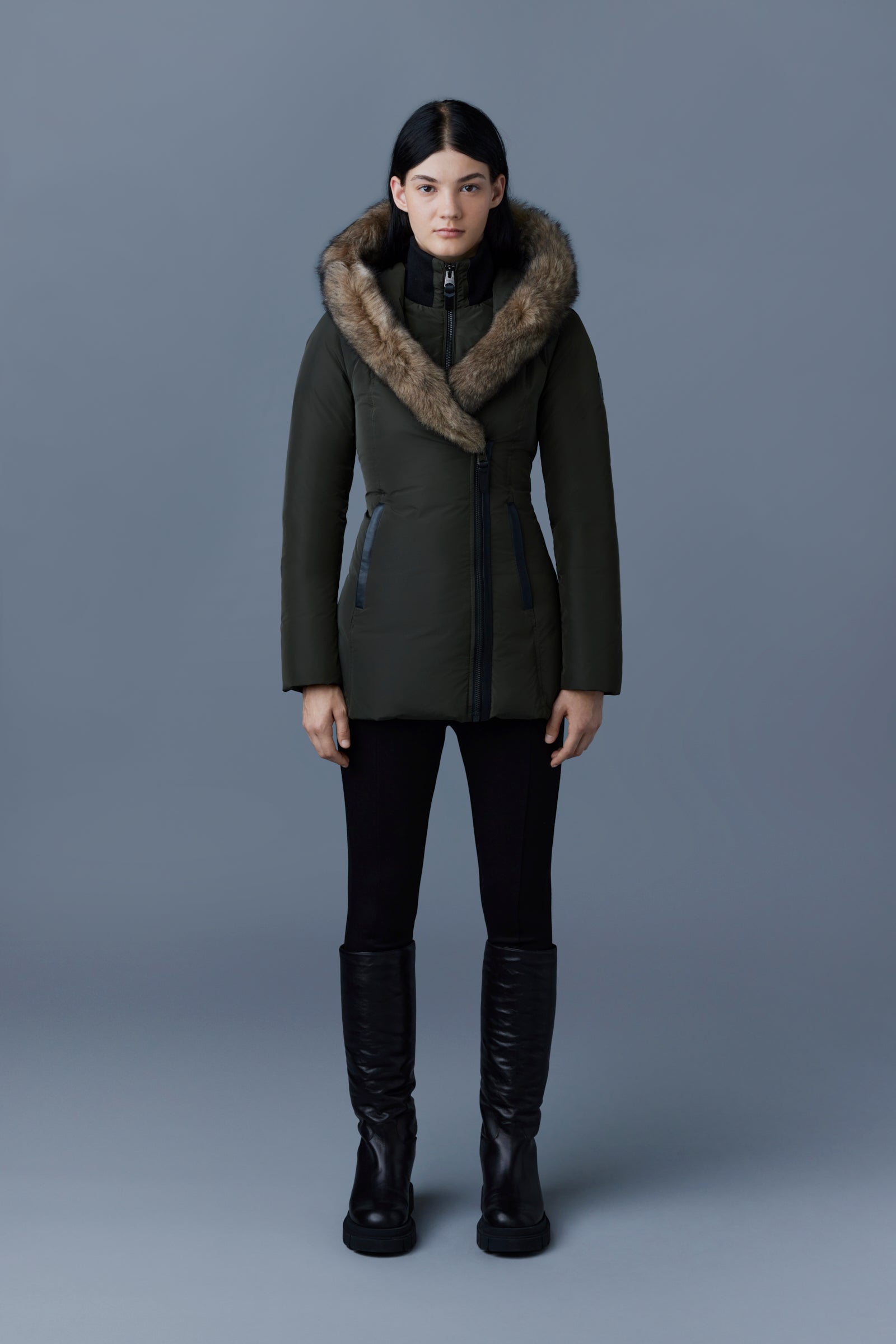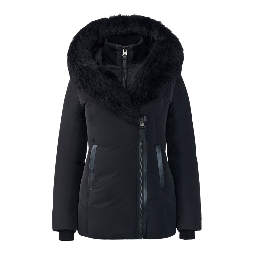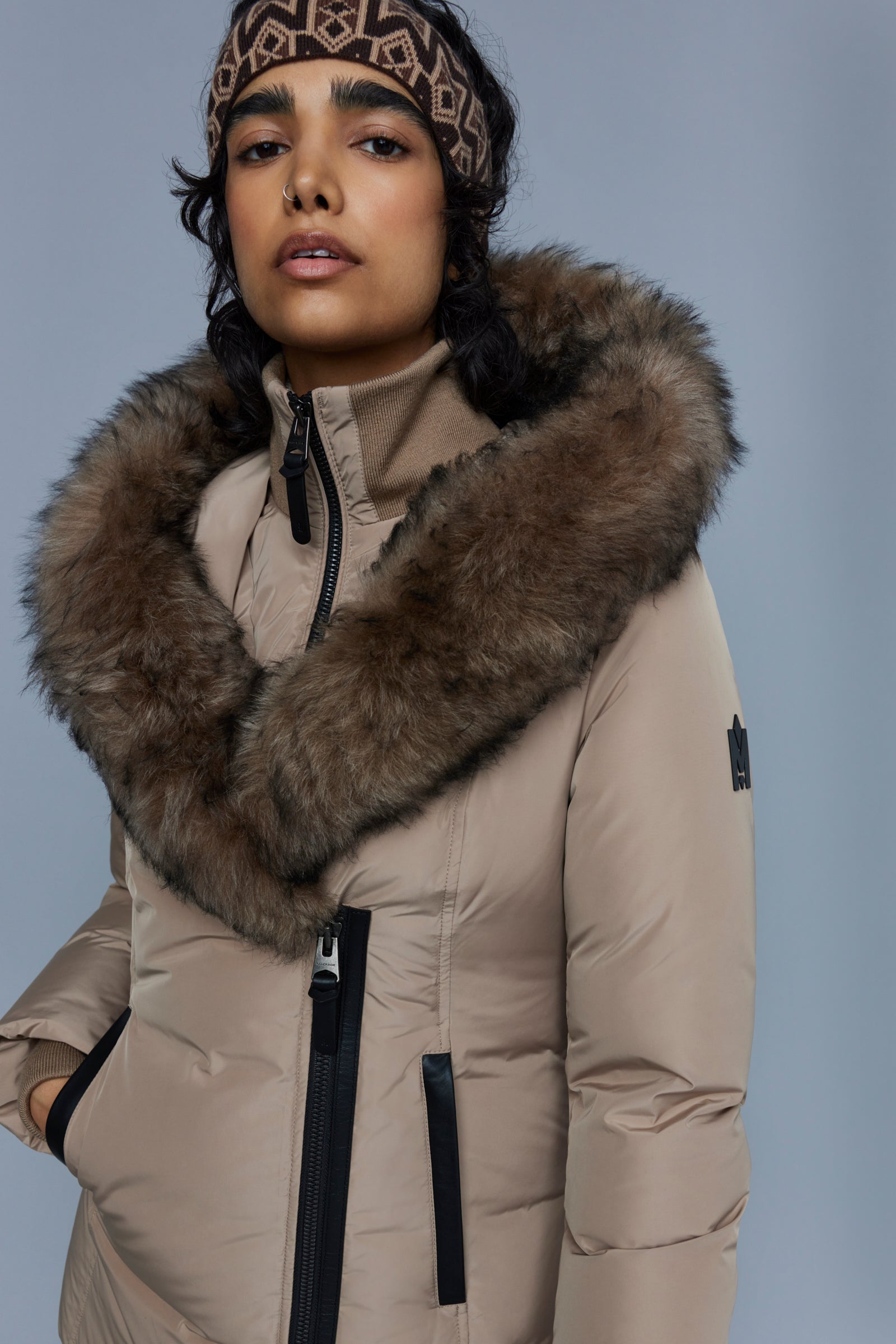 ADALI-SH is a recycled down coat for women featuring our Signature Collar with sheepskin trim and an asymmetrical zip closure. Lab tested to protect with weight-to-protection ratio, it has an inner bib with rib collar, hidden hood toggle, and storm cuffs. Water resistant, repellent, and windproof, insulated leather welt pockets add warmth and protection. A design-forward winter essential elevated with thoughtful tailoring.