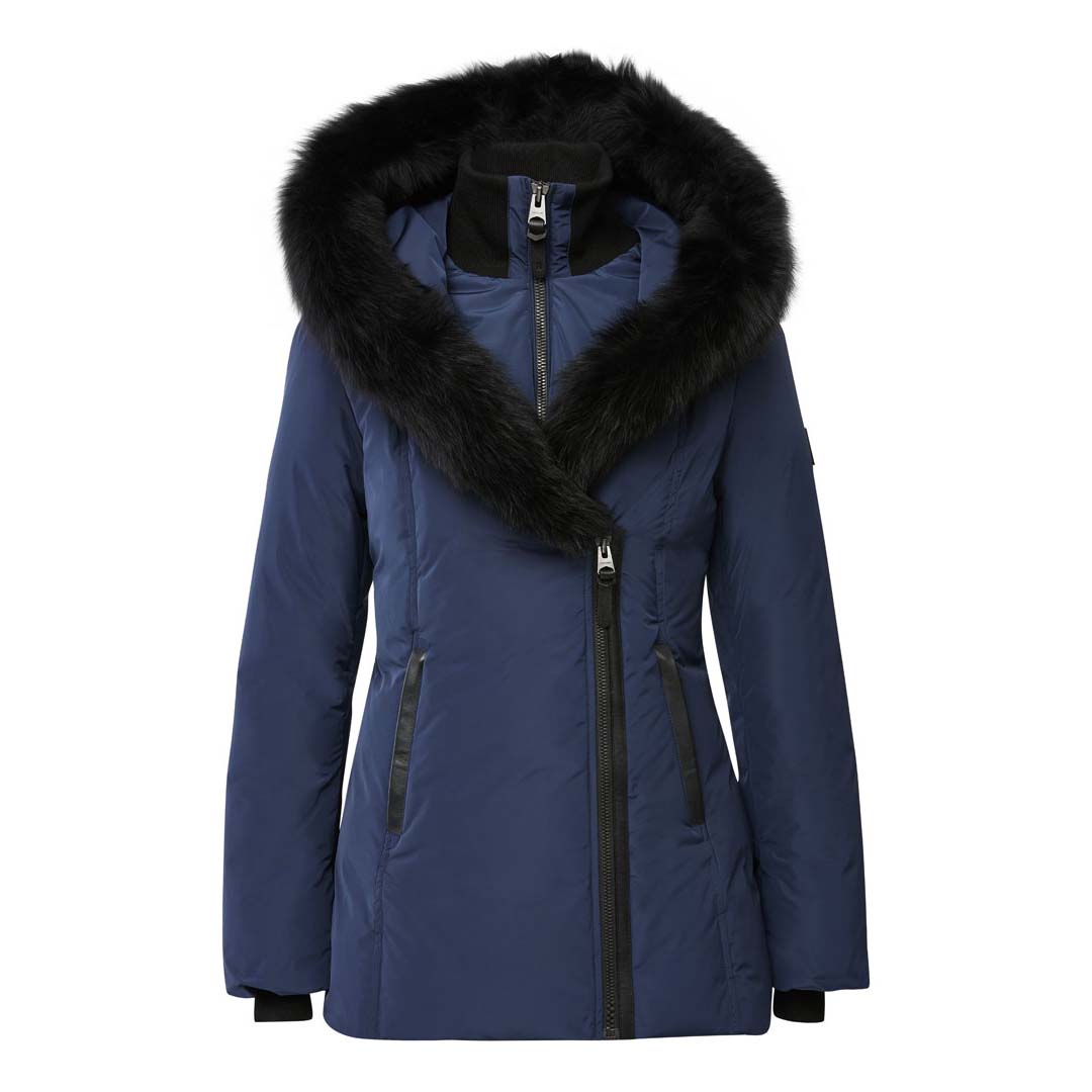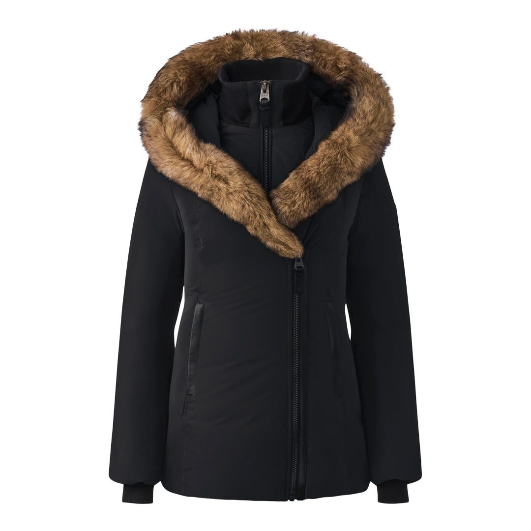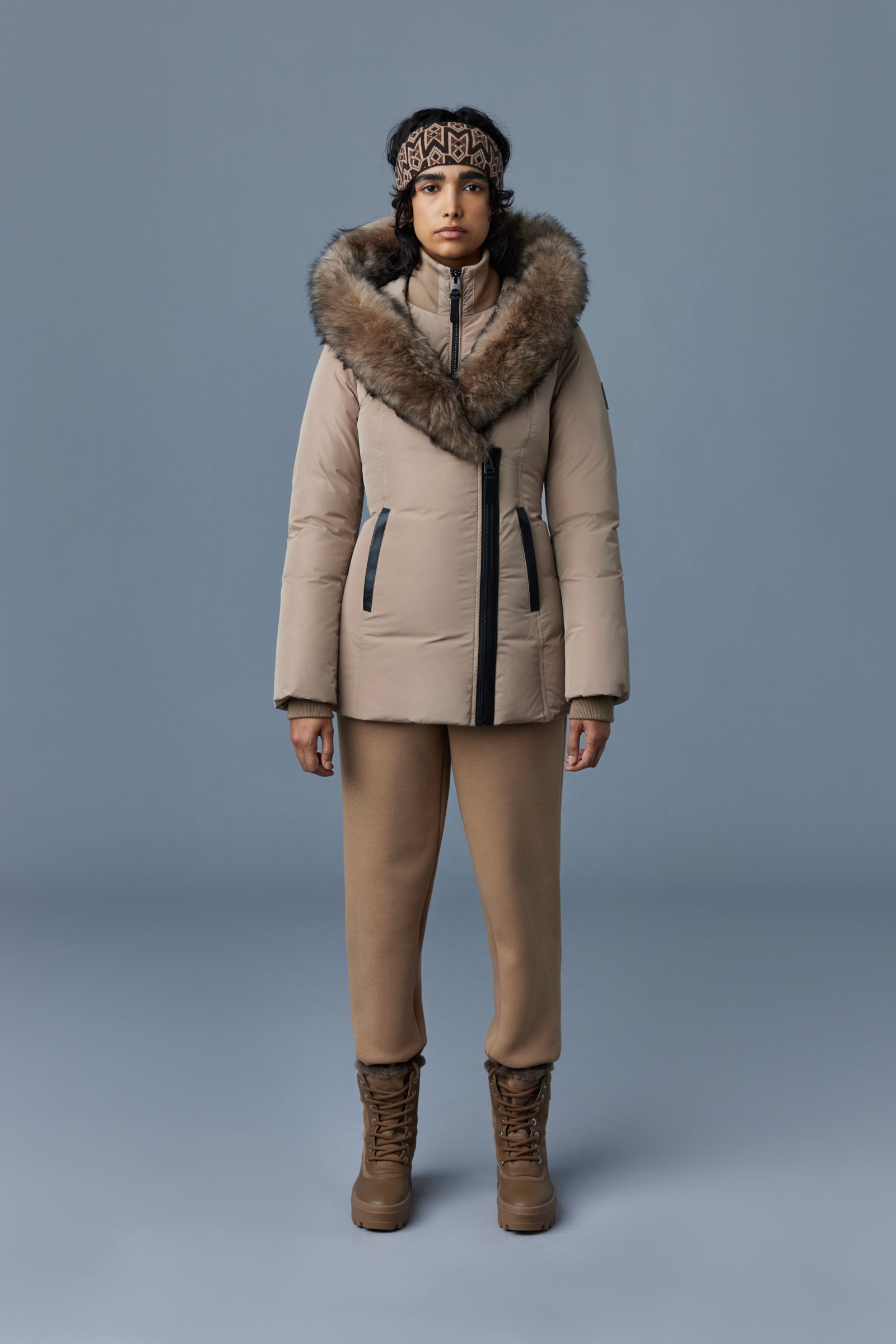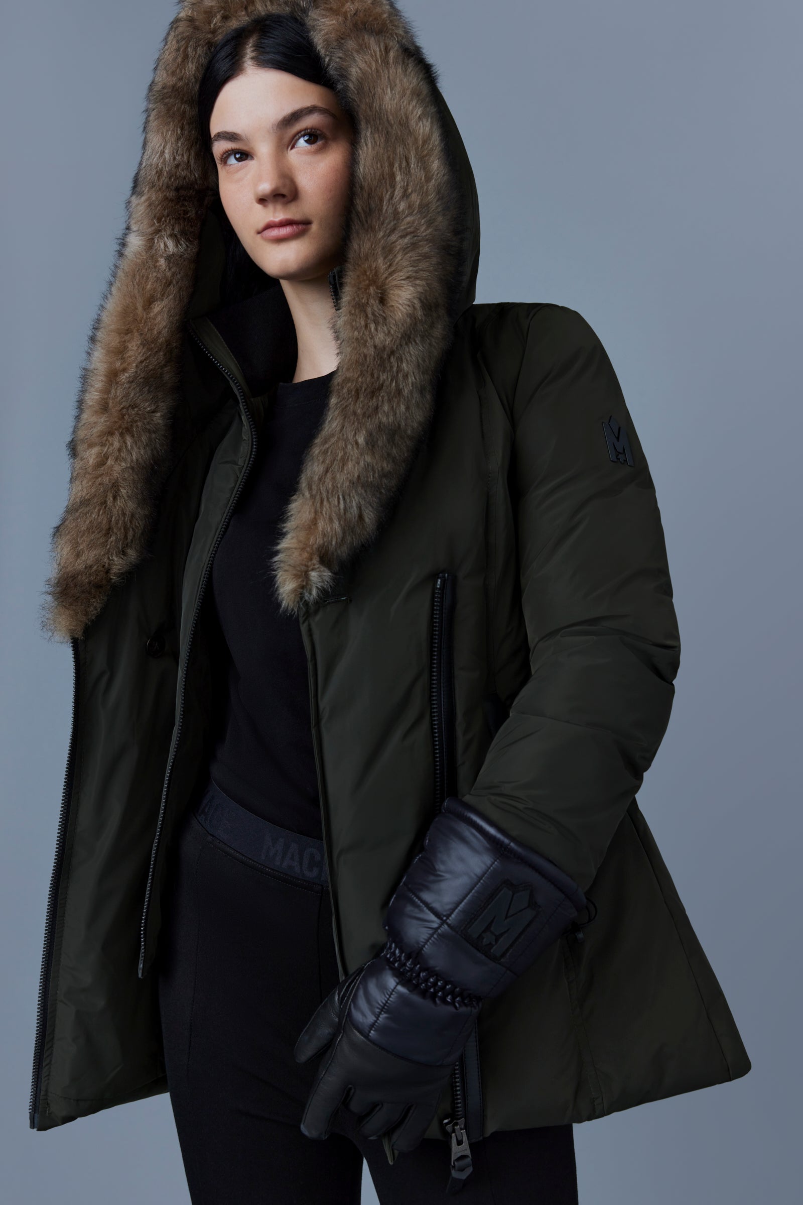 ADALI-SH is a recycled down coat for women featuring our Signature Collar with sheepskin trim and an asymmetrical zip closure. Lab tested to protect with weight-to-protection ratio, it has an inner bib with rib collar, hidden hood toggle, and storm cuffs. Water resistant, repellent, and windproof, insulated leather welt pockets add warmth and protection. A design-forward winter essential elevated with thoughtful tailoring.