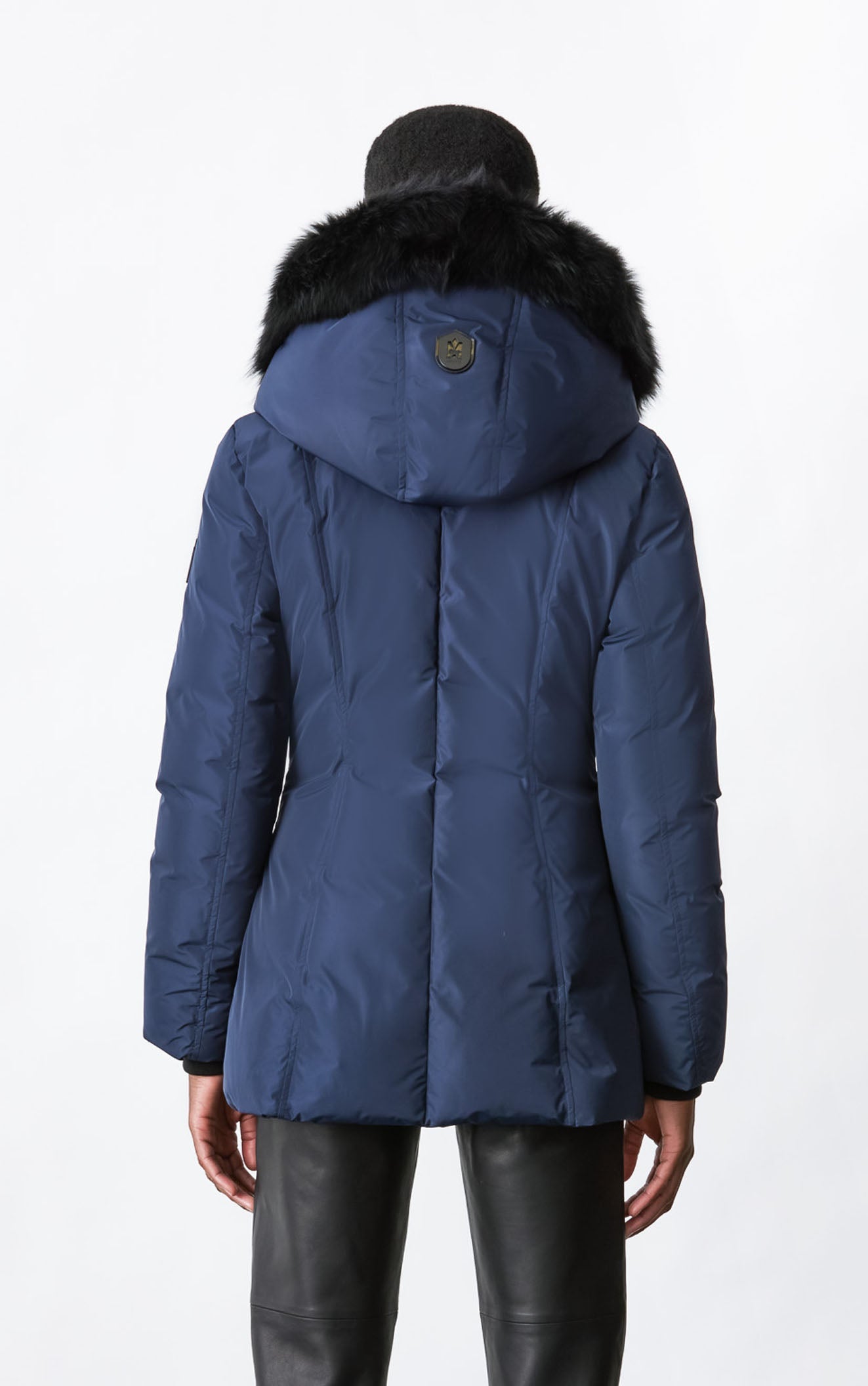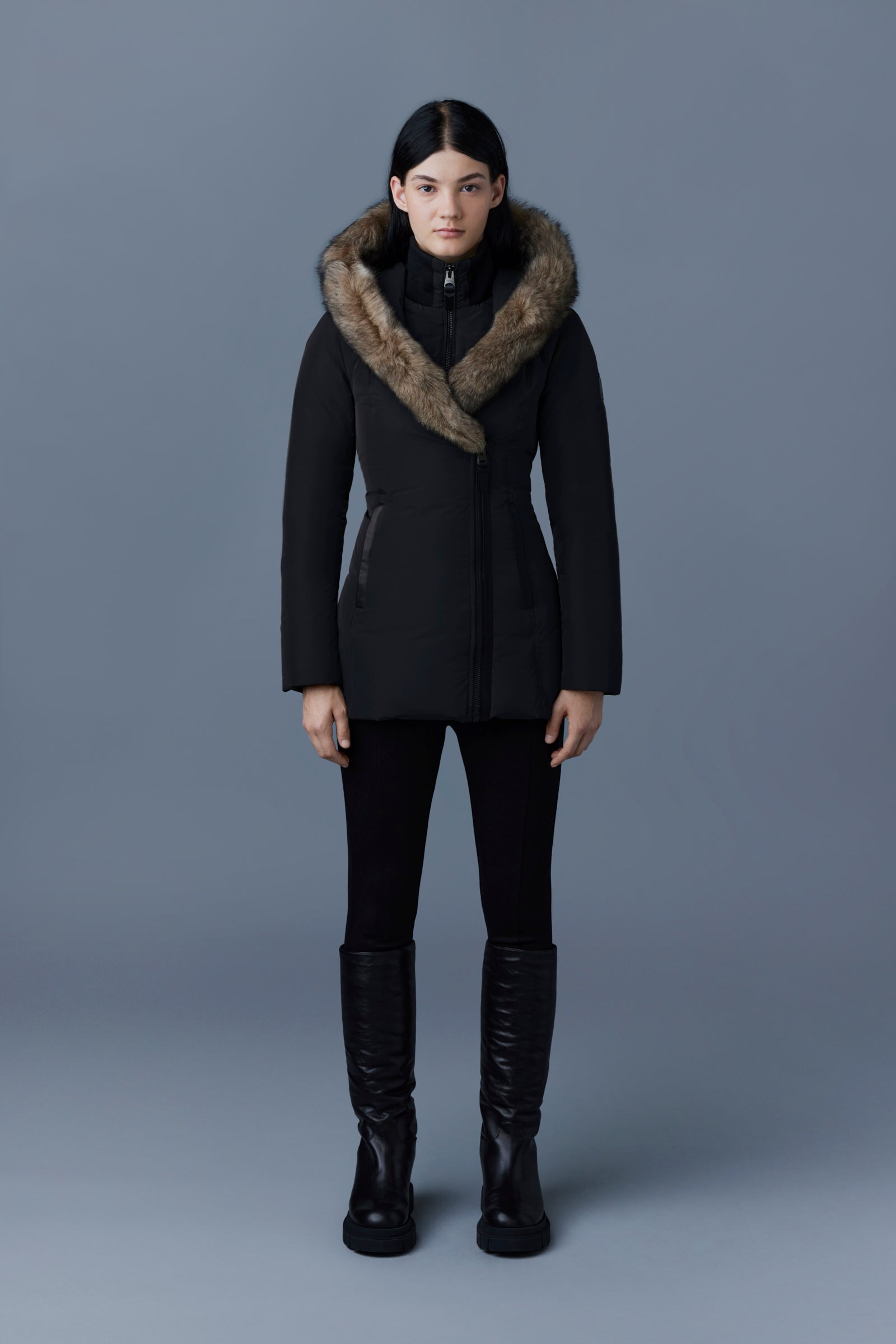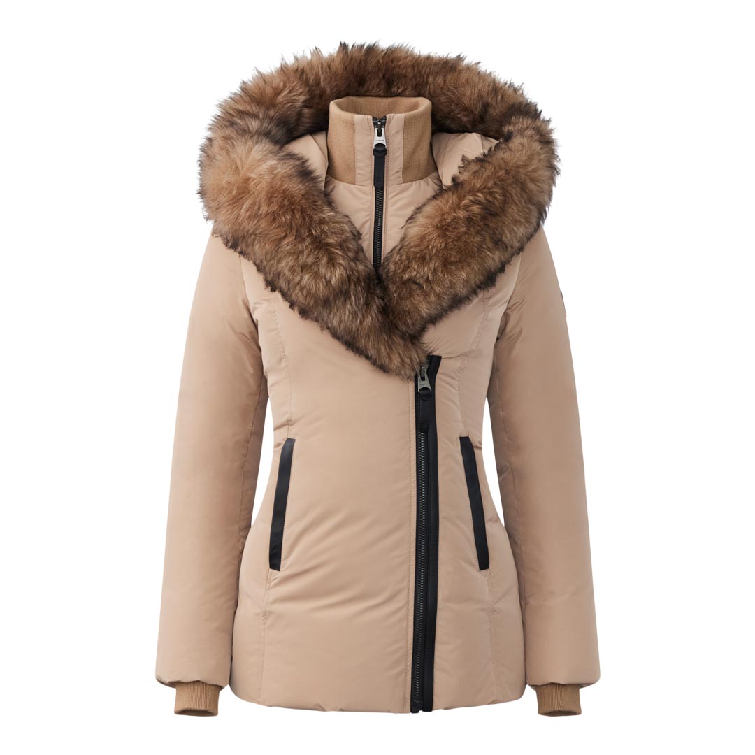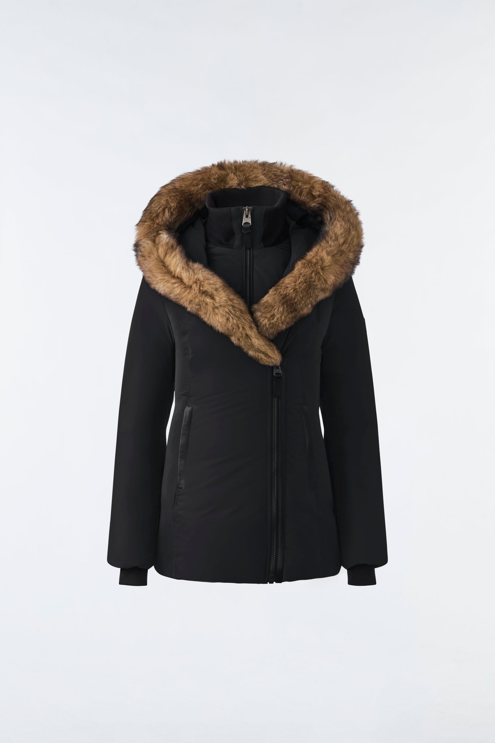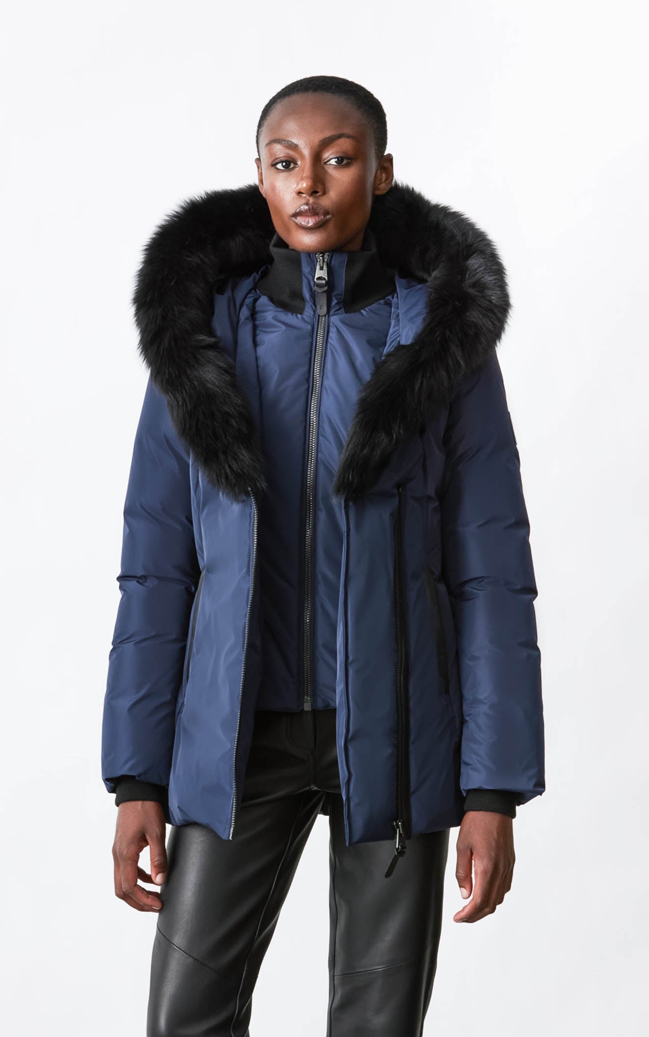 ADALI-SH is a recycled down coat for women featuring our Signature Collar with sheepskin trim and an asymmetrical zip closure. Lab tested to protect with weight-to-protection ratio, it has an inner bib with rib collar, hidden hood toggle, and storm cuffs. Water resistant, repellent, and windproof, insulated leather welt pockets add warmth and protection. A design-forward winter essential elevated with thoughtful tailoring.