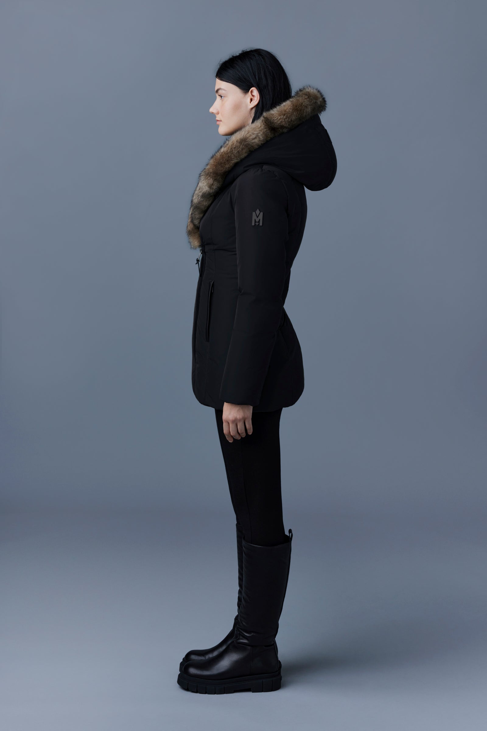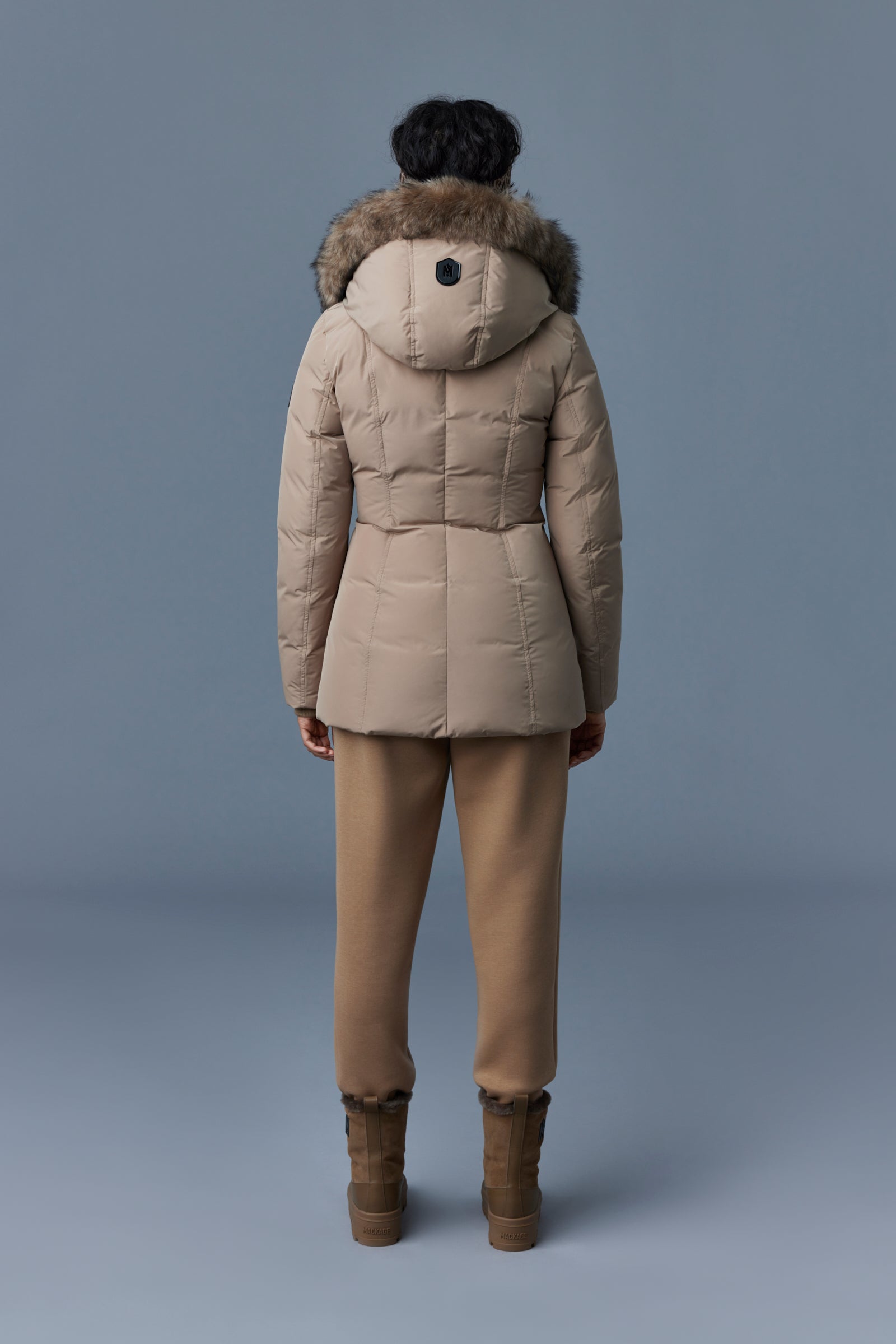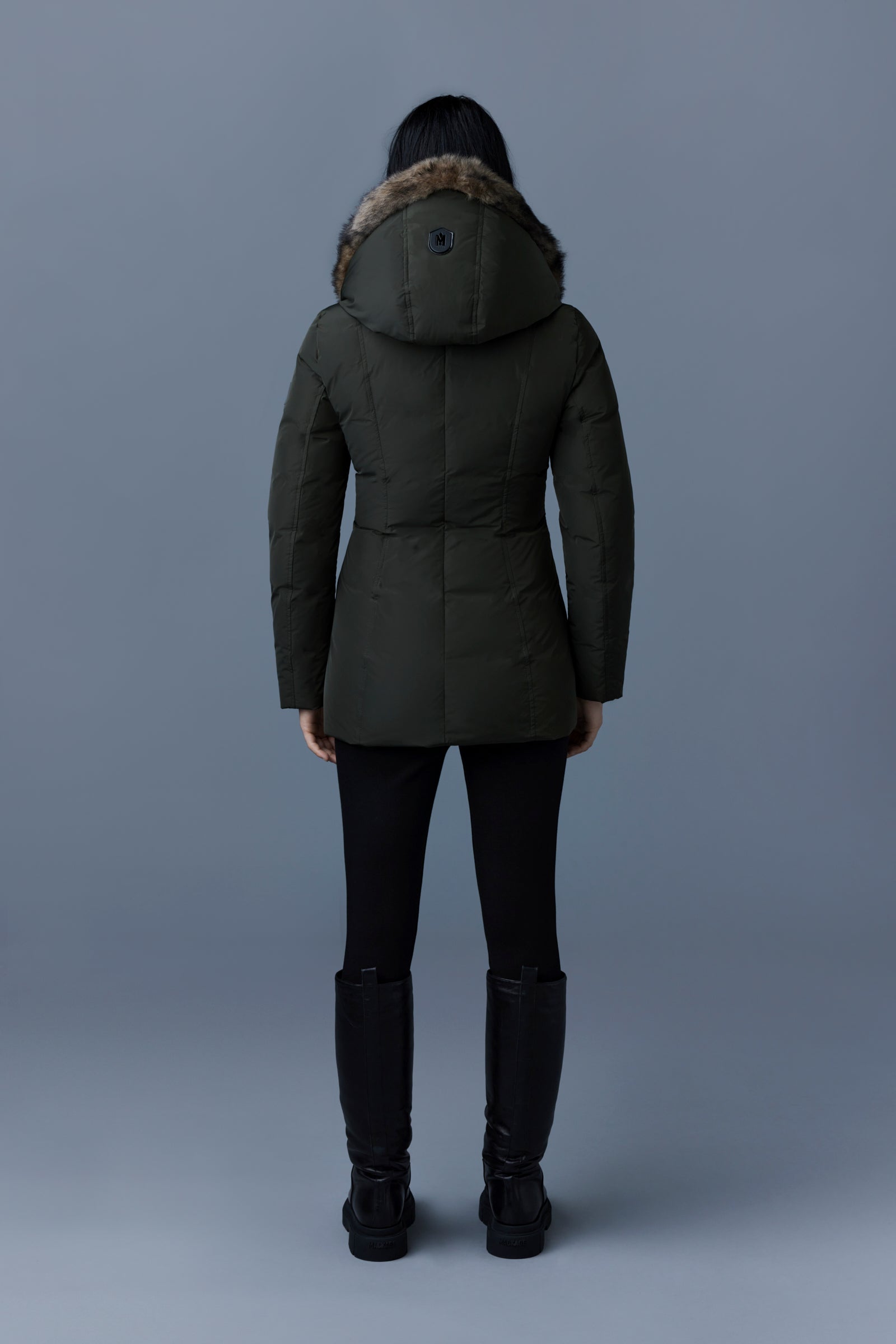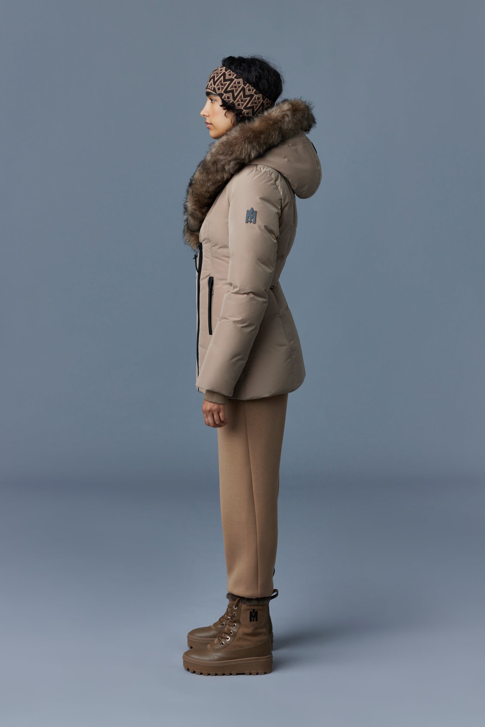 ADALI-SH is a recycled down coat for women featuring our Signature Collar with sheepskin trim and an asymmetrical zip closure. Lab tested to protect with weight-to-protection ratio, it has an inner bib with rib collar, hidden hood toggle, and storm cuffs. Water resistant, repellent, and windproof, insulated leather welt pockets add warmth and protection. A design-forward winter essential elevated with thoughtful tailoring.