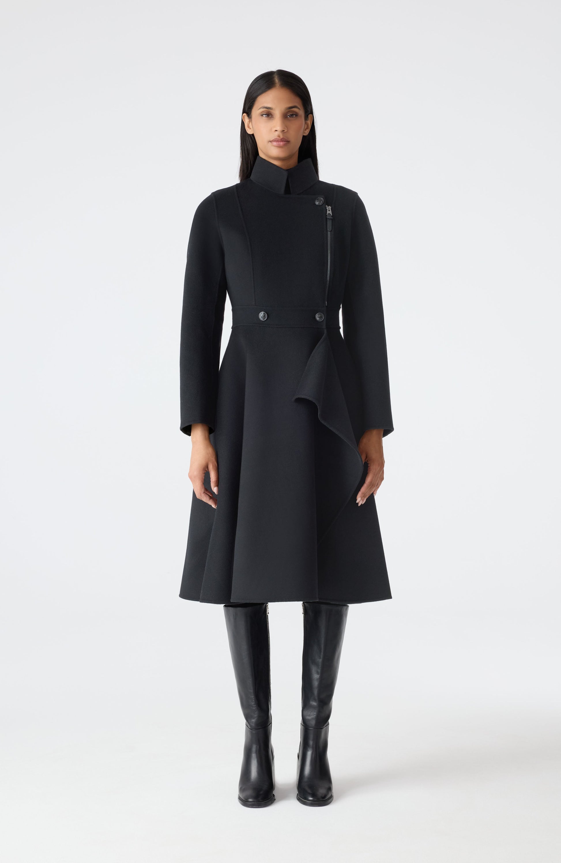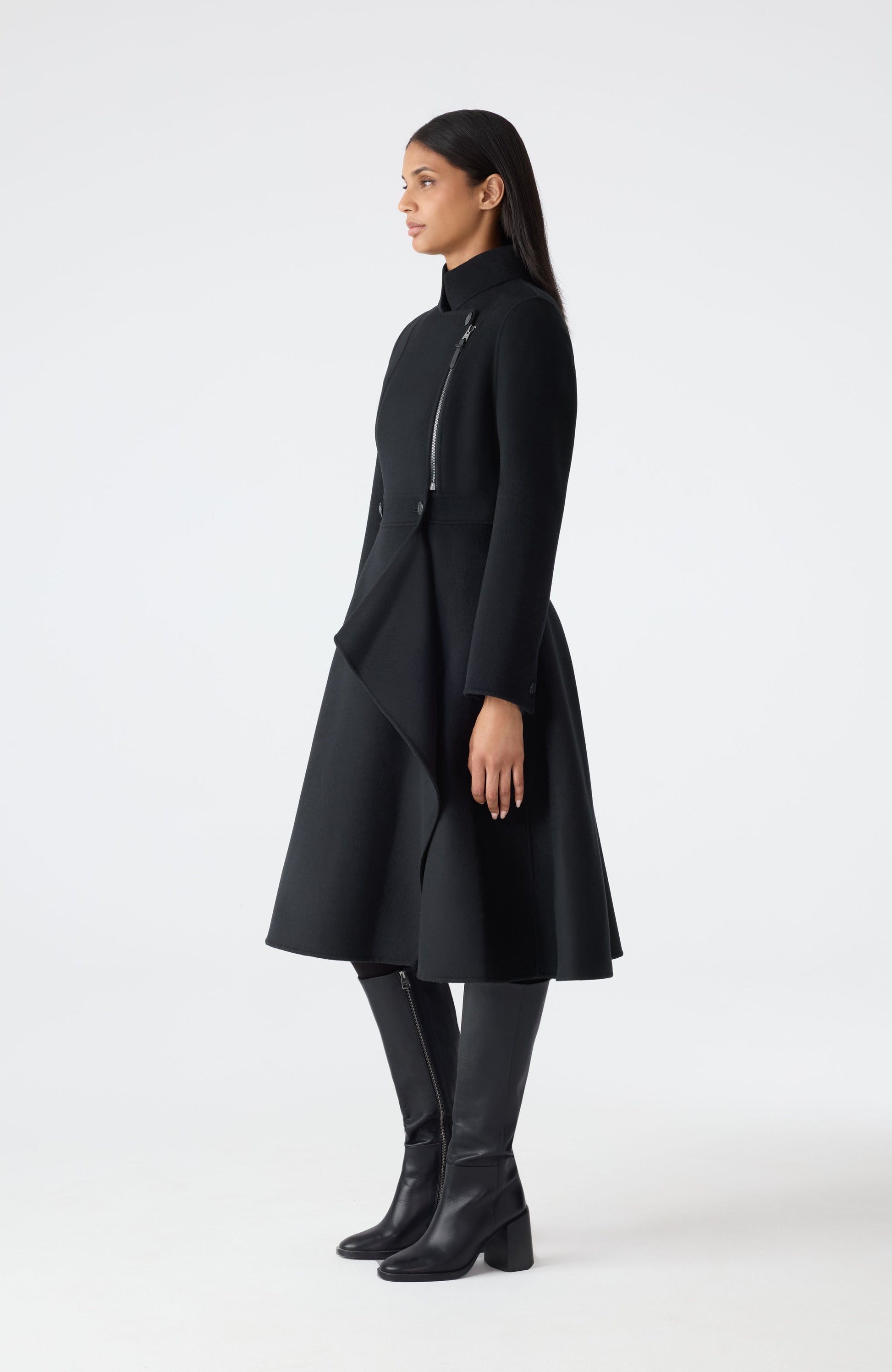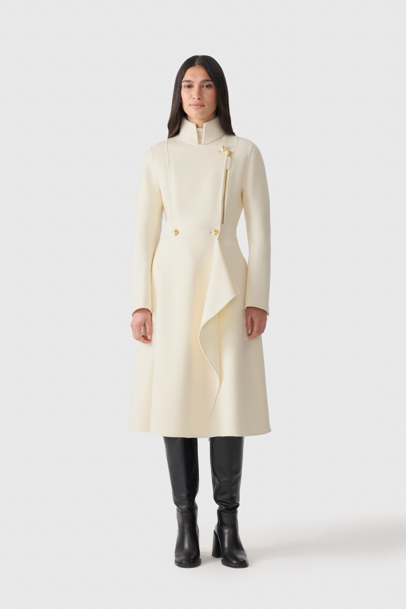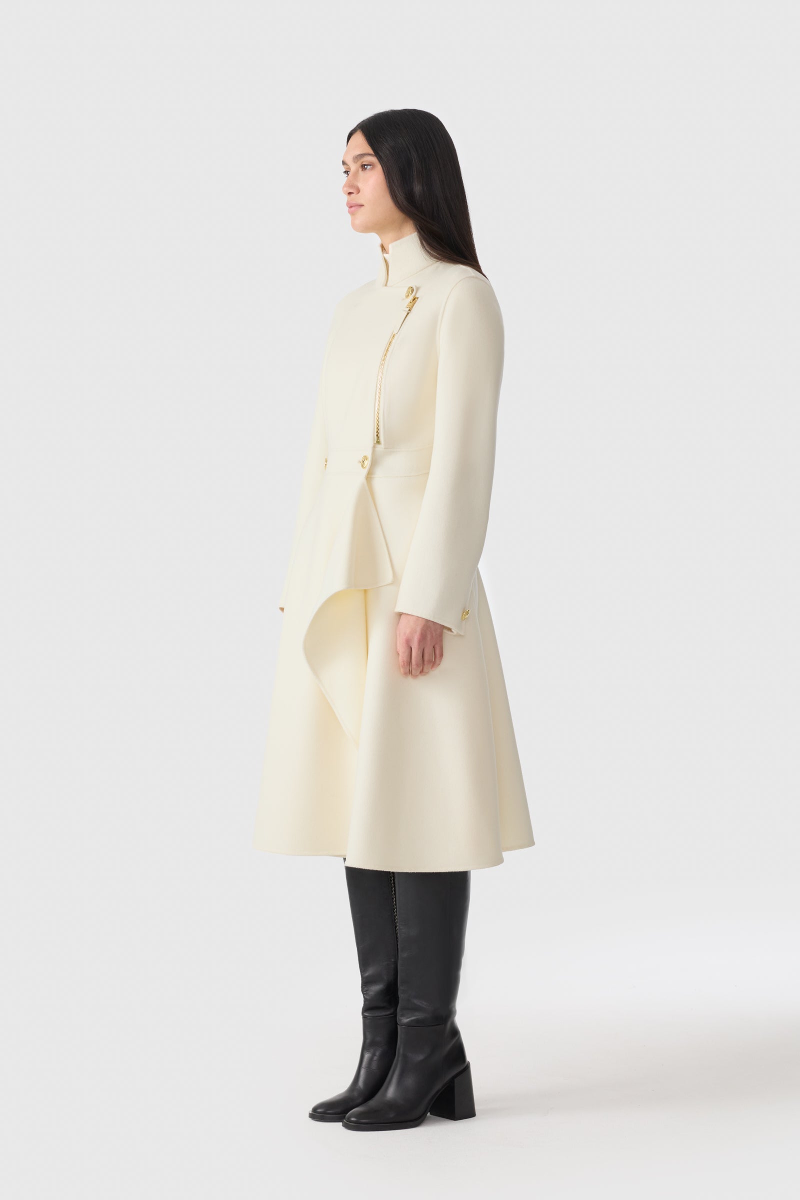 ANNIA is a long wrap coat handmade from responsibly-sourced double-faced wool. Tailored with a dramatic flared hem and a bold asymmetrical zip closure, the silhouette is both structured and fluid. Double-breasted closure is adorned with button and zipper fastening, while side seam pockets add subtle functionality. Unlined for lightness and natural drape, a timeless statement piece.