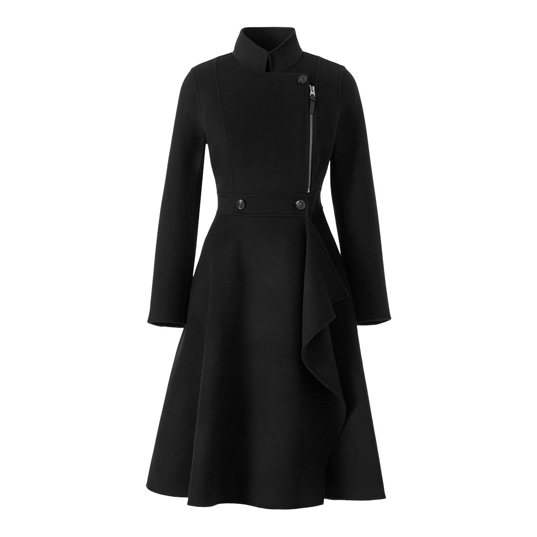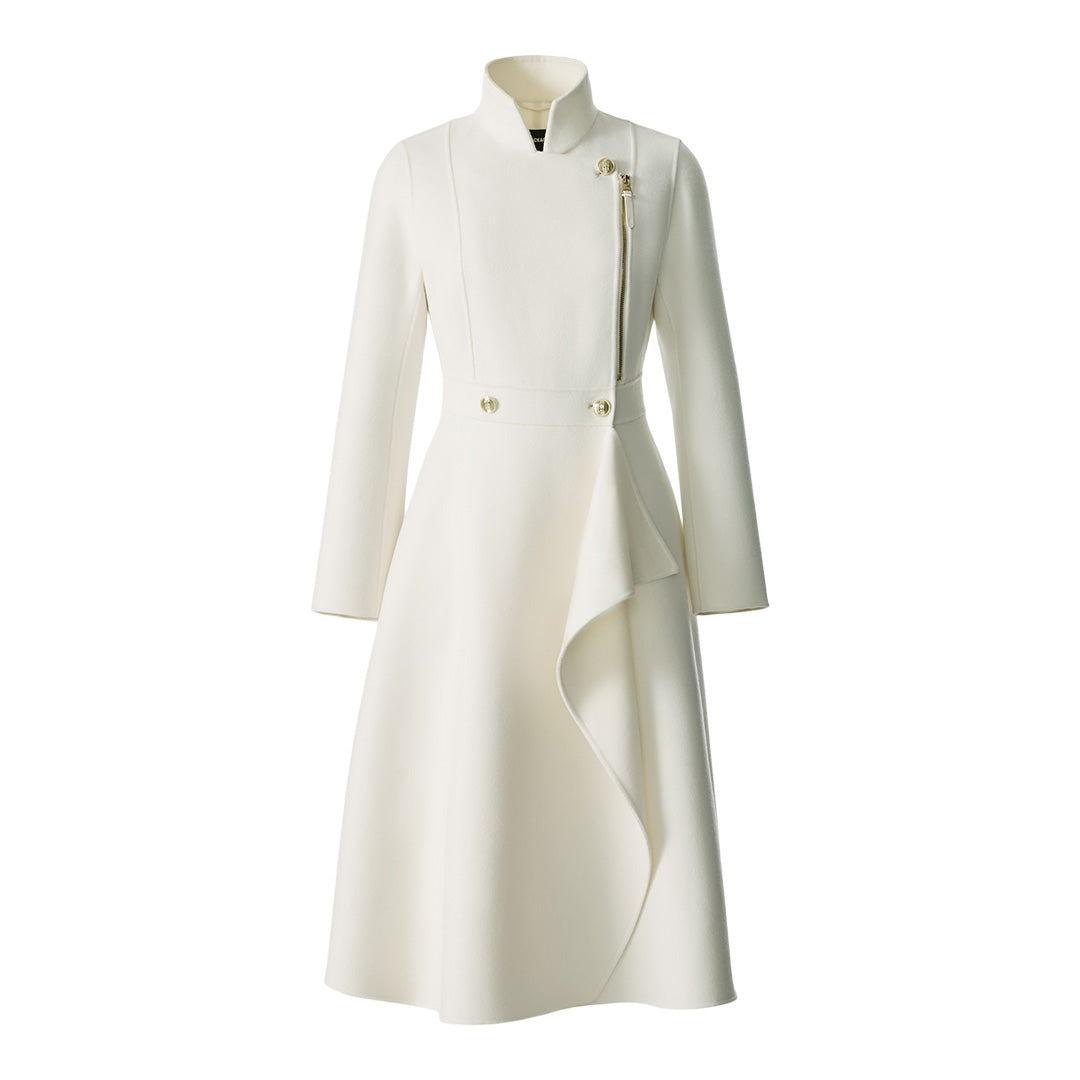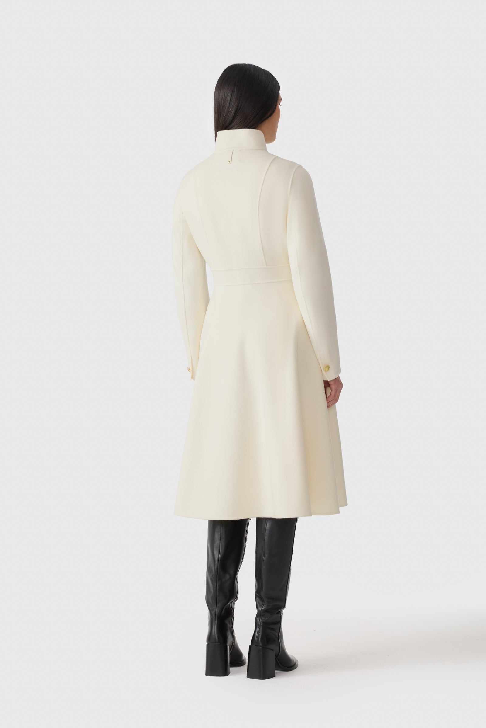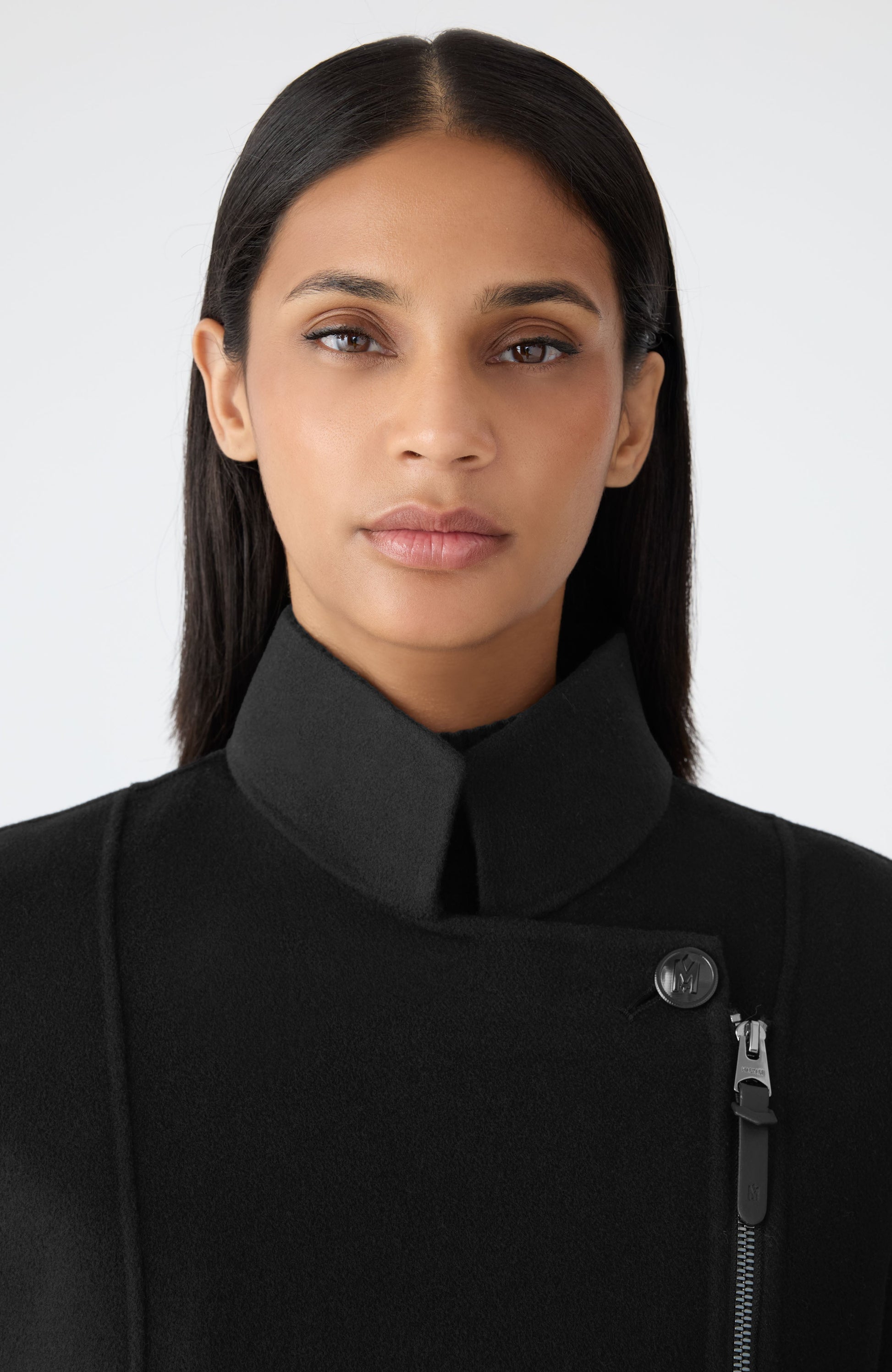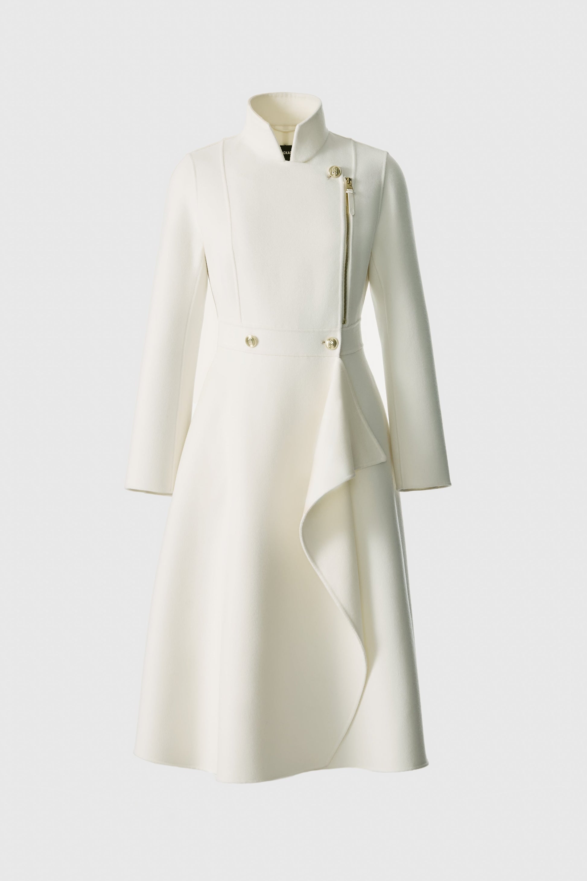 ANNIA is a long wrap coat handmade from responsibly-sourced double-faced wool. Tailored with a dramatic flared hem and a bold asymmetrical zip closure, the silhouette is both structured and fluid. Double-breasted closure is adorned with button and zipper fastening, while side seam pockets add subtle functionality. Unlined for lightness and natural drape, a timeless statement piece.