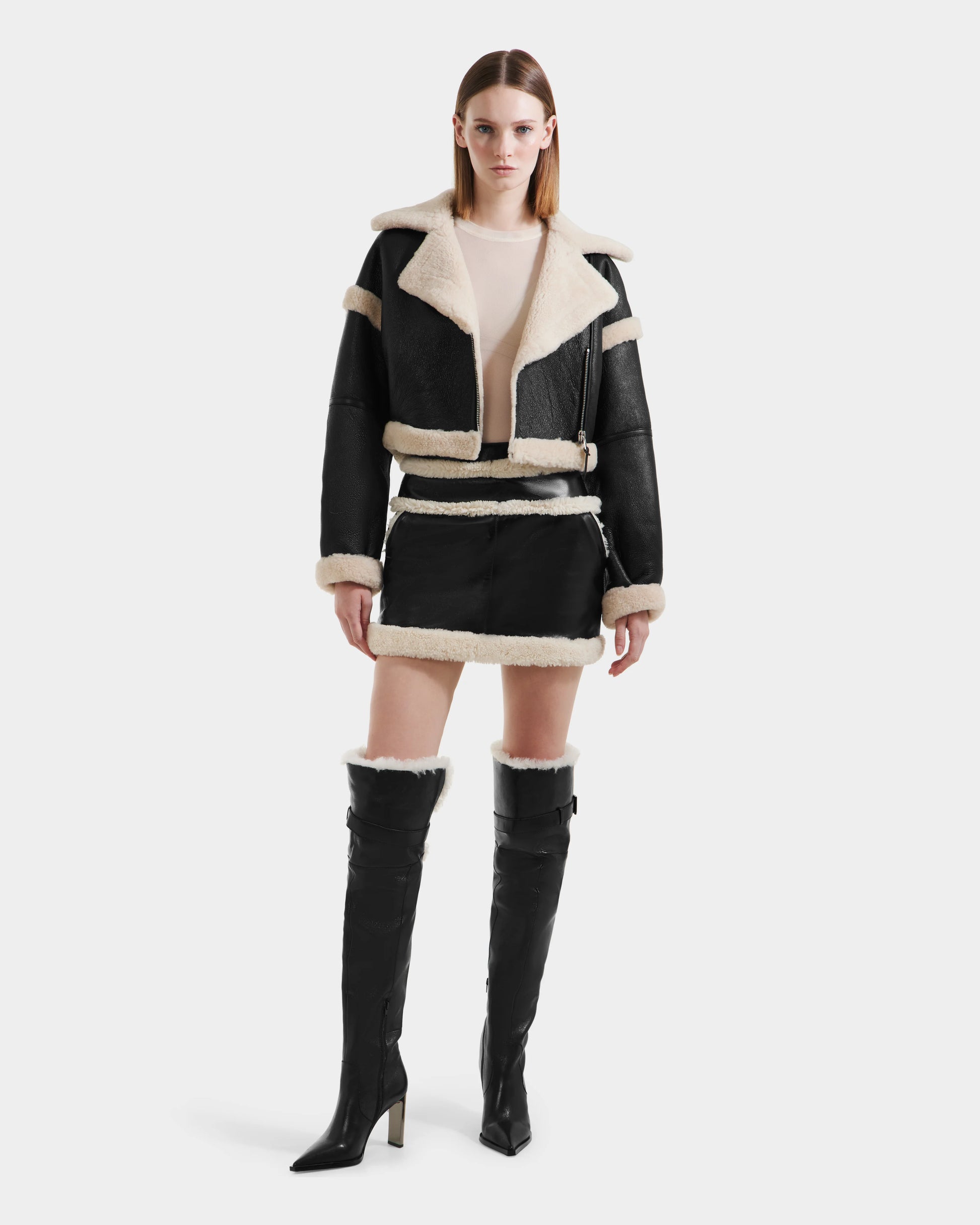 ARIANNA by RUDSAK is a cropped shearling jacket with a modern, minimalist edge. Crafted in luxe shearling with smooth leather trim, it combines warmth with elevated structure. The boxy silhouette, bold collar, and asymmetric zip closure strike a balance between utilitarian cool and timeless sophistication. Whether styled over a sleek knit dress or tailored separates, ARIANNA makes a powerful cold-weather statement.