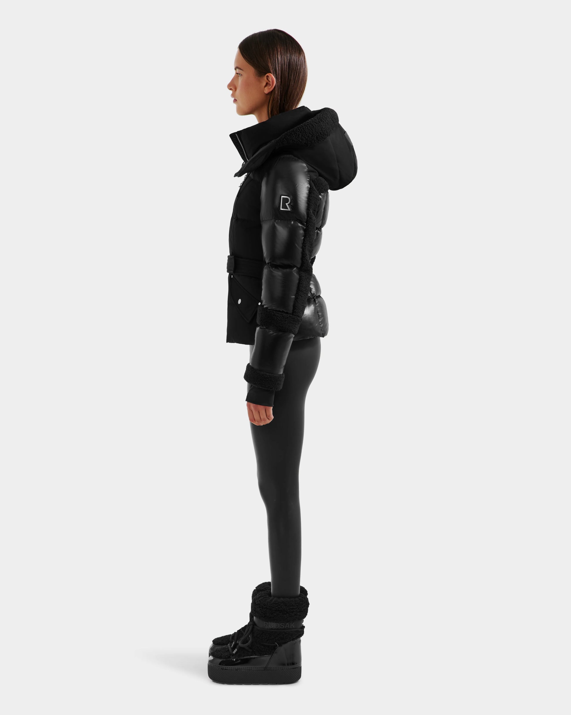 The AUDREY down puffer jacket marries style, warmth, and functionality seamlessly. Engineered for both technical performance and visual allure, it combines recycled Stormshell fabric with a lustrous recycled gloss finish, accented by faux shearling trim. These sustainable materials offer wind resistance, water repellency, and exceptional warmth, thanks to the high-loft RDS certified down fill. Featuring branded removable interior backpack straps, breathable mesh eyelets under the arms, storm-cuffs in neoprene, a removable quilted belt with adjustable branded Velcro, and a detachable storm hood, the AUDREY jacket delivers on both function and style. Stay chic and cozy with AUDREY.