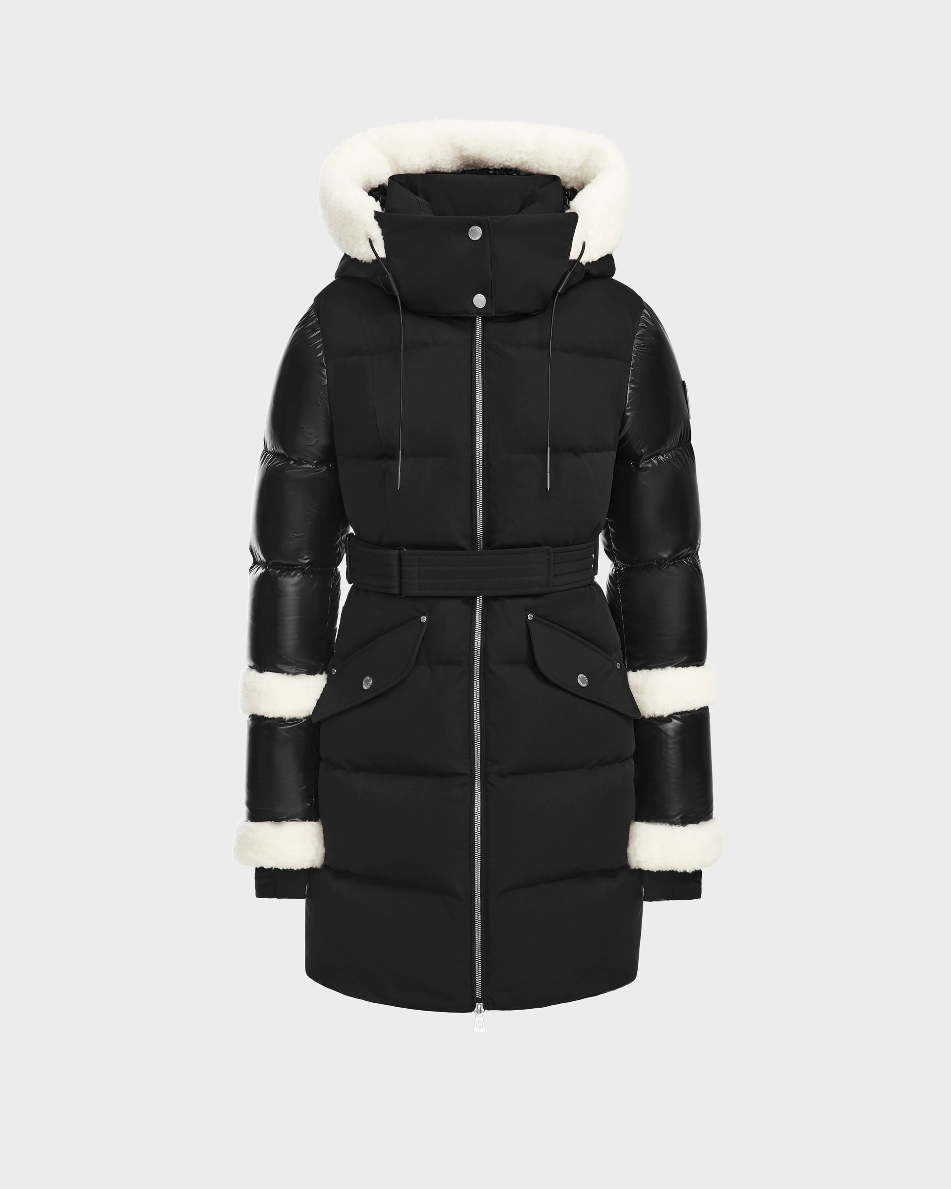 Elevate your winter wardrobe with the AUDREY L, a knee-length down puffer jacket that masterfully blends fashion, warmth, and functionality. Designed with both technical expertise and aesthetic allure, it features a sophisticated mix of recycled Stormshell fabric and lustrous gloss finish, highlighted by faux shearling trim. These eco-friendly materials provide exceptional wind resistance, water repellency, and luxurious insulation, thanks to high-loft RDS certified down fill. Customizable details include branded detachable interior backpack straps, breathable underarm mesh eyelets, protective neoprene storm-cuffs, and a removable quilted belt with adjustable branded Velcro. Complete with a detachable storm hood, the AUDREY L ensures you stay chic and cozy on the chilliest of days.