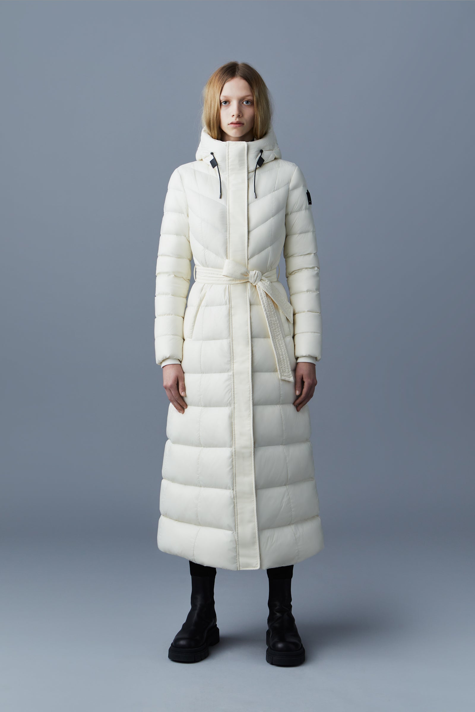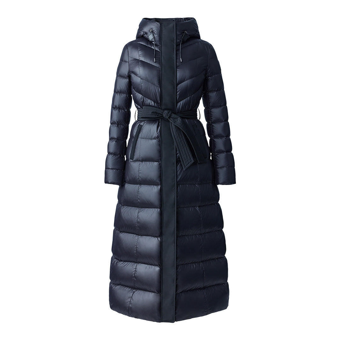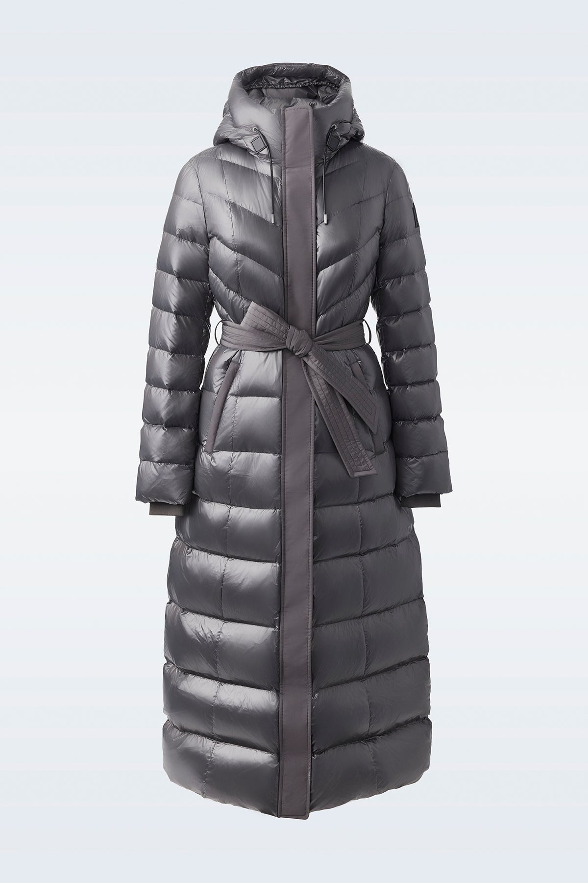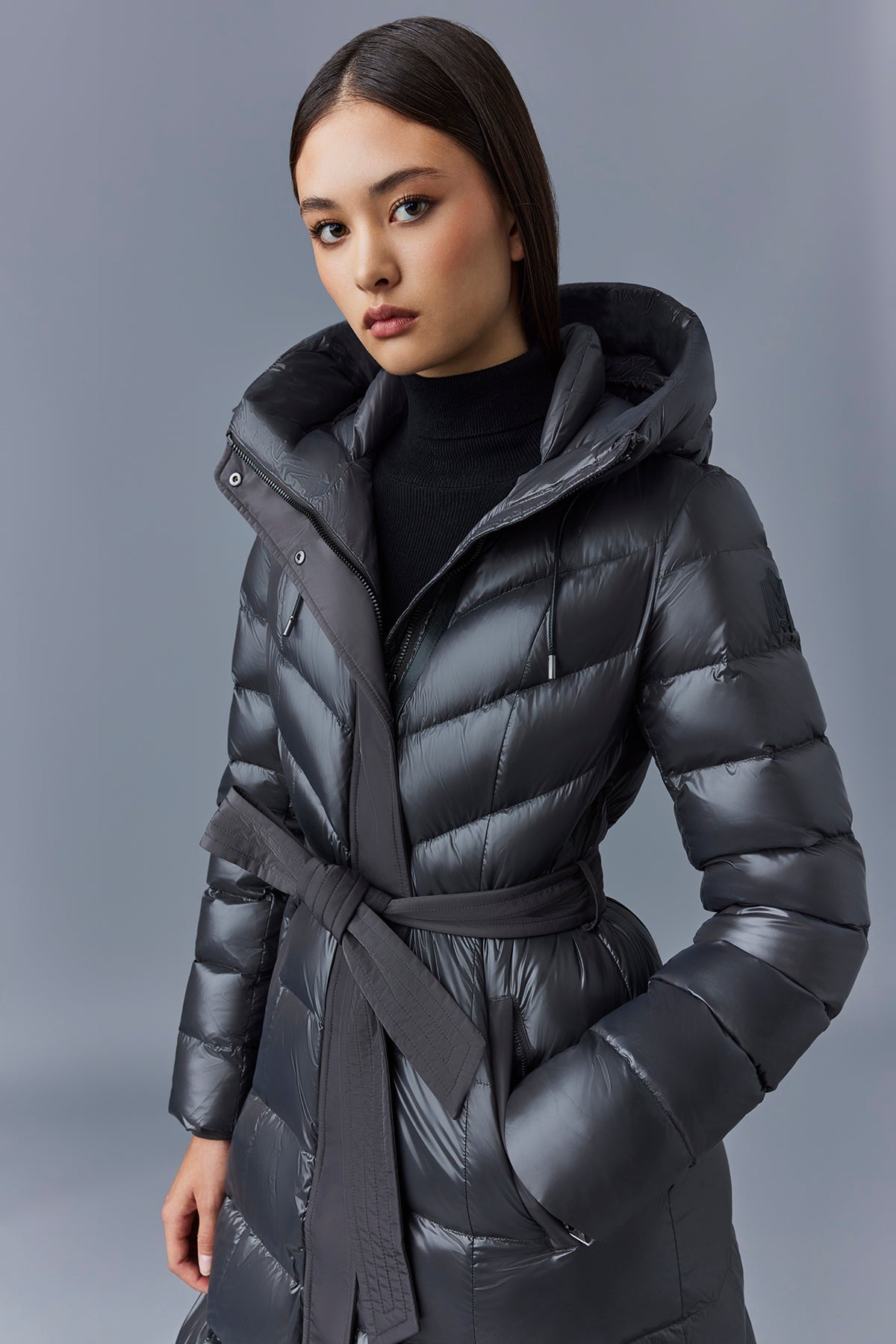 CALINA is a longline coat for women crafted from recycled lustrous down. Flaunting a fitted A-line cut, the tonal sash belt and contrast chevron quilting enhance the statement silhouette. The adjustable storm visor hood, insulated pockets, and rib knit cuffs bring signature performance. Finished with a contrast storm placket for added protection.