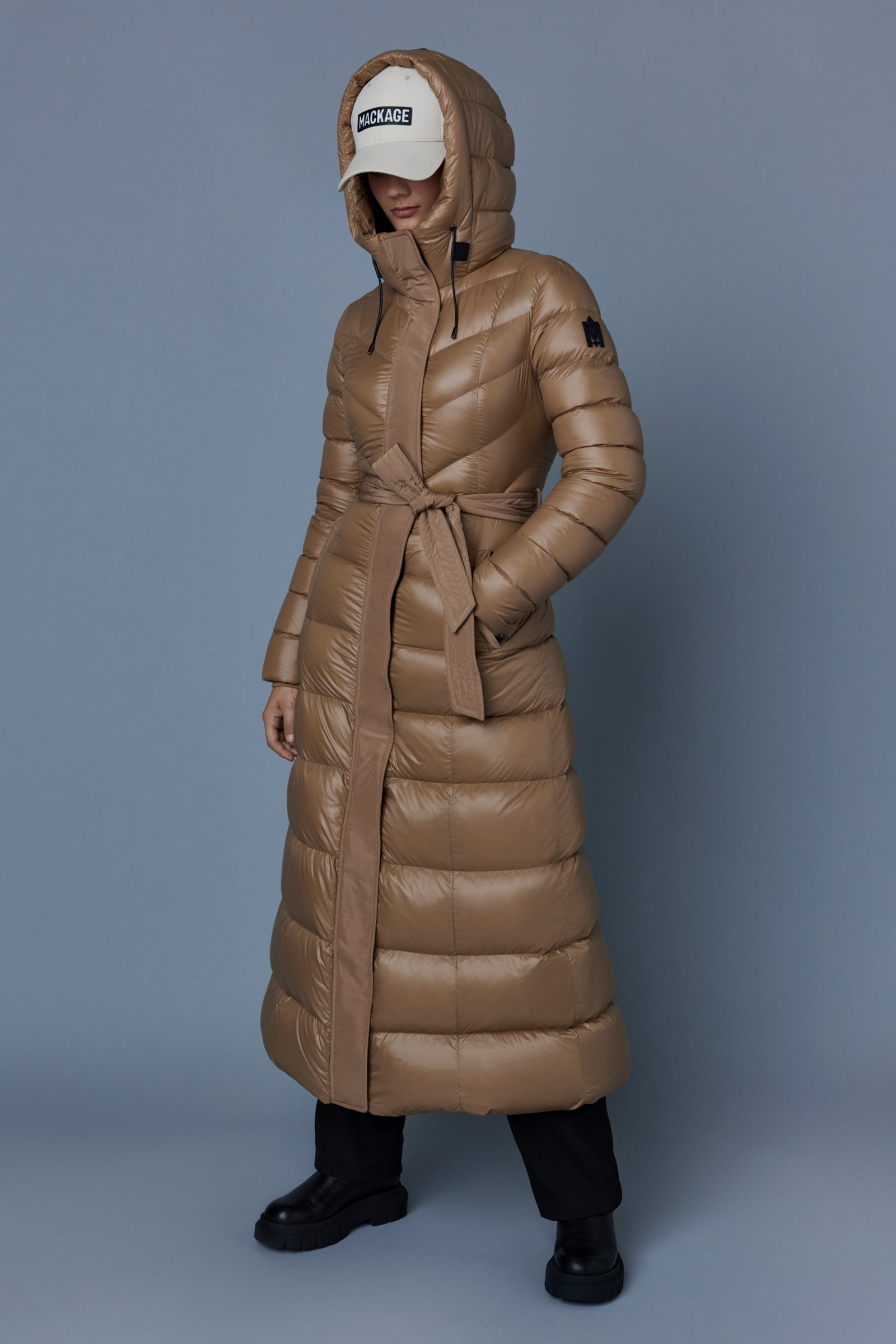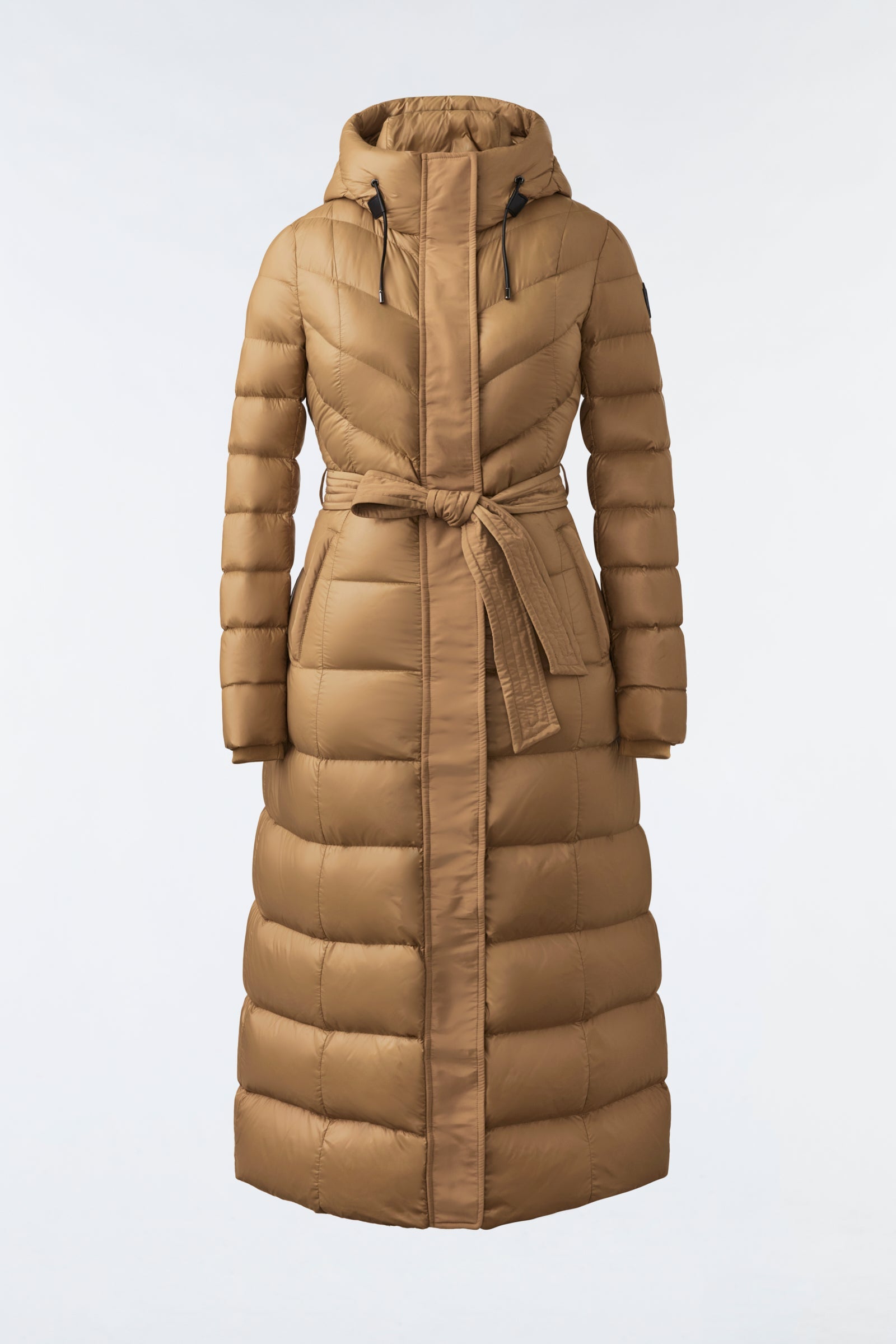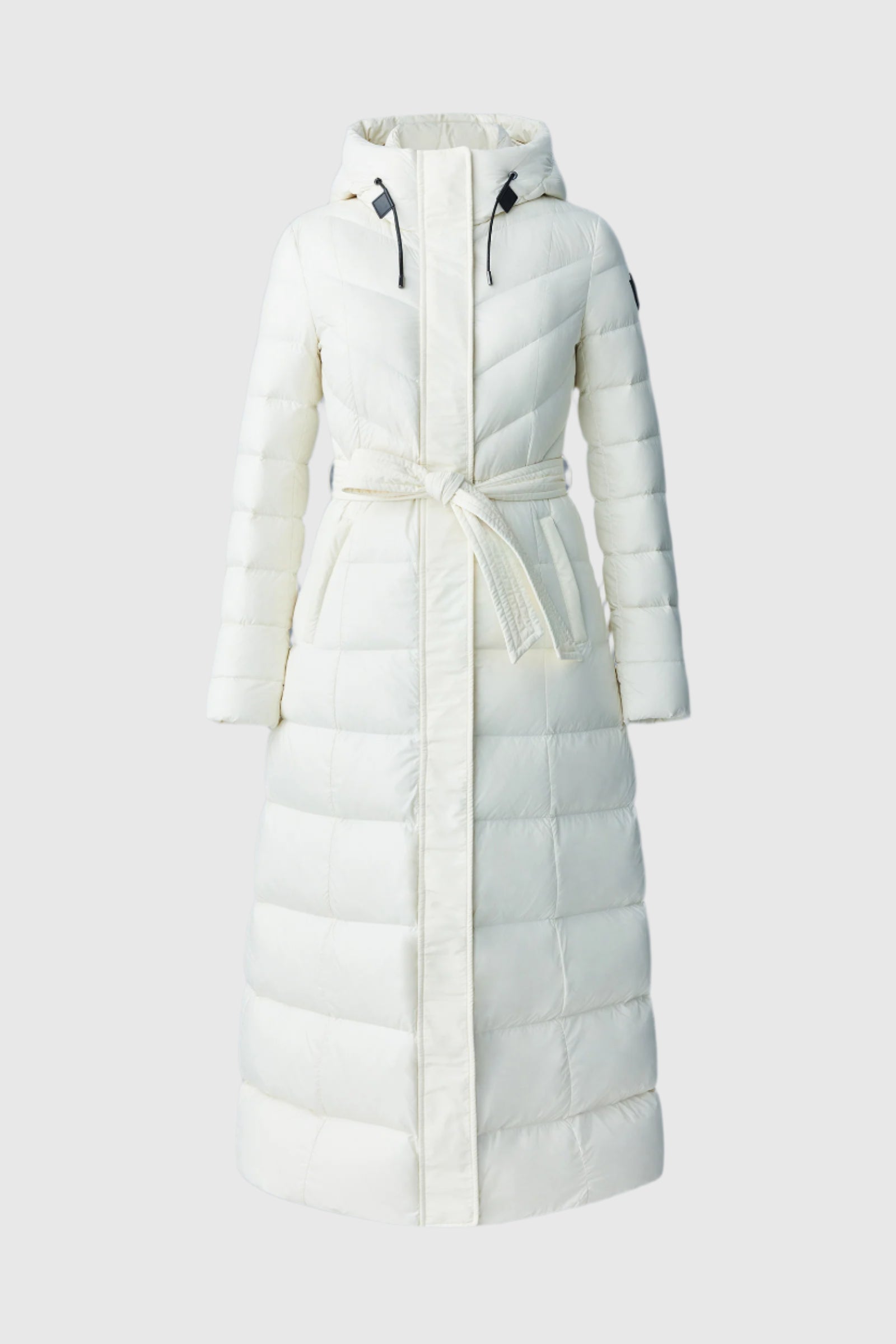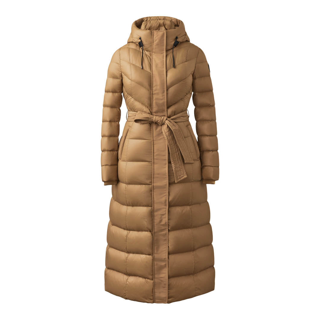 CALINA is a longline coat for women crafted from recycled lustrous down. Flaunting a fitted A-line cut, the tonal sash belt and contrast chevron quilting enhance the statement silhouette. The adjustable storm visor hood, insulated pockets, and rib knit cuffs bring signature performance. Finished with a contrast storm placket for added protection.