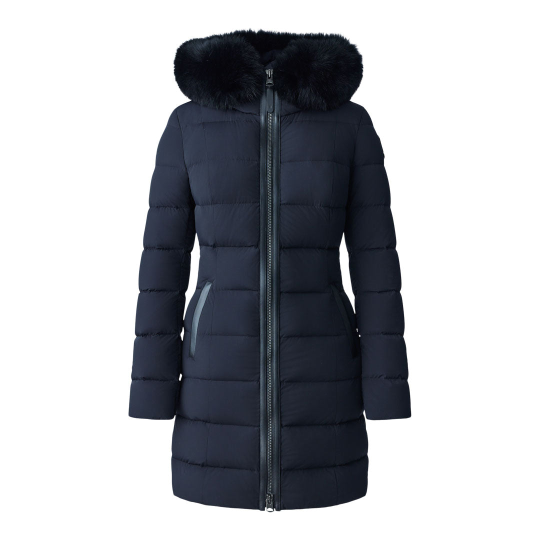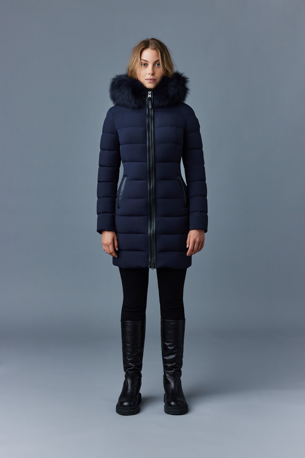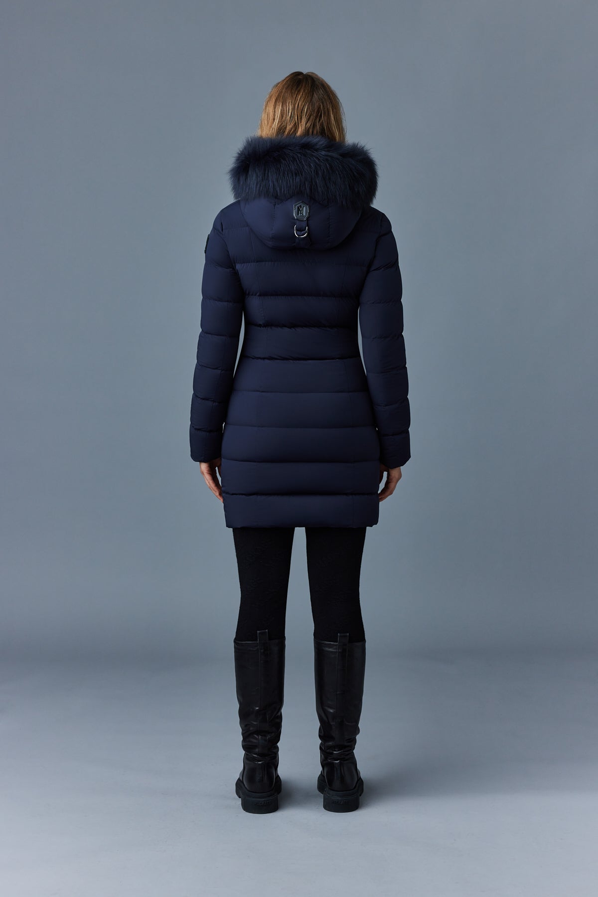 CALLA is a light down coat for women cut from our proprietary Agile 360 stretch shell with a removeable blue fox fur trim around the hood. It is meticulously tailored to a fitted silhouette to maximize comfort and ease of movement. Water resistant and repellent, it features an adjustable drawcord hood and insulated pockets. An elegant and versatile piece for elevated styling.