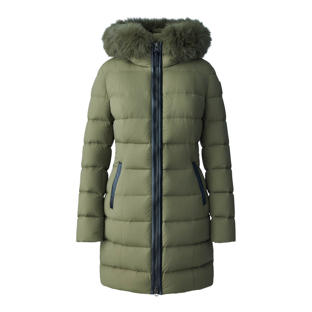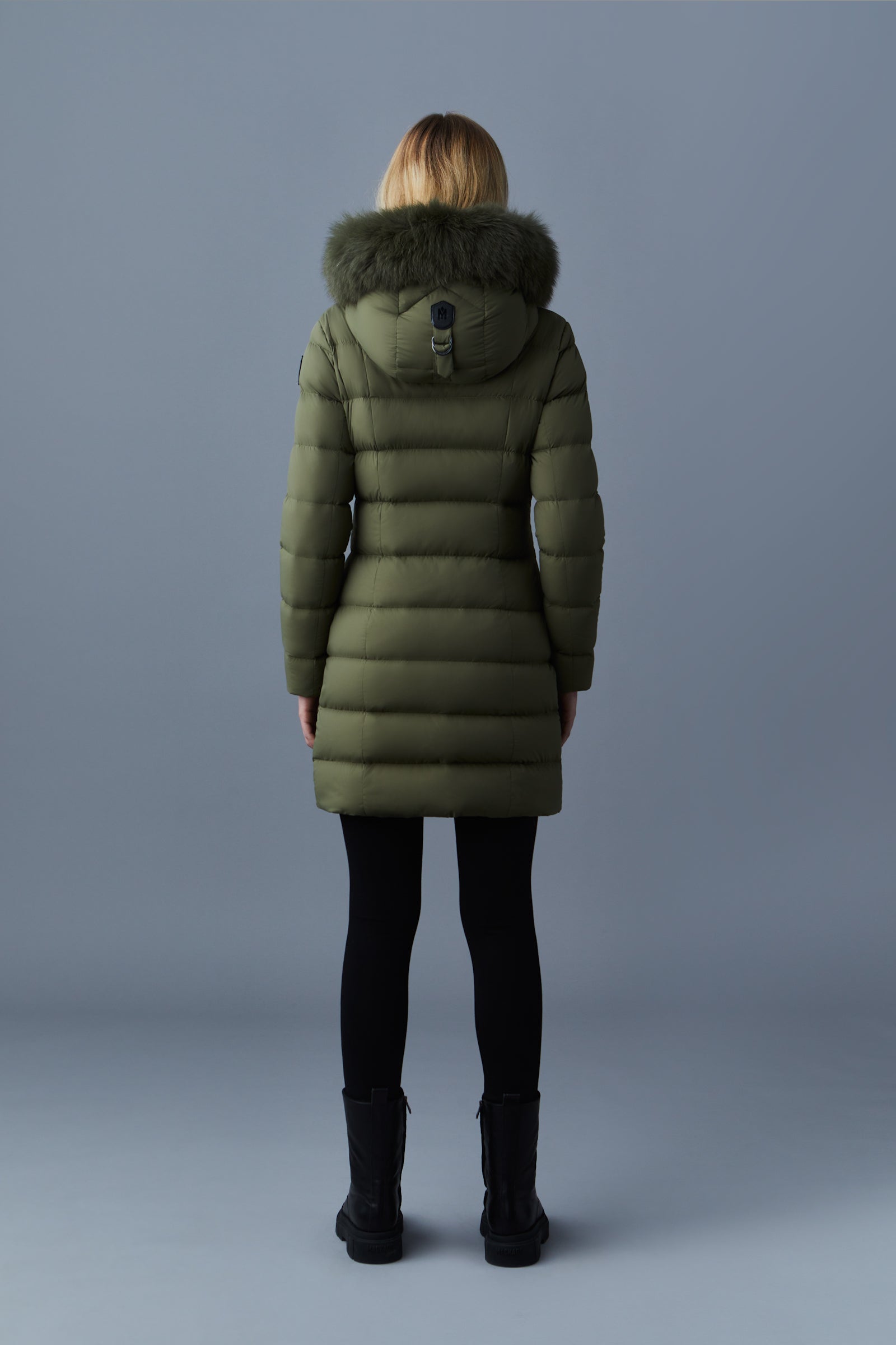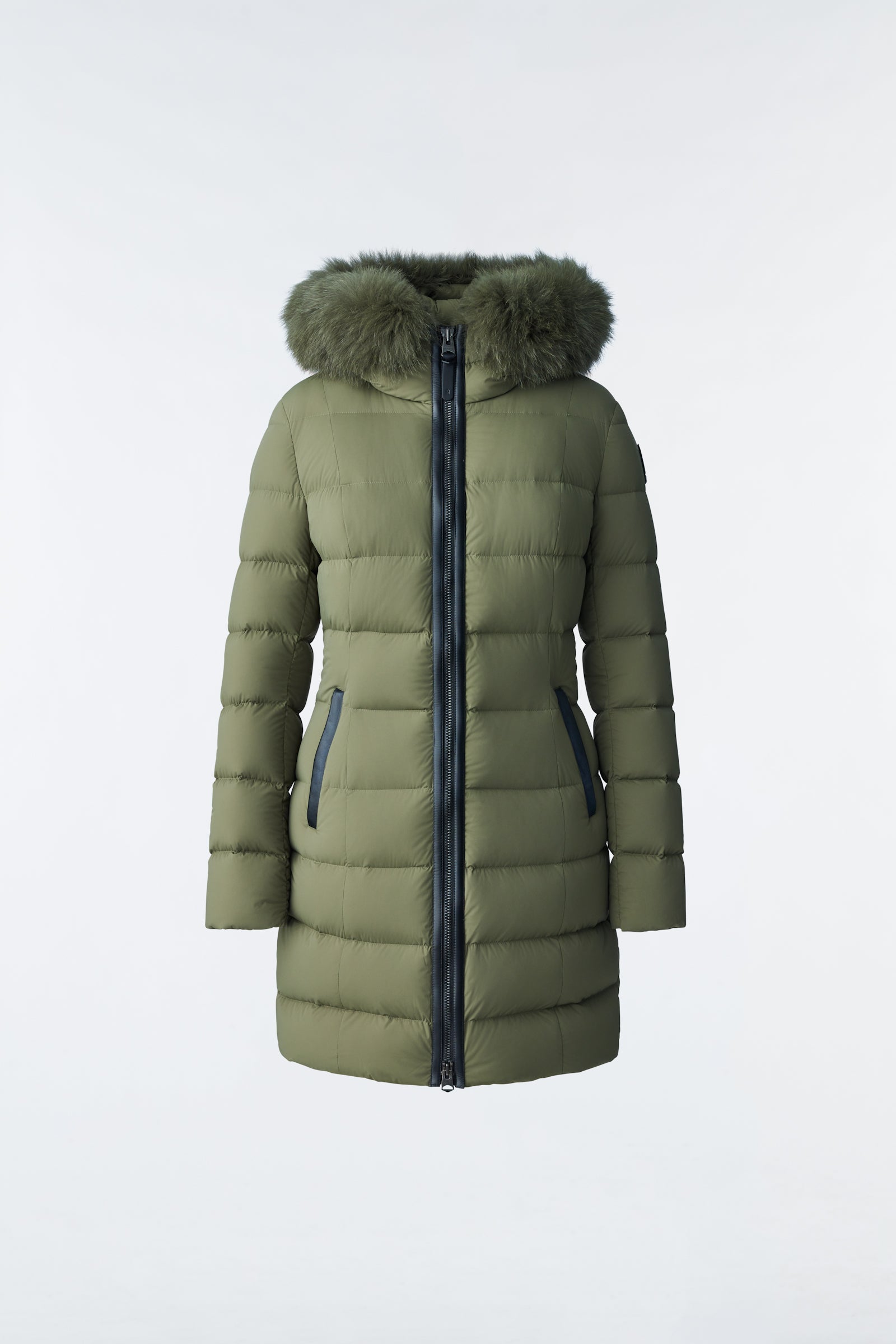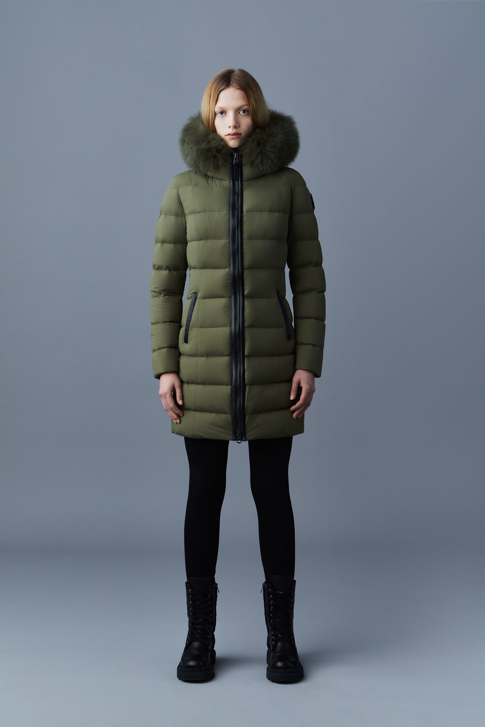 CALLA is a light down coat for women cut from our proprietary Agile 360 stretch shell with a removeable blue fox fur trim around the hood. It is meticulously tailored to a fitted silhouette to maximize comfort and ease of movement. Water resistant and repellent, it features an adjustable drawcord hood and insulated pockets. An elegant and versatile piece for elevated styling.