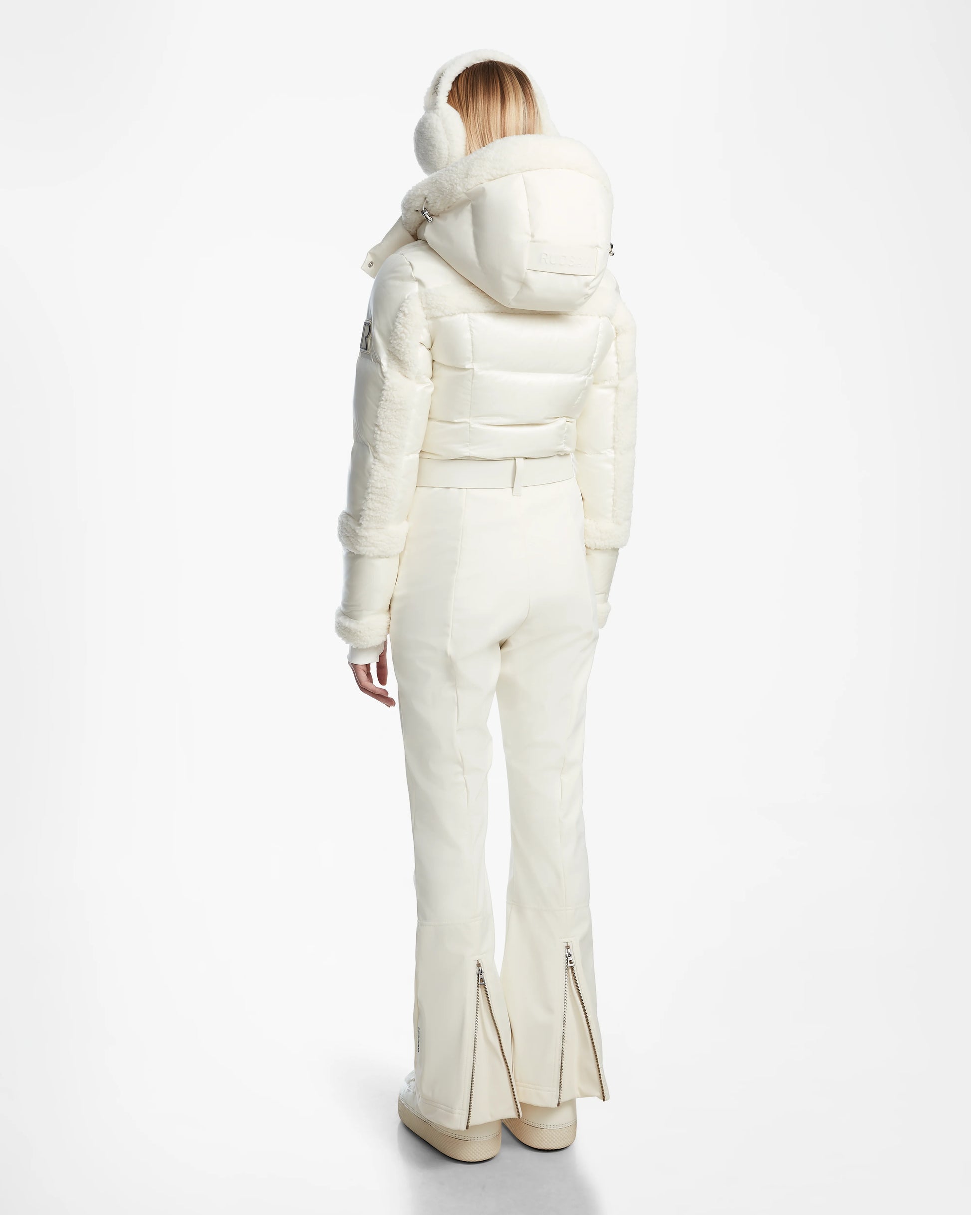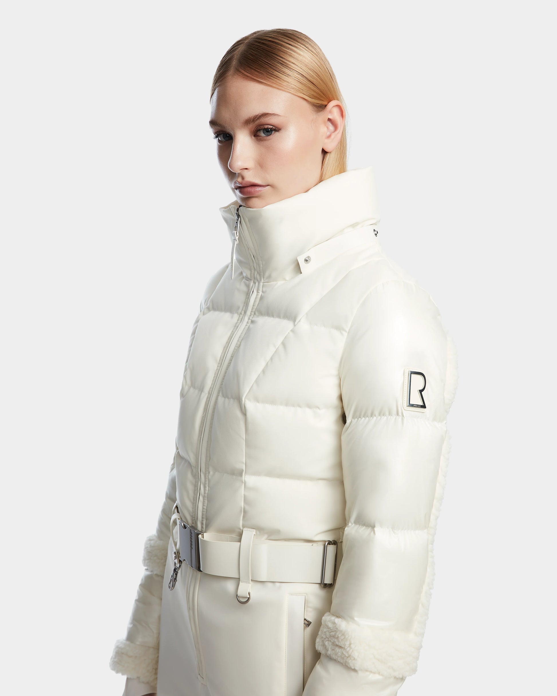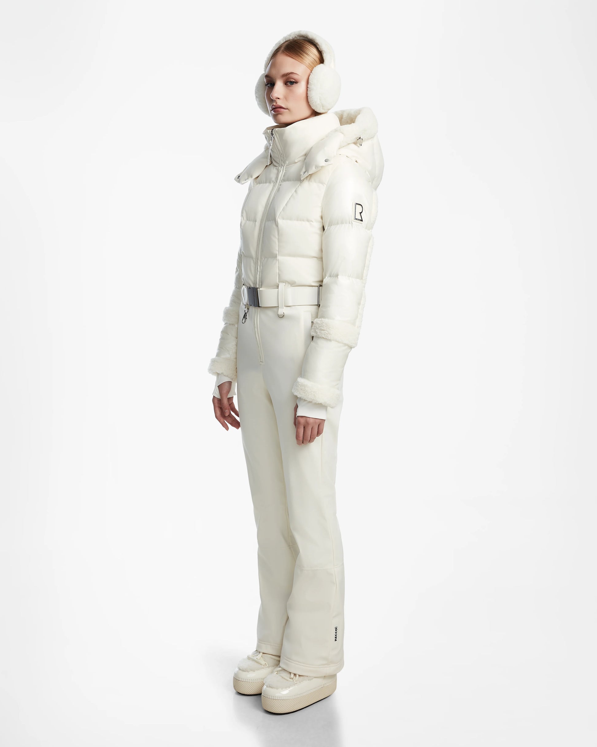 The CARMEN by RUDSAK is a fitted one-piece ski suit that blends performance with bold style. It features a sleek silhouette with a technical stretch exterior and quilted upper body with glossy quilted sleeves, accented by luxe faux shearling details. A hood, vegan leather trims, and a removable waist belt offer both functionality and a chic edge. Hip pockets, back zippers on the legs, and reinforced inner kick panels enhance practicality, while RECCO rescue technology provides safety. This eye-catching ski suit is designed for making a bold statement on the slopes.