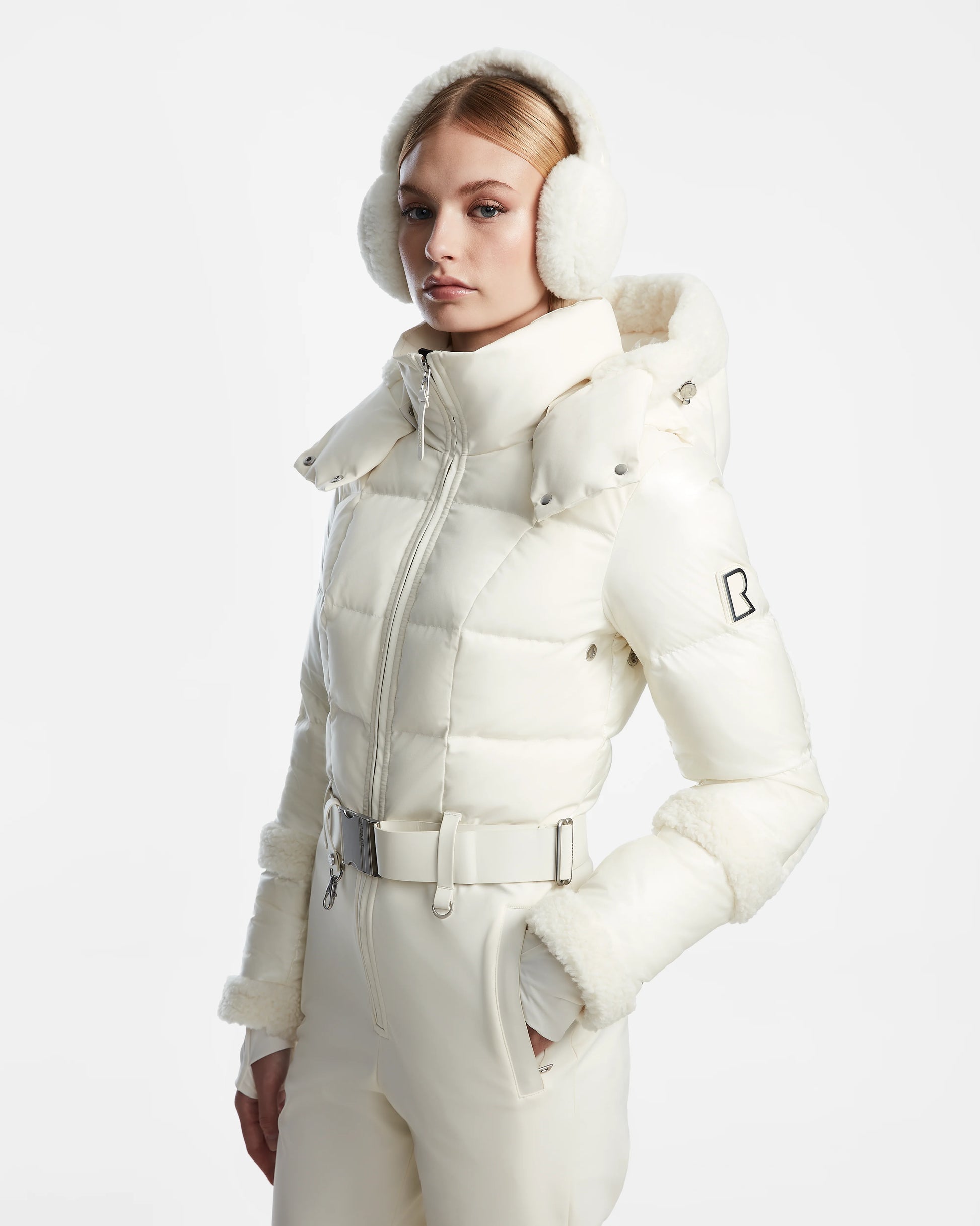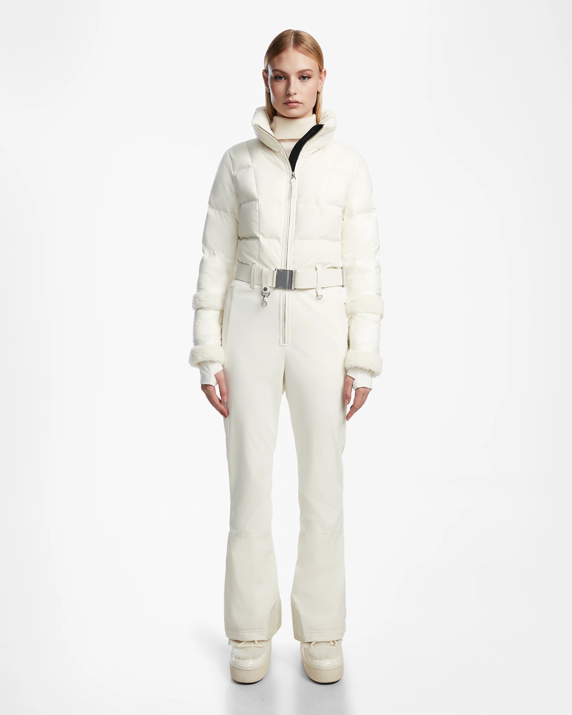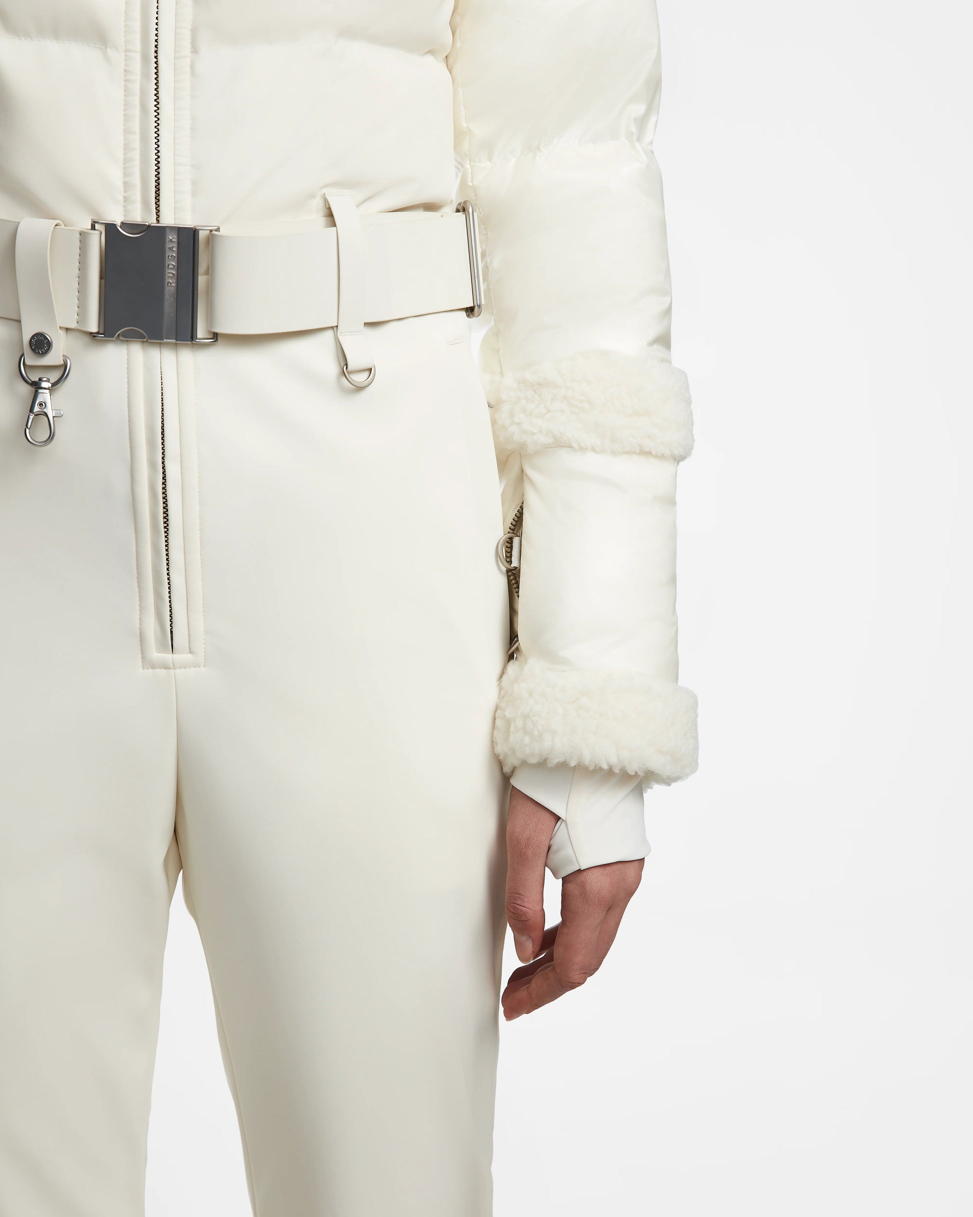 The CARMEN by RUDSAK is a fitted one-piece ski suit that blends performance with bold style. It features a sleek silhouette with a technical stretch exterior and quilted upper body with glossy quilted sleeves, accented by luxe faux shearling details. A hood, vegan leather trims, and a removable waist belt offer both functionality and a chic edge. Hip pockets, back zippers on the legs, and reinforced inner kick panels enhance practicality, while RECCO rescue technology provides safety. This eye-catching ski suit is designed for making a bold statement on the slopes.