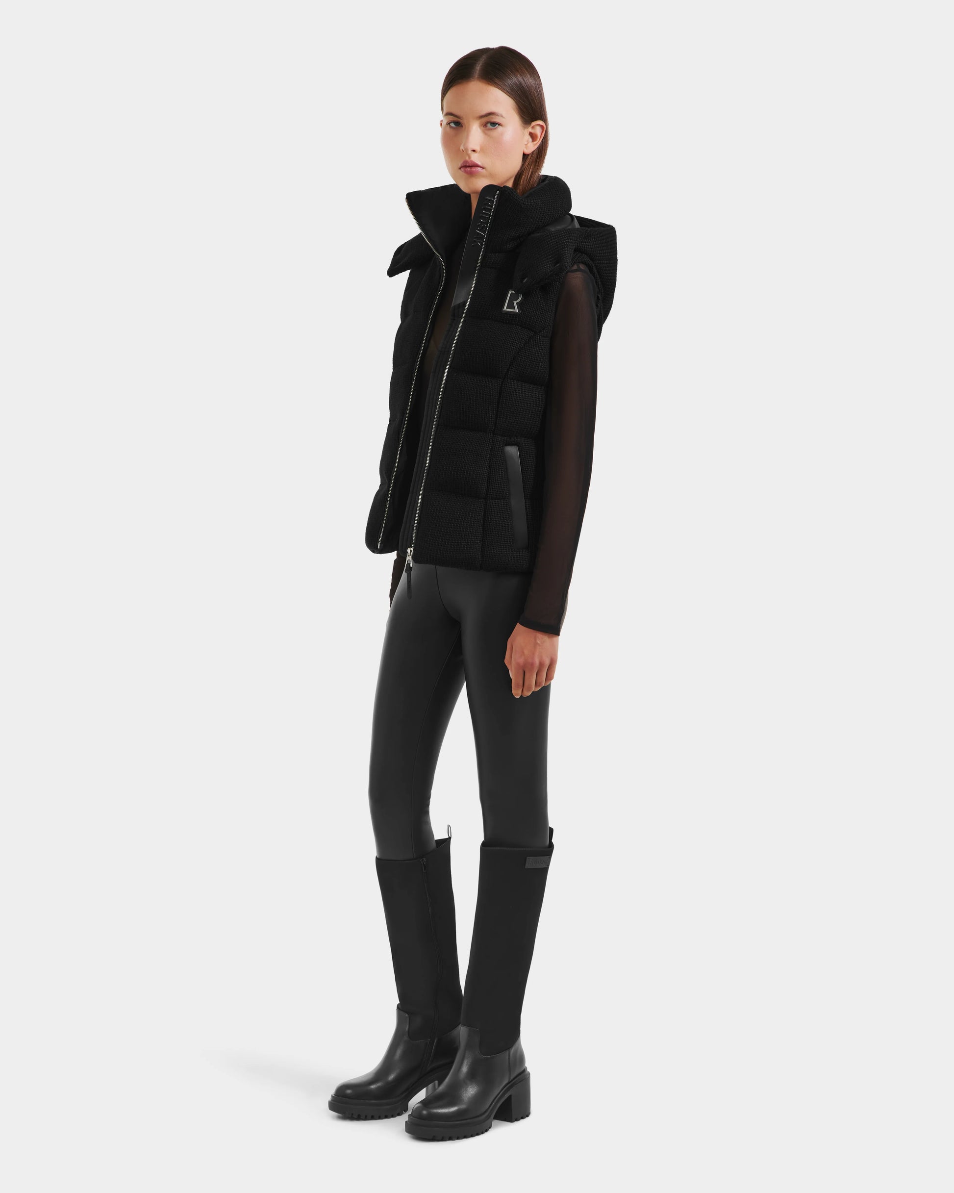 Crafted in a cozy knit wool-blend shell, the CASSIDY by RUDSAK is a women’s fitted down vest that blends softness with structure. This sleeveless silhouette features a high neck and removable hood for customizable coverage, while high-loft down fill provides superior insulation. Zippered pockets and sleek trim details complete the polished look. Perfect for transitional weather and travel days, CASSIDY delivers lightweight warmth with a sophisticated edge—ideal for layering from city strolls to weekend escapes.