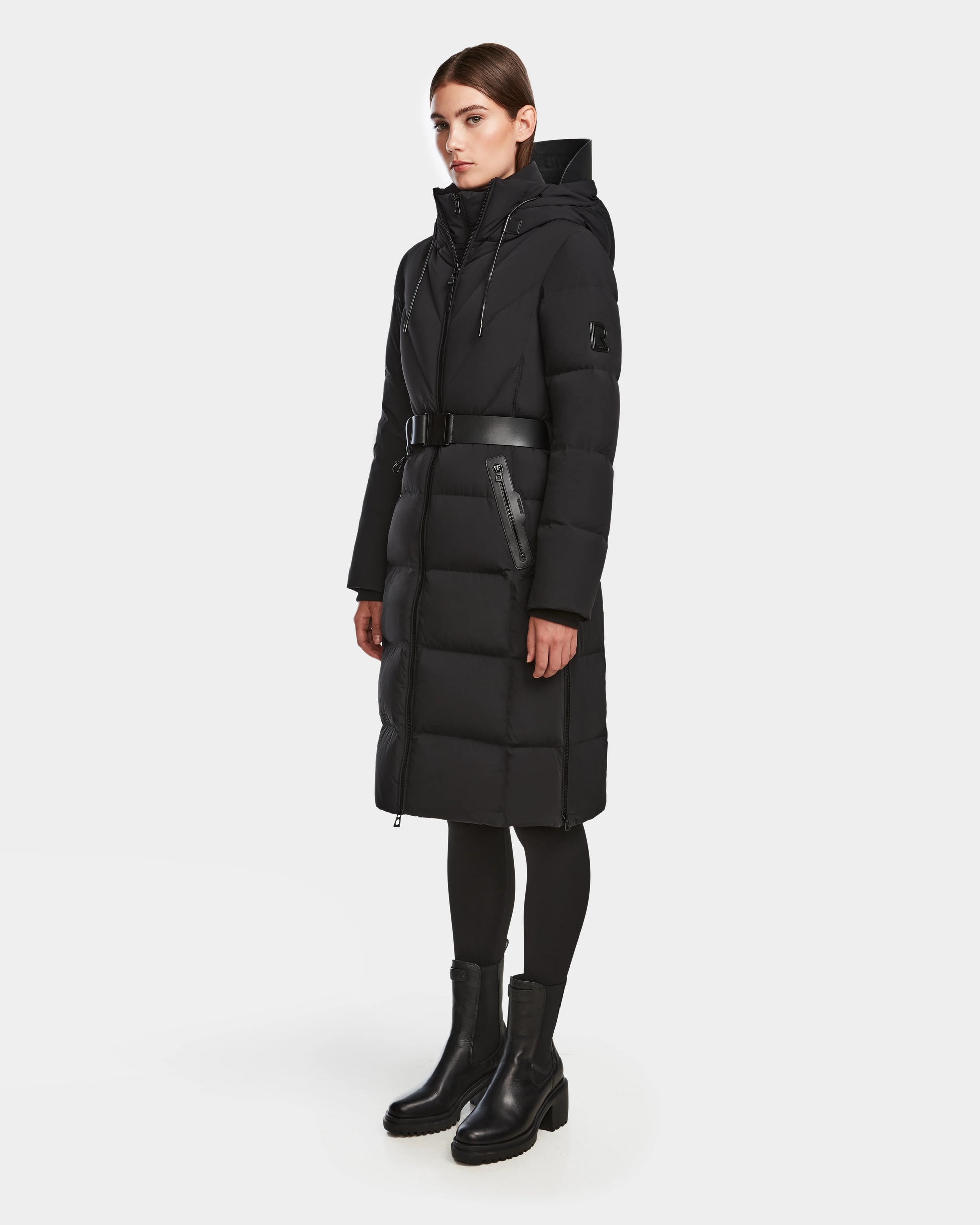 The DALSA by RUDSAK is a women's long-length down quilted puffer with a hood, insulated with RDS-certified down for superior warmth. It features an adjustable waist belt, vegan leather trims, a hood visor, storm cuffs, and a two-way zipper for added versatility. Designed for both style and function, this puffer ensures a flattering silhouette while offering protection against the elements. Perfect for winter days, the DALSA is a must-have for any cold-weather wardrobe.