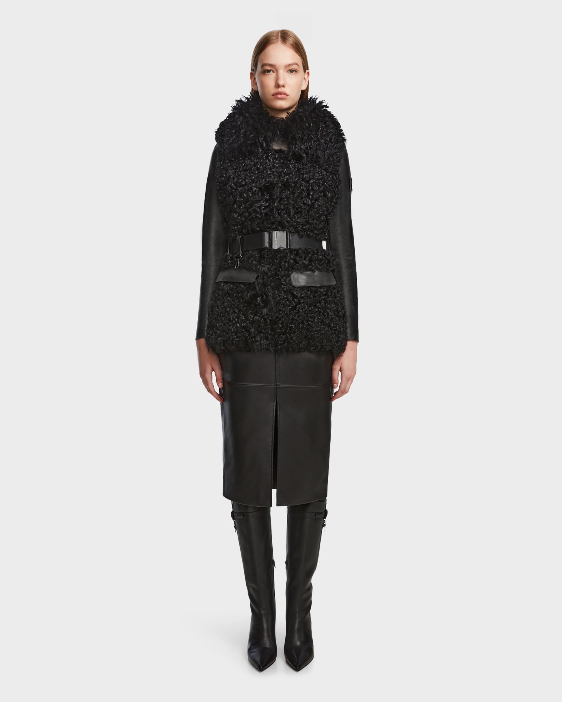 The DASHA by RUDSAK is a women's leather and Mongolian shearling combo jacket, blending rich textures for a luxurious statement piece. The plush shearling contrasts with sleek leather, creating a bold and sophisticated look. A removable belt adds versatility, allowing you to tailor the fit and style to your preference. Perfect for elevating any outfit, the DASHA jacket embodies opulence and modern elegance, making it an essential addition to a fashion-forward wardrobe.