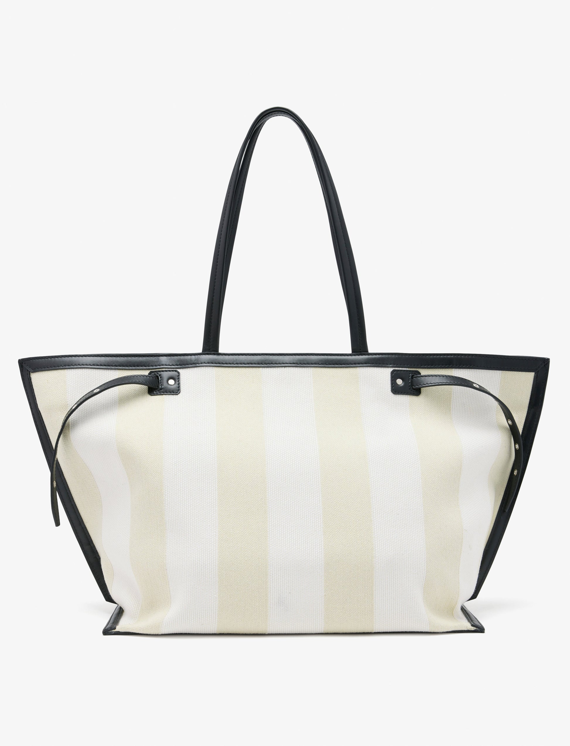 The Days Carryall in Striped Canvas is crafted with two-tone jacquard detailing. Designed in a large carry-all silhouette, it features functional silver-tone side buckles that allow the corners of the bag to be folded inwards or worn loose for a relaxed finish. The tote has a magnetic top closure with an internal monogrammed zip pocket and two patch small patch pockets. Finished with a leather base panel and an exterior embossed logo.