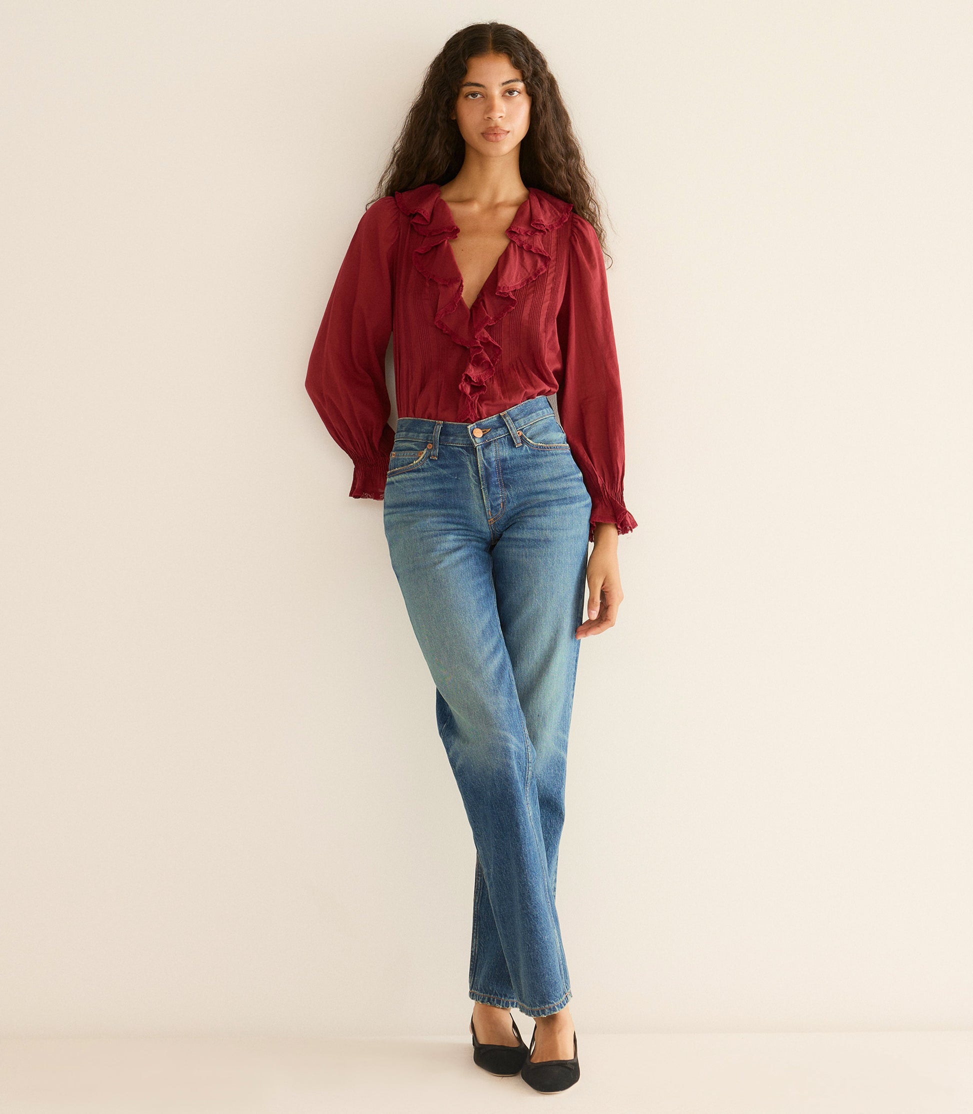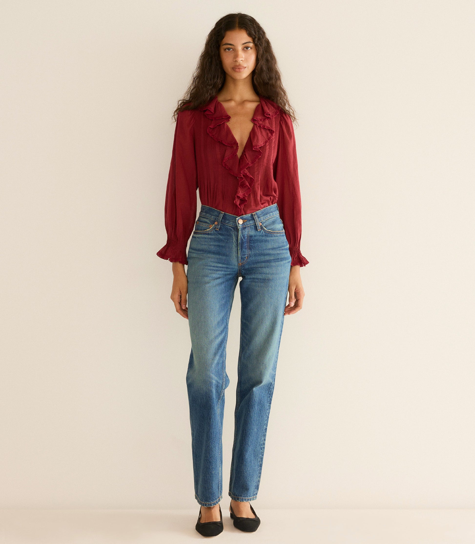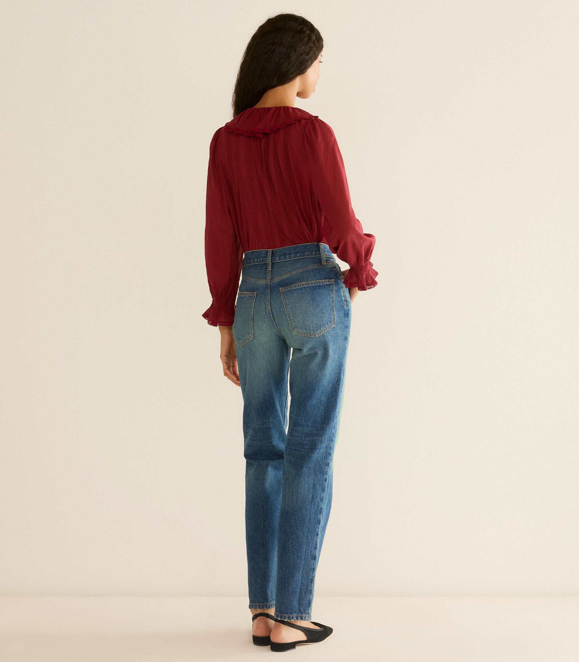 Our classic Diana Jean, now in dark-rinsed Villefort Wash organic cotton denim. It features a high rise, straight leg, pointed back pockets, and a button fly.