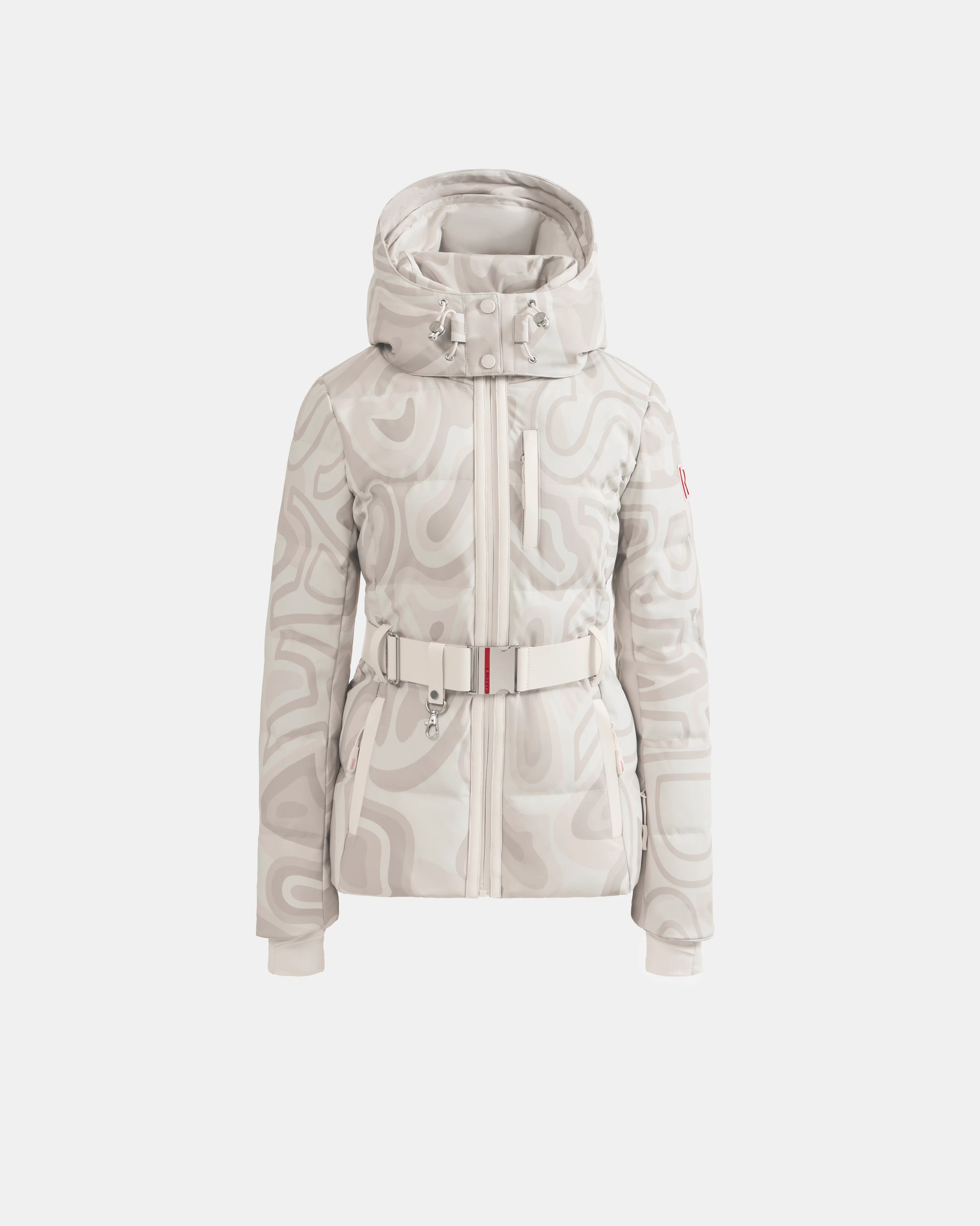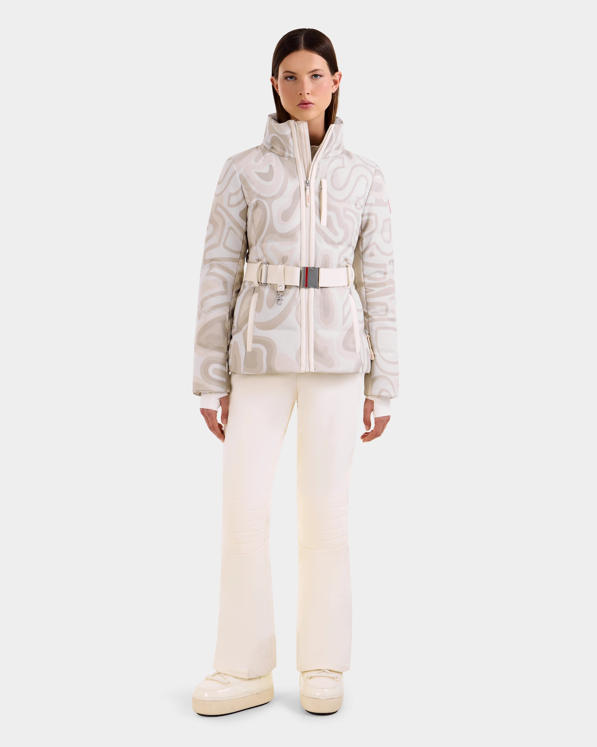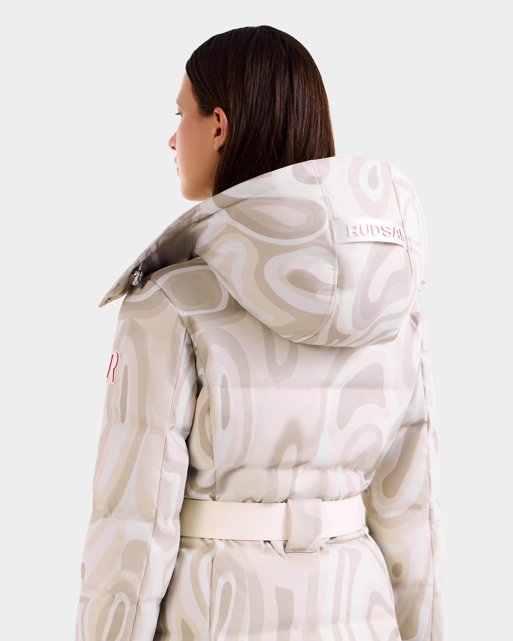JOANNA P by RUDSAK is a women’s down ski jacket refreshed in a soft, sculptural print. The tonal pattern elevates a streamlined silhouette with a removable belt, storm cuffs, and a double front-zip expansion for easy layering. Practical touches—a sleeve ski-pass pocket, inner snow-skirt, and removable hood—keep you slope-ready. Insulated with premium down and equipped with RECCO® rescue technology, it delivers warmth without bulk from first chair to après, finished with smooth hardware and clean proportions.
