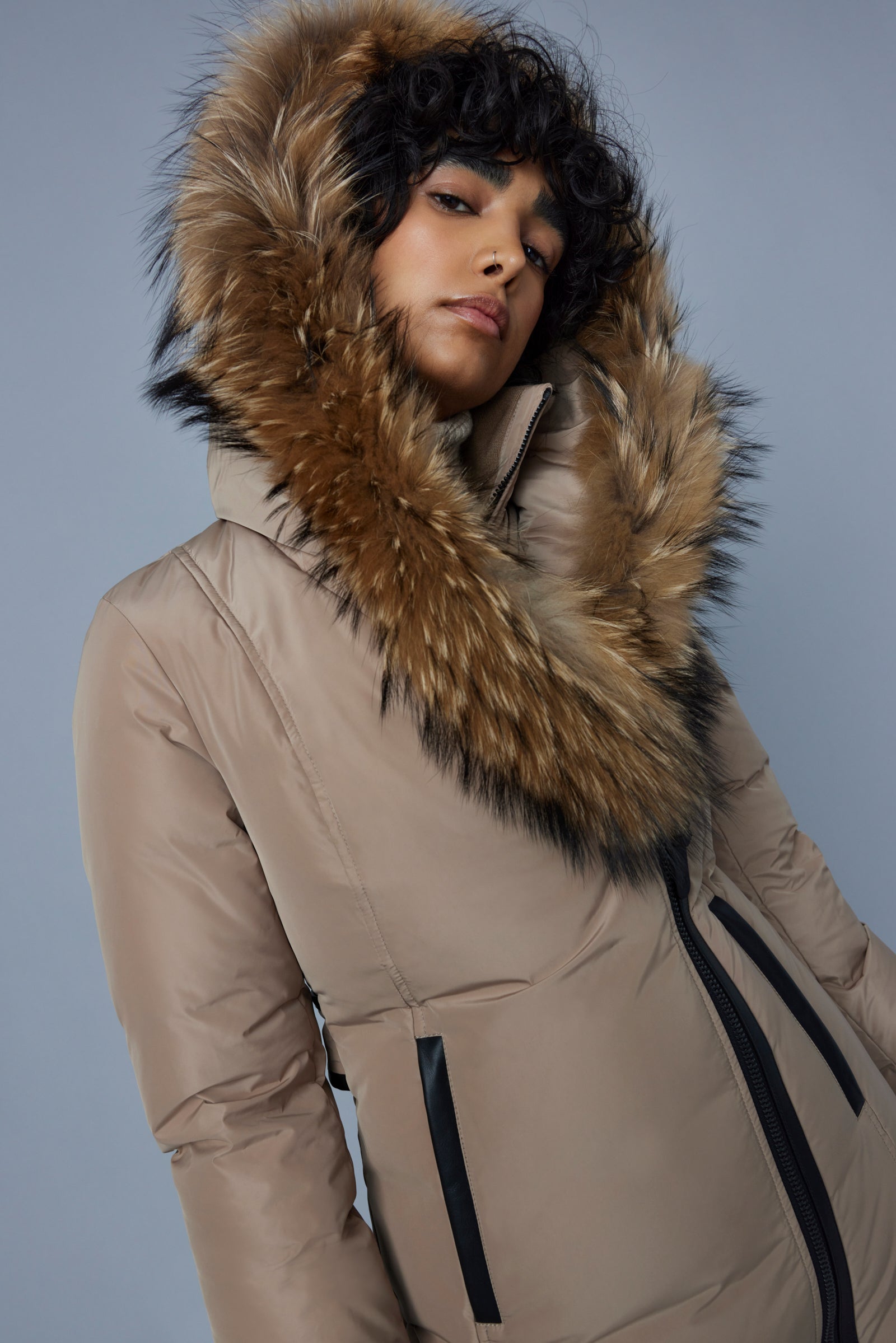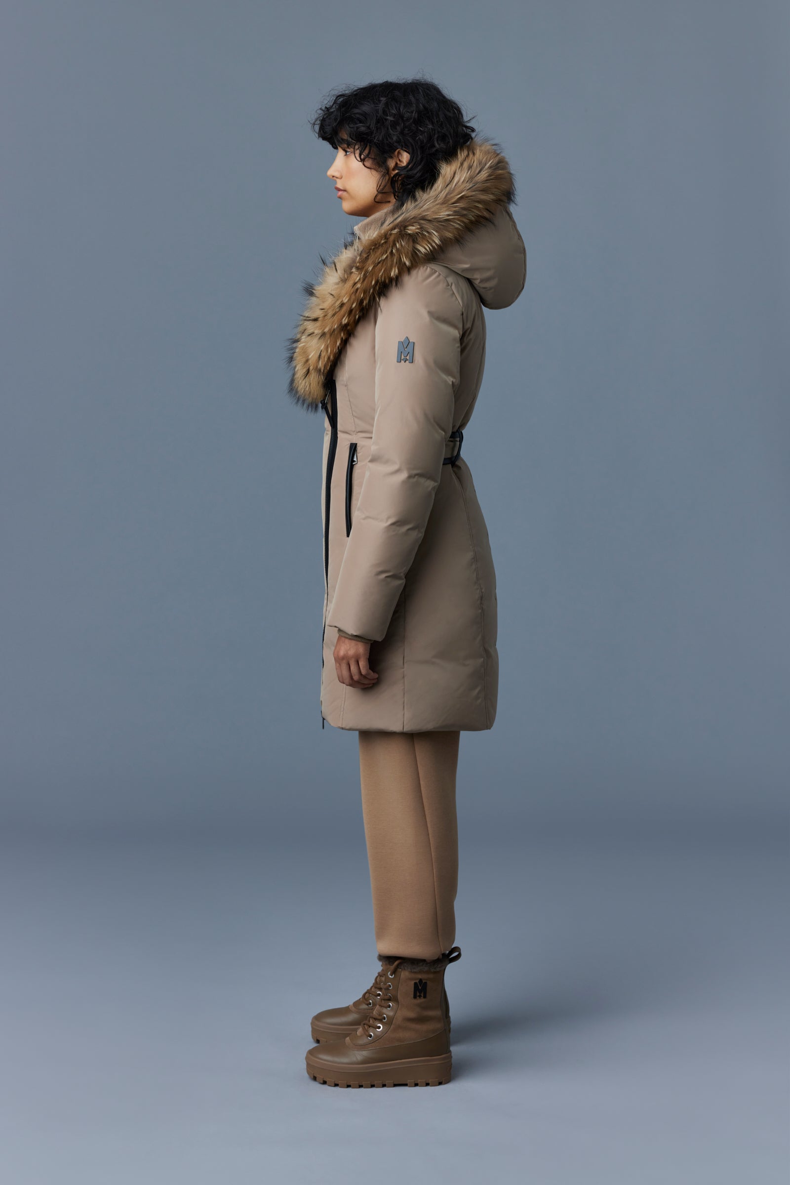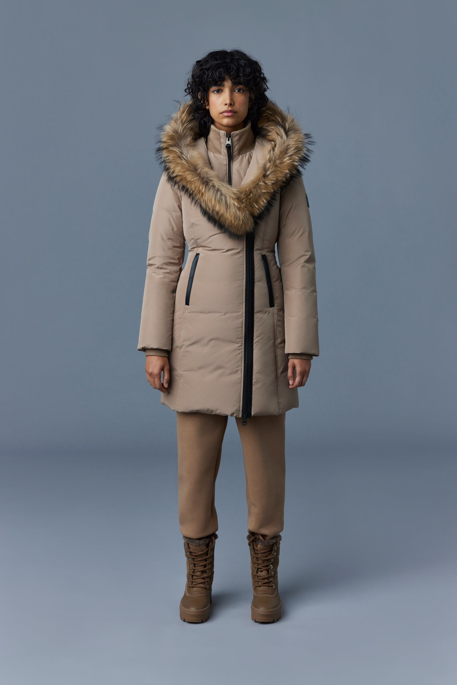 KAY-F is a three-quarter fitted down coat for women featuring a Signature Collar with natural fur and an asymmetrical zip closure. Made from recycled down, it features an inner bib with rib collar, hidden hood toggle, and storm cuffs. Water resistant, repellant, and windproof, insulated leather welt pockets add warmth and function. A design-forward winter essential elevated with directional tailoring.
