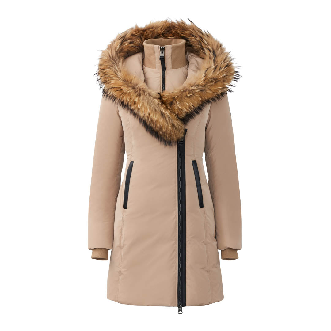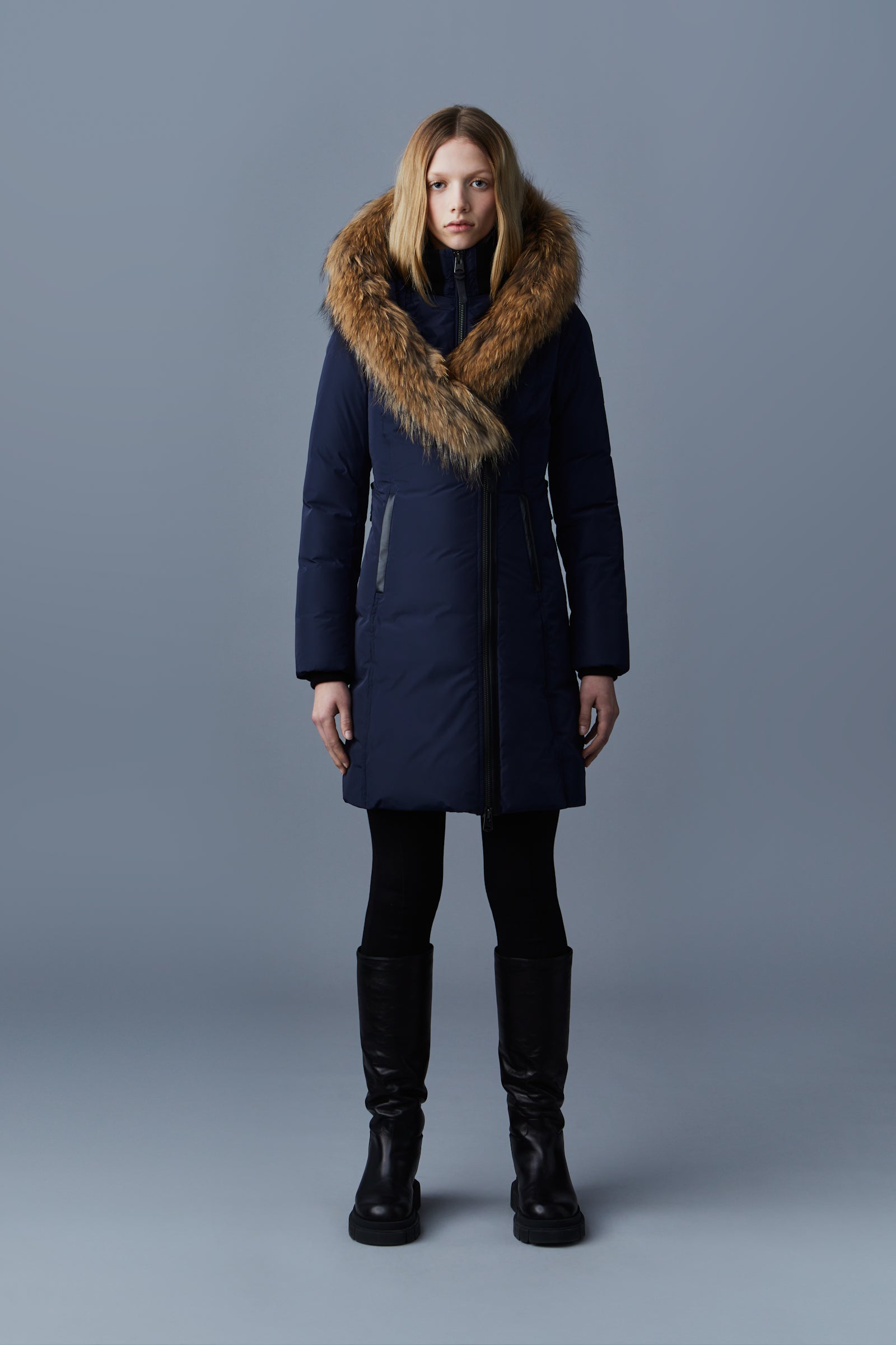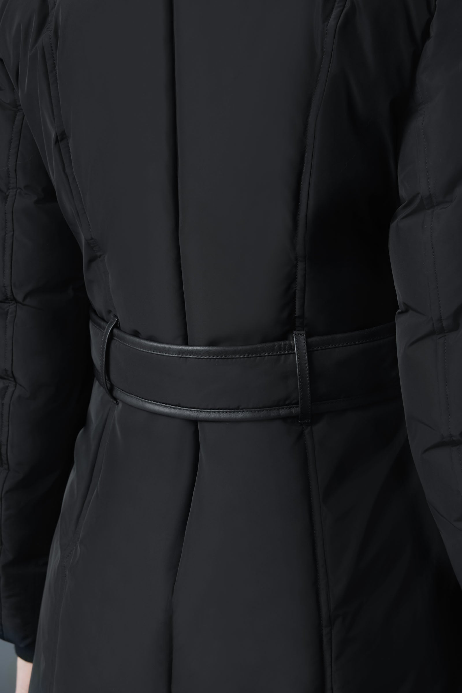 KAY-F is a three-quarter fitted down coat for women featuring a Signature Collar with natural fur and an asymmetrical zip closure. Made from recycled down, it features an inner bib with rib collar, hidden hood toggle, and storm cuffs. Water resistant, repellant, and windproof, insulated leather welt pockets add warmth and function. A design-forward winter essential elevated with directional tailoring.