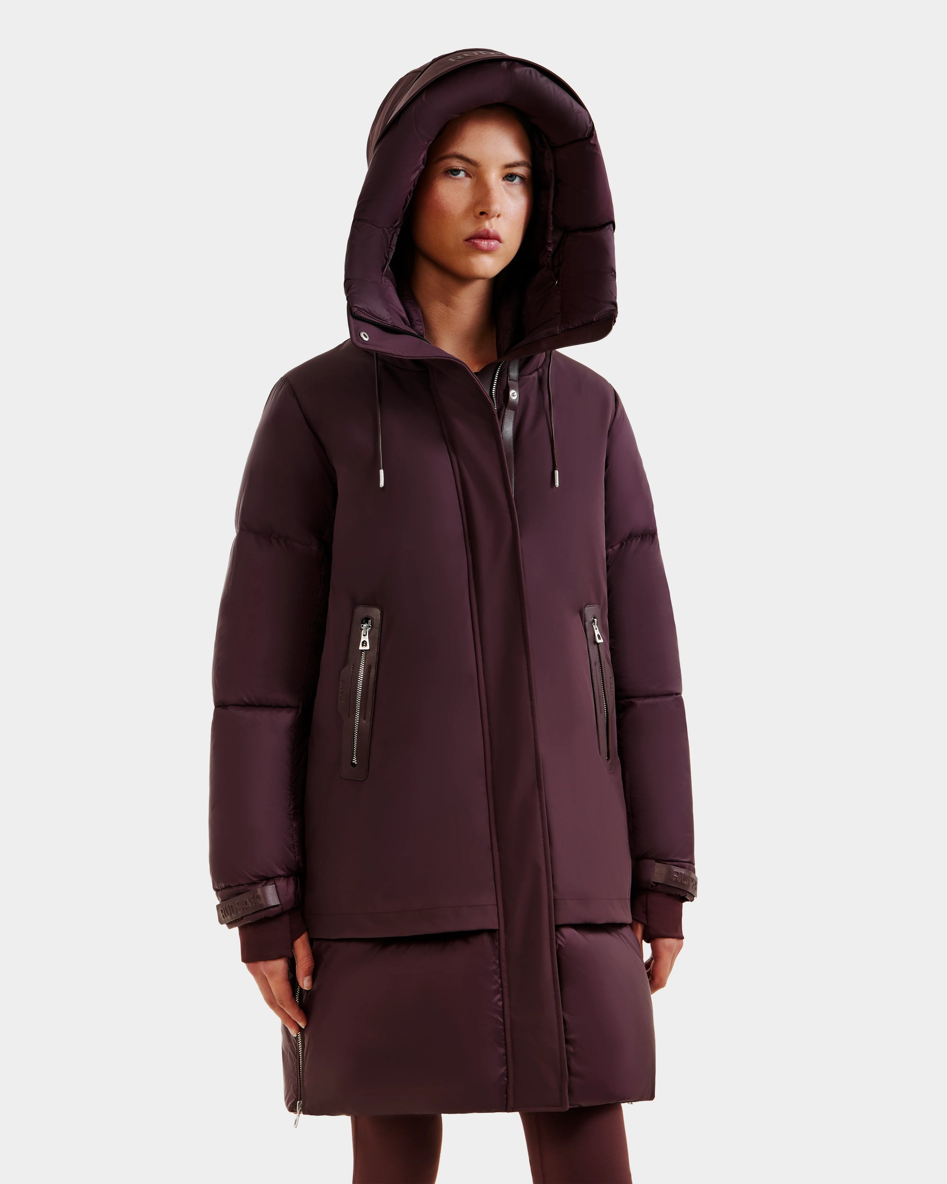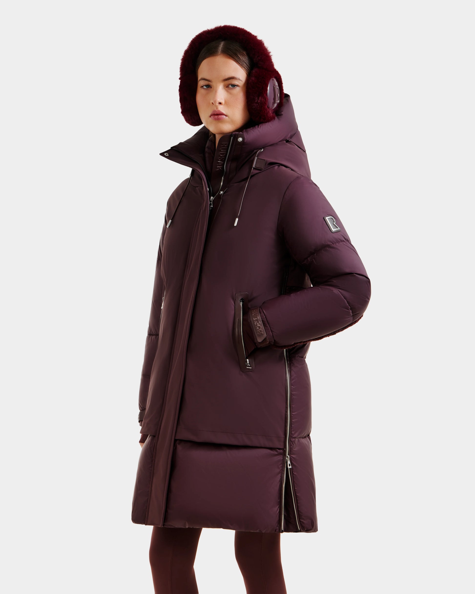 The LAYAN by RUDSAK is a women's down parka with a relaxed mid-length silhouette, designed for warmth and style. Featuring quilted sleeves, a deep hood with a flip-back visor, faux shearling details, and vegan leather trims, this parka blends functionality with luxury. Insulated with premium down, it offers superior protection from winter’s chill. Inner backpack straps add convenience for easy carrying when not worn, making the LAYAN a chic and practical winter essential.