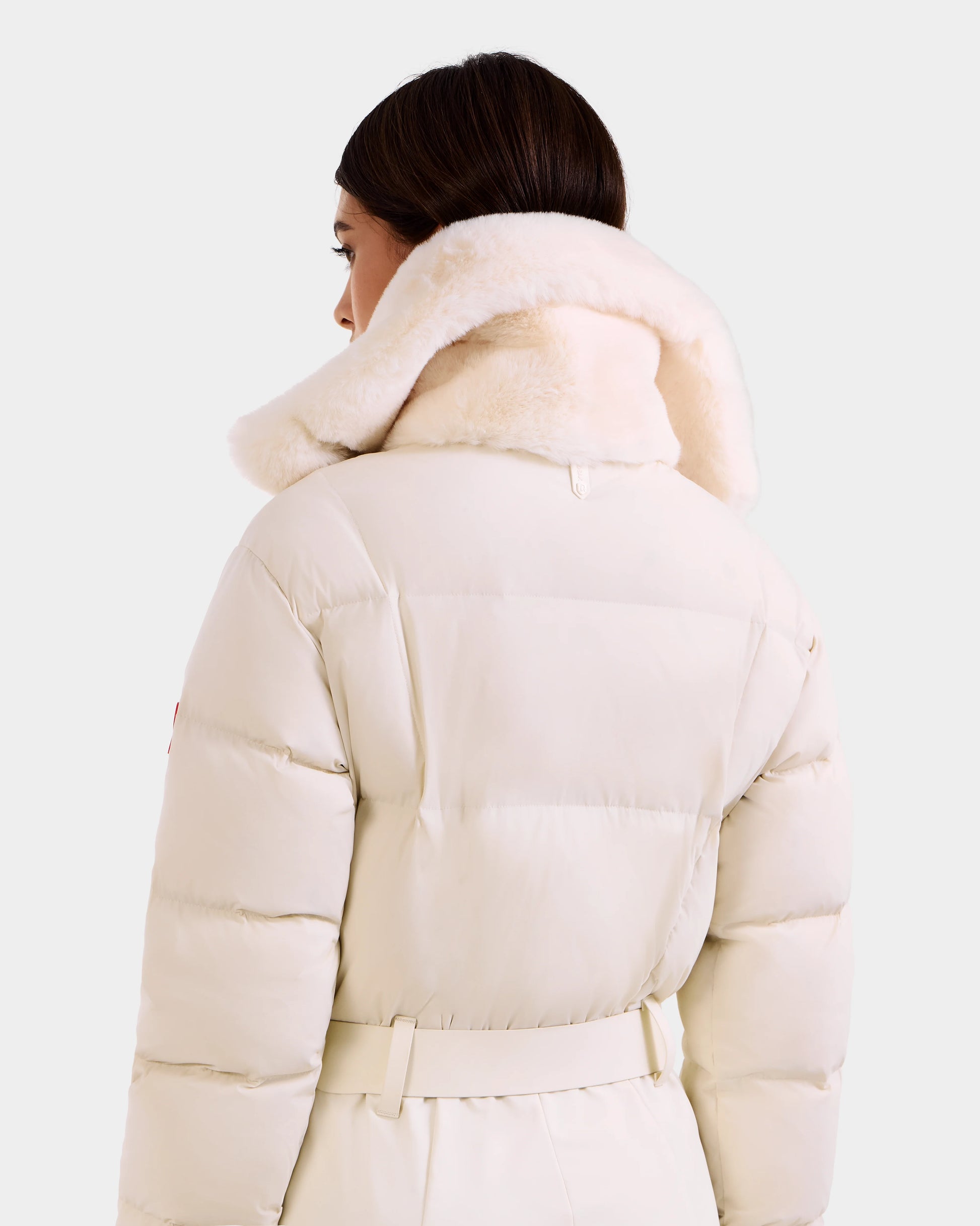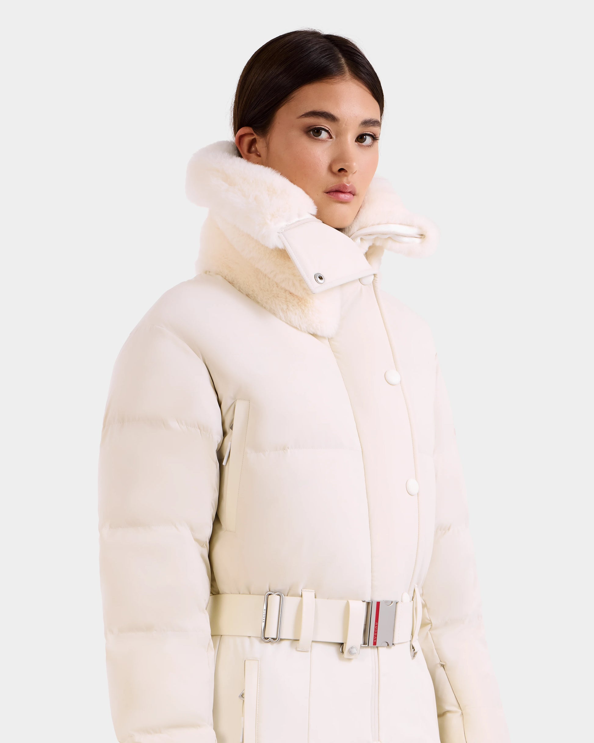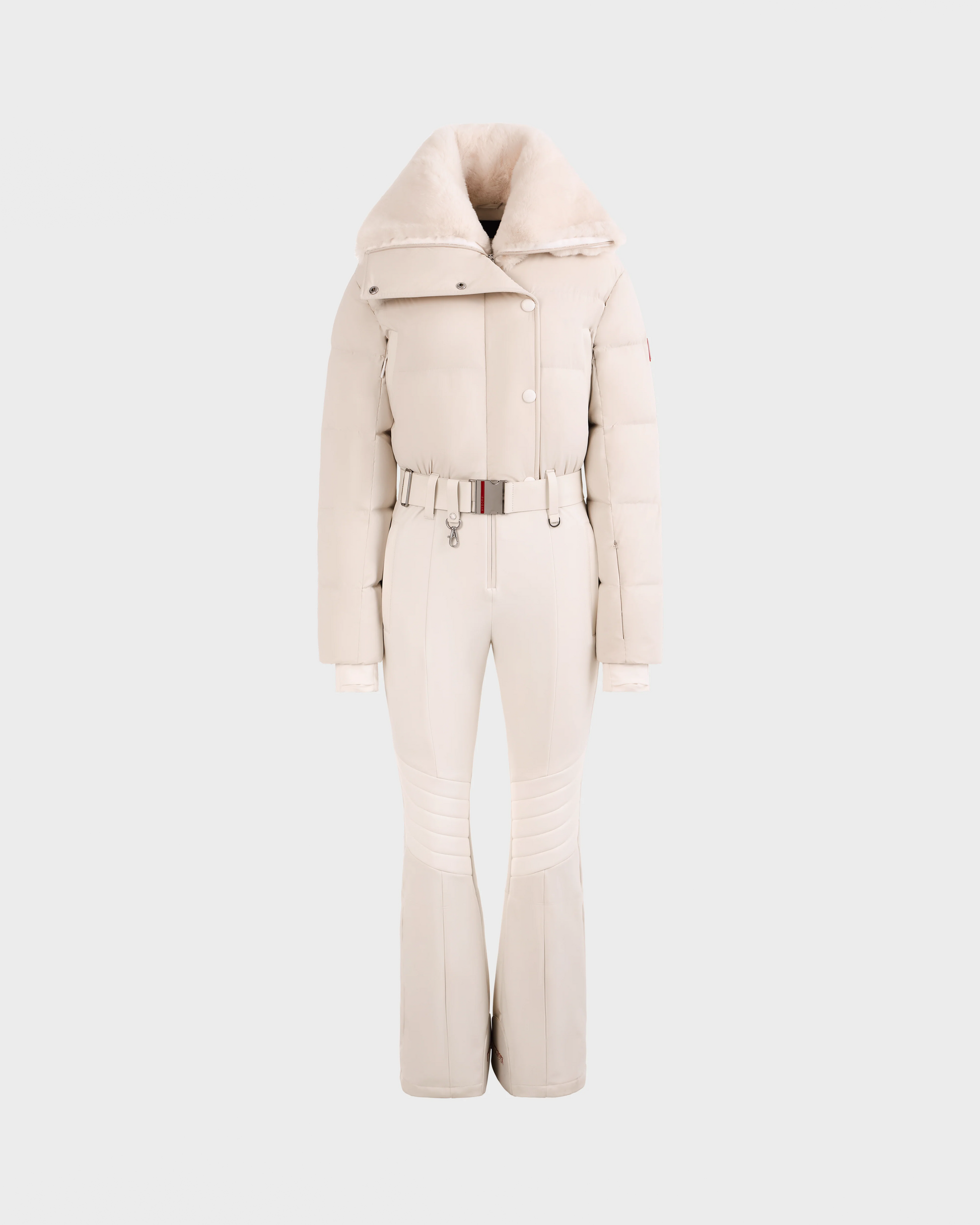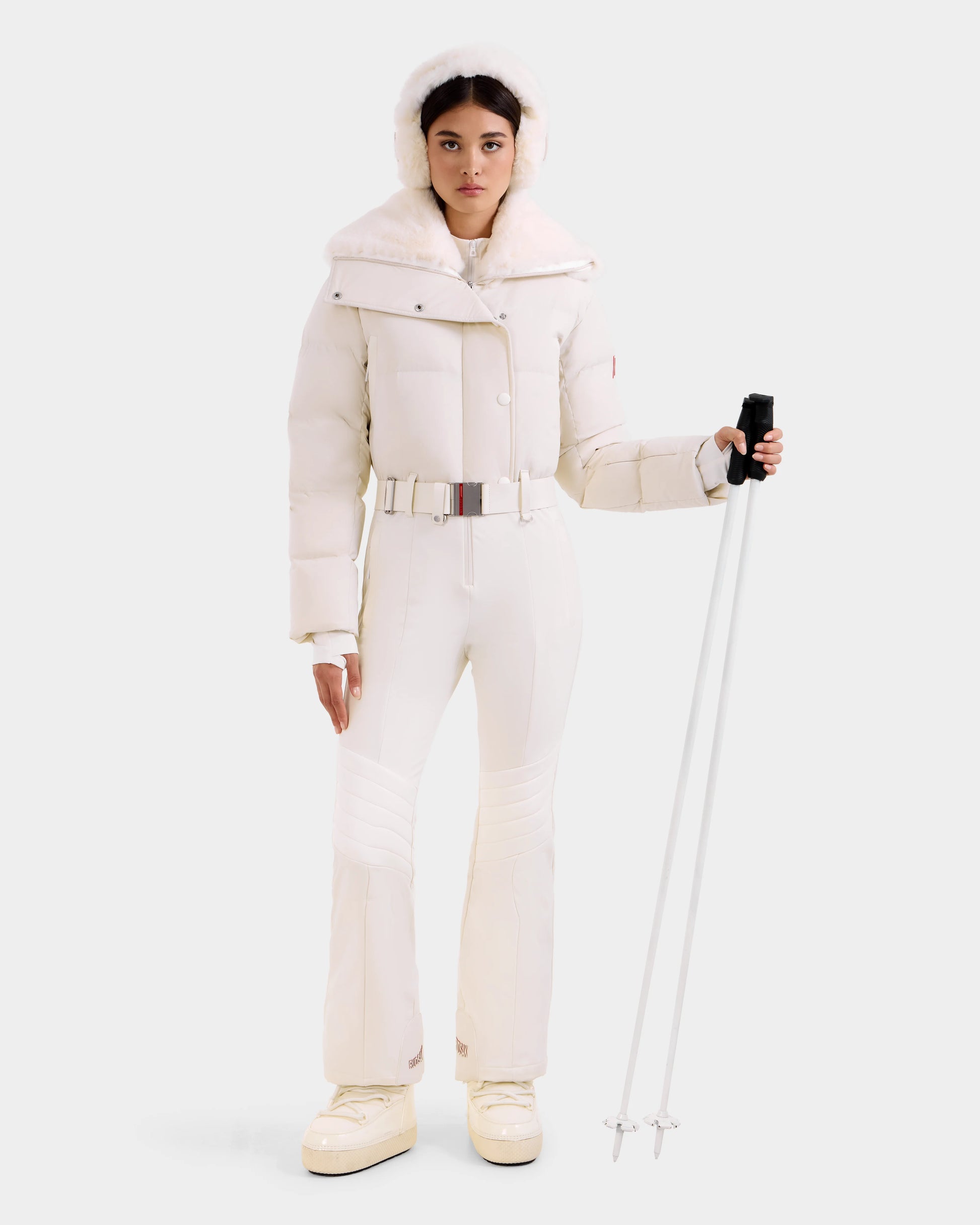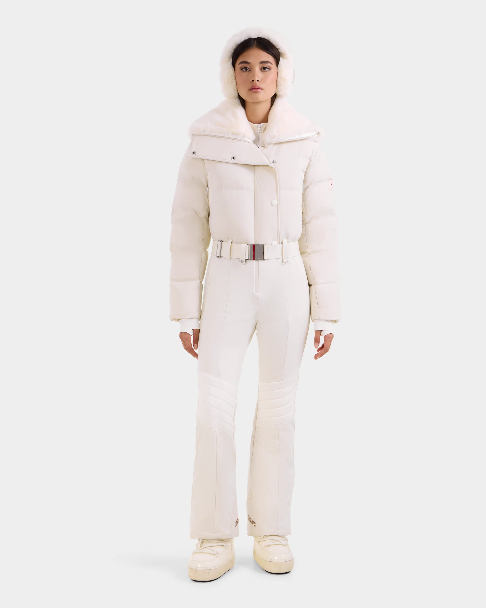 The LOVE by RUDSAK is a women's fitted one-piece ski suit designed for both performance and style. Featuring a luxurious faux fur shawl collar, it boasts a technical stretch exterior with a cozy polar inner finish for warmth and flexibility. Quilted knee panels, vegan leather trims, and a removable vegan leather waist belt add a chic edge. With hip pockets, zippered ski pass storage on the sleeve, and back-opening zippers on the legs with reinforced inner kick panels, it offers convenience and durability. Equipped with RECCO rescue technology for added safety, the LOVE ski suit blends fashion and function effortlessly.