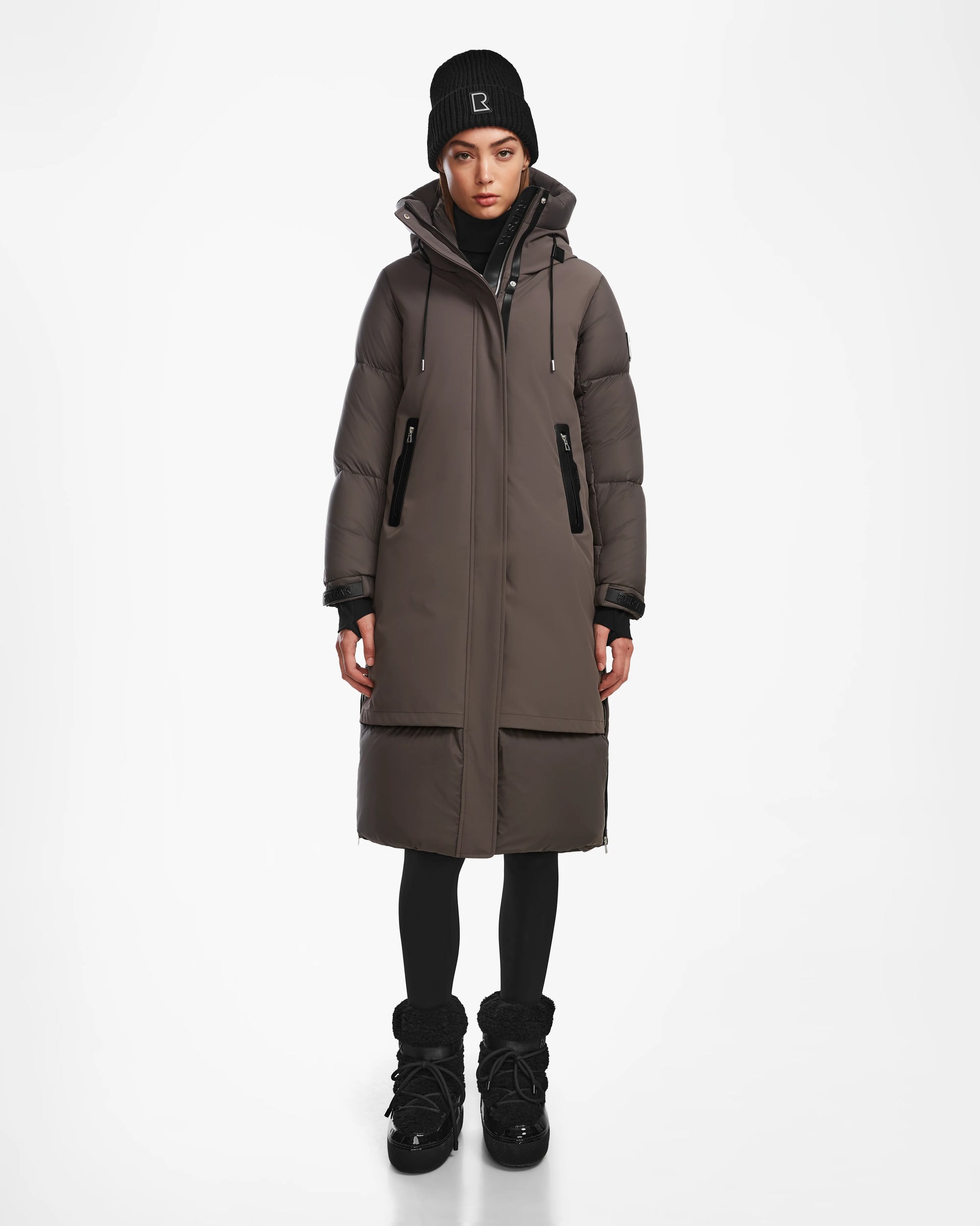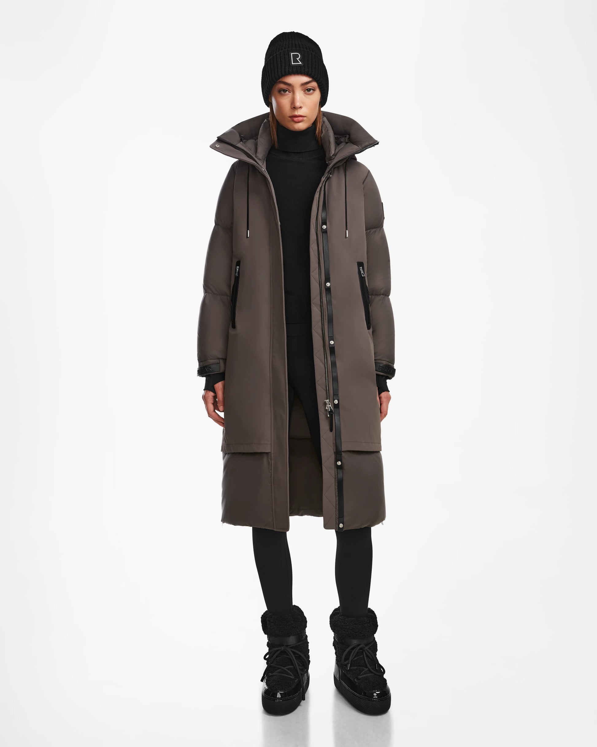 The LOWA by RUDSAK is a women's down parka featuring a relaxed long silhouette, quilted sleeves, and a deep hood with a flip-back visor. Insulated with RDS-certified down, it offers exceptional warmth, while side-zipper openings provide ease of movement. Faux shearling details and vegan leather trims add a luxurious touch, and inner backpack straps allow for easy carrying when not worn. This parka combines style and functionality, making it a perfect winter essential for staying warm and chic.