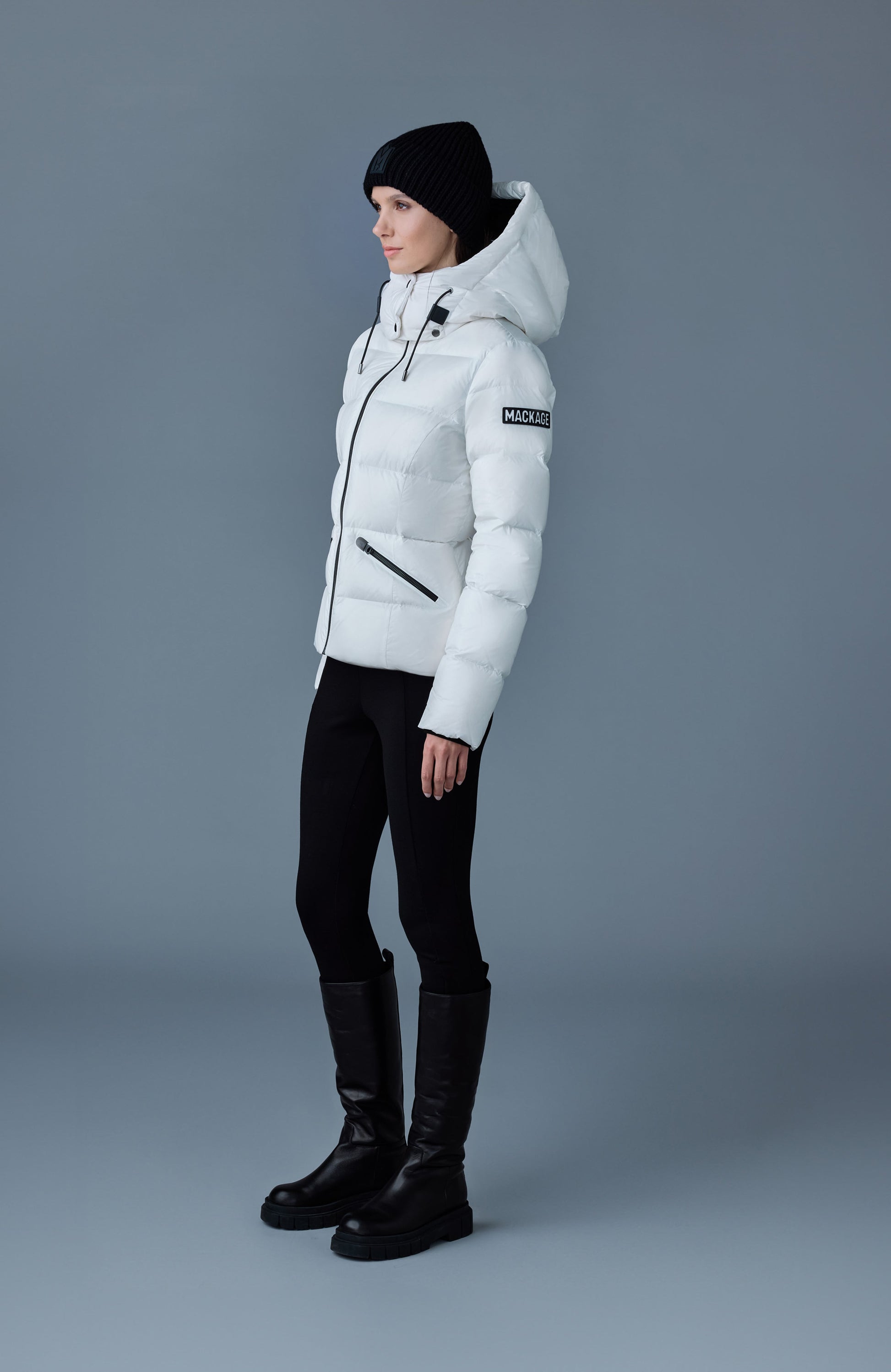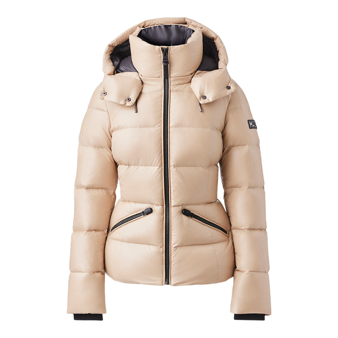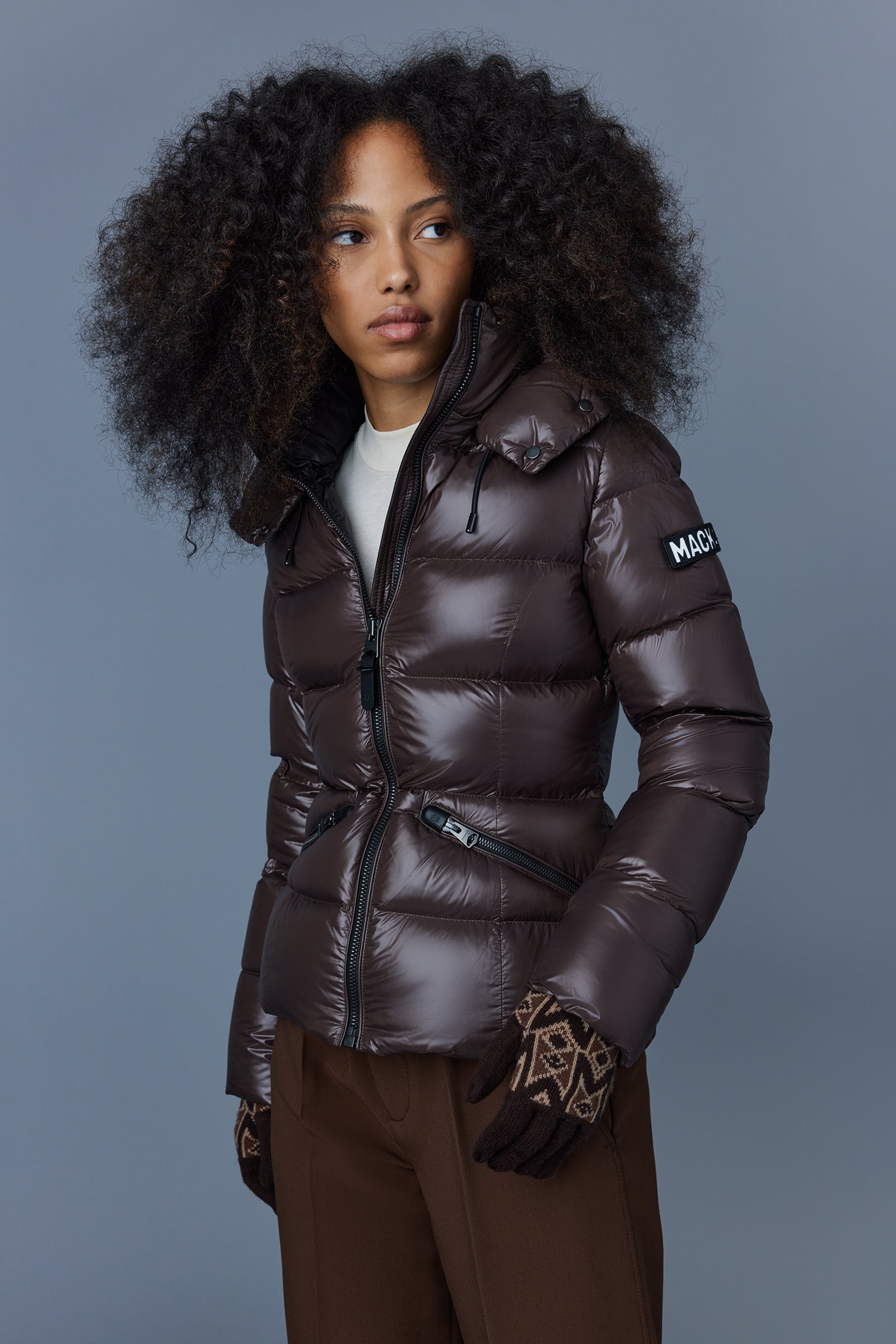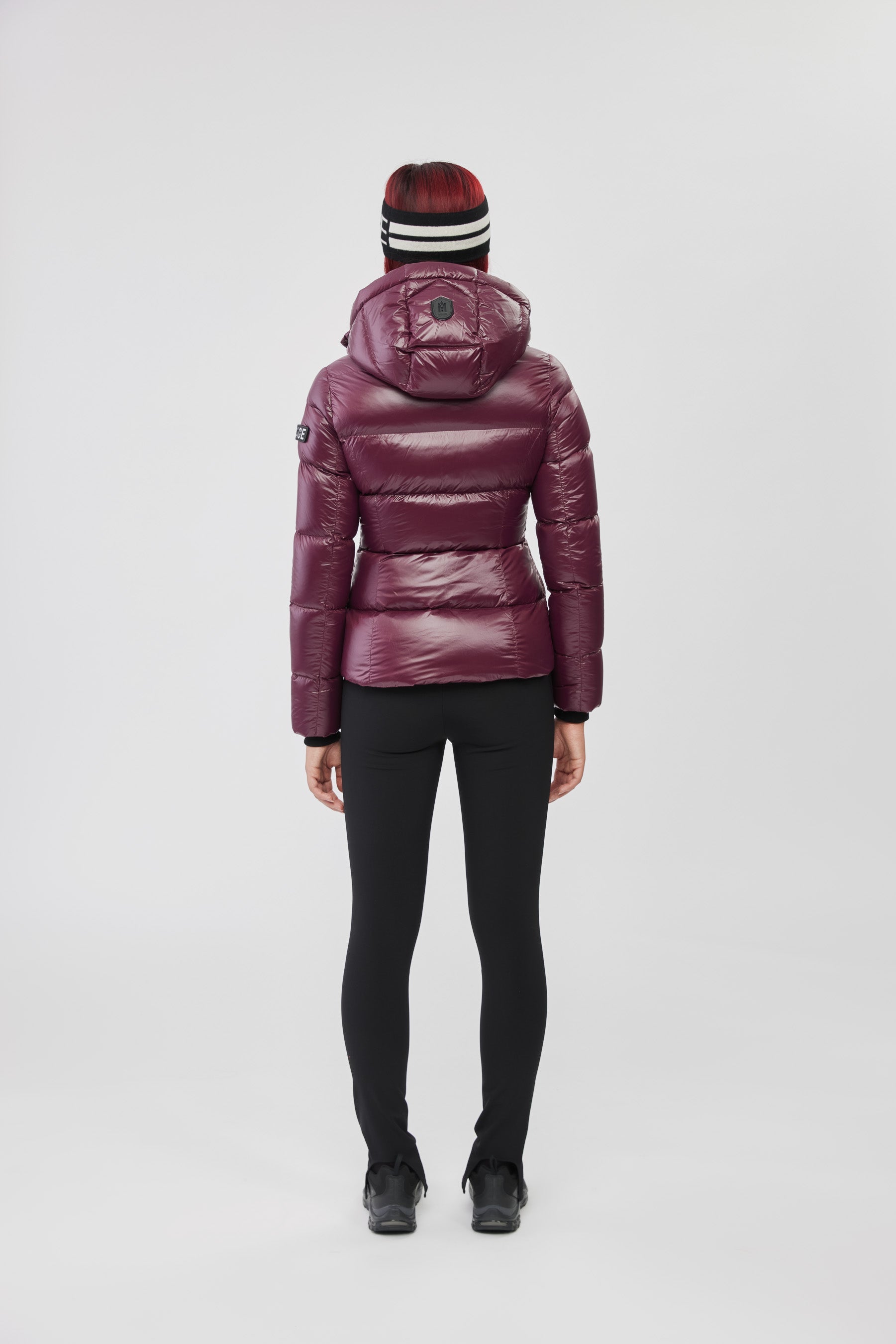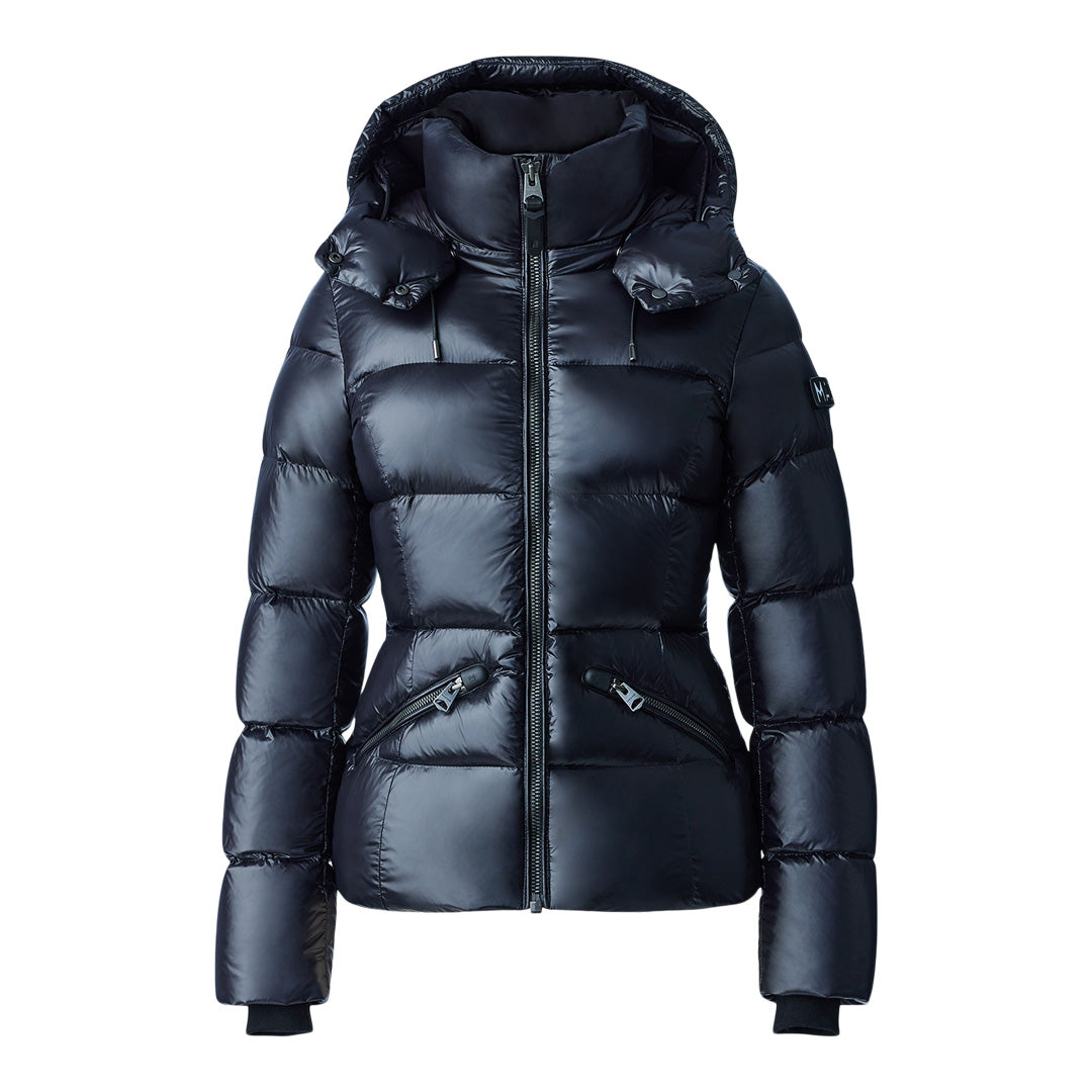 MADALYN is a recycled nano down jacket for women with a removable storm visor hood. Lightweight and tailored to a classic fitted silhouette, the high-sheen channel quilt shell delivers perfect warmth through the seasons. Rib knit cuffs and insulated zip pockets lend comfort. 3D zip pull covers and our signature wordmark add defining detail.