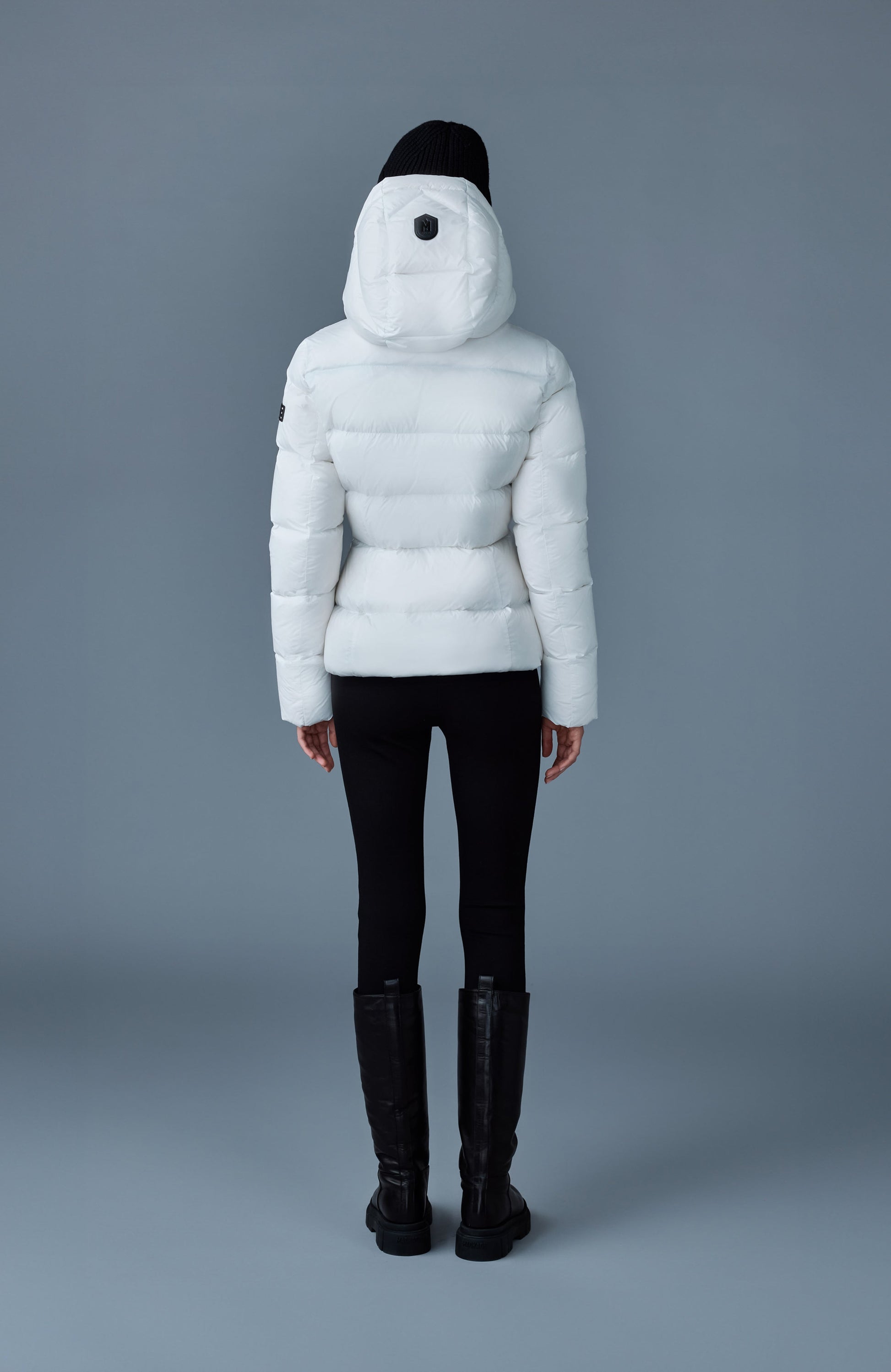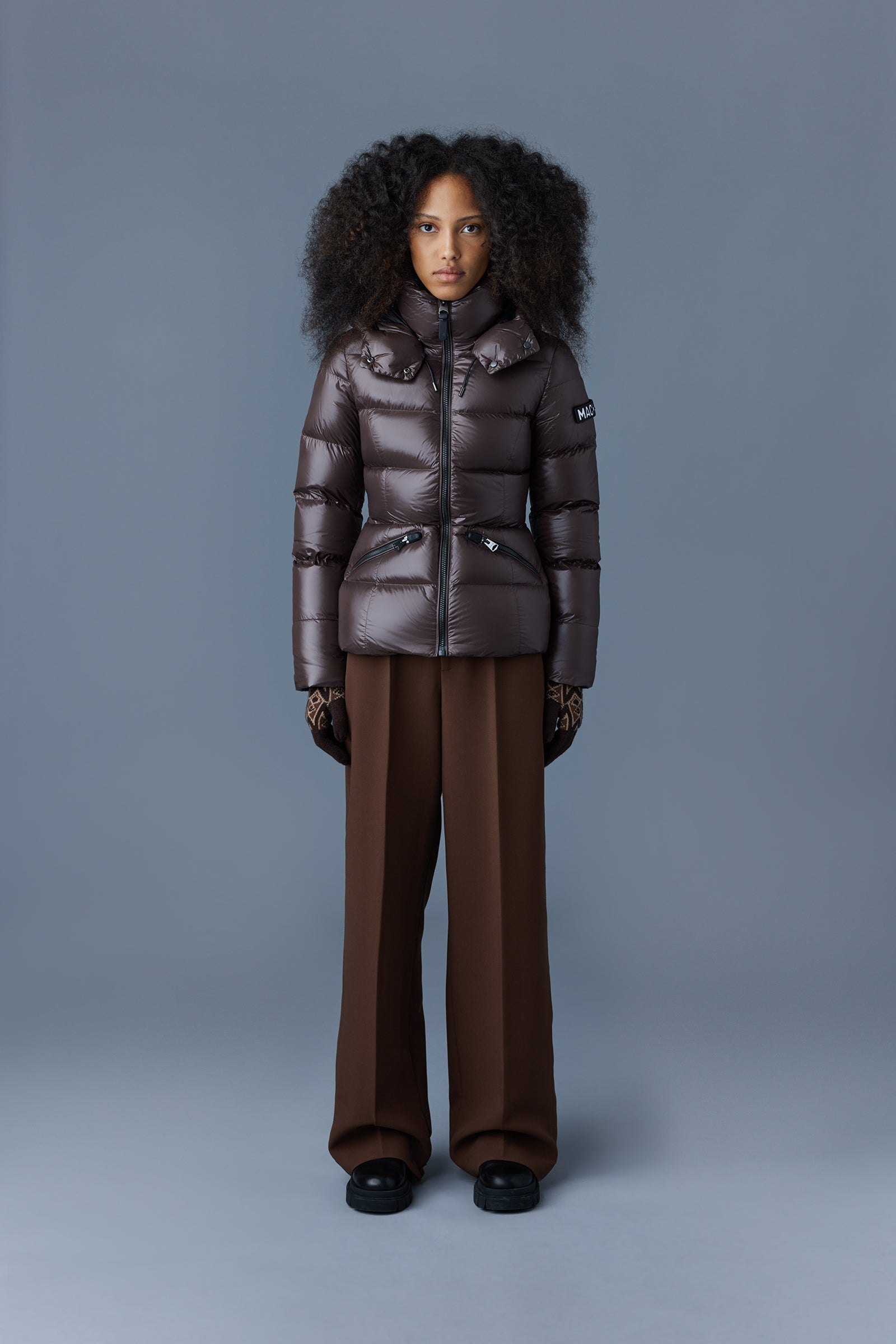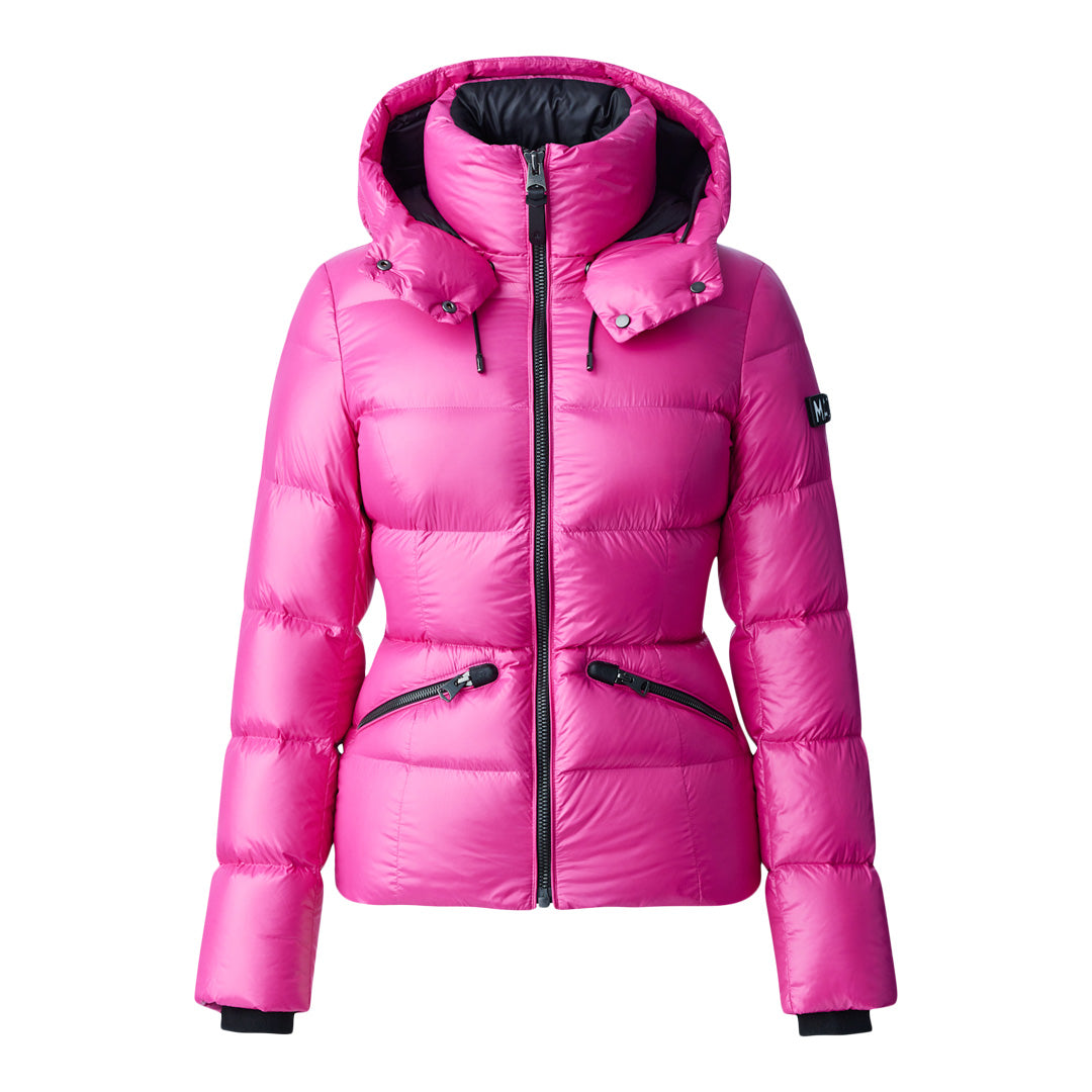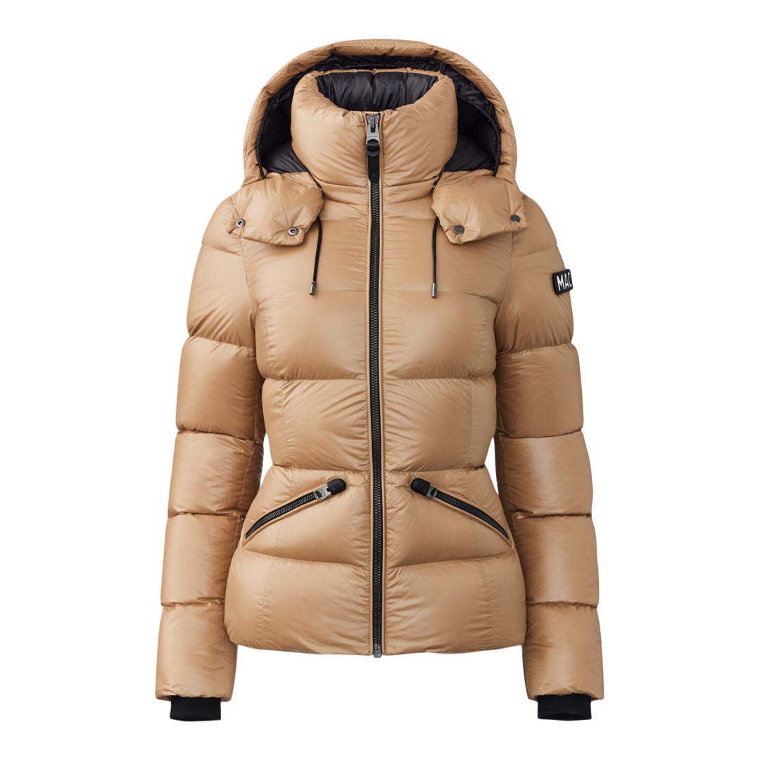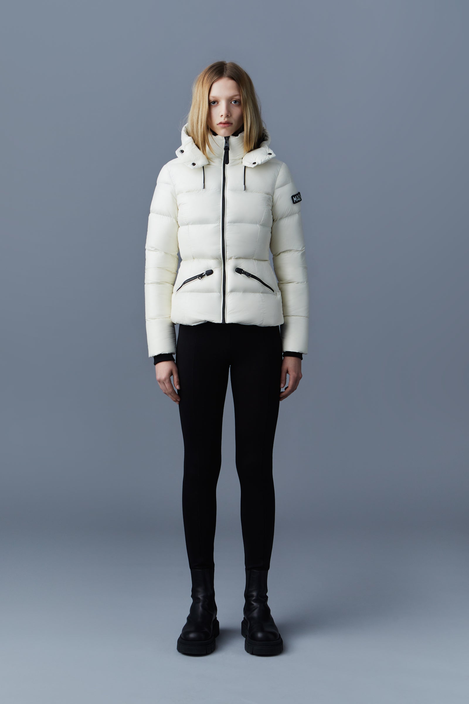 MADALYN is a recycled nano down jacket for women with a removable storm visor hood. Lightweight and tailored to a classic fitted silhouette, the high-sheen channel quilt shell delivers perfect warmth through the seasons. Rib knit cuffs and insulated zip pockets lend comfort. 3D zip pull covers and our signature wordmark add defining detail.