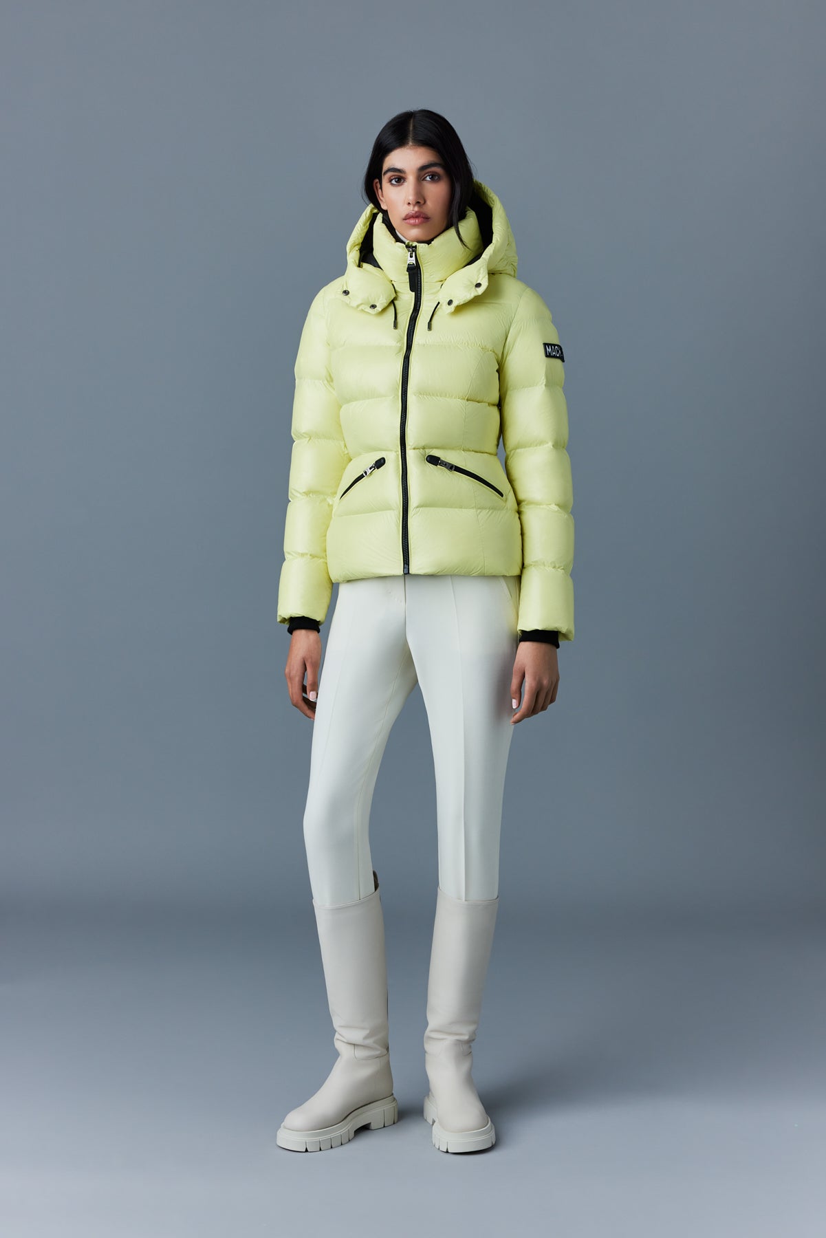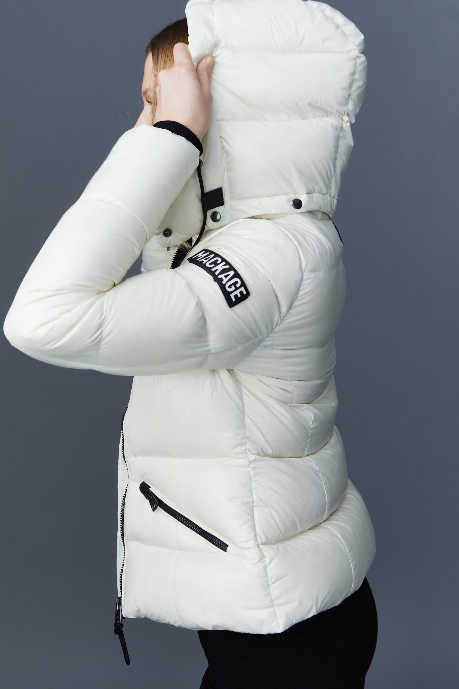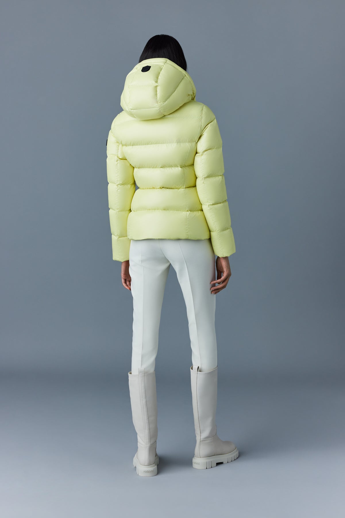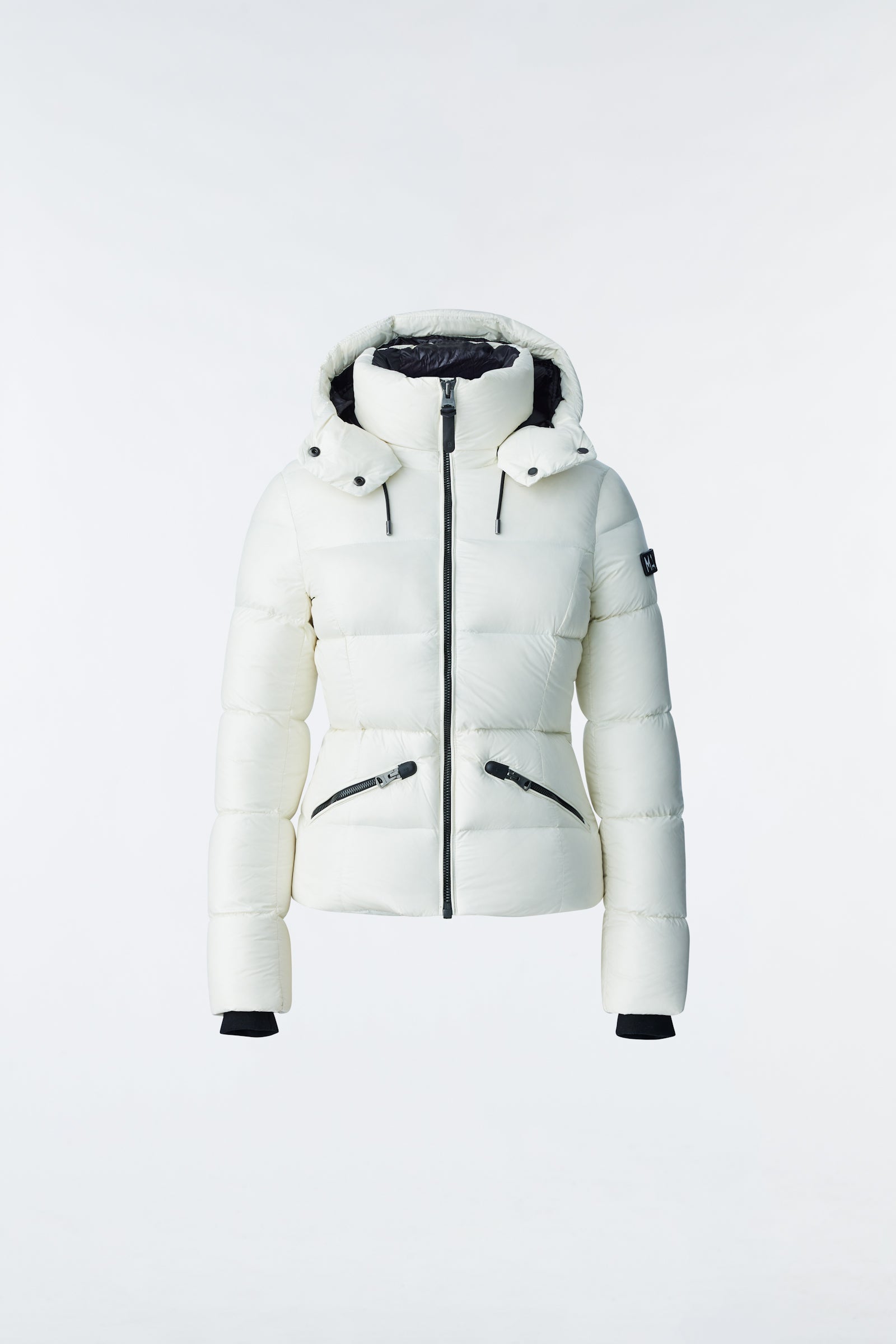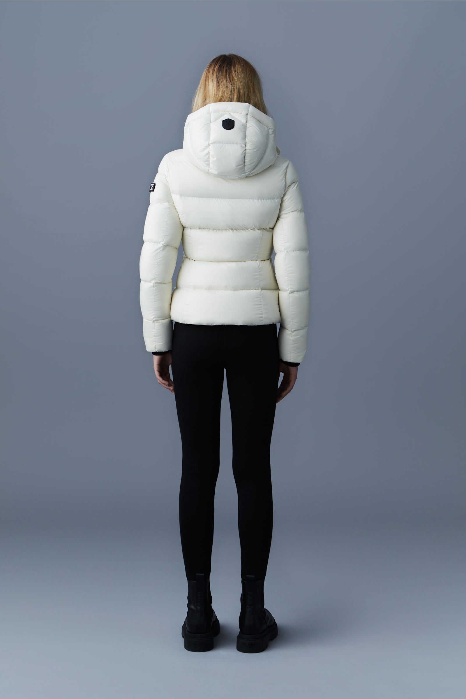MADALYN is a recycled nano down jacket for women with a removable storm visor hood. Lightweight and tailored to a classic fitted silhouette, the high-sheen channel quilt shell delivers perfect warmth through the seasons. Rib knit cuffs and insulated zip pockets lend comfort. 3D zip pull covers and our signature wordmark add defining detail.