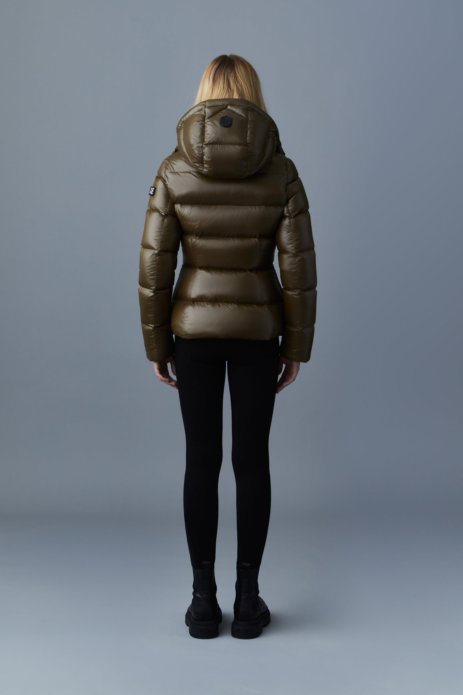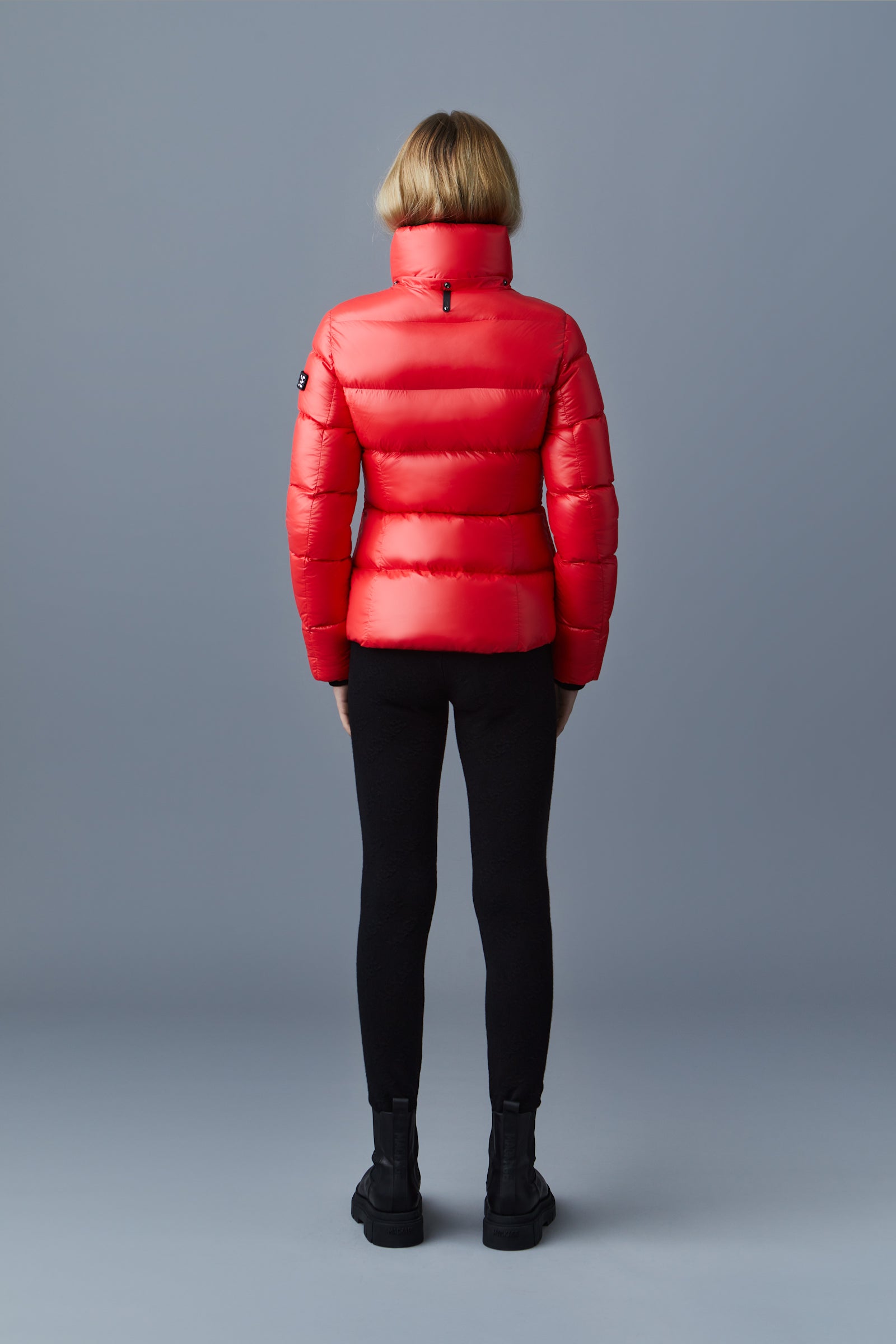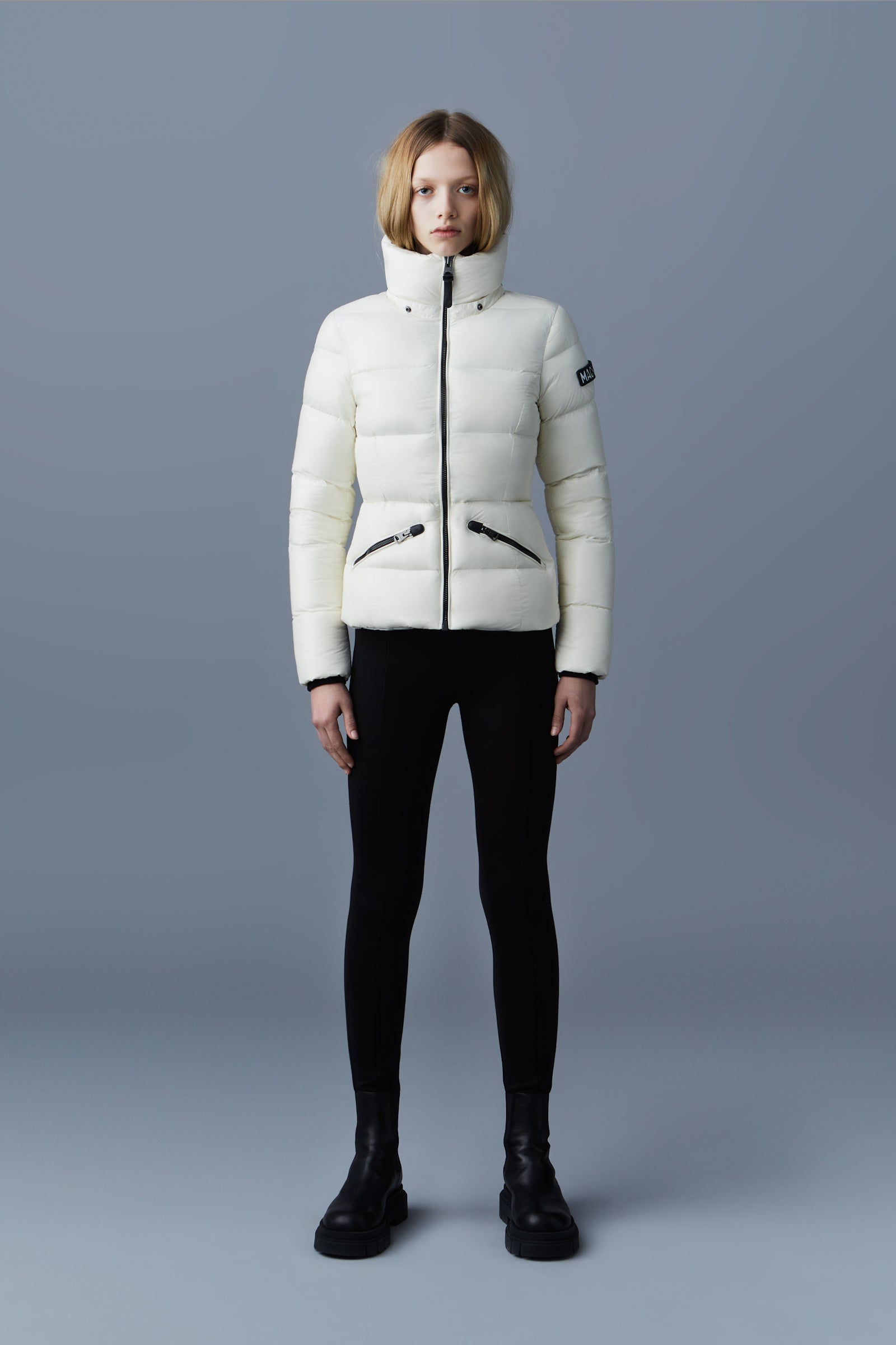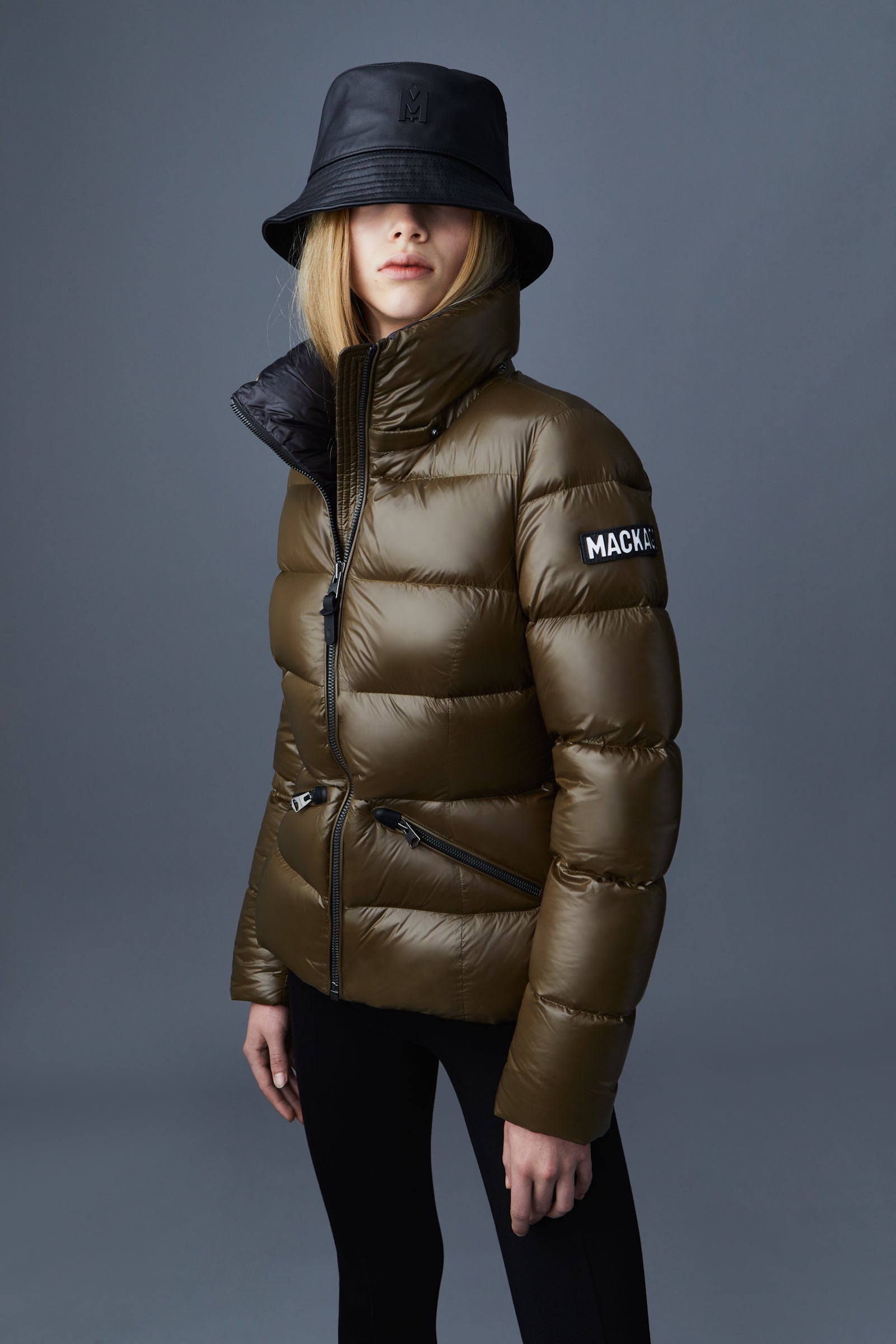 MADALYN is a recycled nano down jacket for women with a removable storm visor hood. Lightweight and tailored to a classic fitted silhouette, the high-sheen channel quilt shell delivers perfect warmth through the seasons. Rib knit cuffs and insulated zip pockets lend comfort. 3D zip pull covers and our signature wordmark add defining detail.