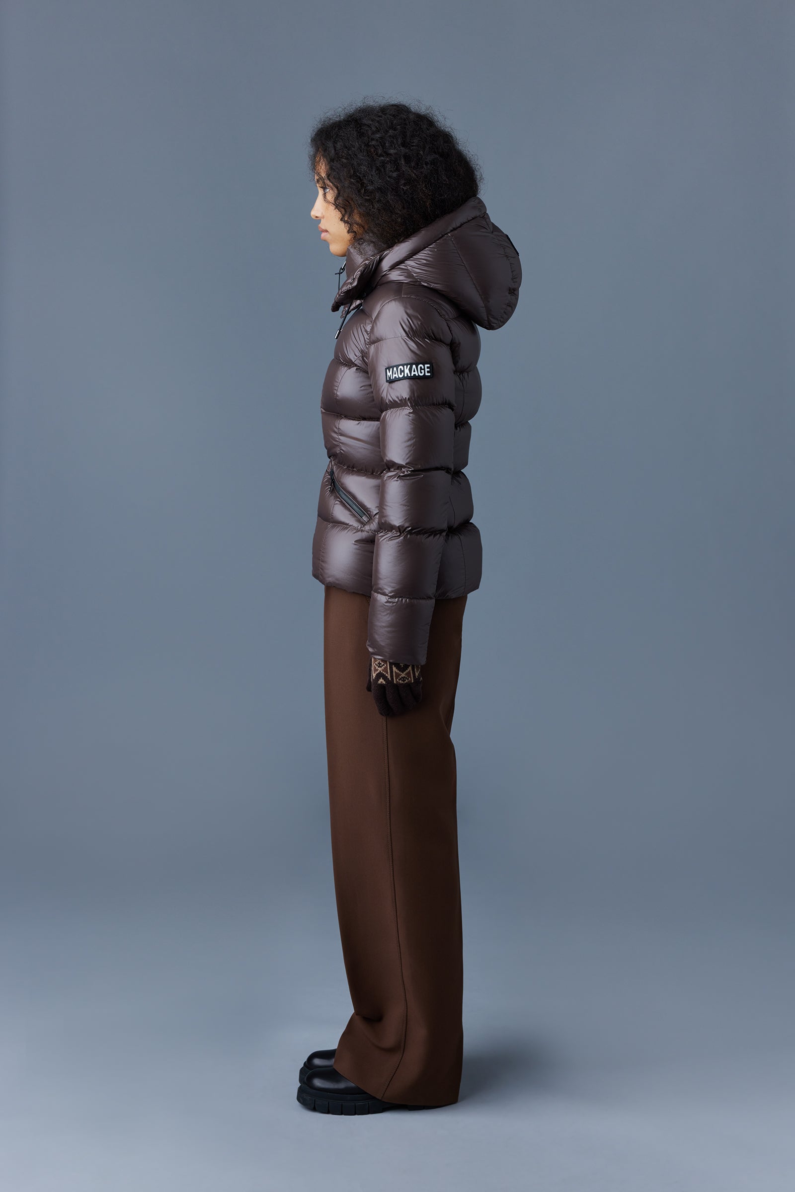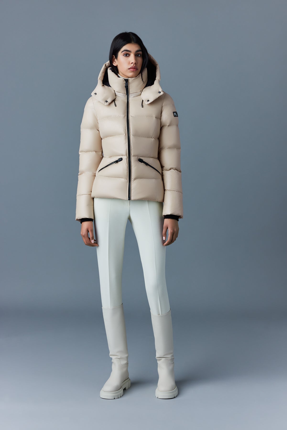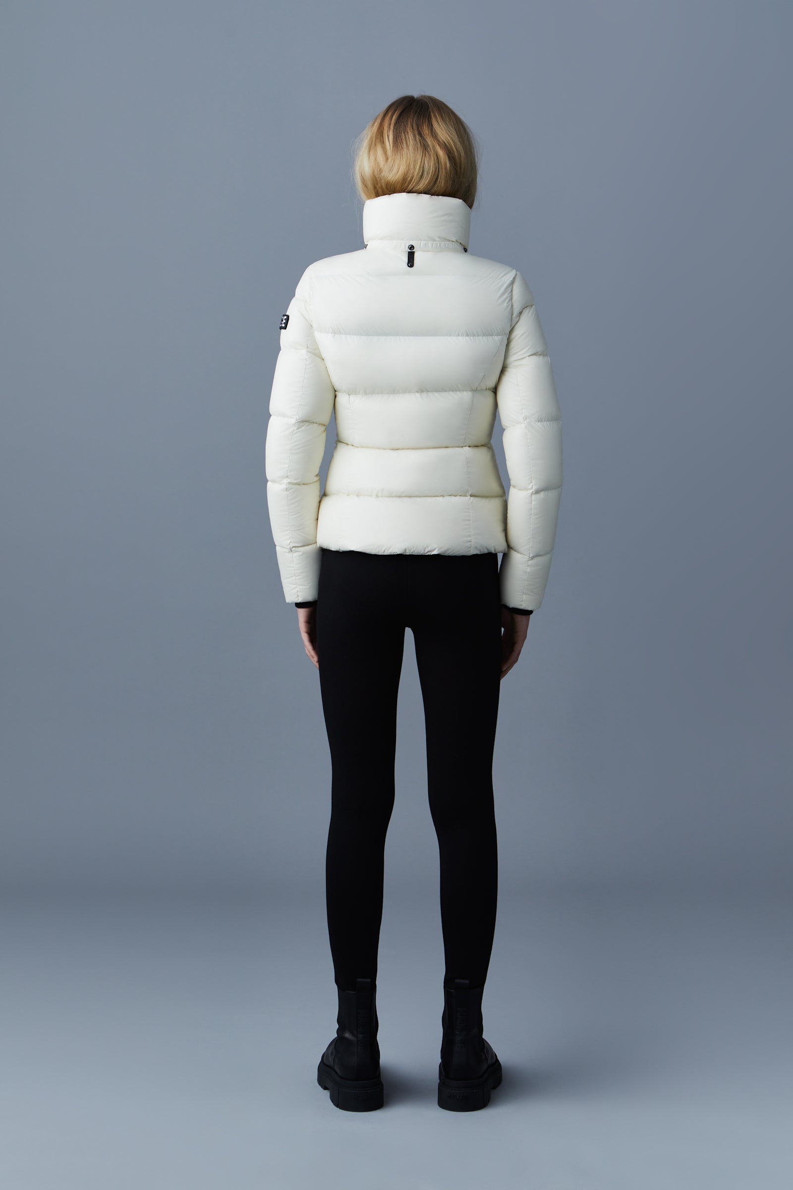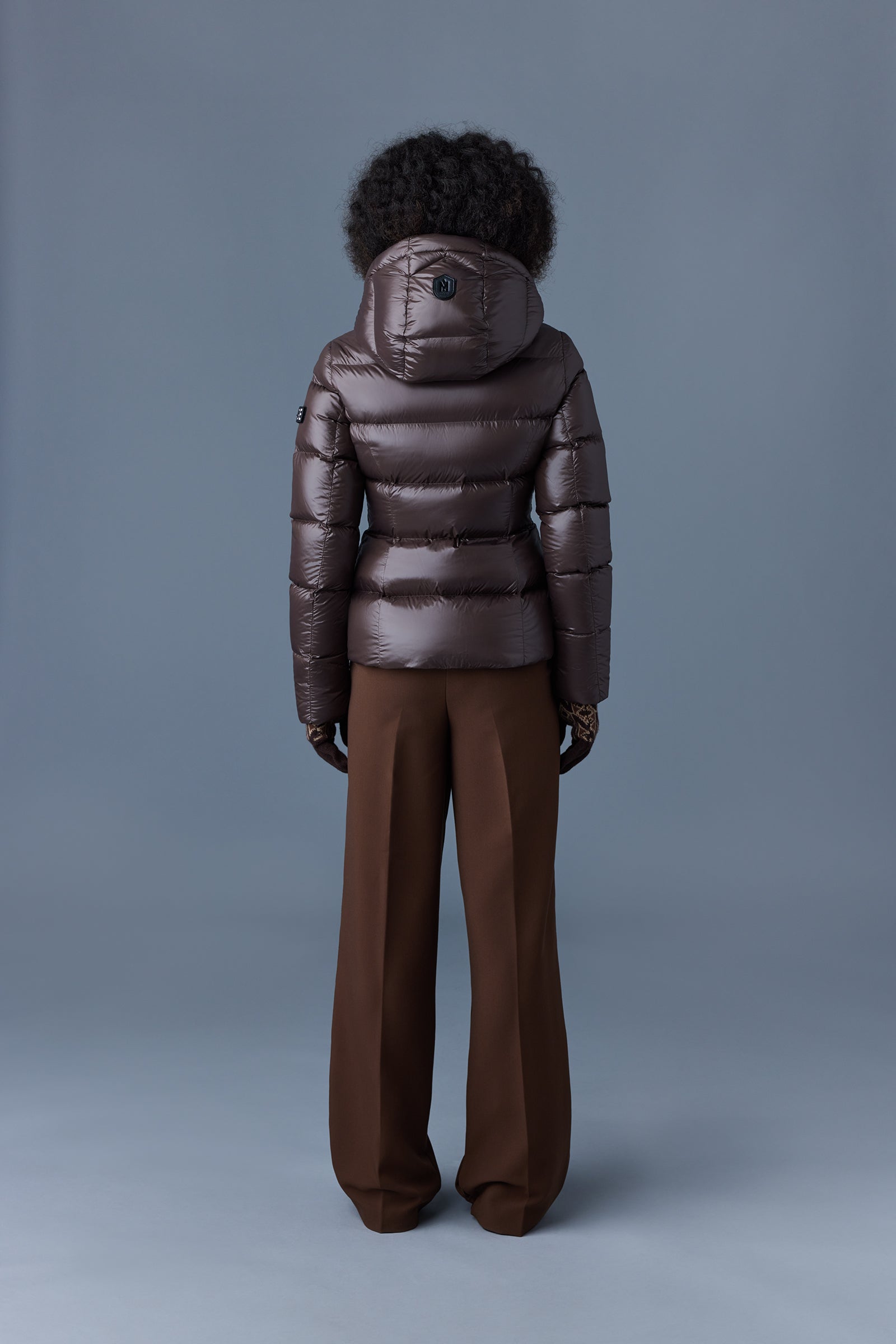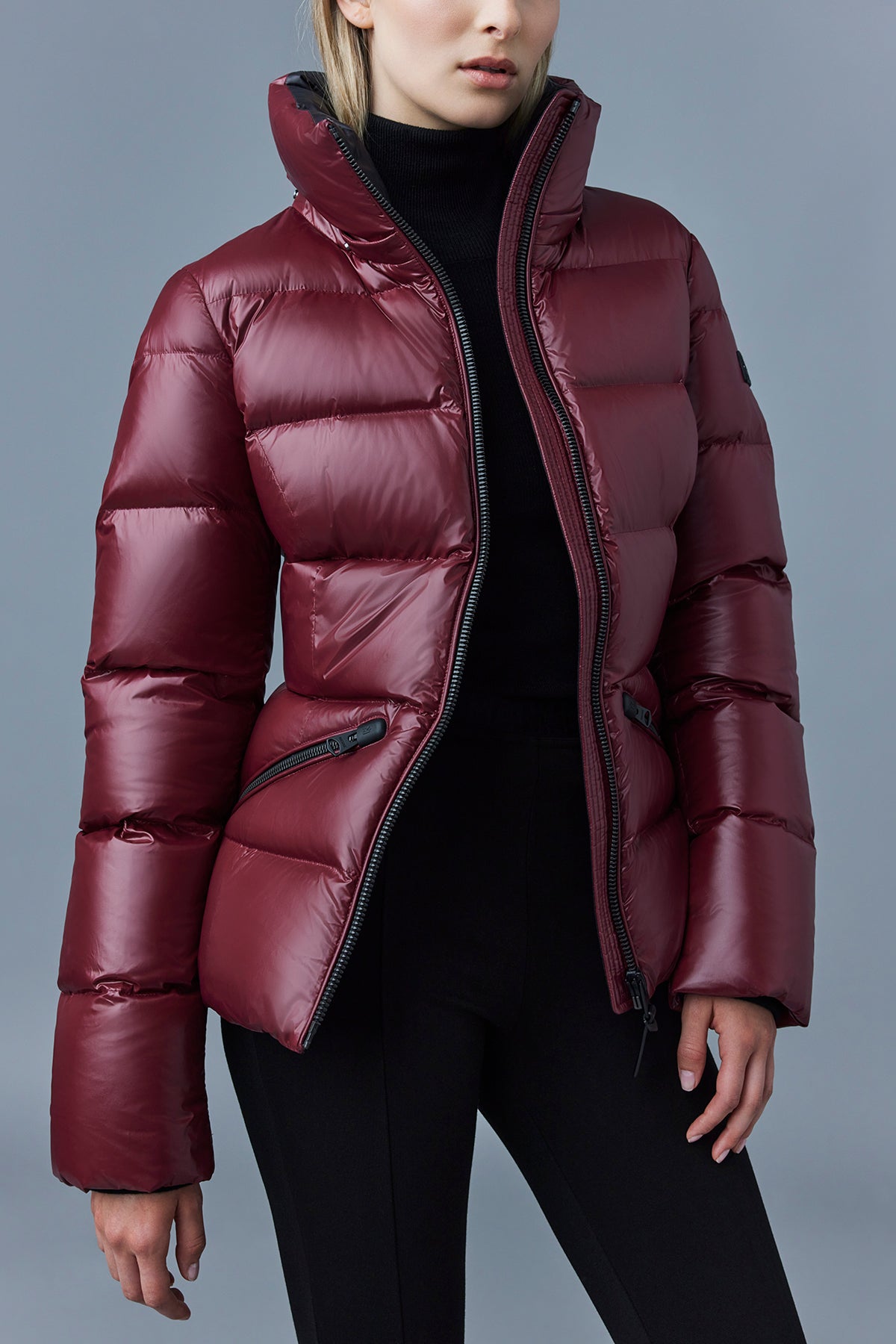MADALYN is a recycled nano down jacket for women with a removable storm visor hood. Lightweight and tailored to a classic fitted silhouette, the high-sheen channel quilt shell delivers perfect warmth through the seasons. Rib knit cuffs and insulated zip pockets lend comfort. 3D zip pull covers and our signature wordmark add defining detail.