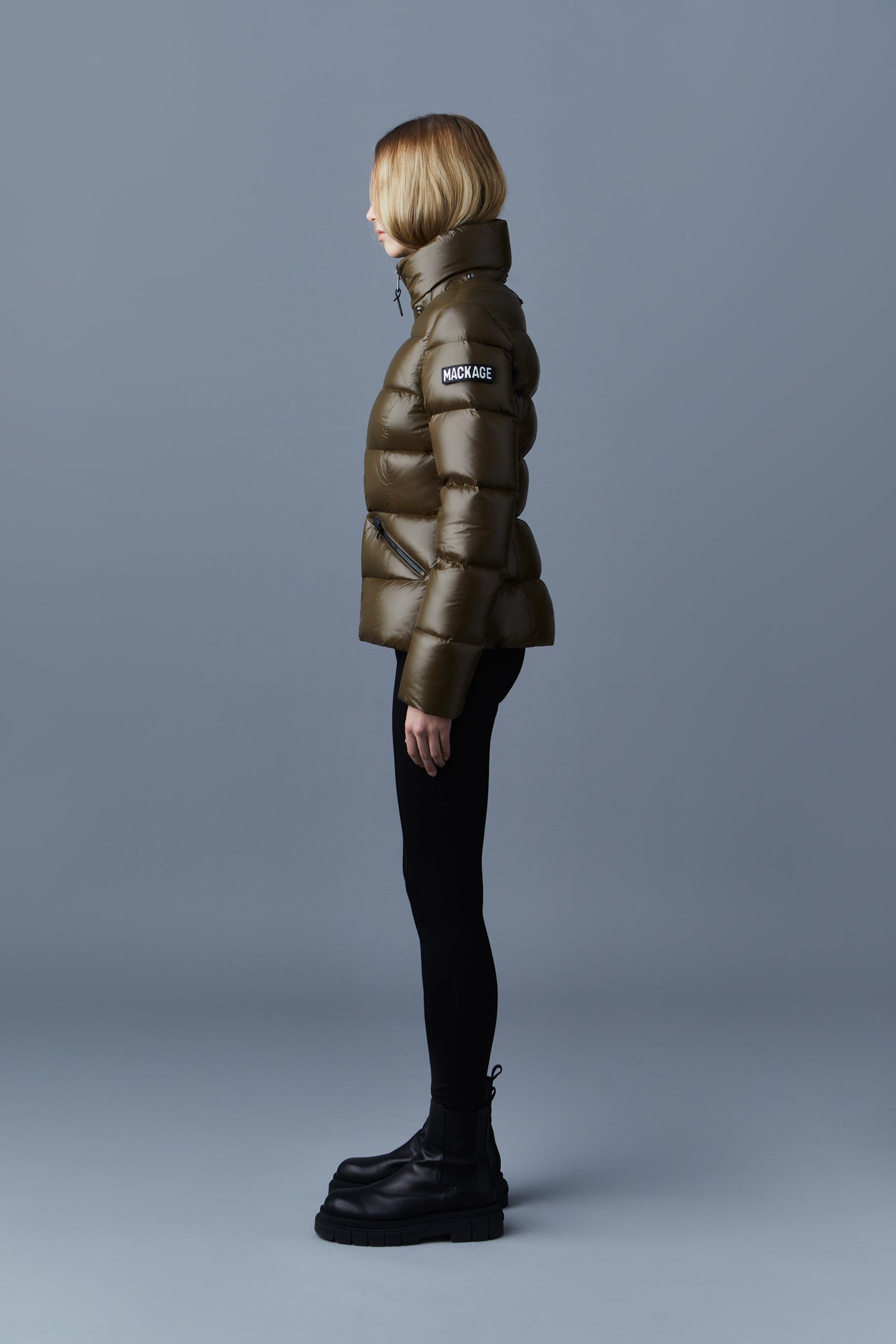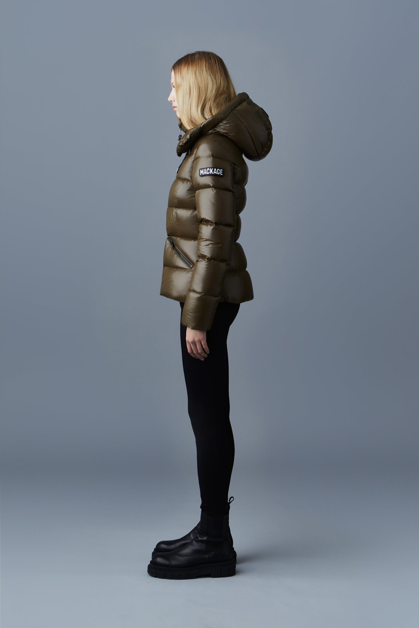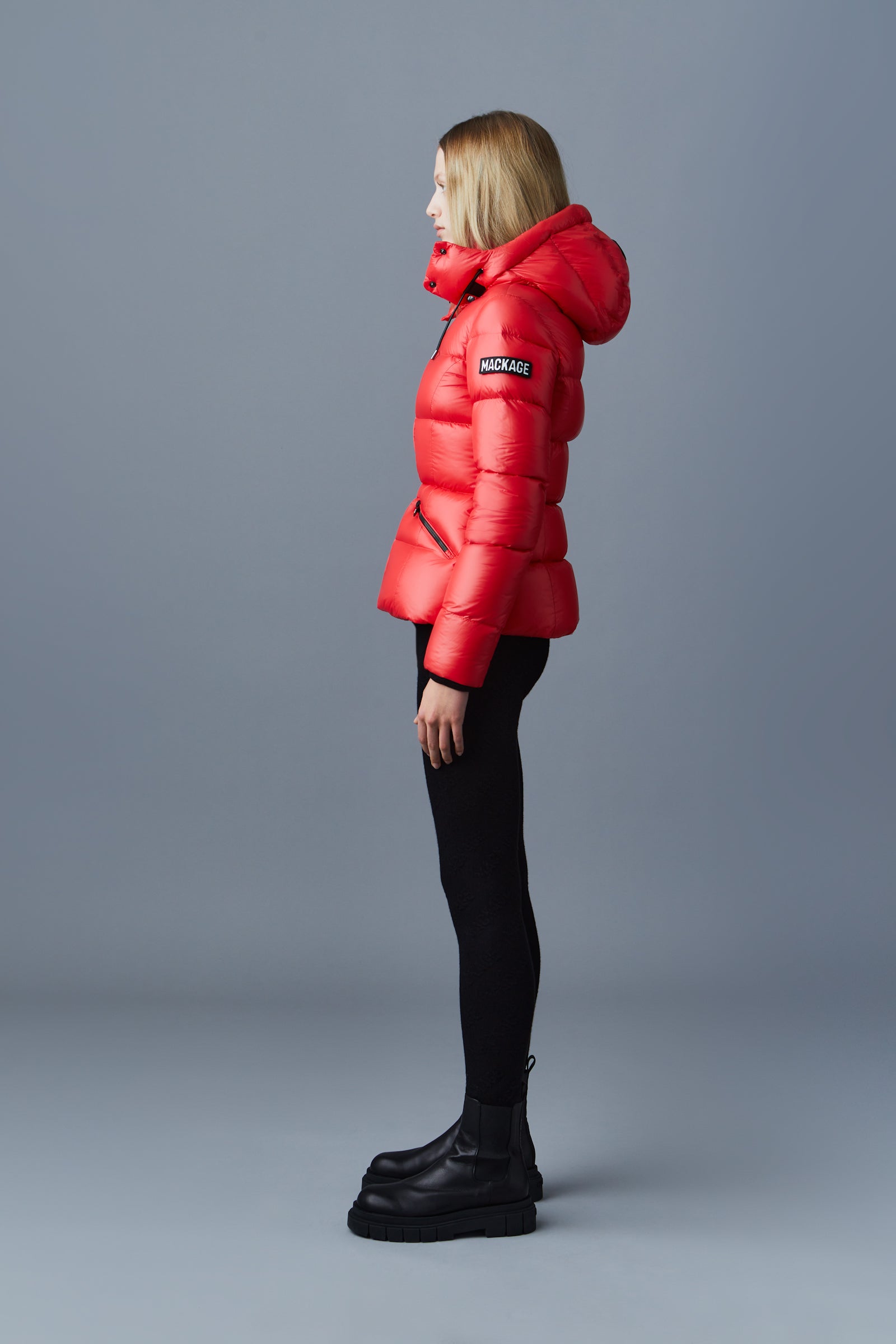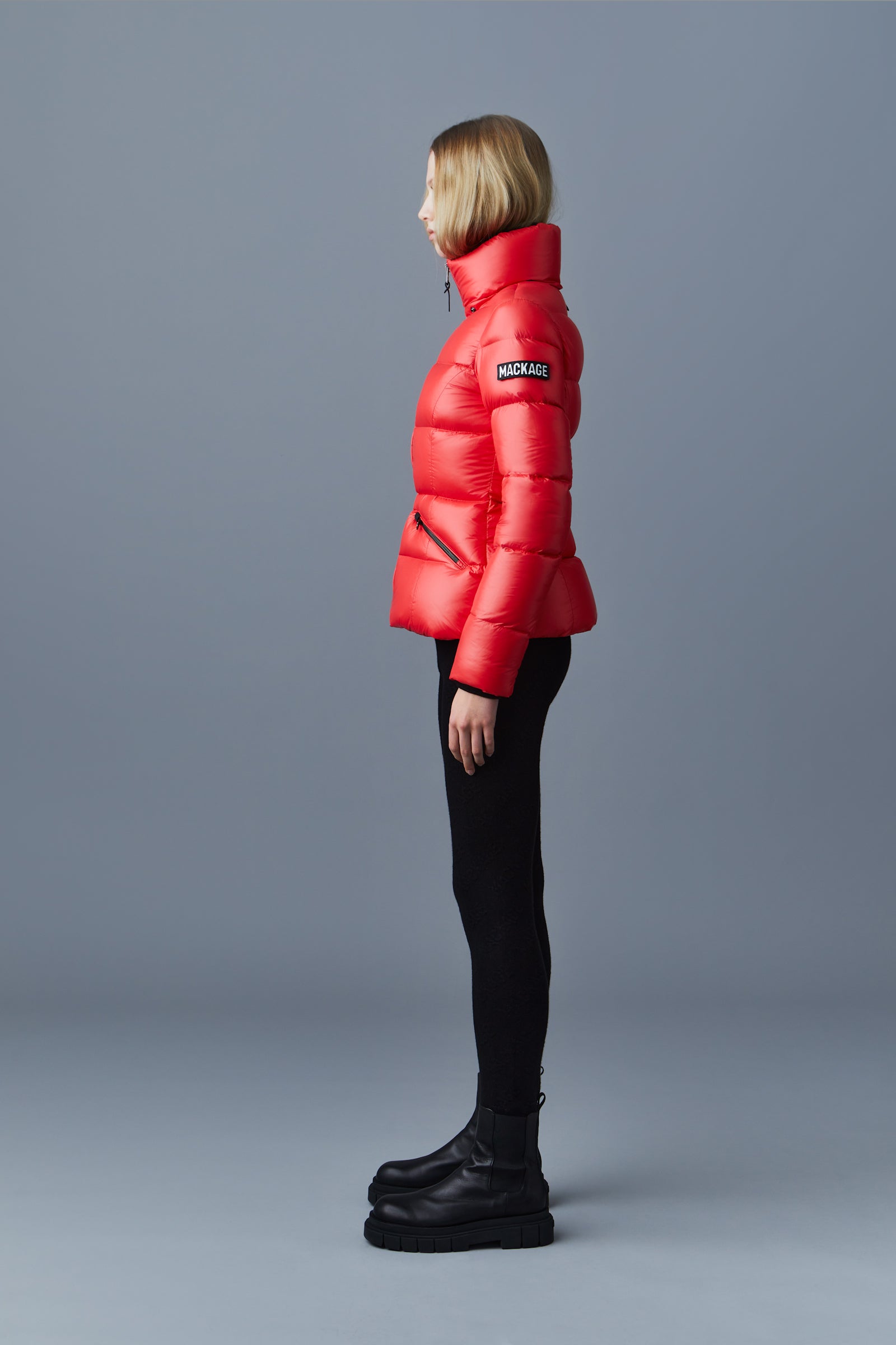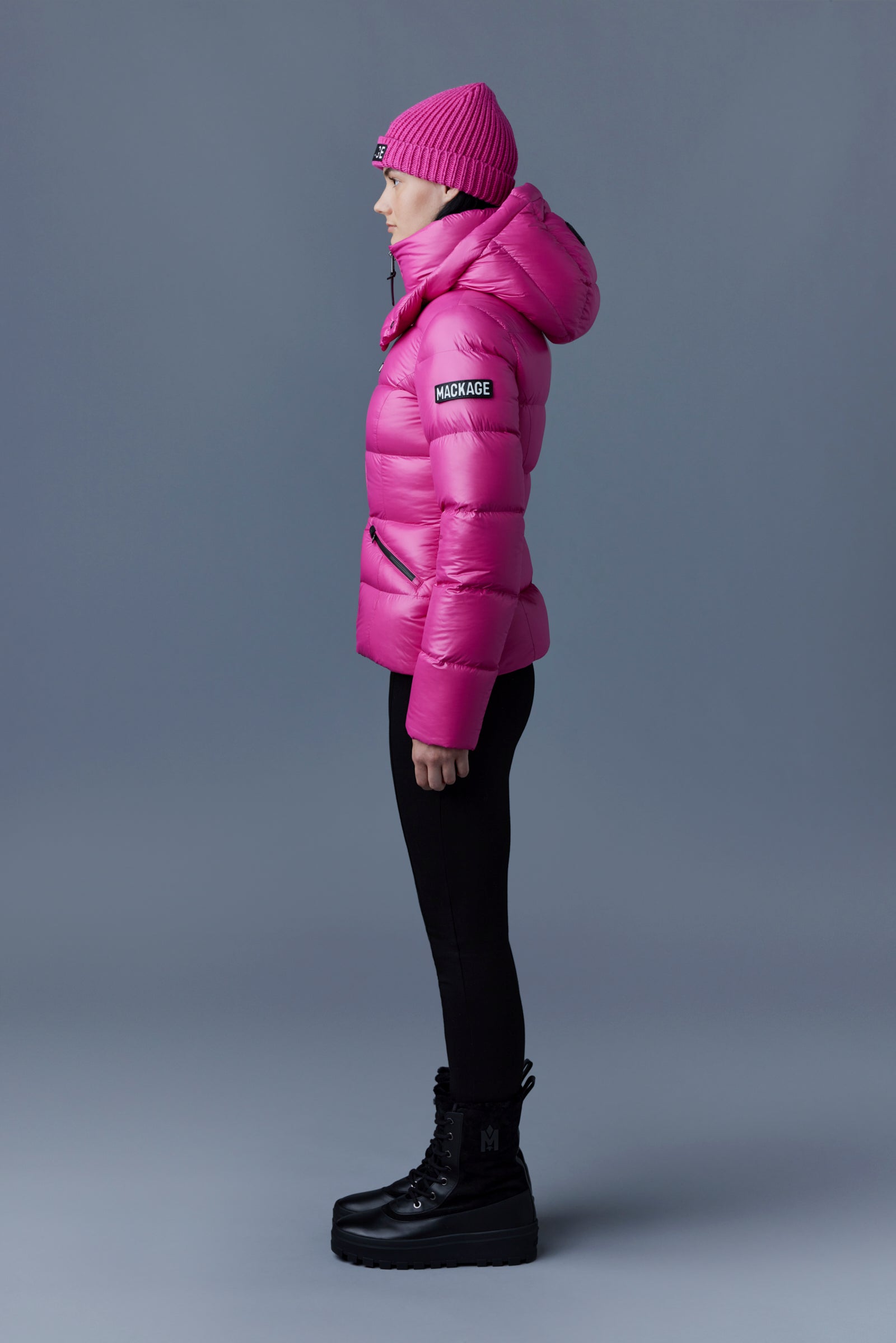 MADALYN is a recycled nano down jacket for women with a removable storm visor hood. Lightweight and tailored to a classic fitted silhouette, the high-sheen channel quilt shell delivers perfect warmth through the seasons. Rib knit cuffs and insulated zip pockets lend comfort. 3D zip pull covers and our signature wordmark add defining detail.