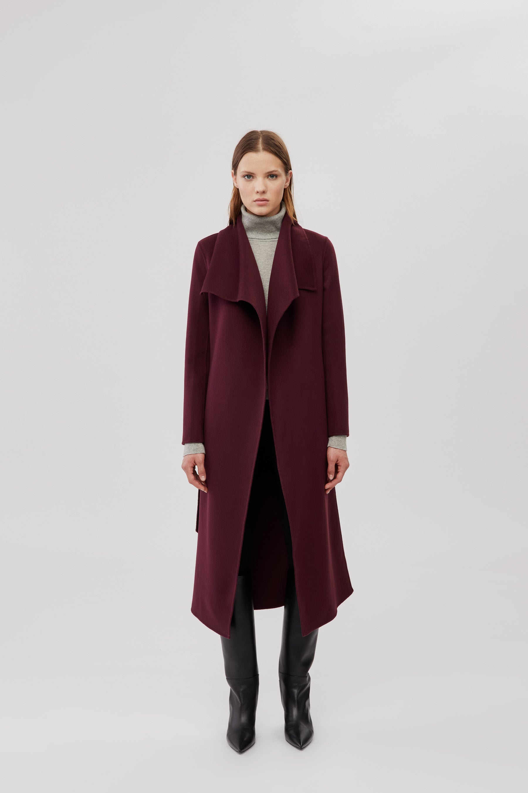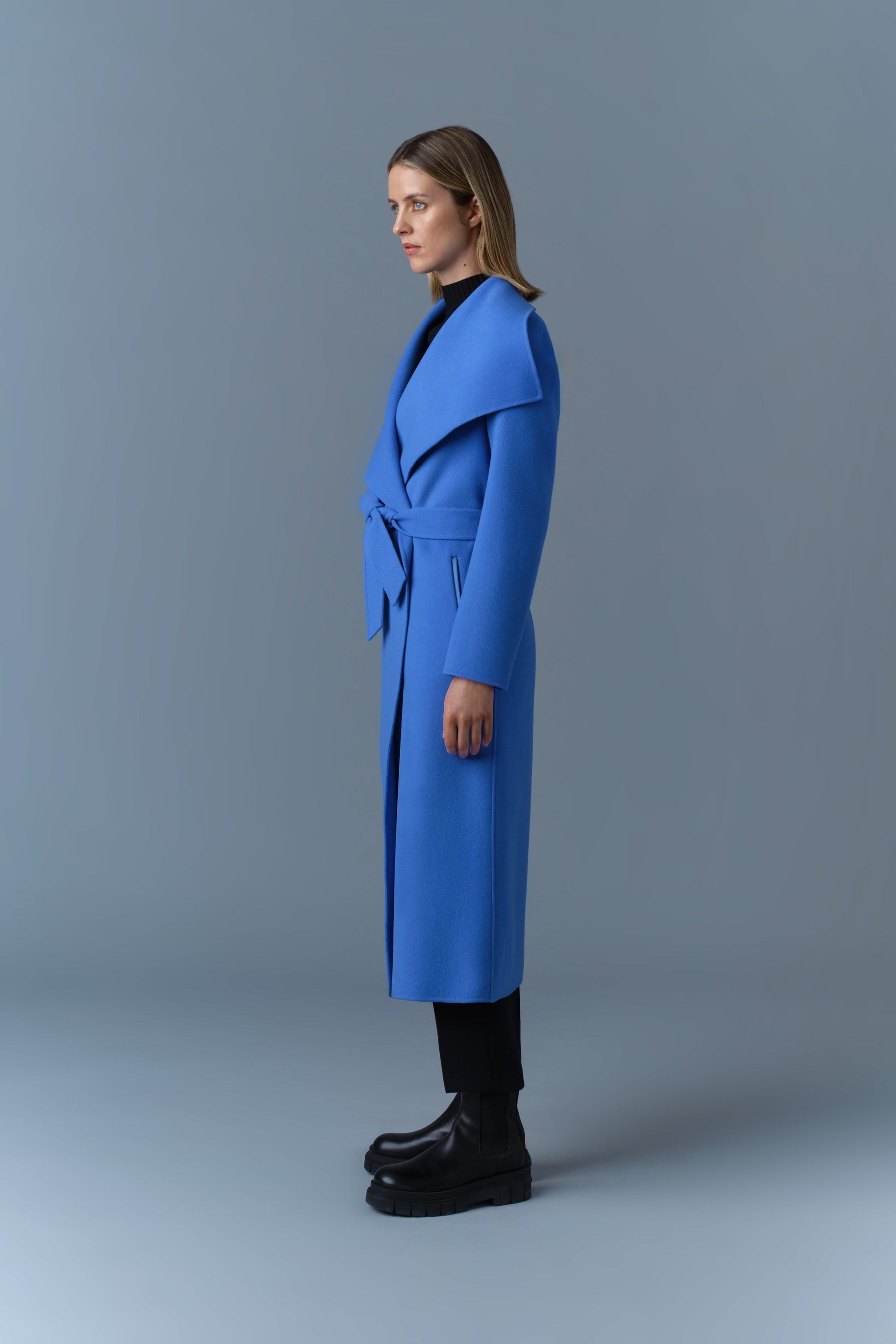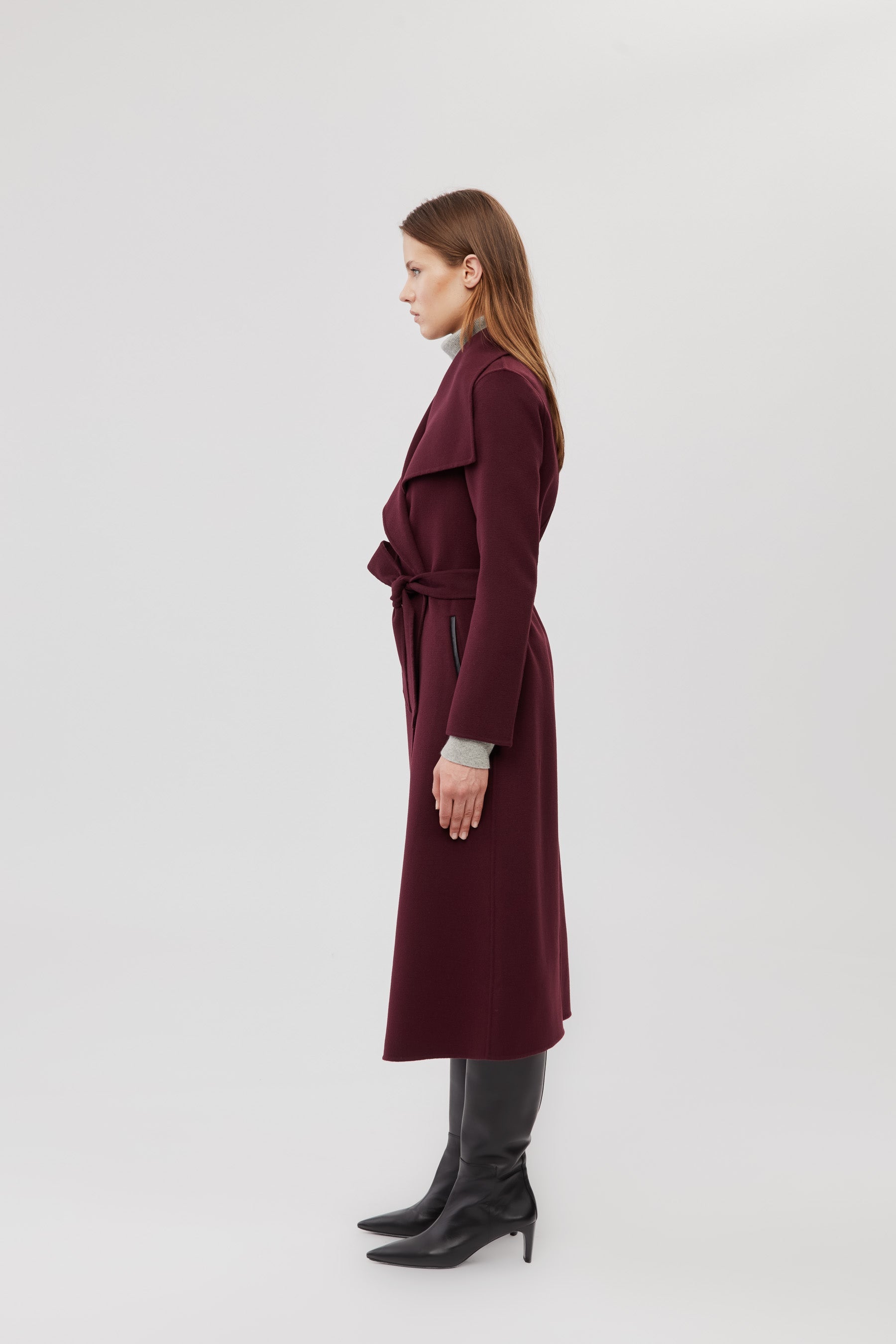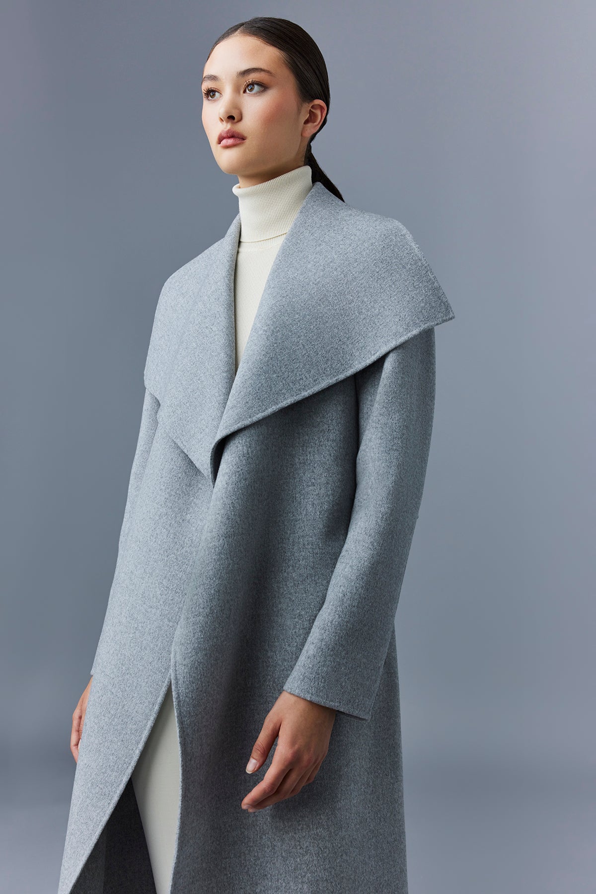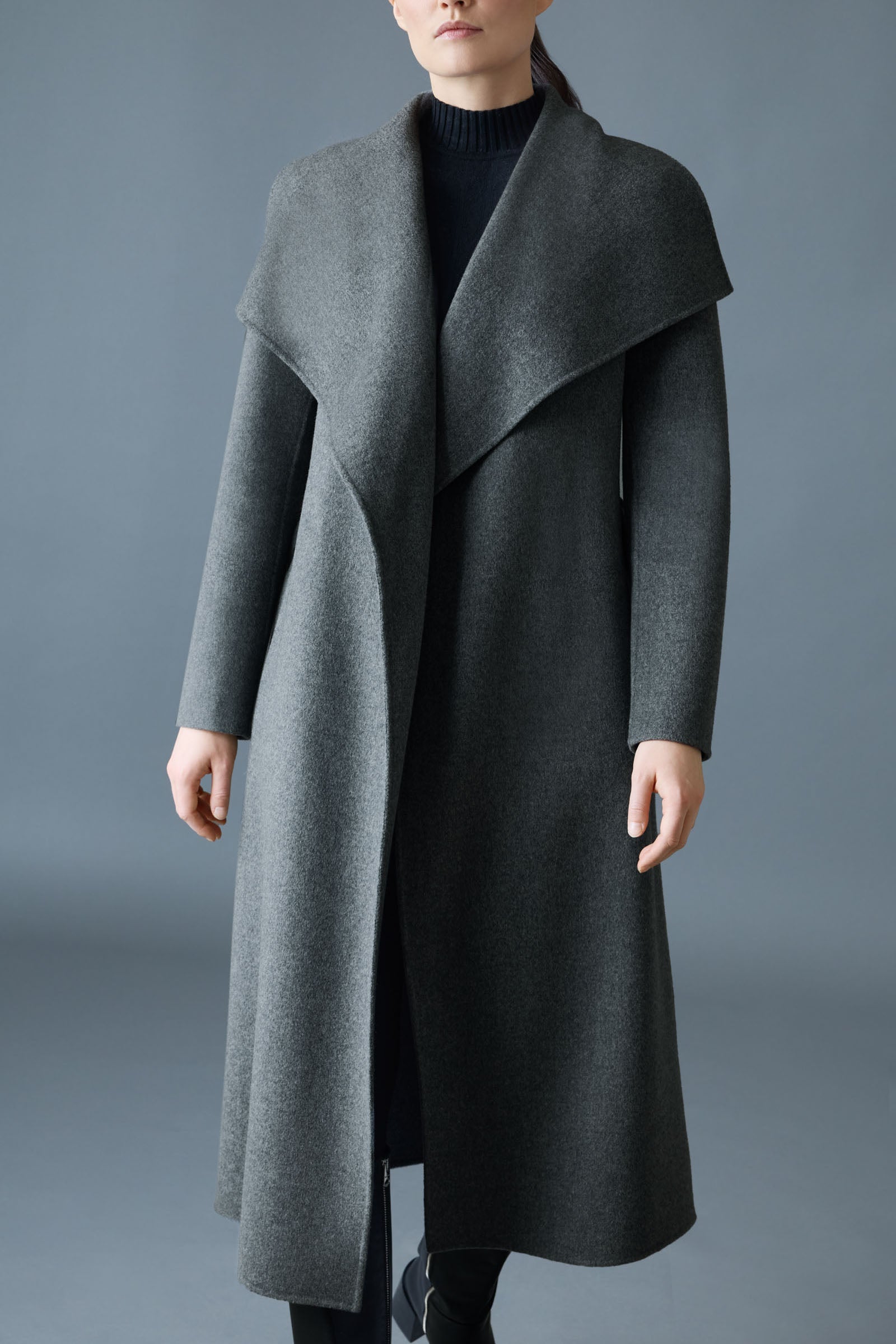 MAI-CN is a long wrap coat for women handmade from luxurious soft double-face wool. The fluid drape provides a relaxed-fit and unlined layer for maximum comfort in mild climates. The waterfall collar adds a sophisticated appeal while leather welting highlights the waist pockets and belt loops.