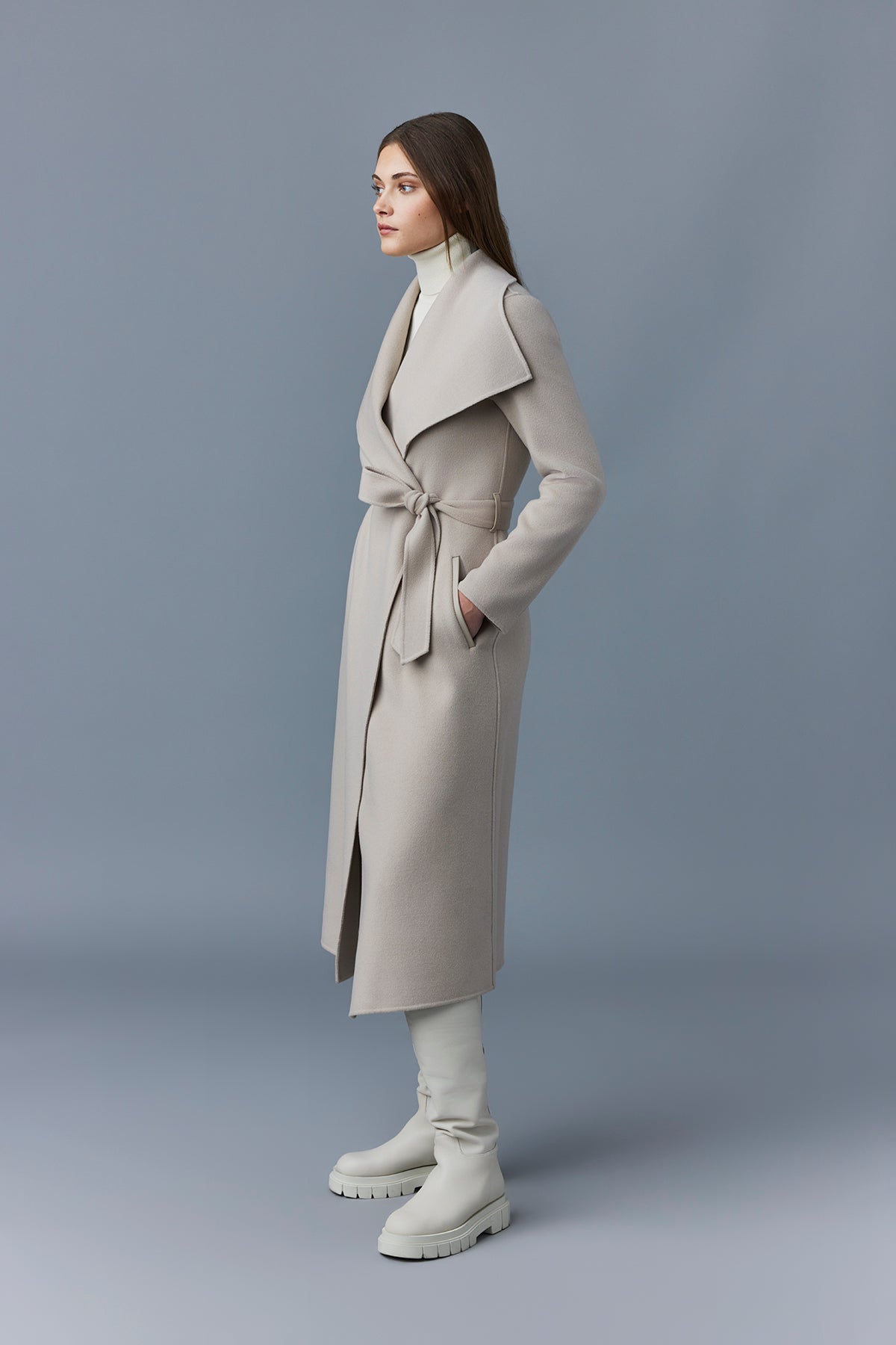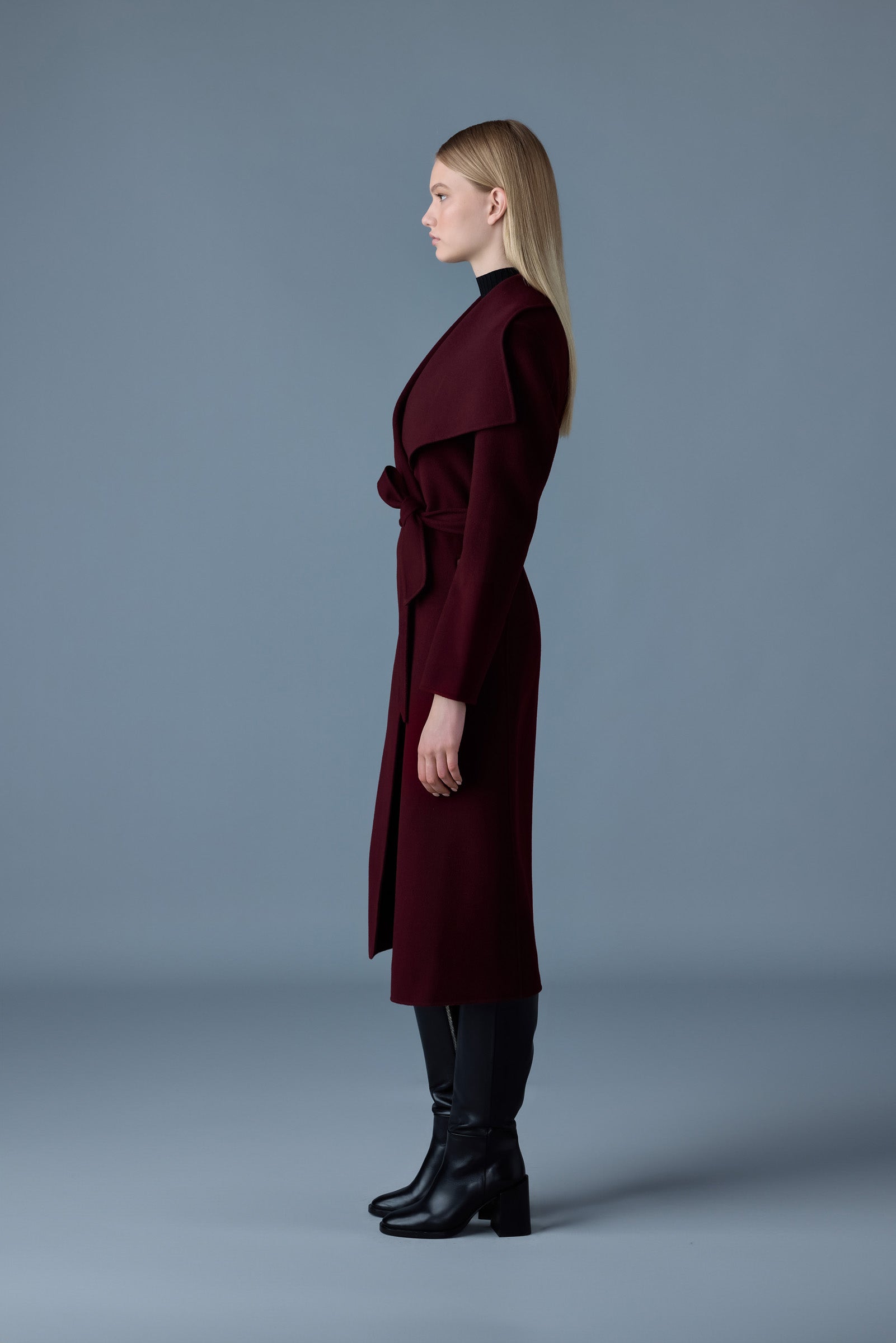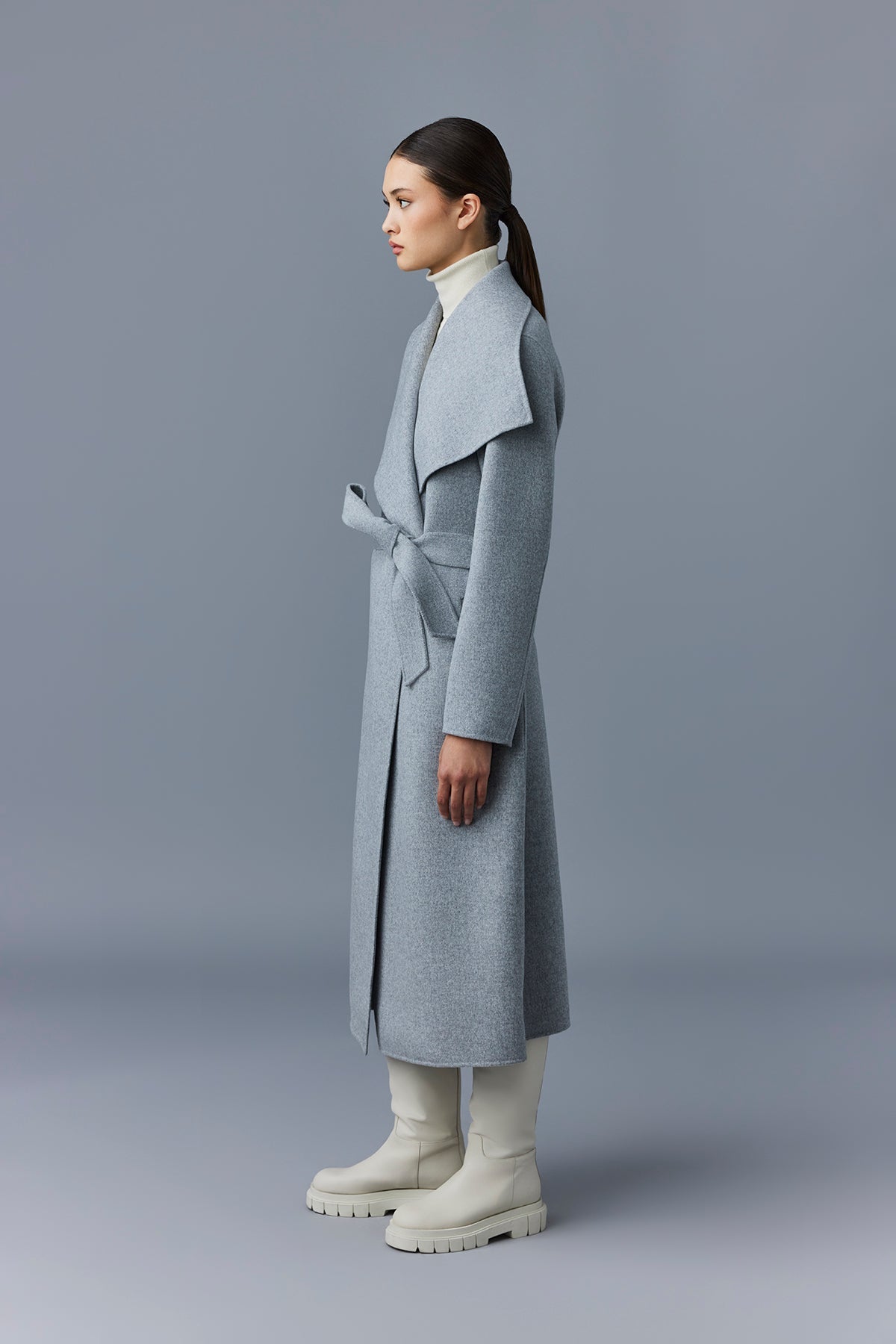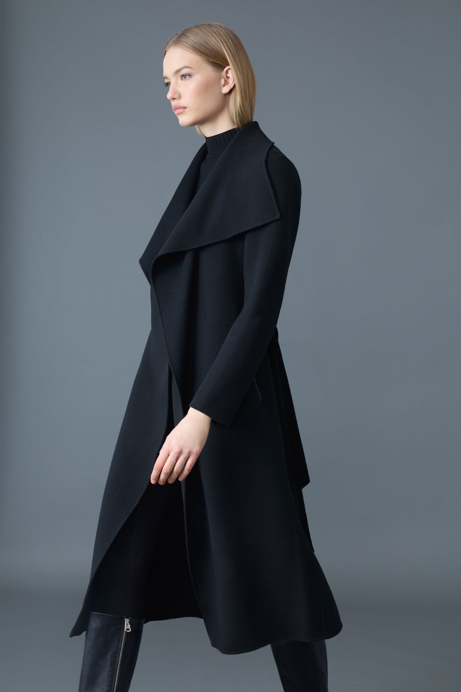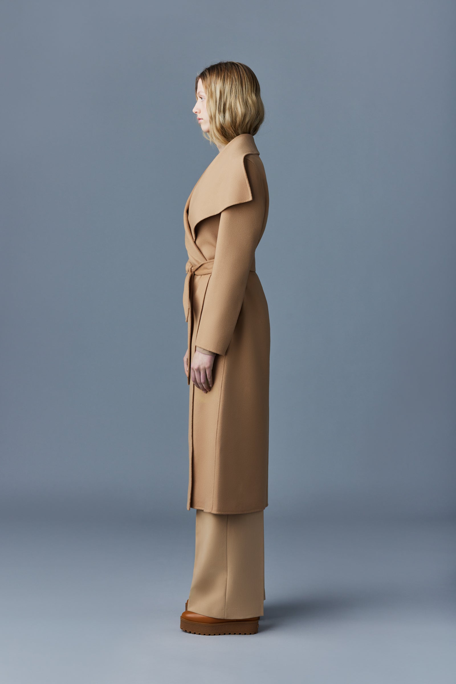 MAI-CN is a long wrap coat for women handmade from luxurious soft double-face wool. The fluid drape provides a relaxed-fit and unlined layer for maximum comfort in mild climates. The waterfall collar adds a sophisticated appeal while leather welting highlights the waist pockets and belt loops.