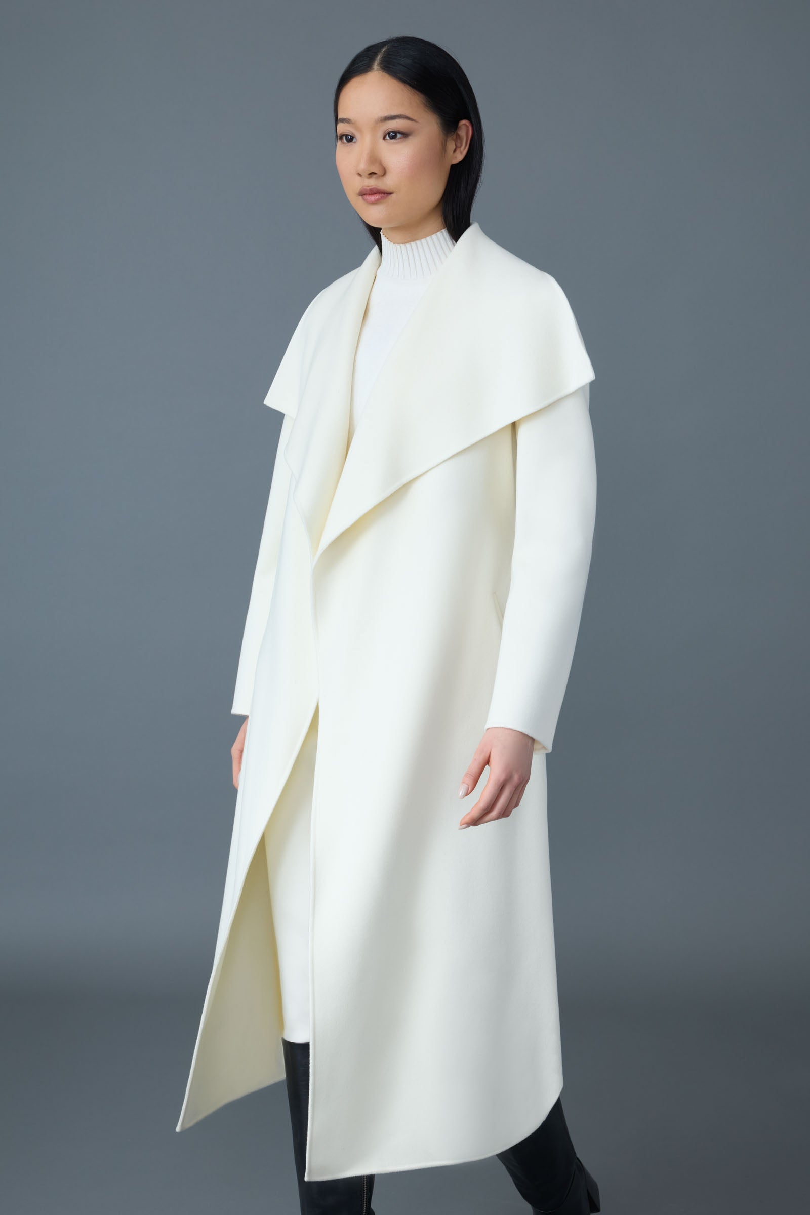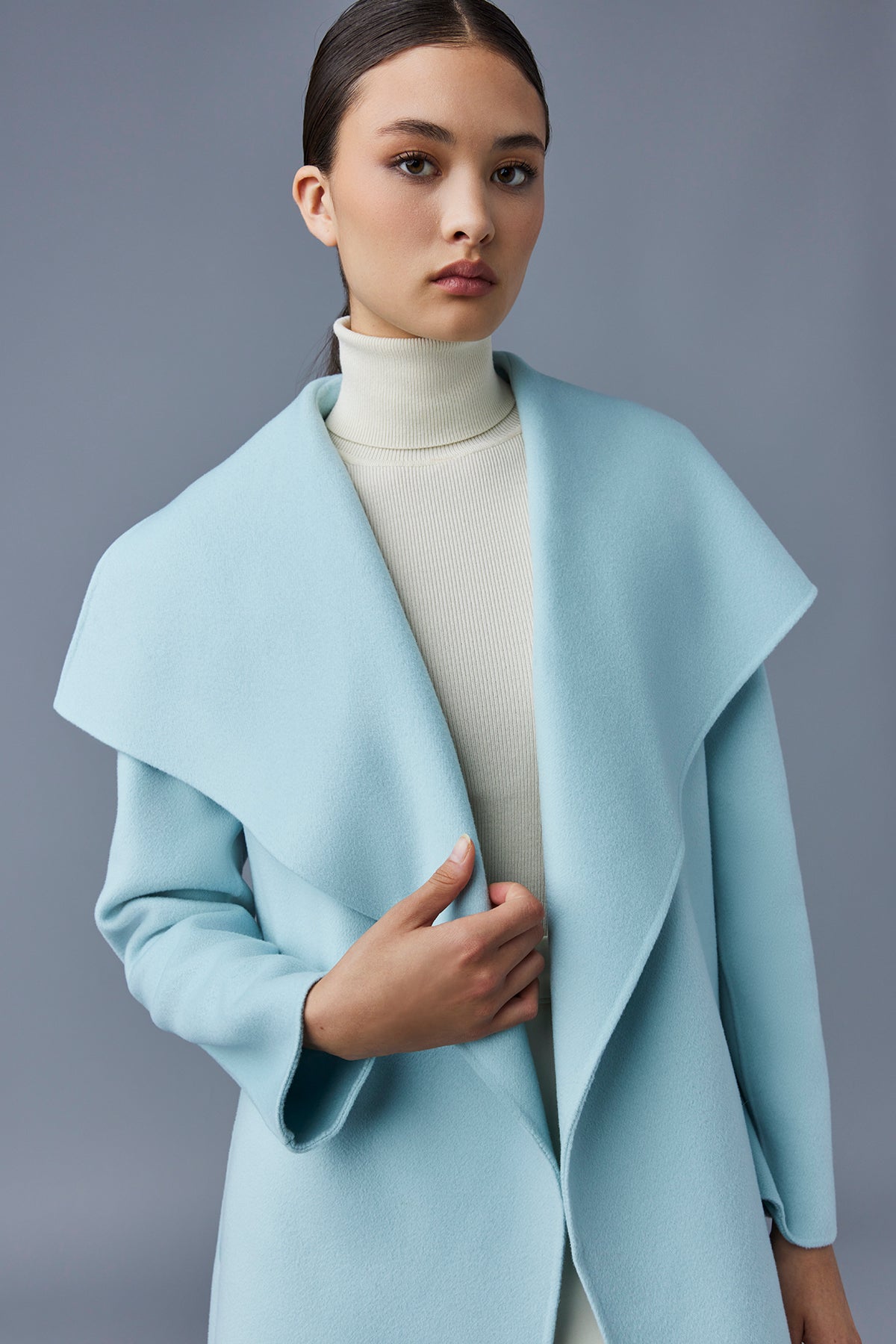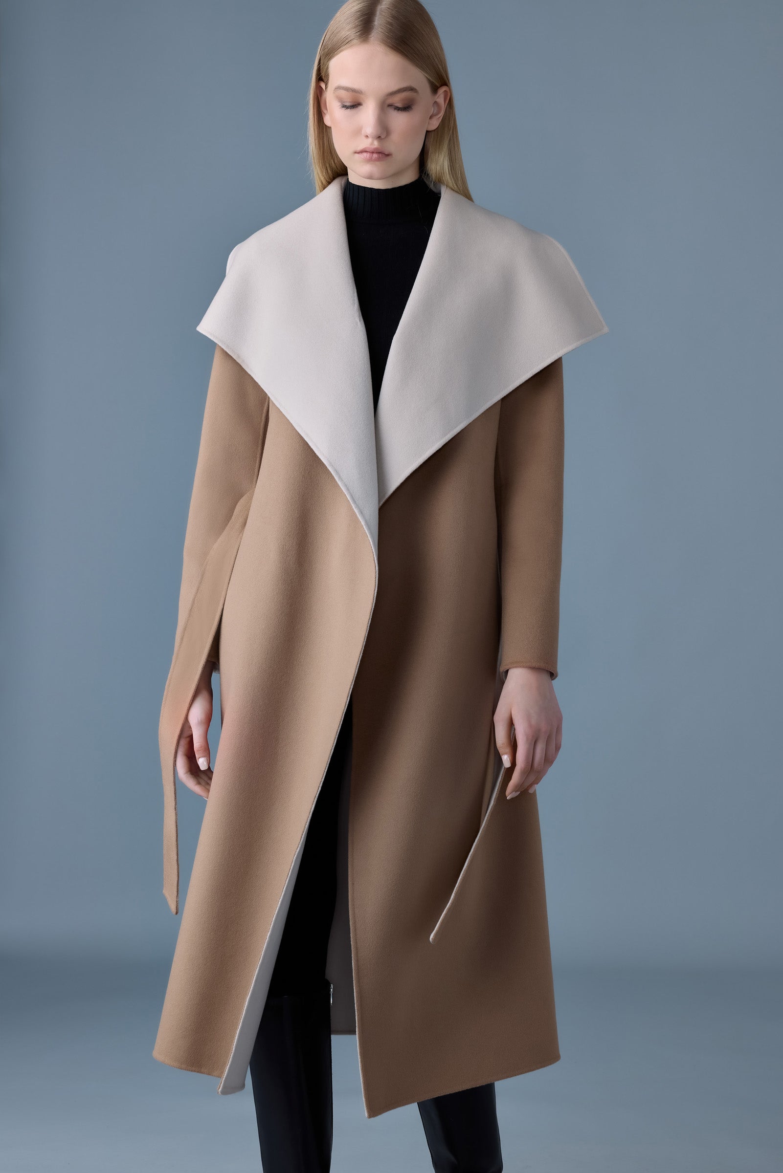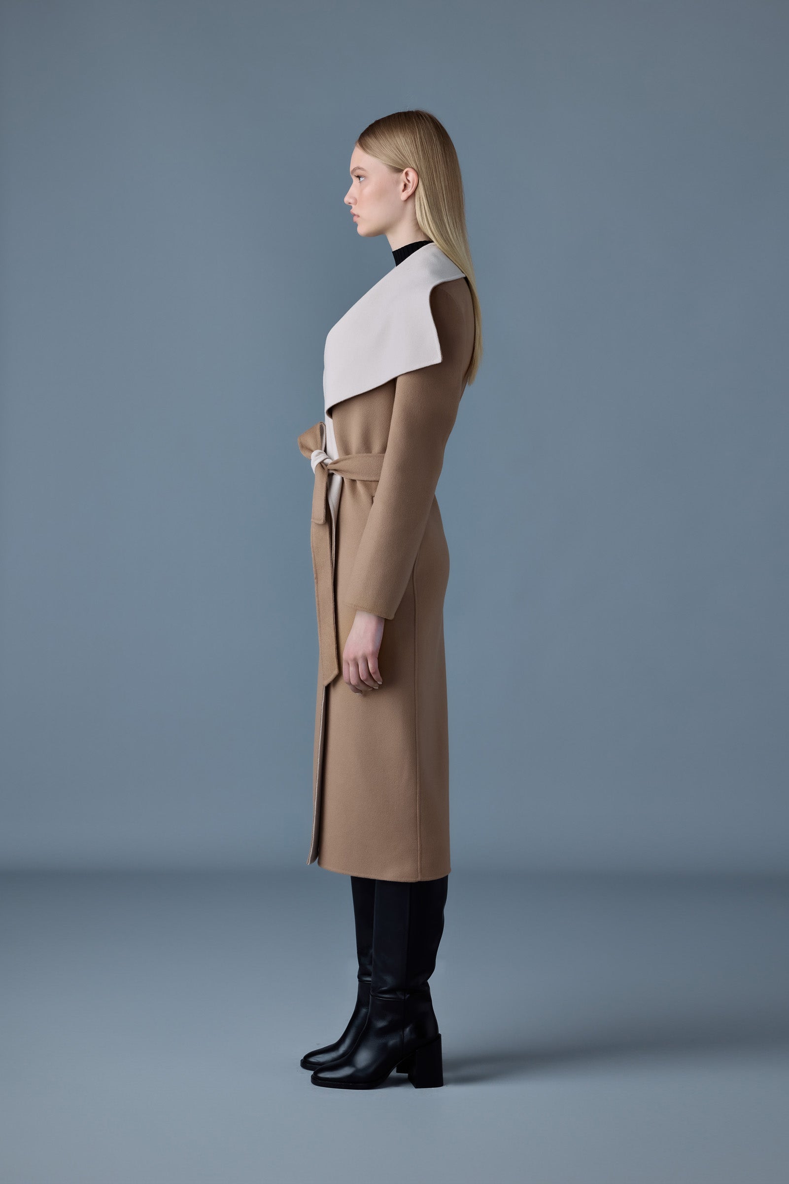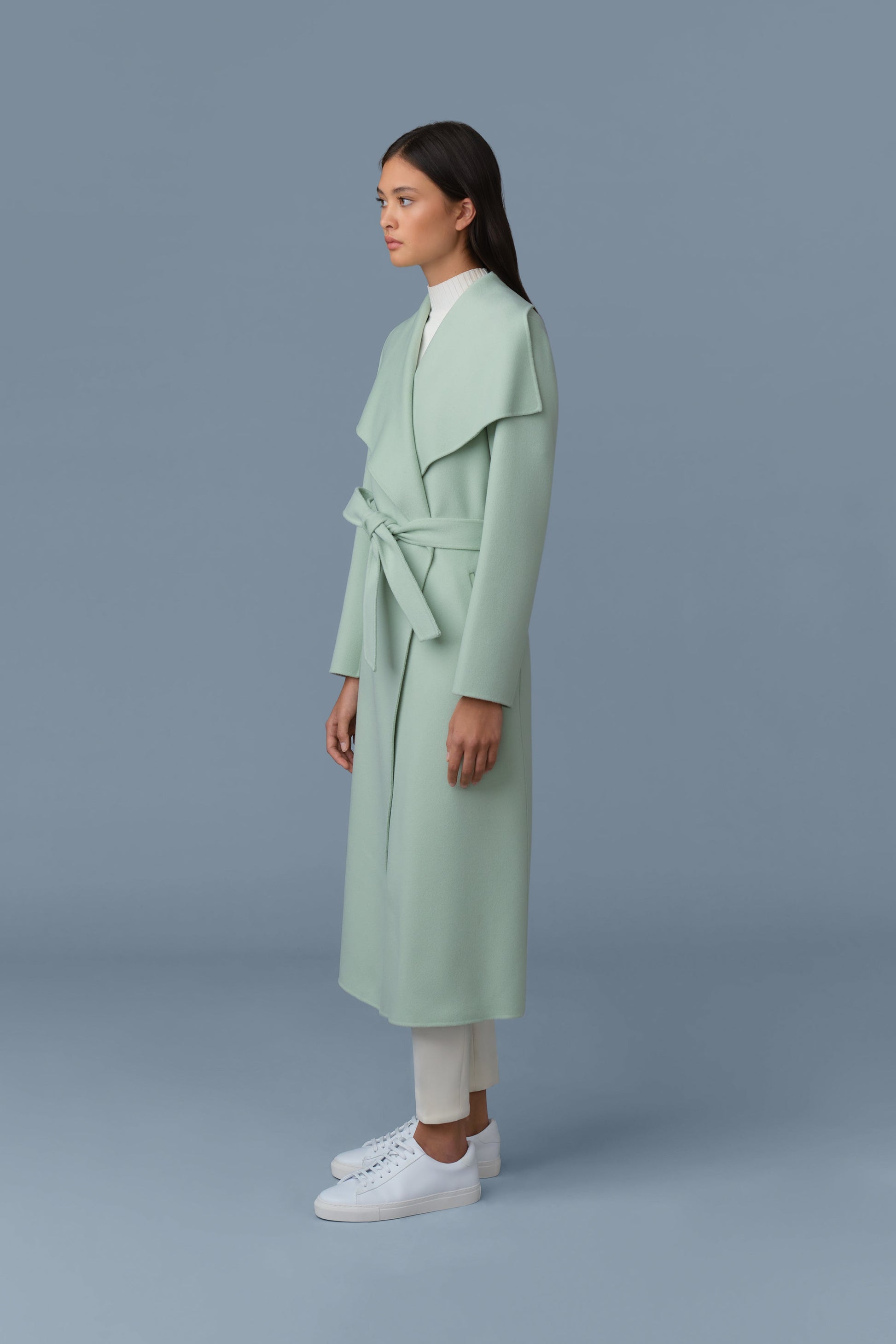 MAI-CN is a long wrap coat for women handmade from luxurious soft double-face wool. The fluid drape provides a relaxed-fit and unlined layer for maximum comfort in mild climates. The waterfall collar adds a sophisticated appeal while leather welting highlights the waist pockets and belt loops.