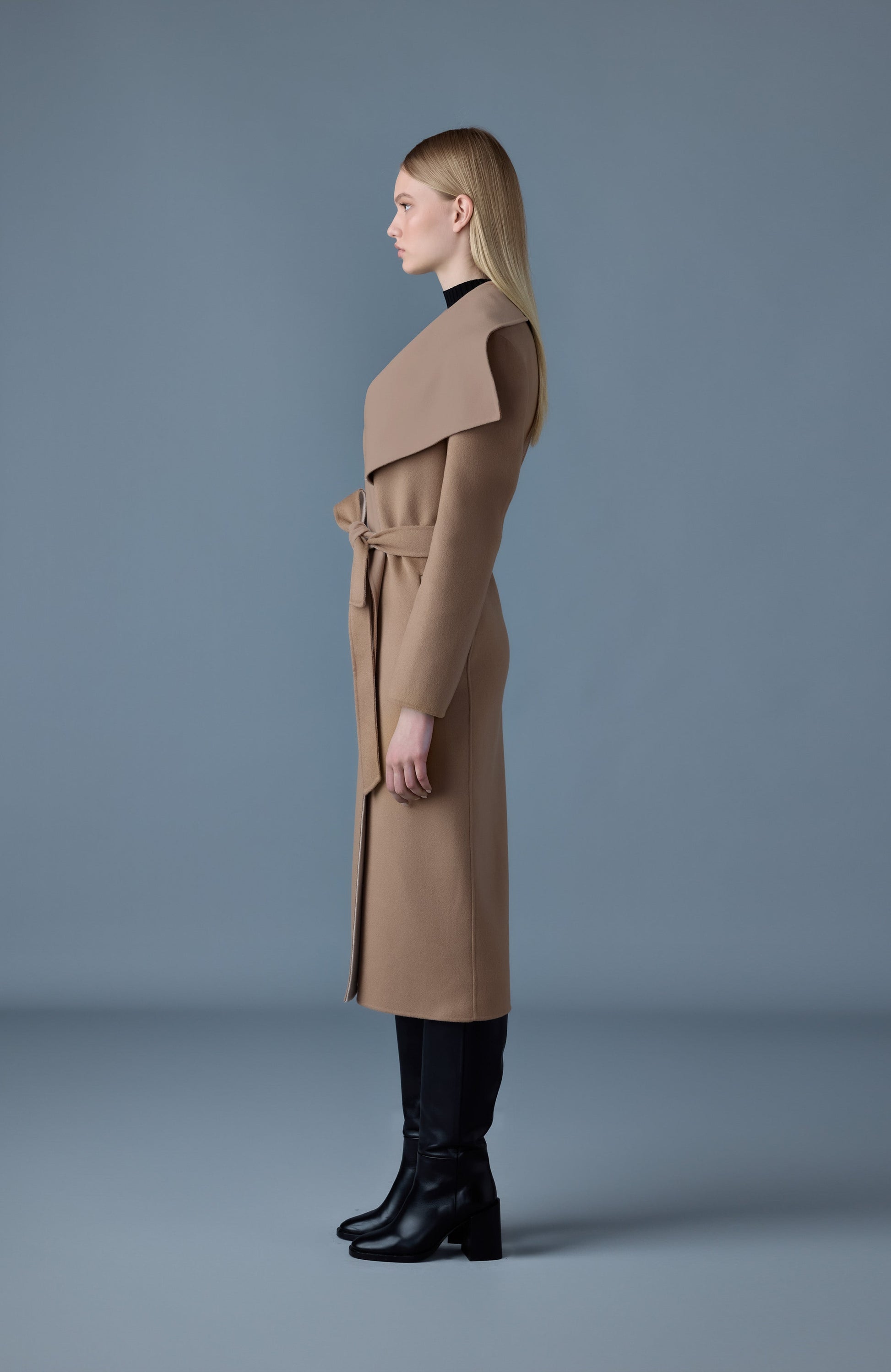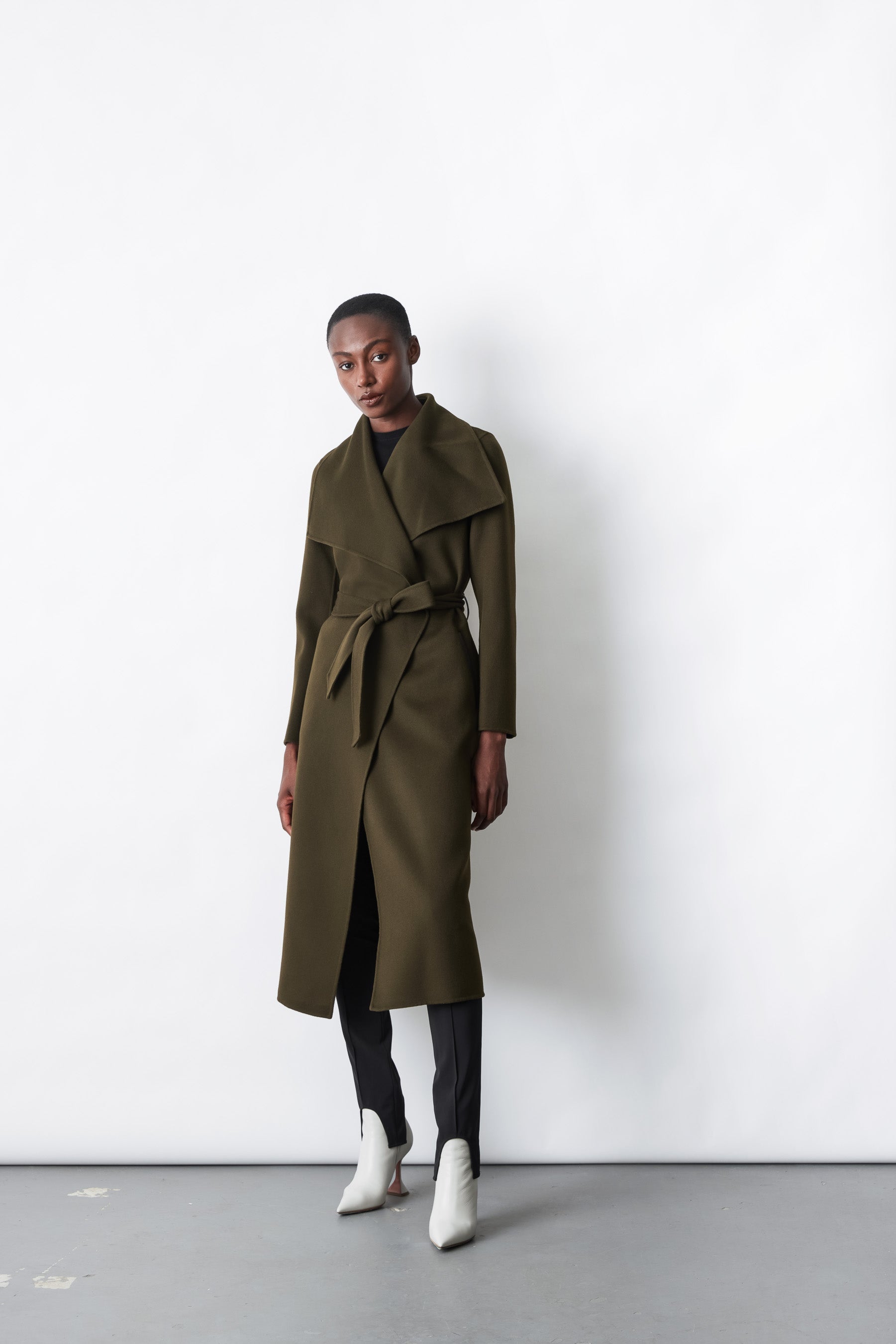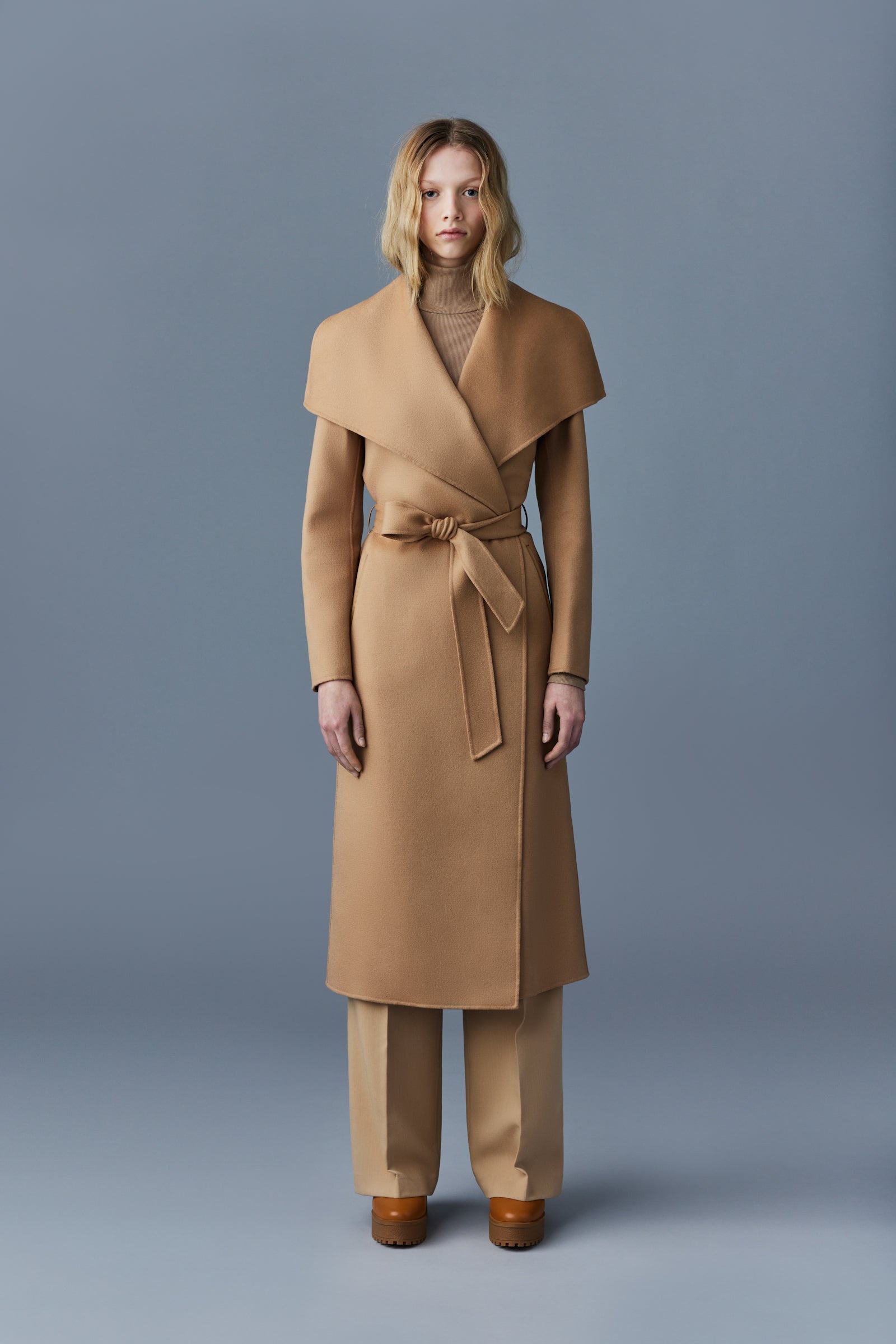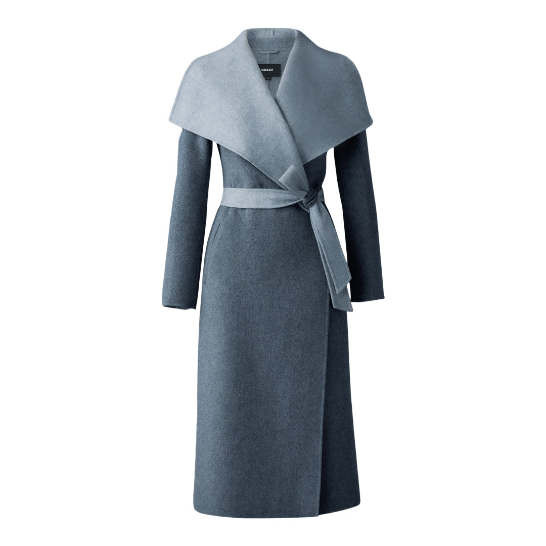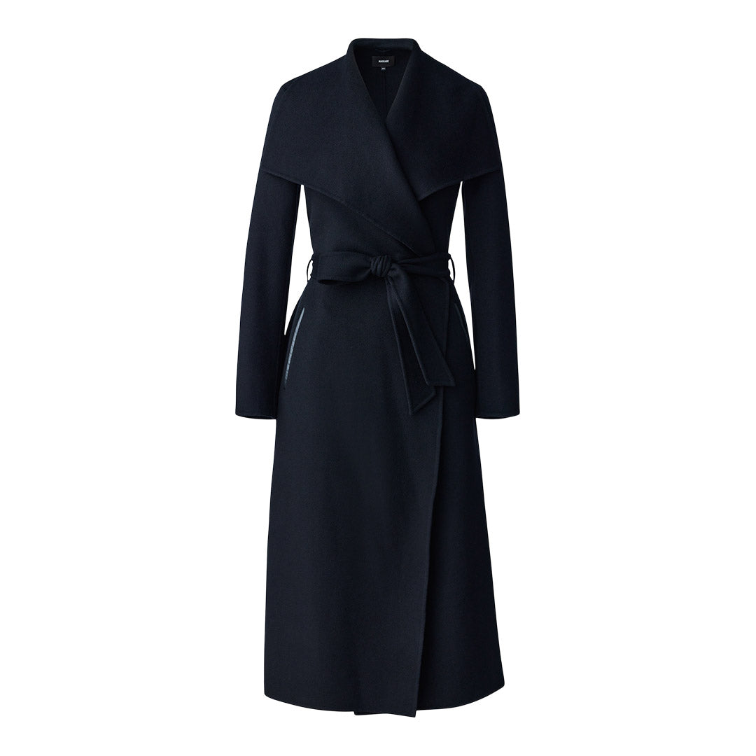 MAI-CN is a long wrap coat for women handmade from luxurious soft double-face wool. The fluid drape provides a relaxed-fit and unlined layer for maximum comfort in mild climates. The waterfall collar adds a sophisticated appeal while leather welting highlights the waist pockets and belt loops.