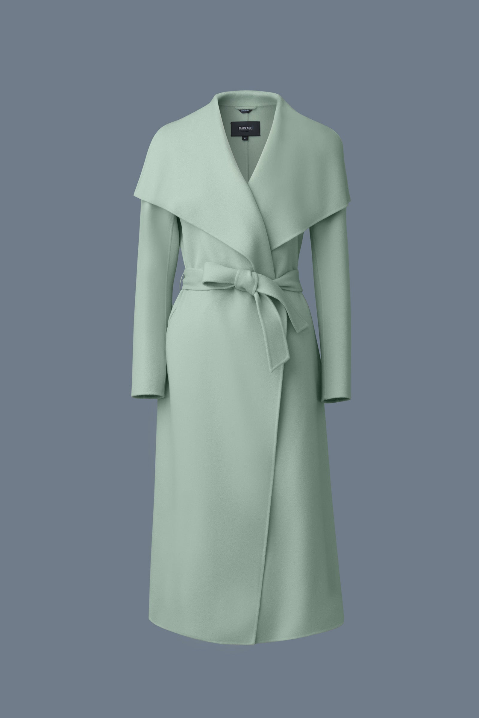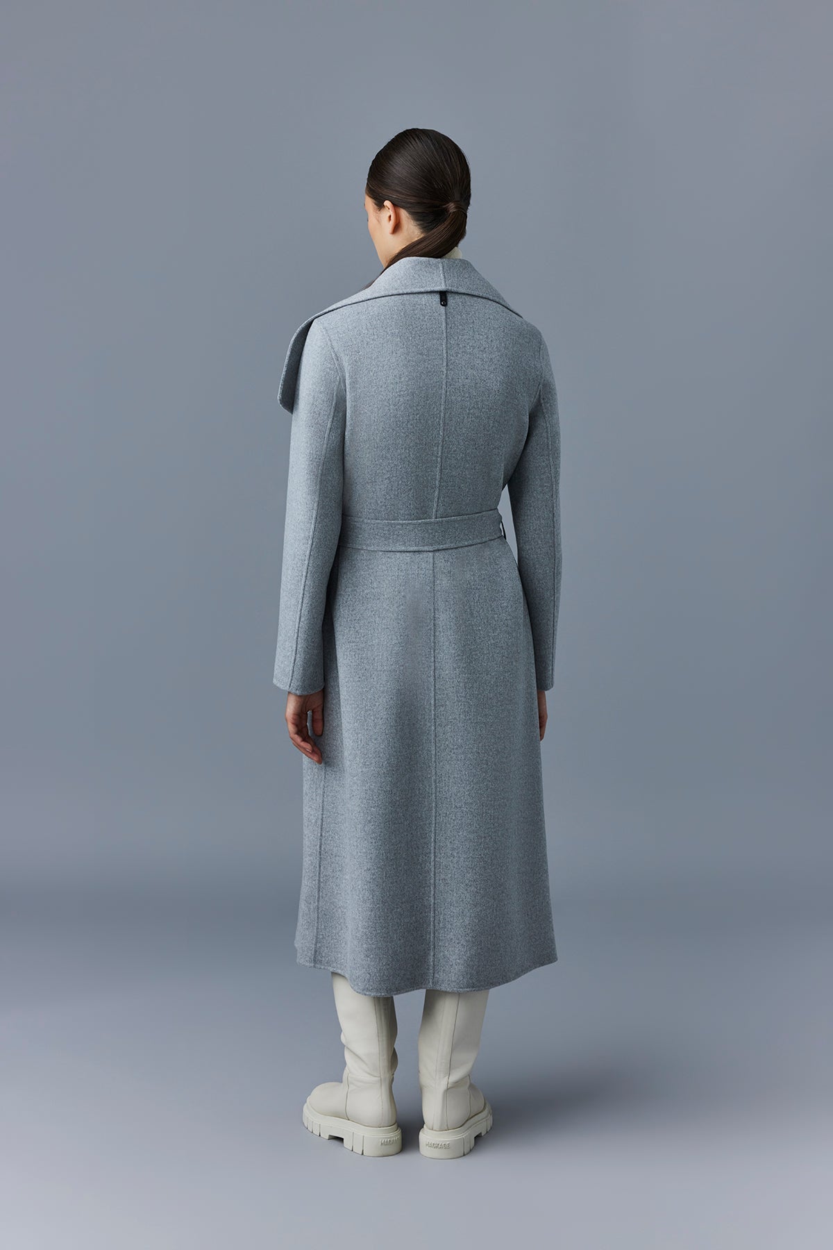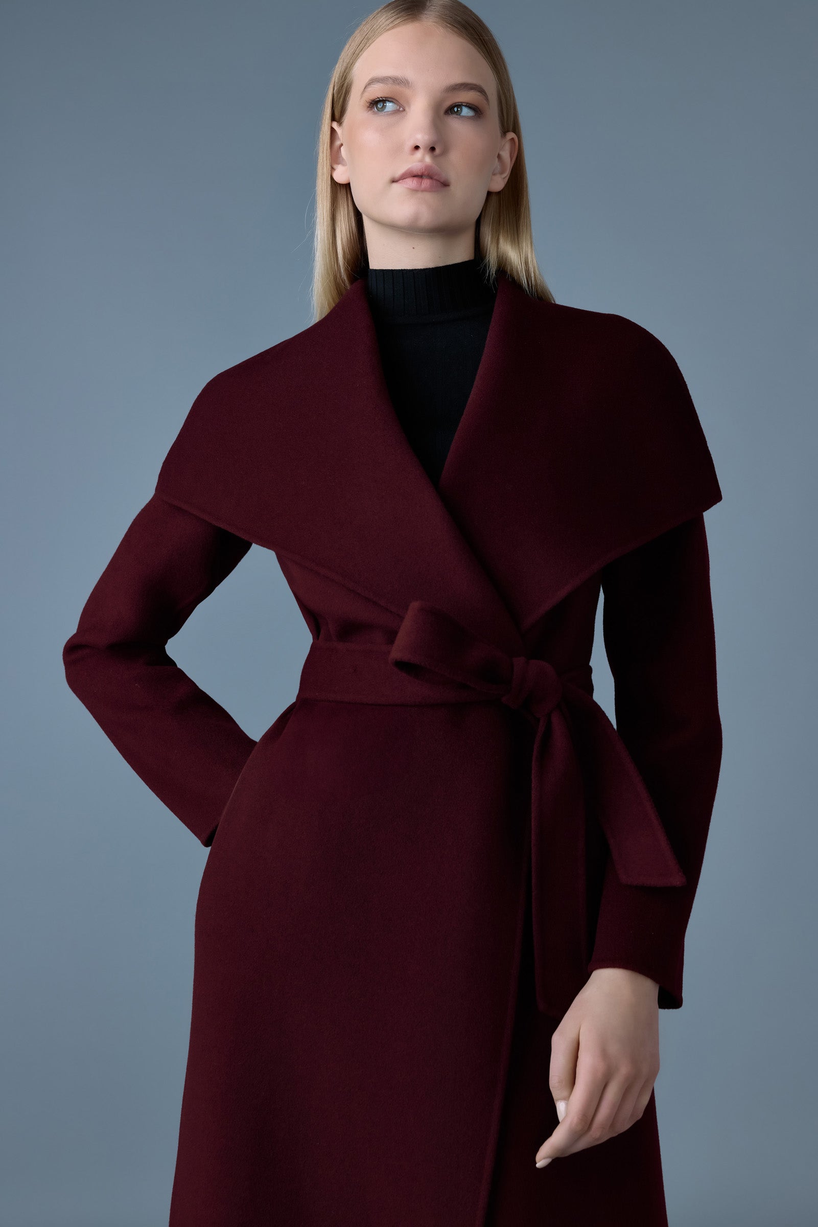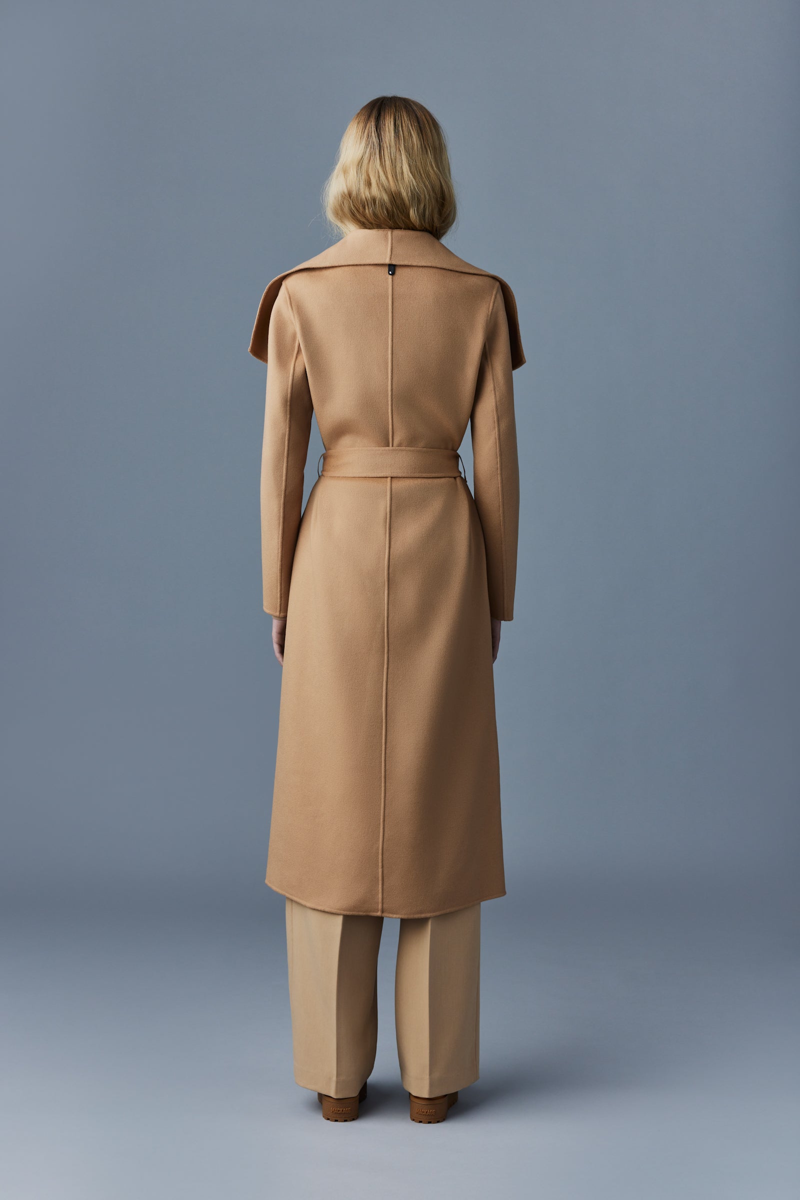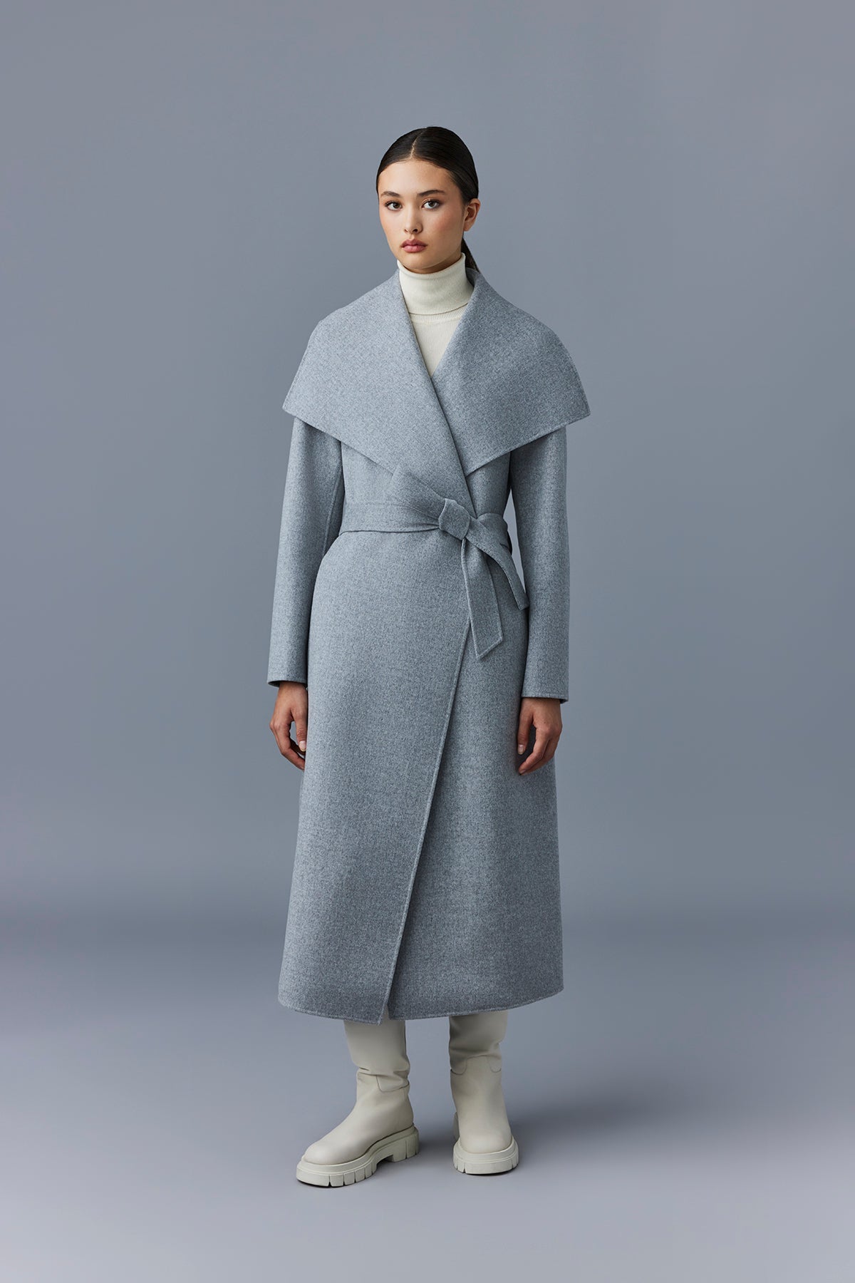 MAI-CN is a long wrap coat for women handmade from luxurious soft double-face wool. The fluid drape provides a relaxed-fit and unlined layer for maximum comfort in mild climates. The waterfall collar adds a sophisticated appeal while leather welting highlights the waist pockets and belt loops.