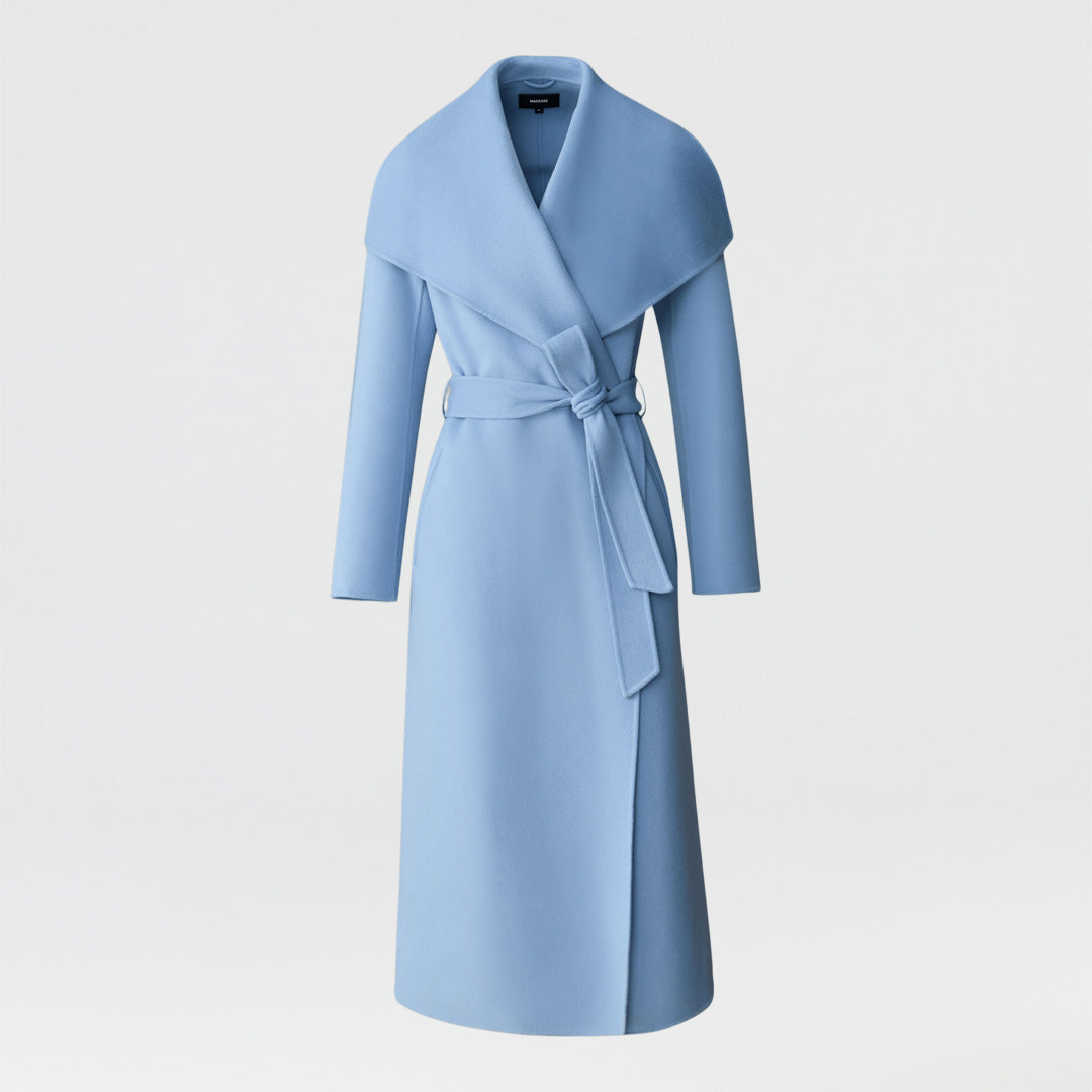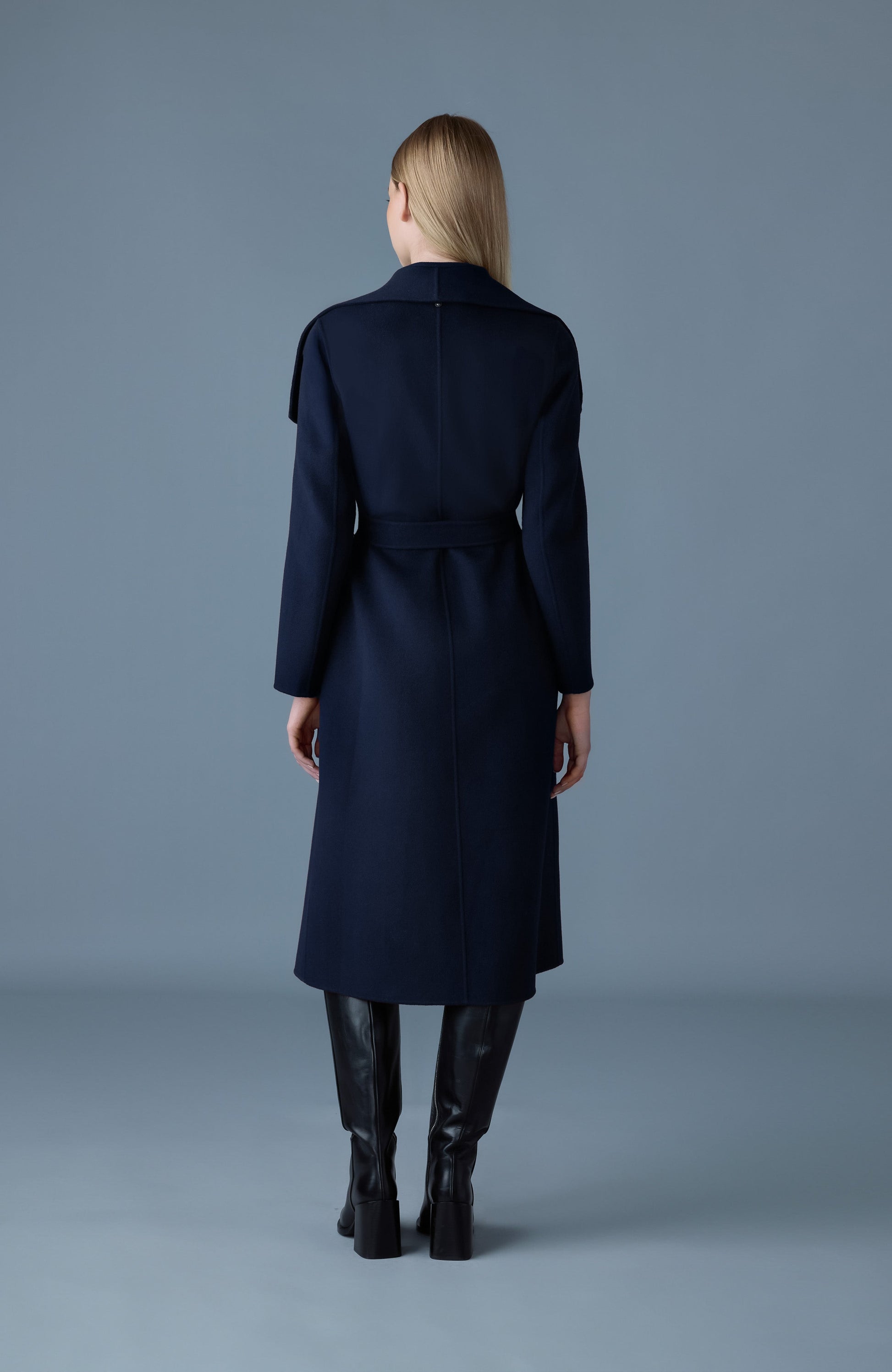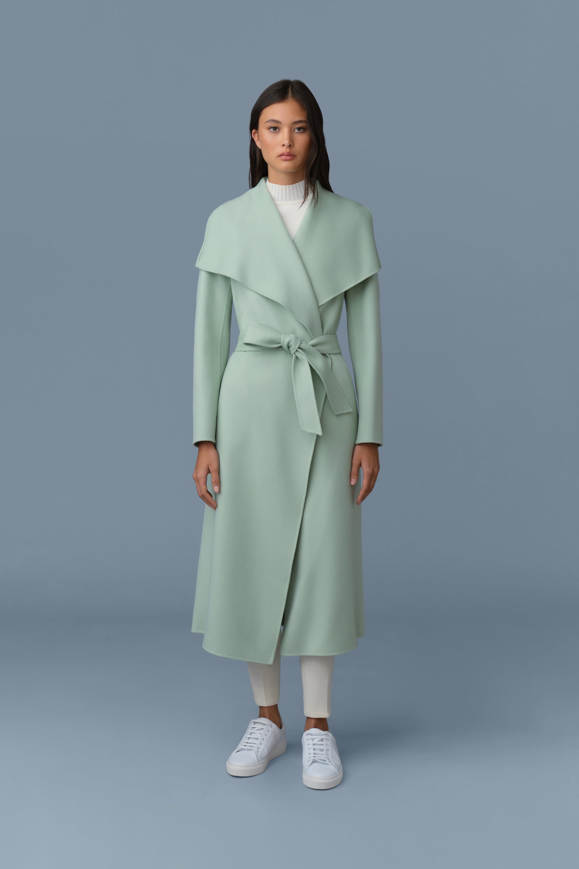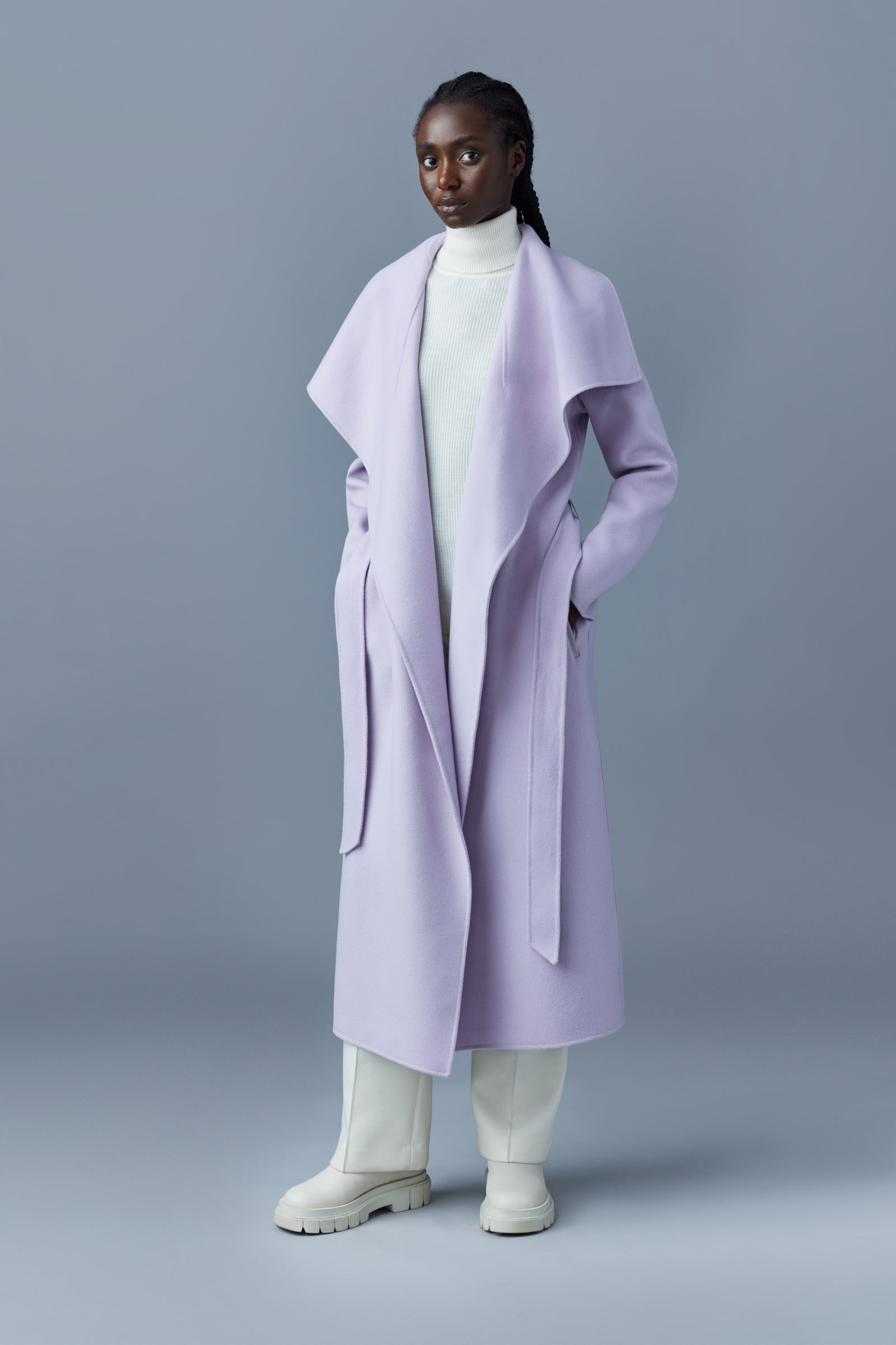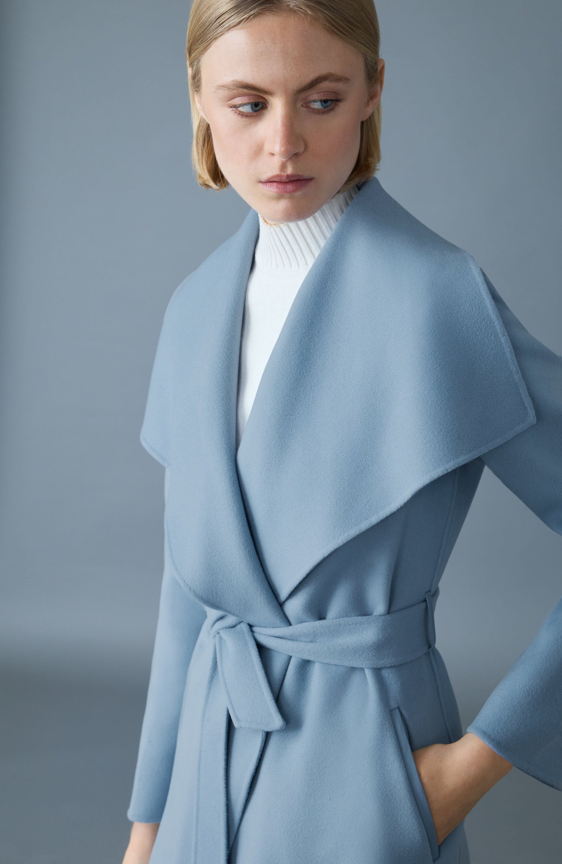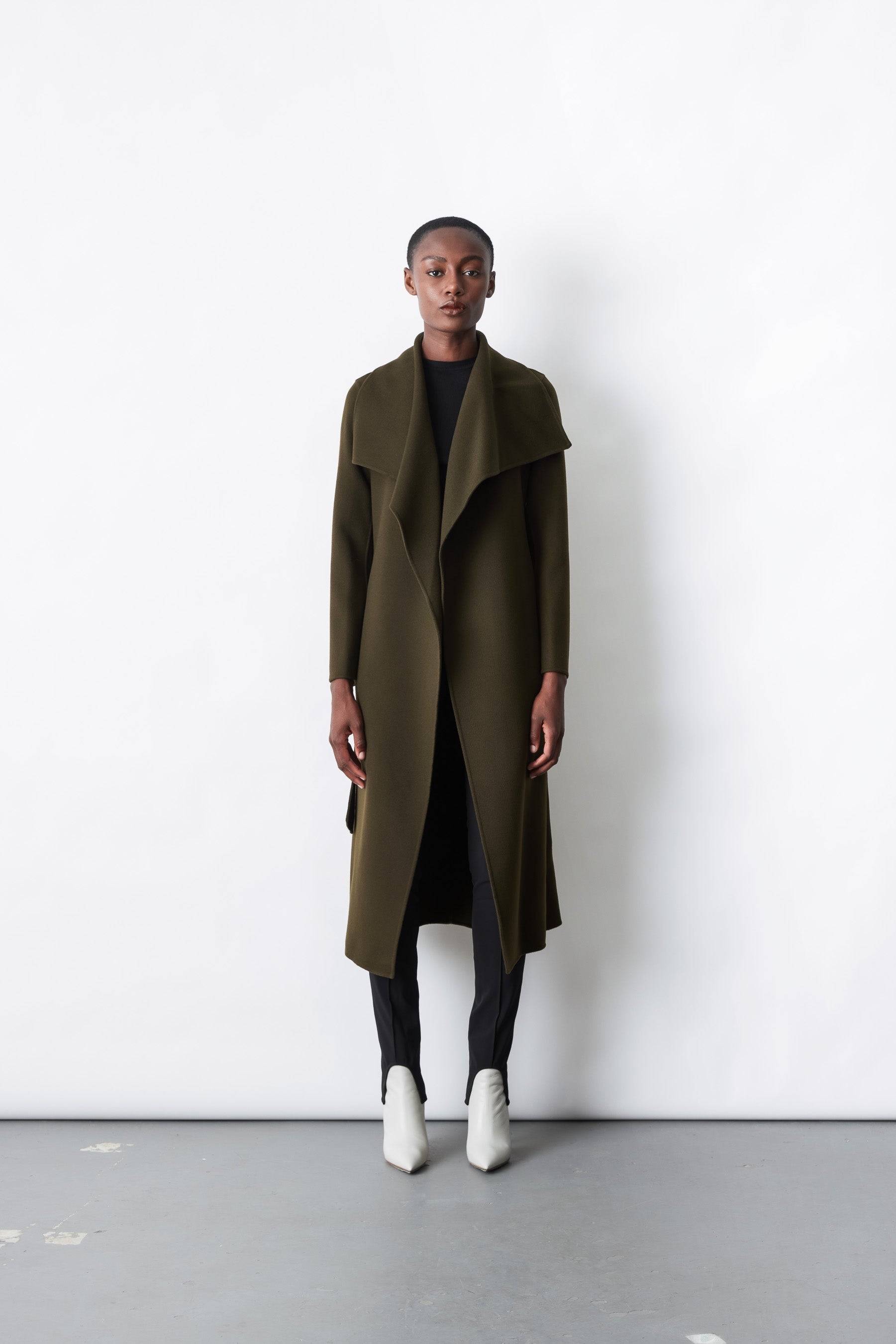 MAI-CN is a long wrap coat for women handmade from luxurious soft double-face wool. The fluid drape provides a relaxed-fit and unlined layer for maximum comfort in mild climates. The waterfall collar adds a sophisticated appeal while leather welting highlights the waist pockets and belt loops.