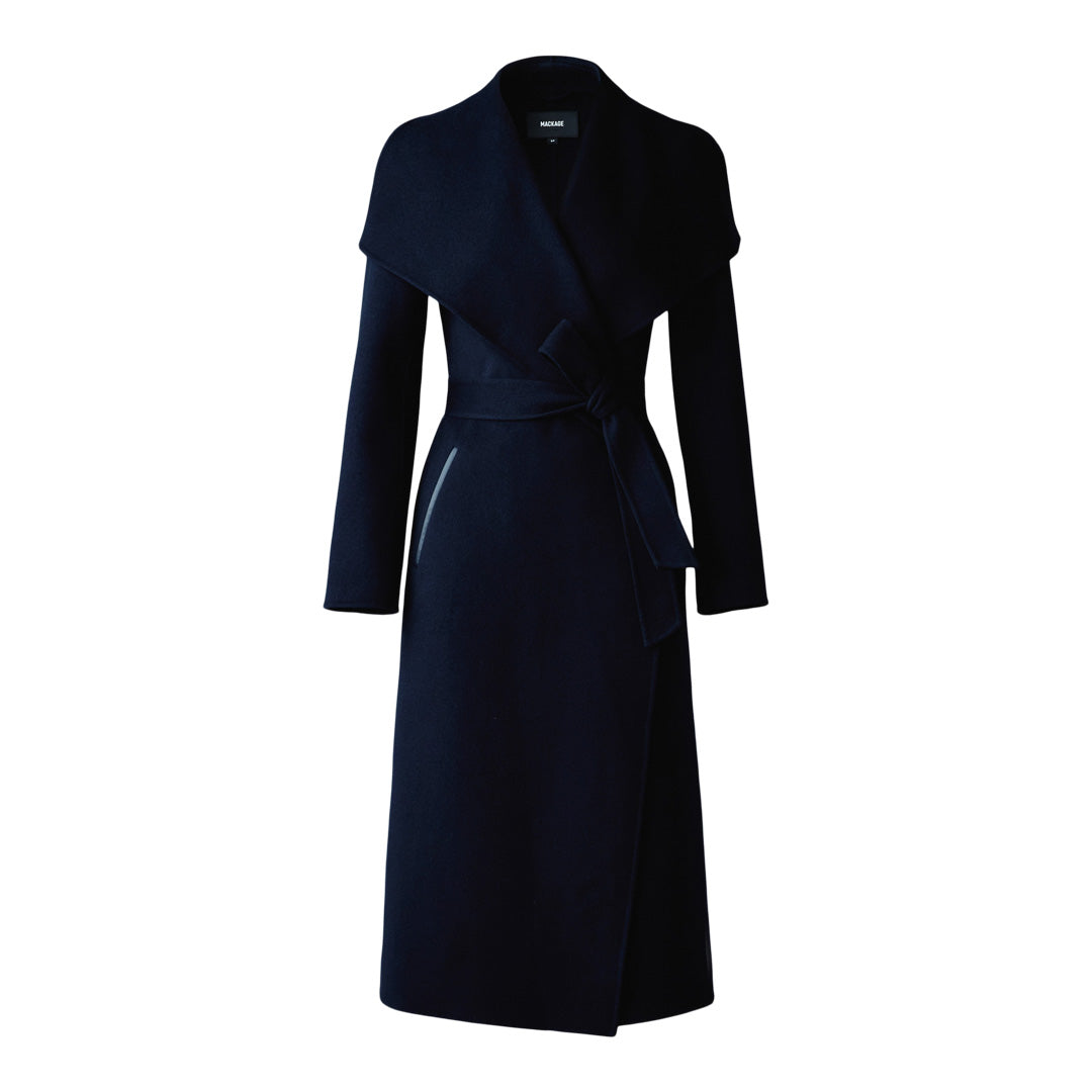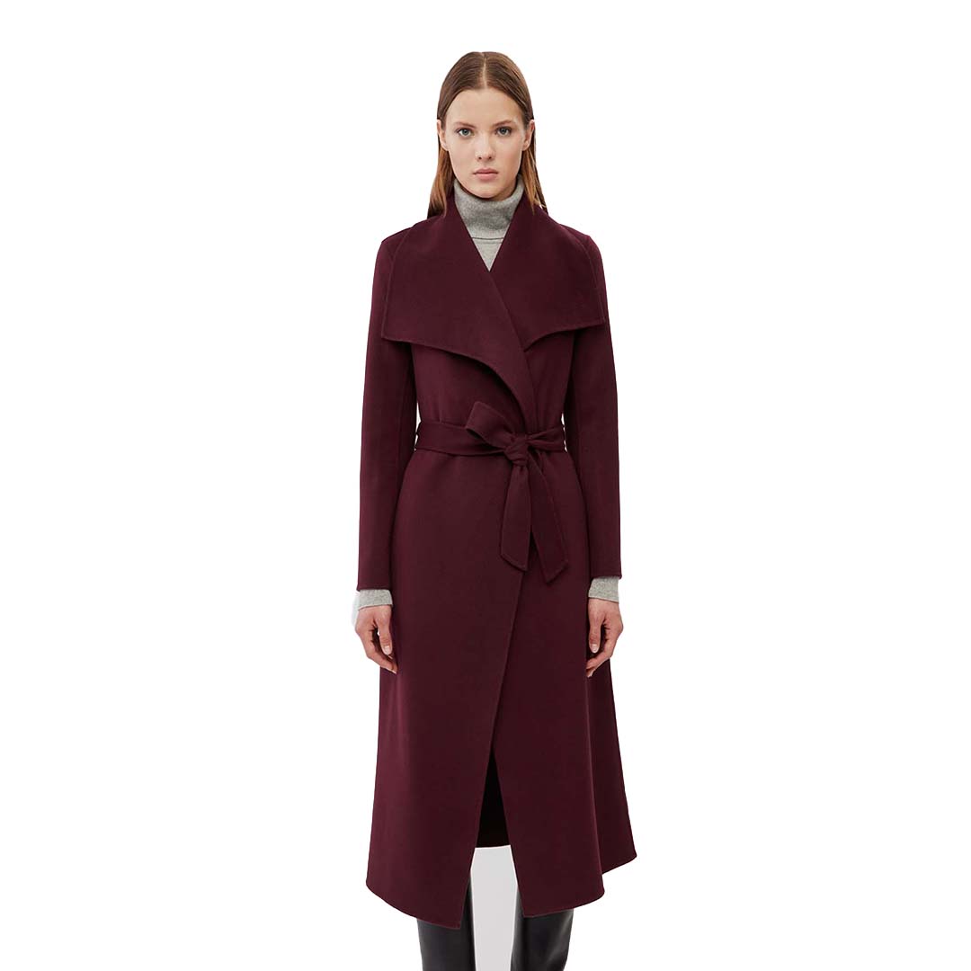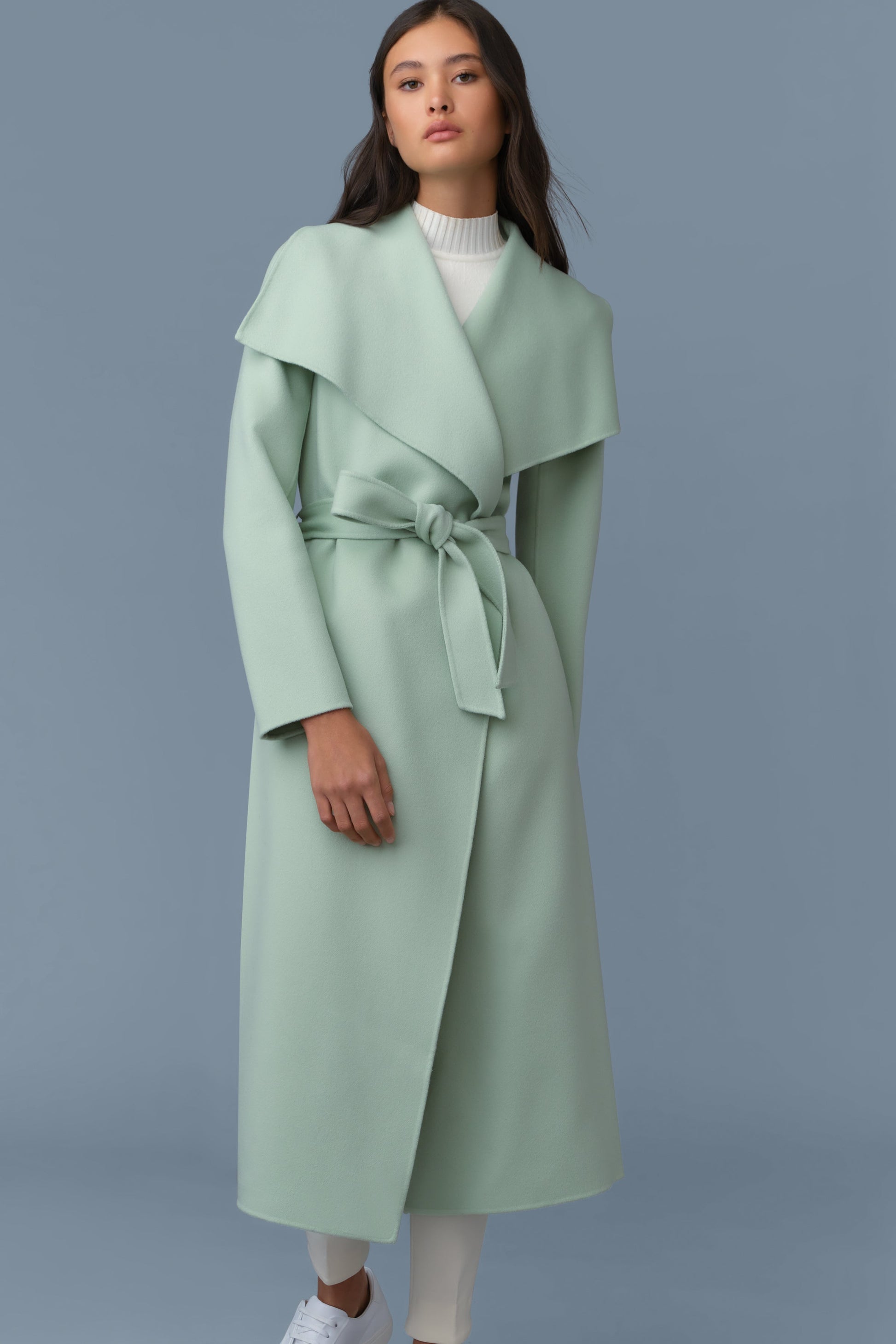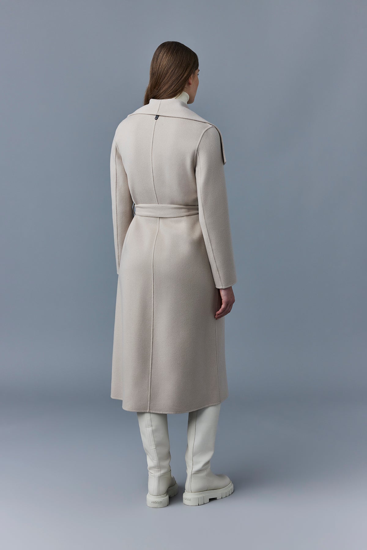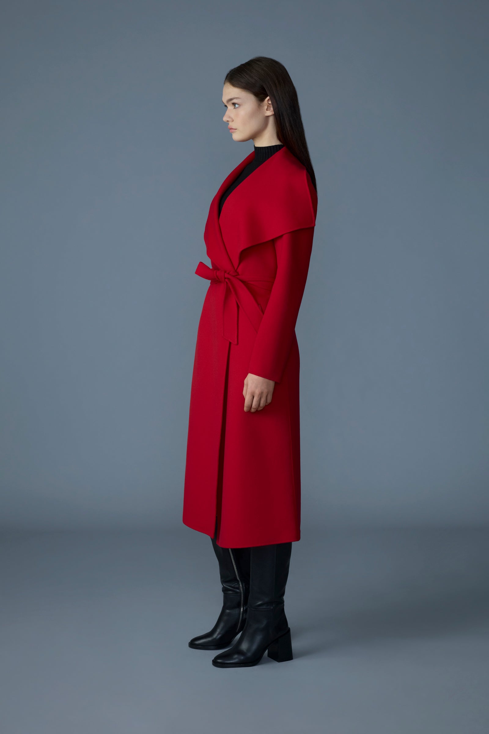MAI-CN is a long wrap coat for women handmade from luxurious soft double-face wool. The fluid drape provides a relaxed-fit and unlined layer for maximum comfort in mild climates. The waterfall collar adds a sophisticated appeal while leather welting highlights the waist pockets and belt loops.