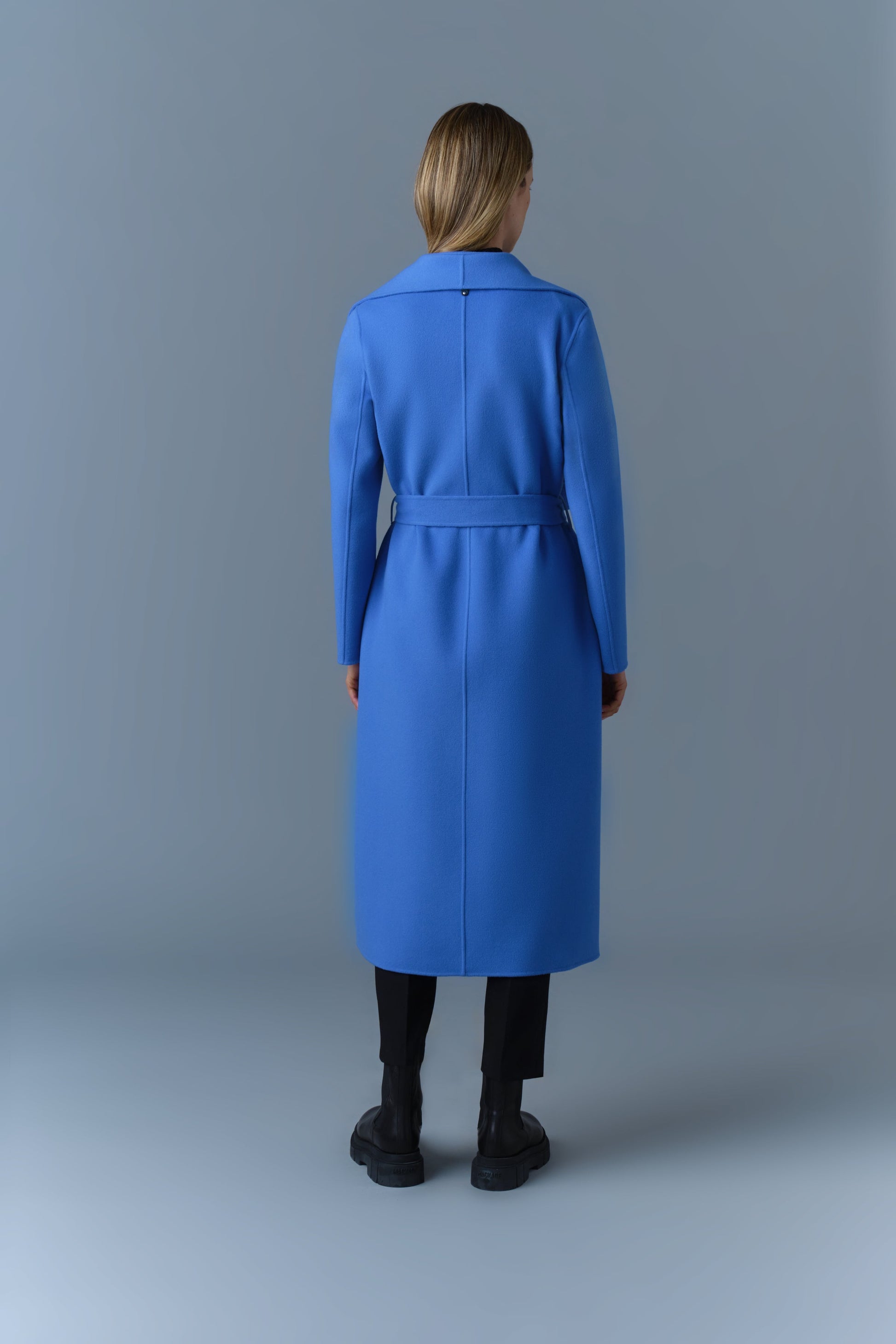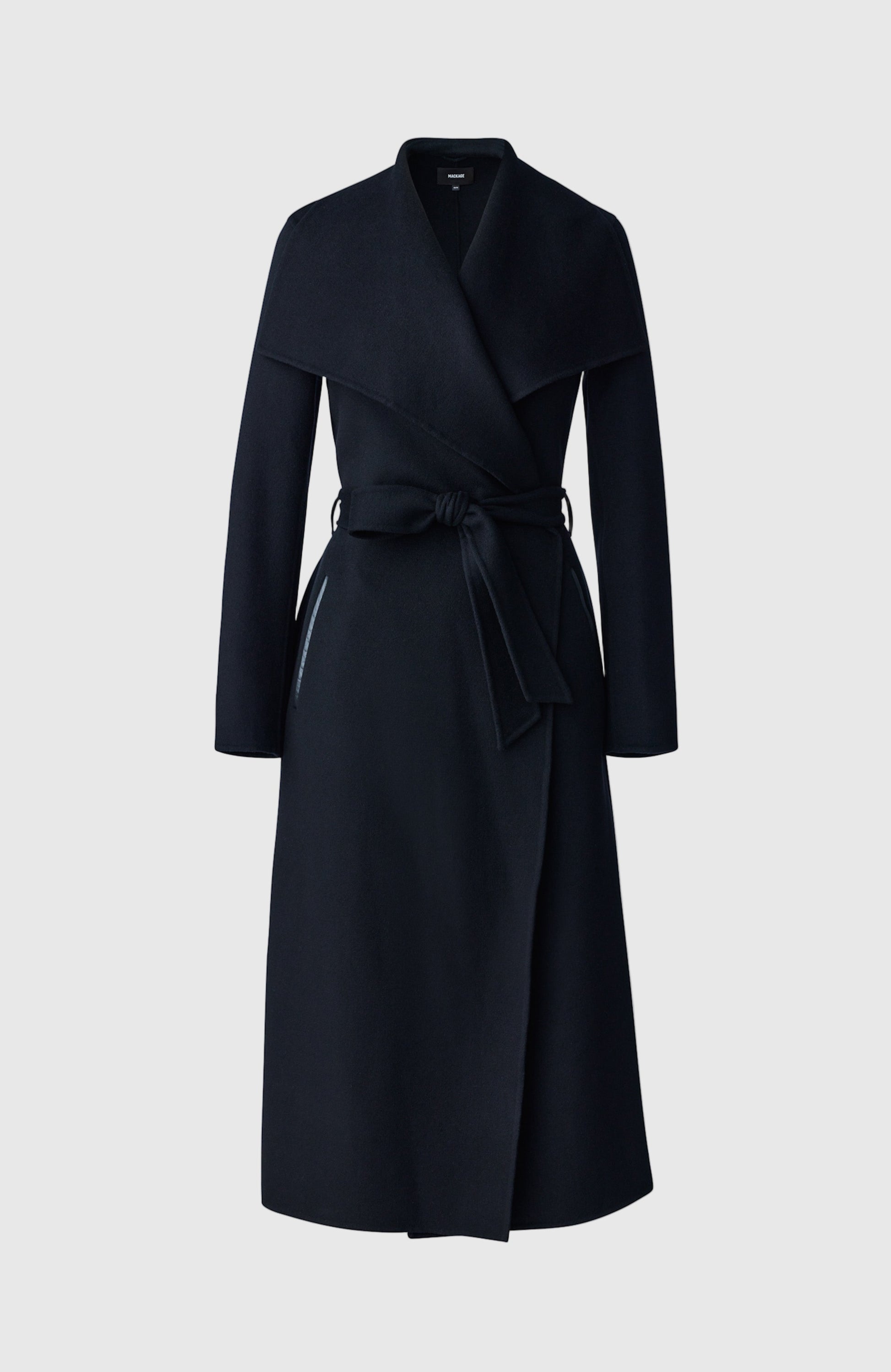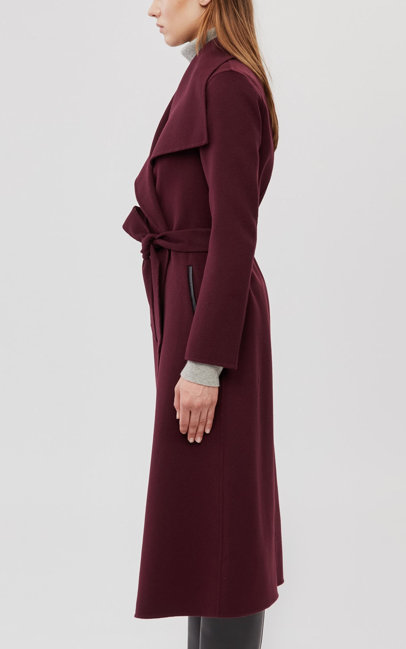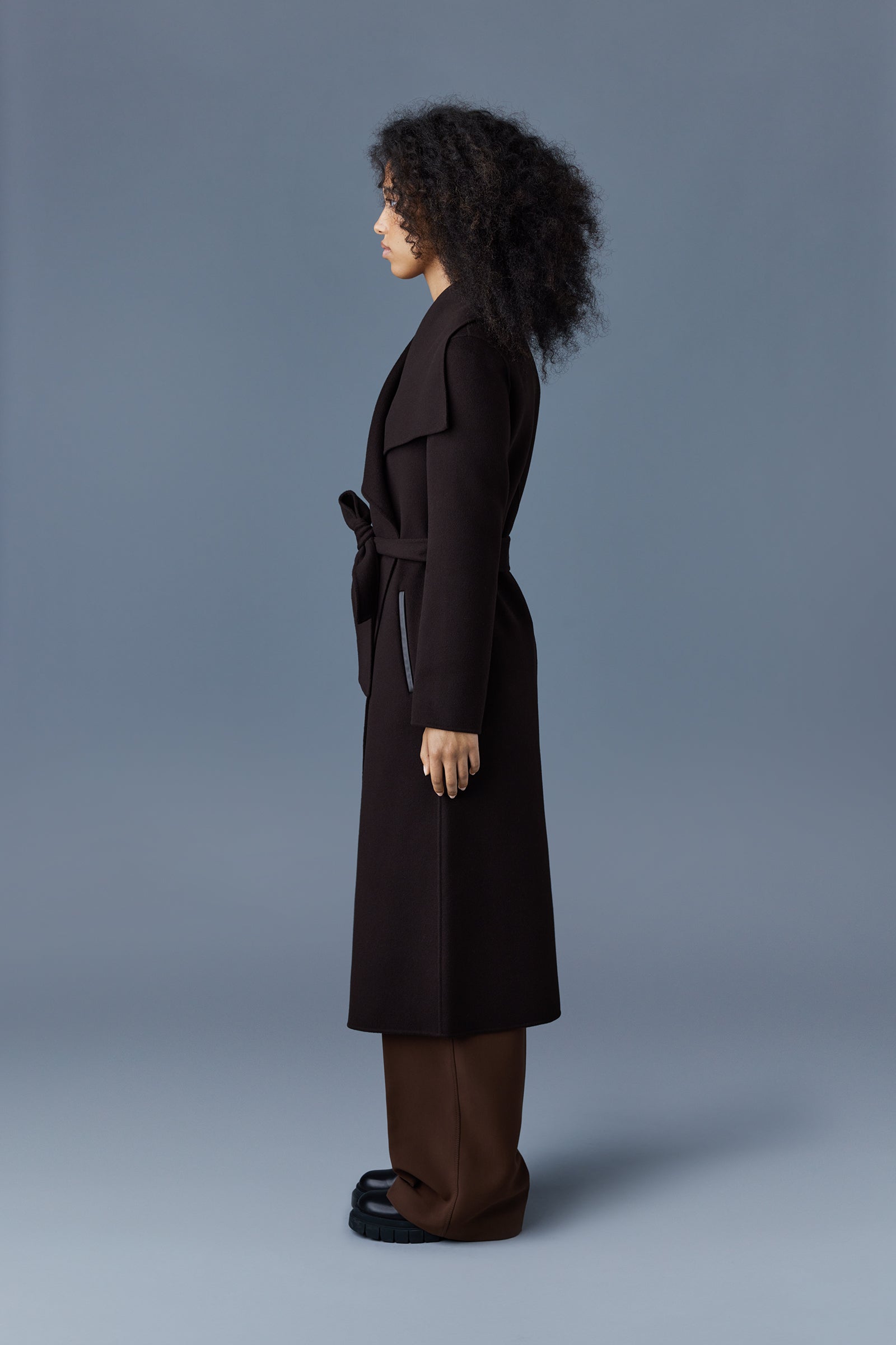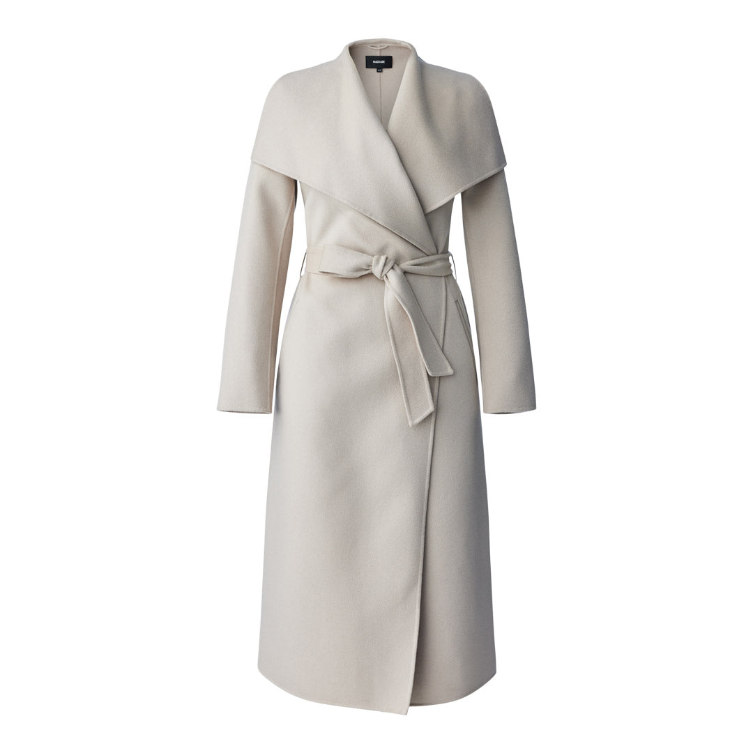 MAI-CN is a long wrap coat for women handmade from luxurious soft double-face wool. The fluid drape provides a relaxed-fit and unlined layer for maximum comfort in mild climates. The waterfall collar adds a sophisticated appeal while leather welting highlights the waist pockets and belt loops.