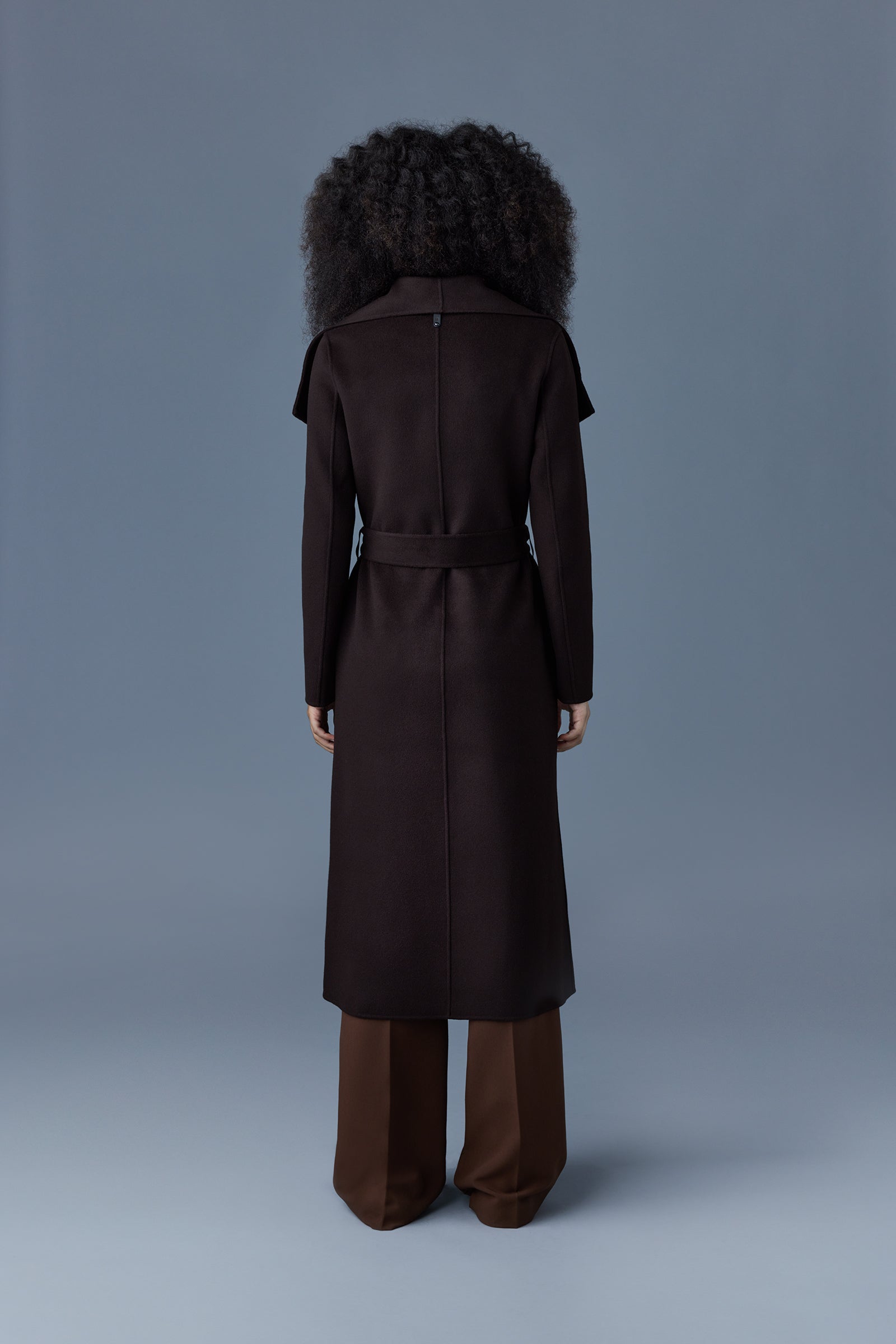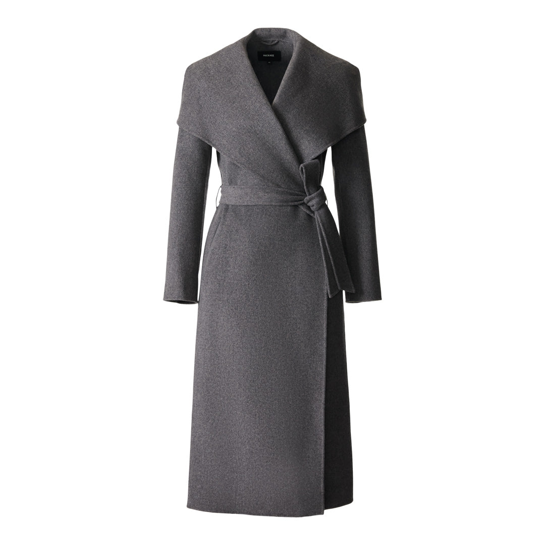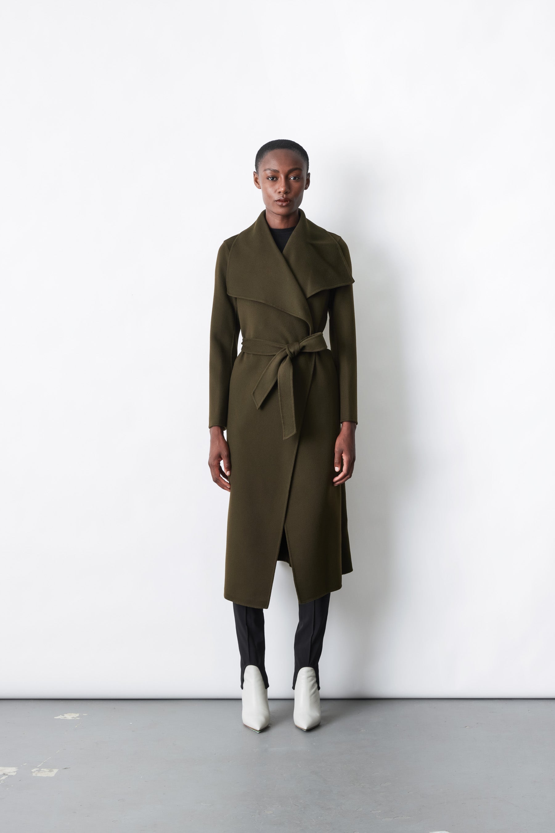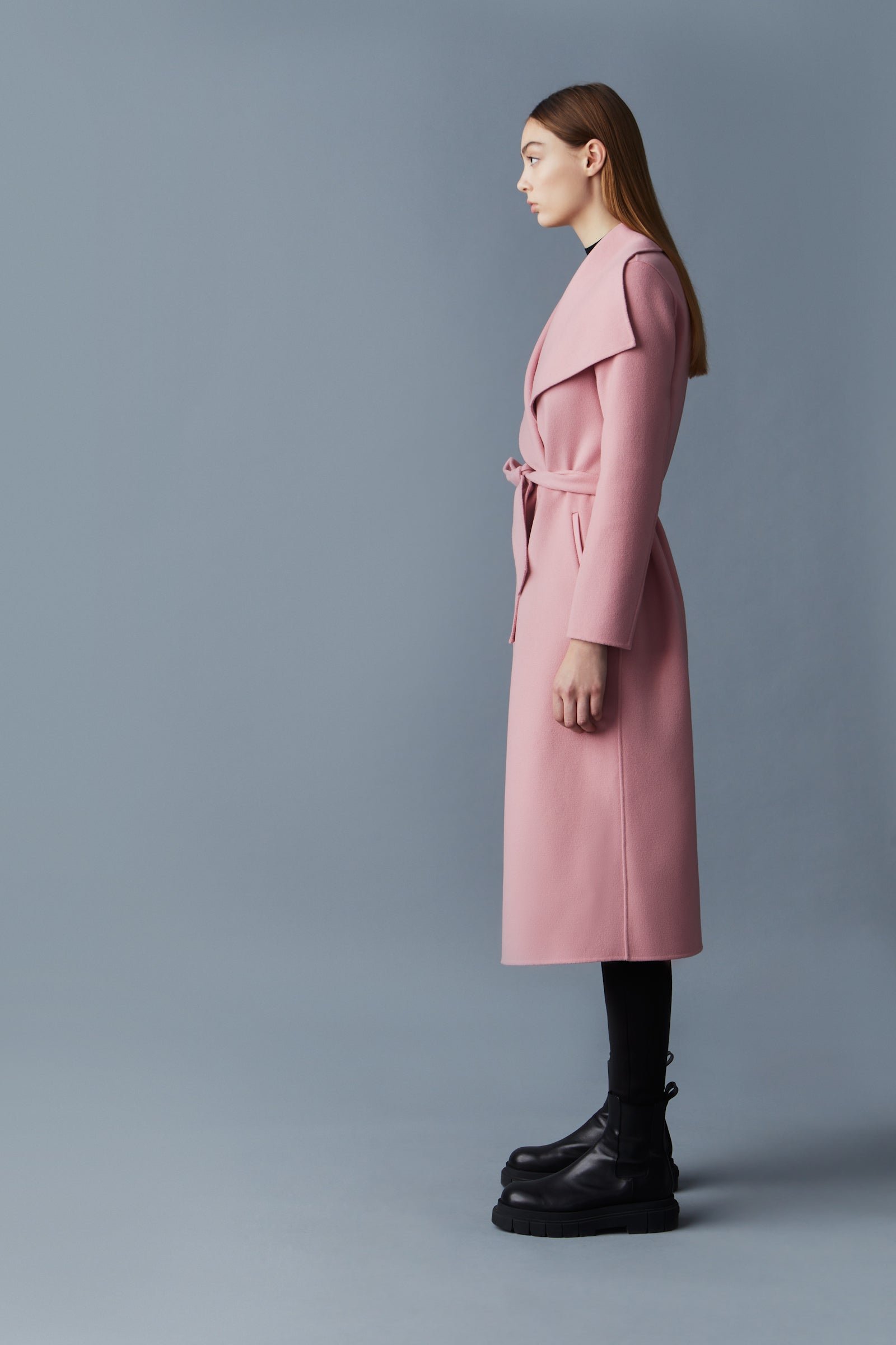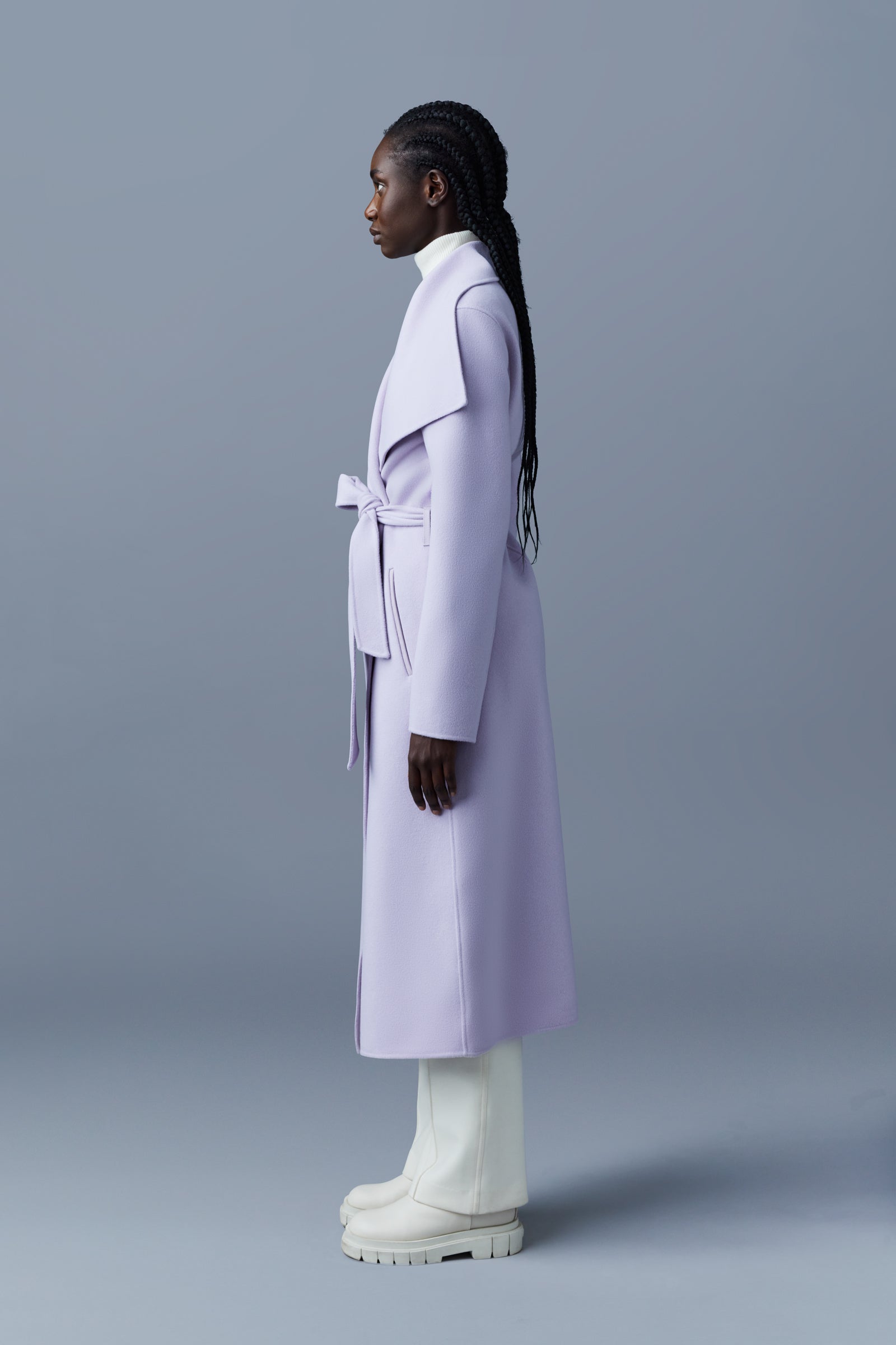 MAI-CN is a long wrap coat for women handmade from luxurious soft double-face wool. The fluid drape provides a relaxed-fit and unlined layer for maximum comfort in mild climates. The waterfall collar adds a sophisticated appeal while leather welting highlights the waist pockets and belt loops.
