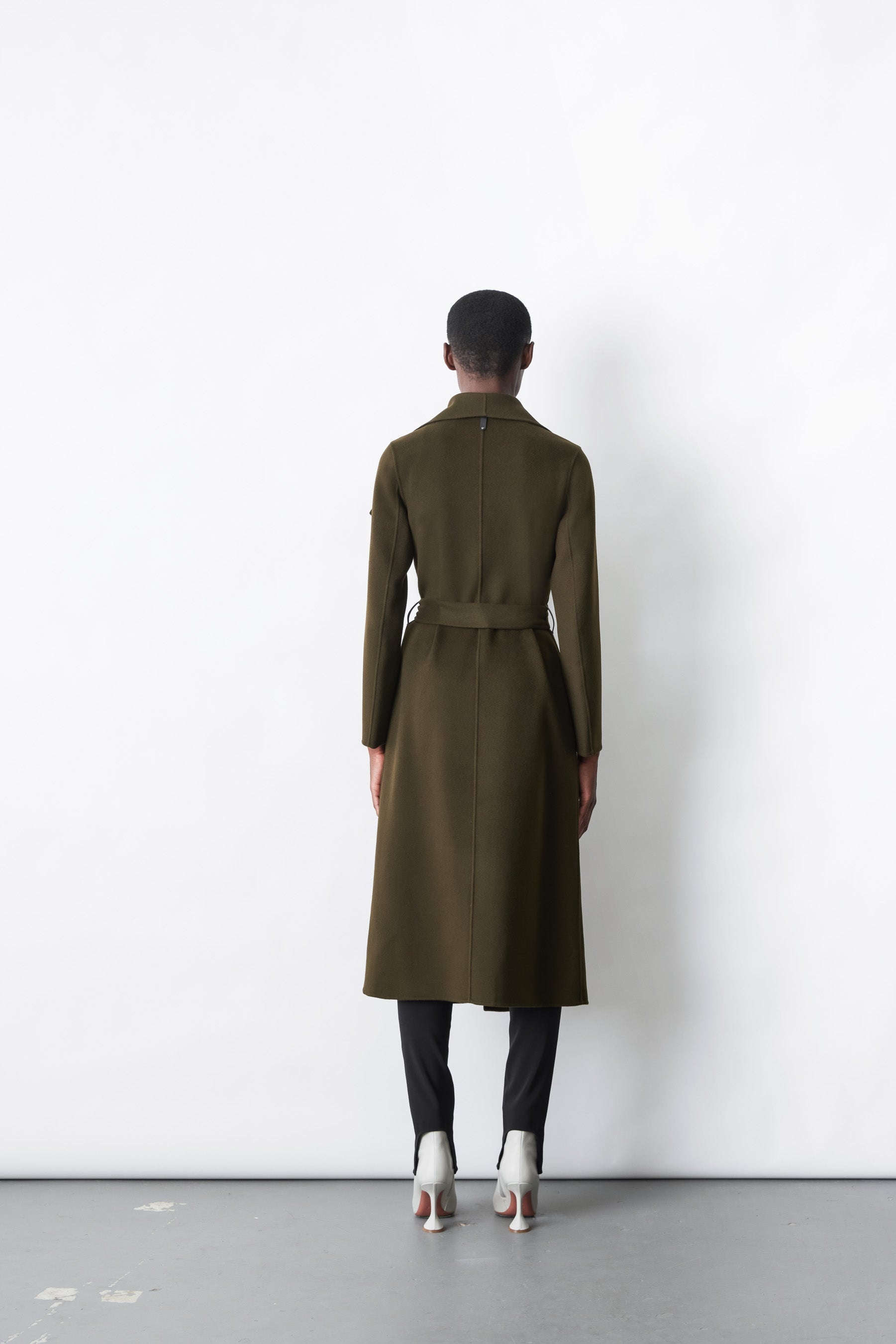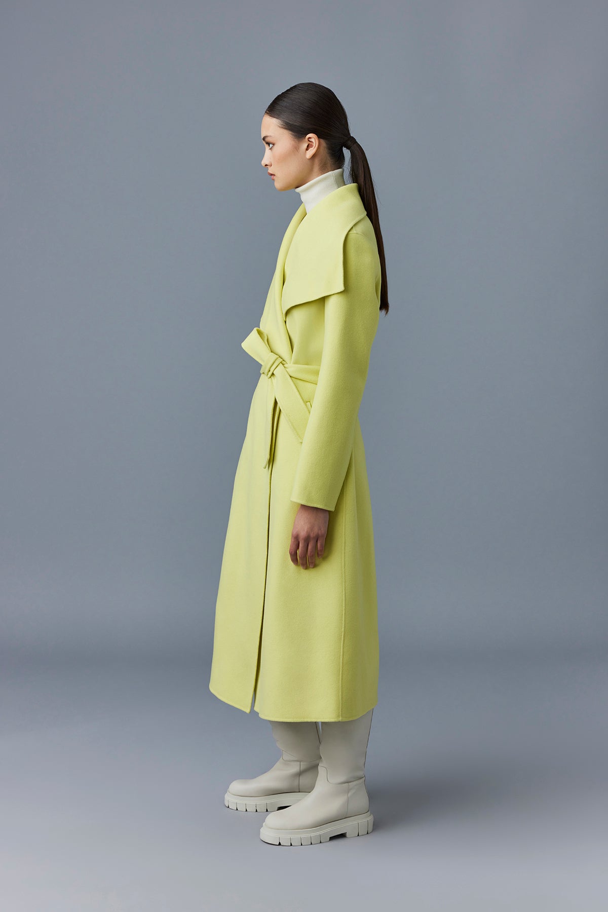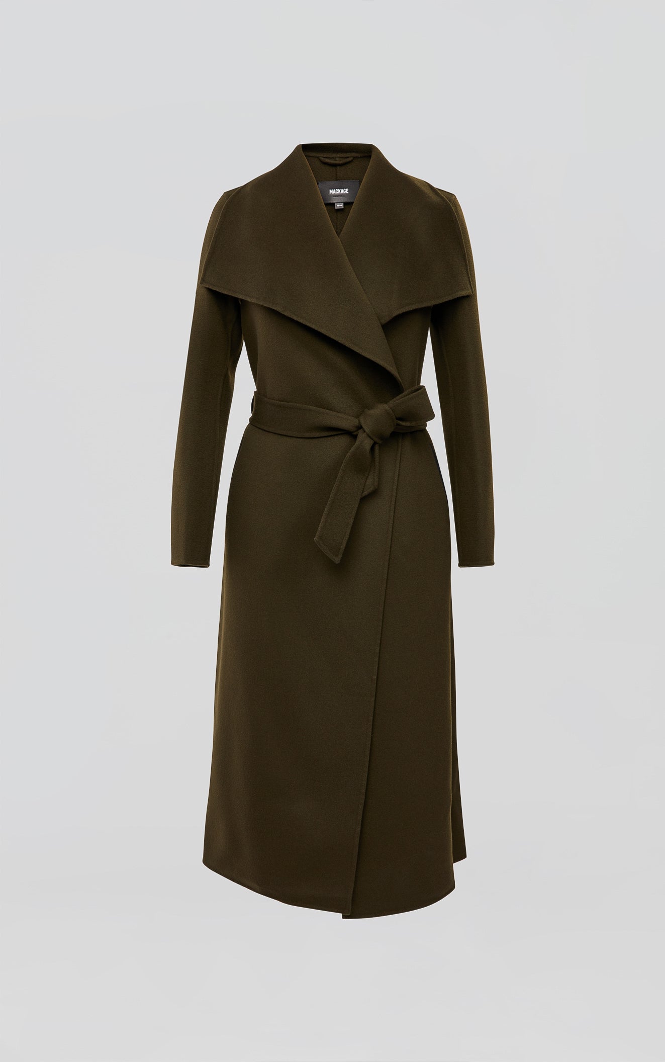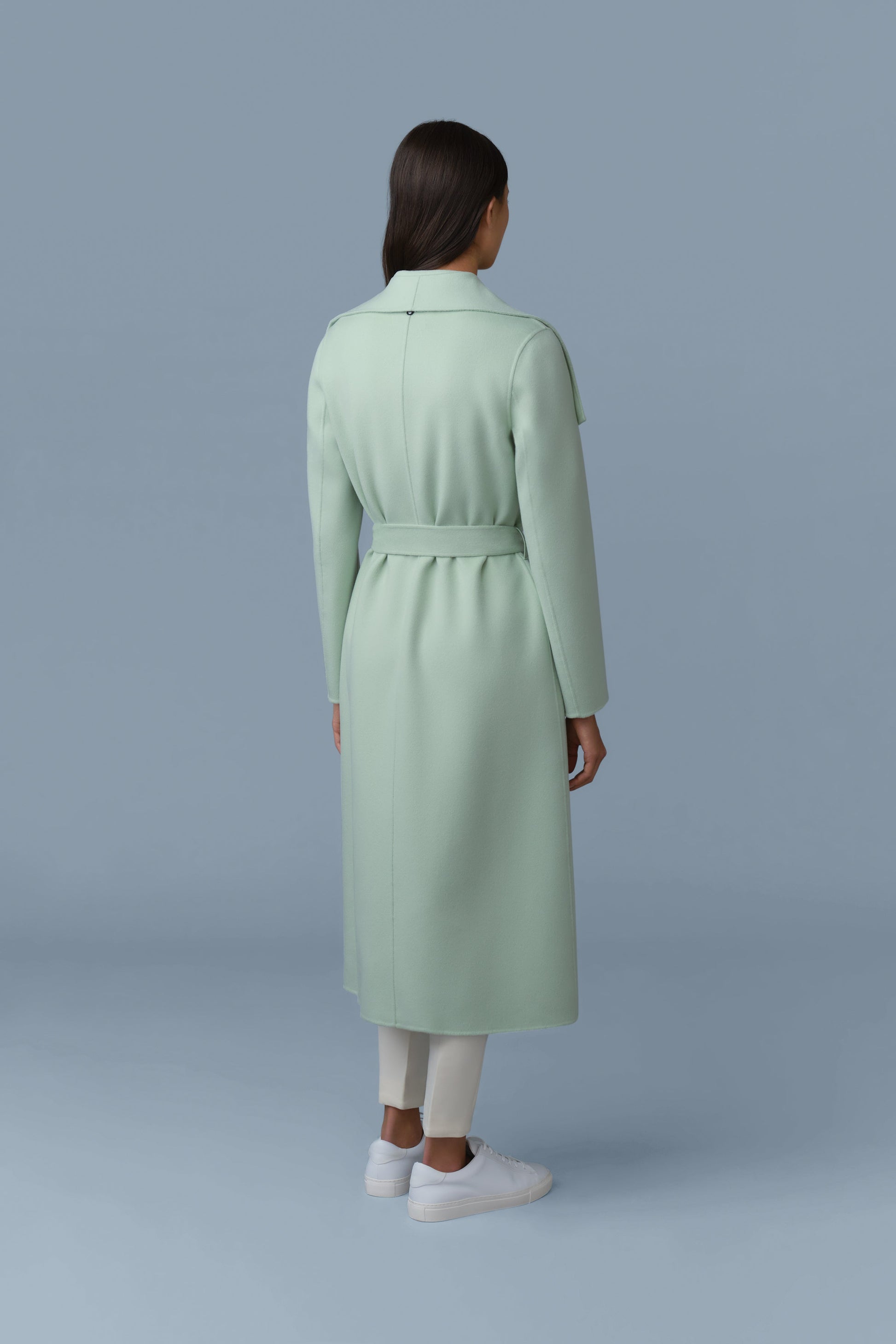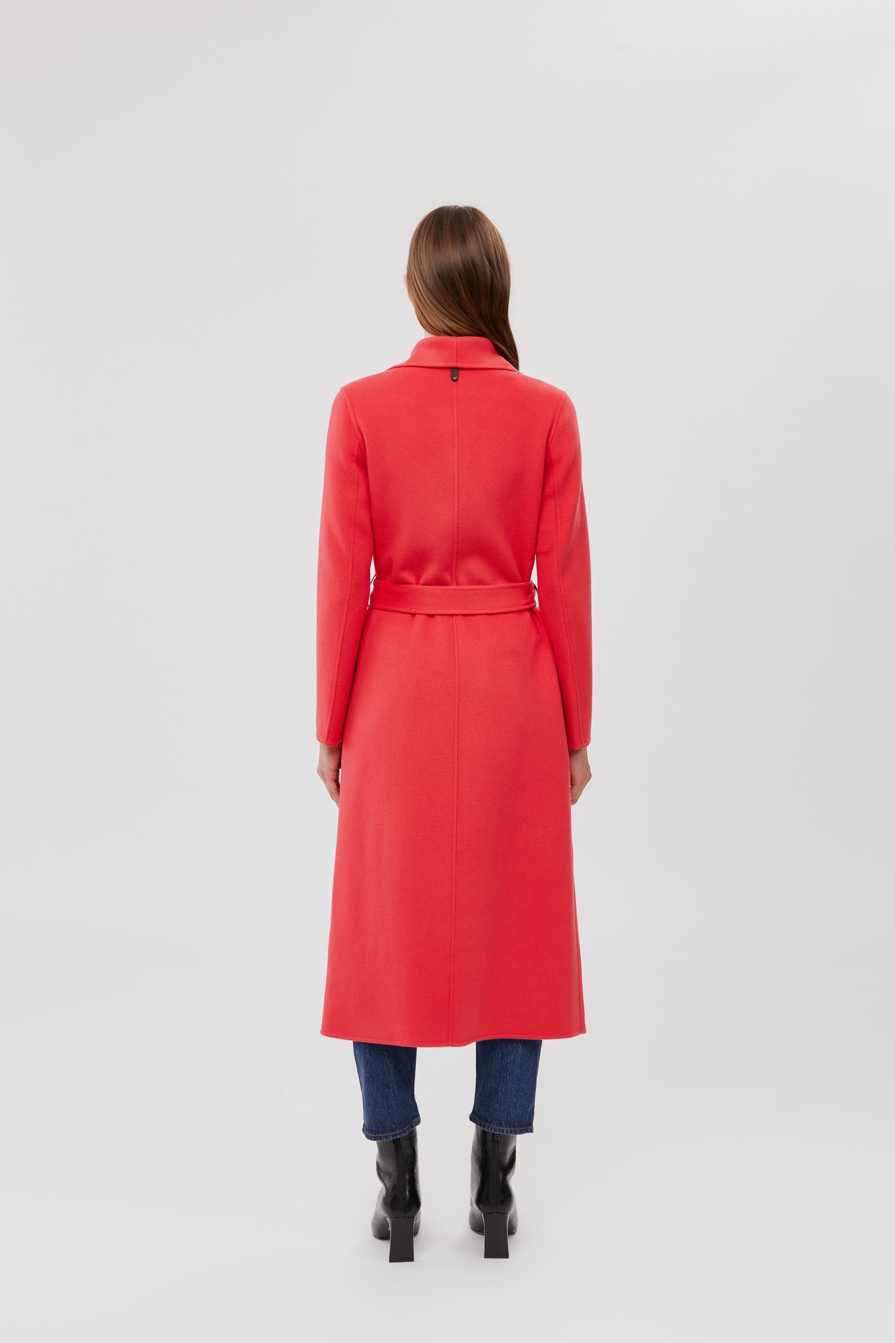 MAI-CN is a long wrap coat for women handmade from luxurious soft double-face wool. The fluid drape provides a relaxed-fit and unlined layer for maximum comfort in mild climates. The waterfall collar adds a sophisticated appeal while leather welting highlights the waist pockets and belt loops.