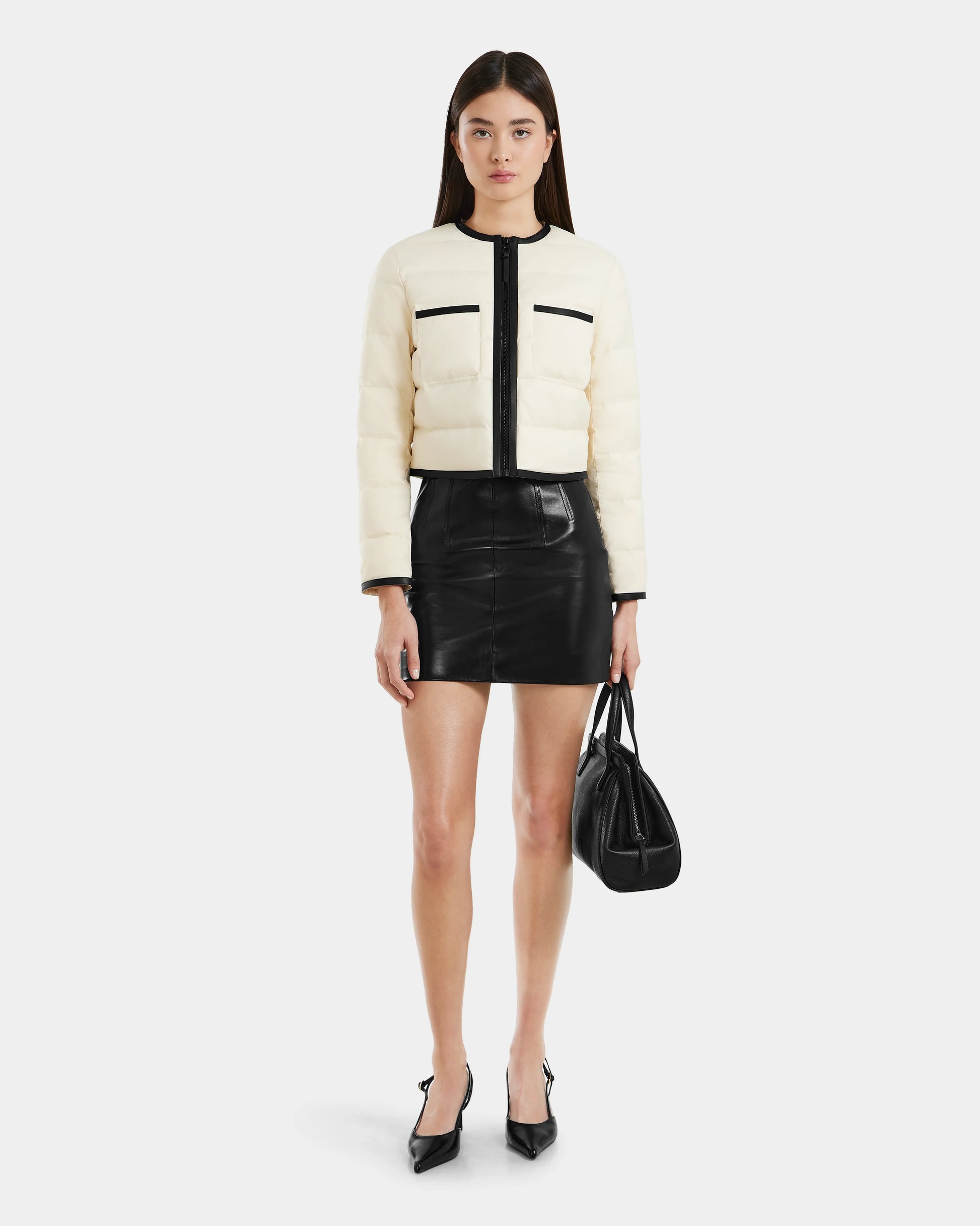 The MARKLE by RUDSAK is a women’s cropped lightweight down jacket that combines contemporary design with luxurious details. Insulated with RDS-certified down, it provides exceptional warmth in a sleek, quilted silhouette. Featuring vegan leather trim, a modern round neck collar, and a zippered center front, it adds a touch of sophistication to any look. Perfect for layering, the MARKLE is a versatile statement piece that transitions effortlessly through seasons with style and ease.