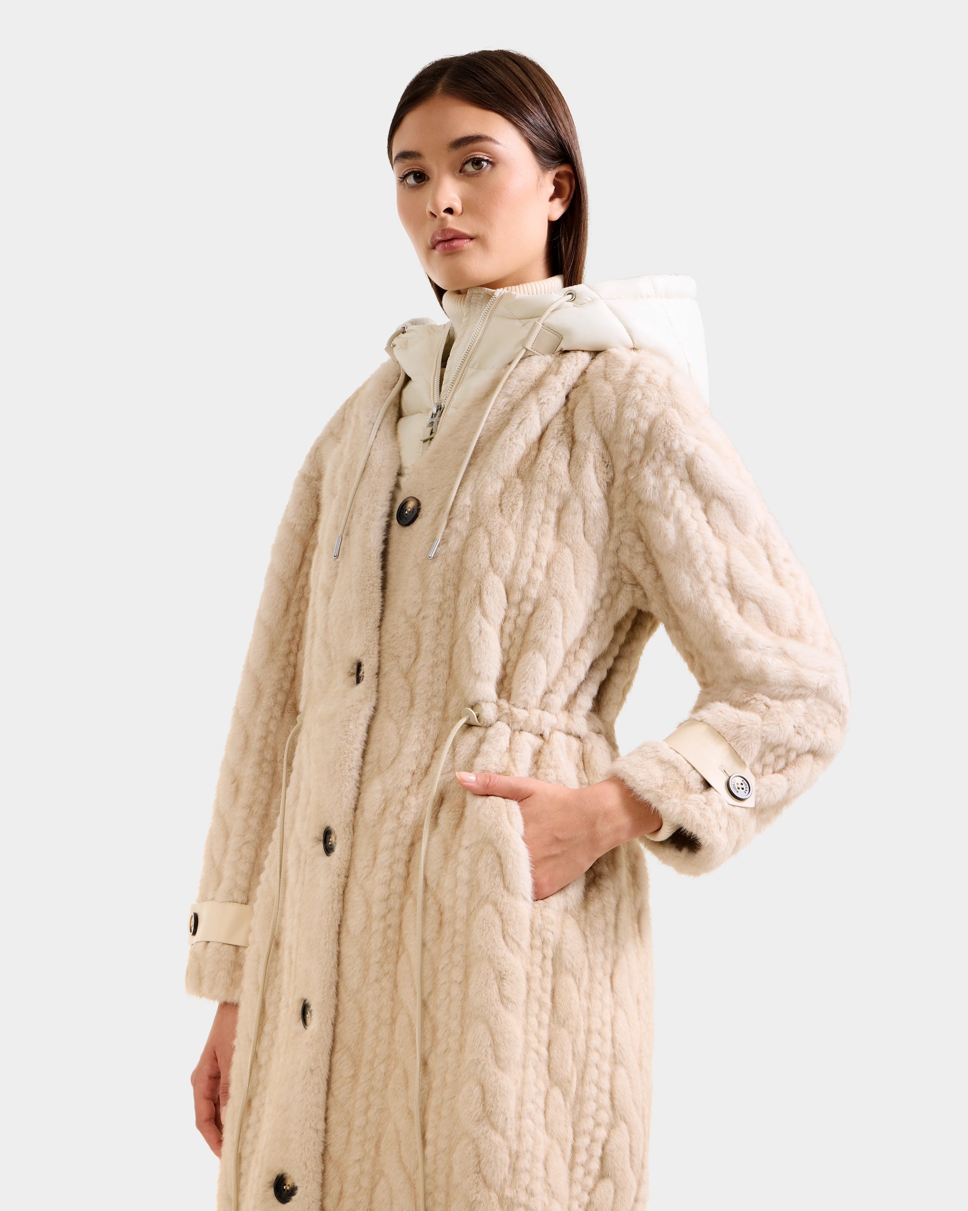 The ORIANA by RUDSAK is a women’s faux fur coat that fuses cozy luxury with refined design. Featuring a cable knit design, this longline silhouette includes a removable glossy-finish inner dickie with hood for added versatility. The drawcord waist allows for customizable cinching, while vegan leather trims add a polished finish. Equal parts statement and staple, ORIANA is designed to elevate cold-weather style with softness, structure, and a modern take on classic winter layering.