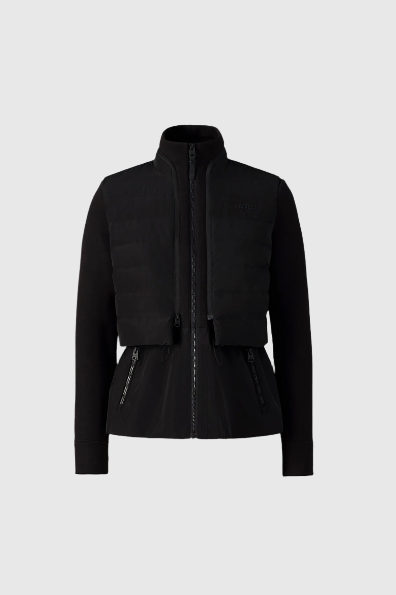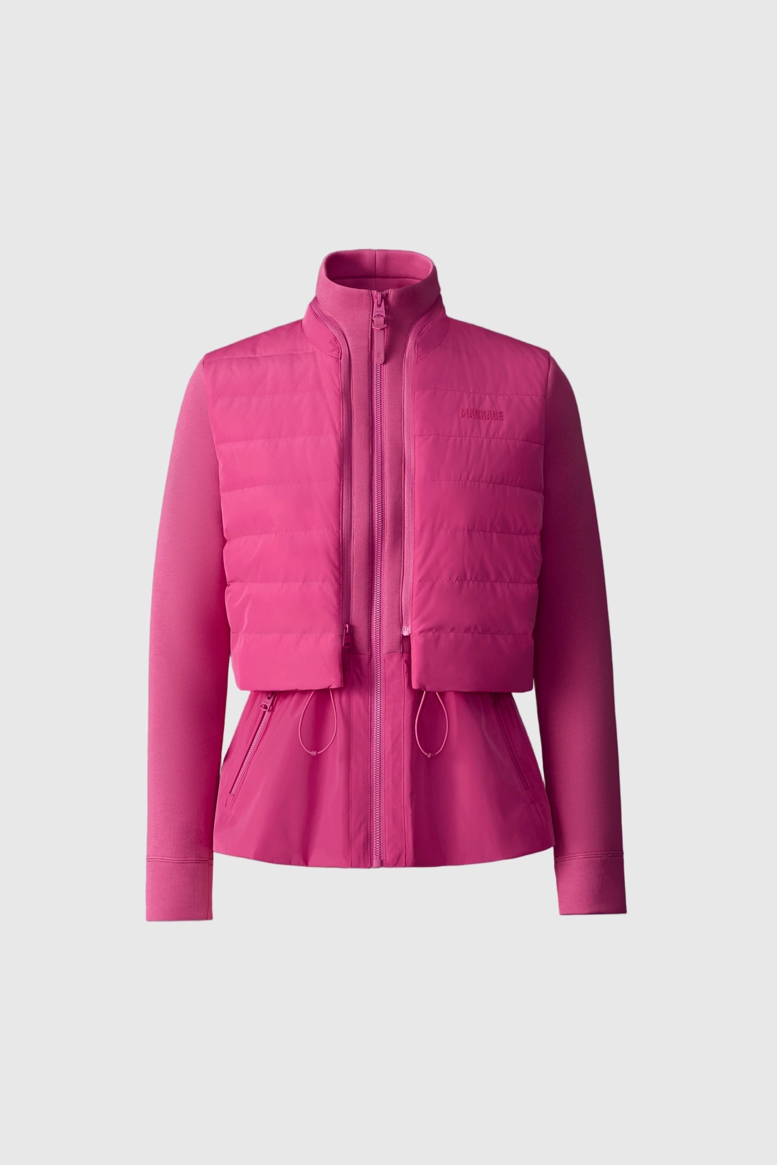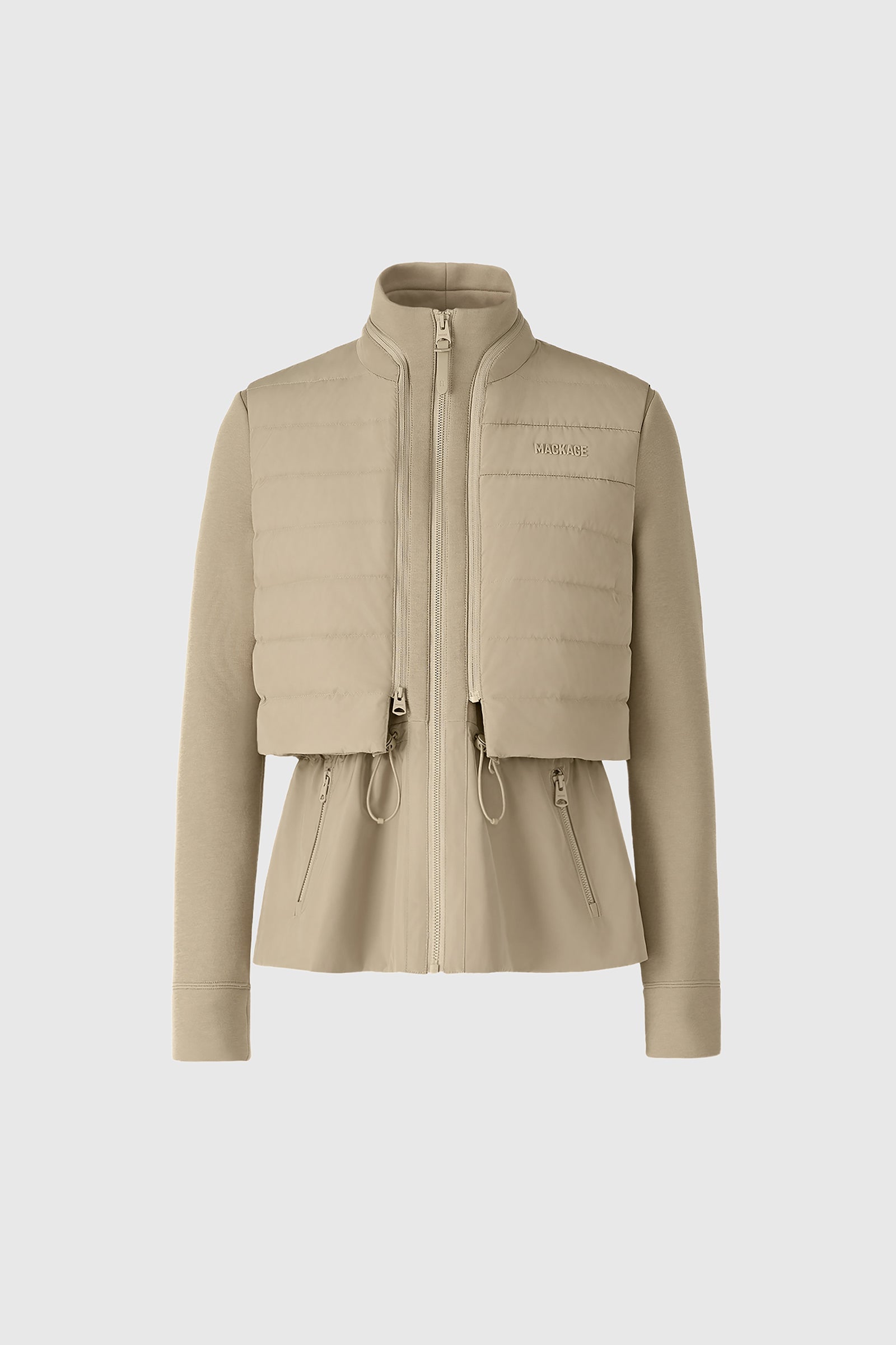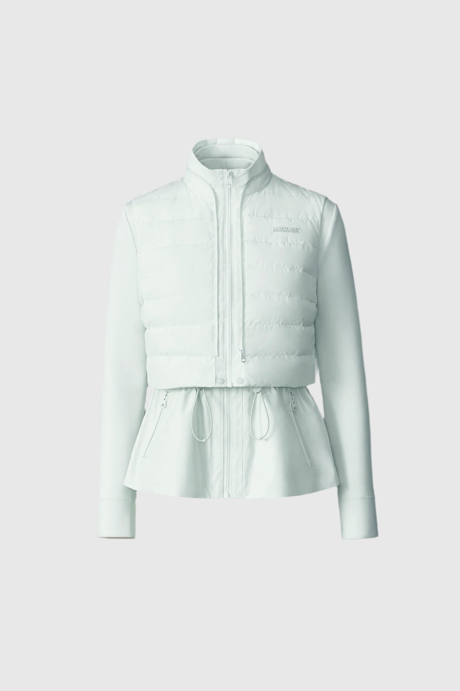 PRISCILLA is a 3-in-1 mixed-media jacket for women featuring a rainwear peplum and recycled lustrous light down front. An expertly tailored indoor-outdoor style, soft double-face jersey accents the sleeves, back, and collar. Perfect for everyday, the drawcord waist lends a custom fit and cinched silhouette. Remove the down vest layer for lighter shell jacket.