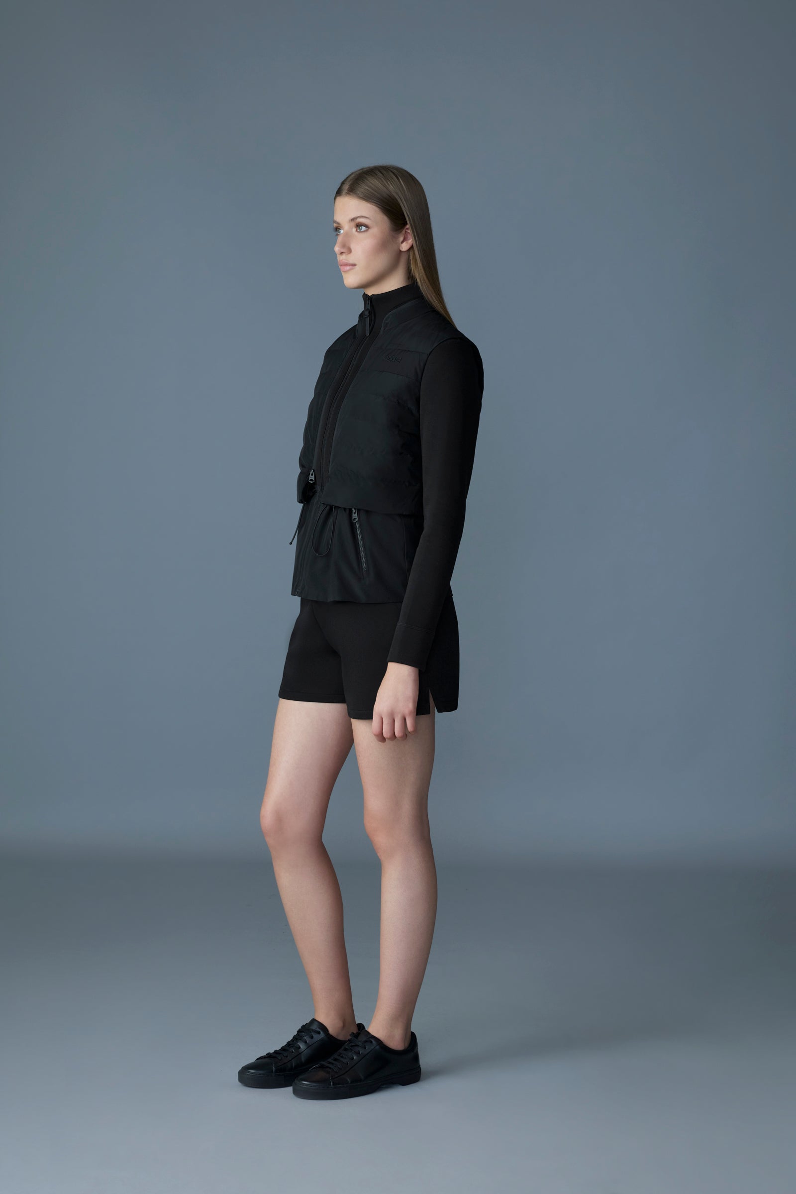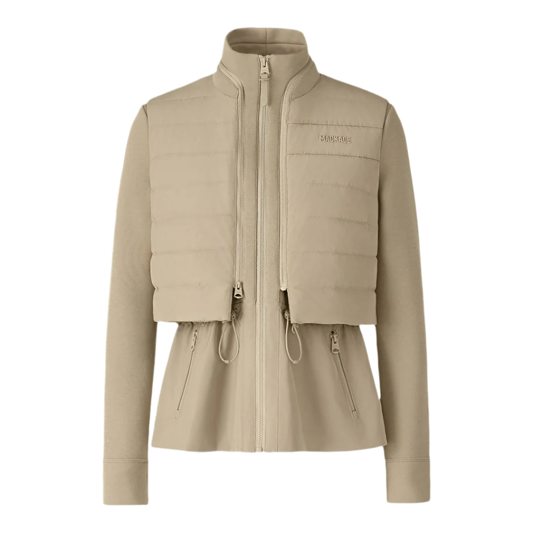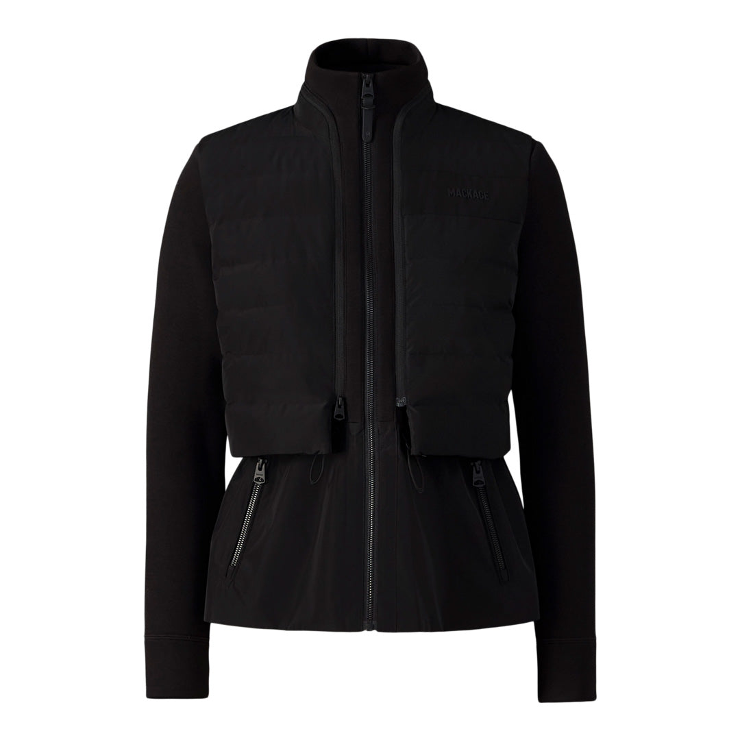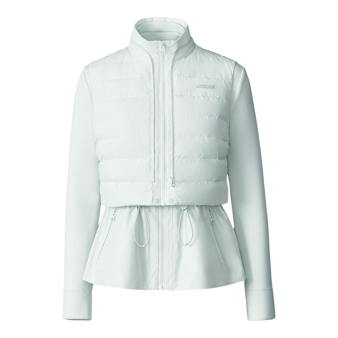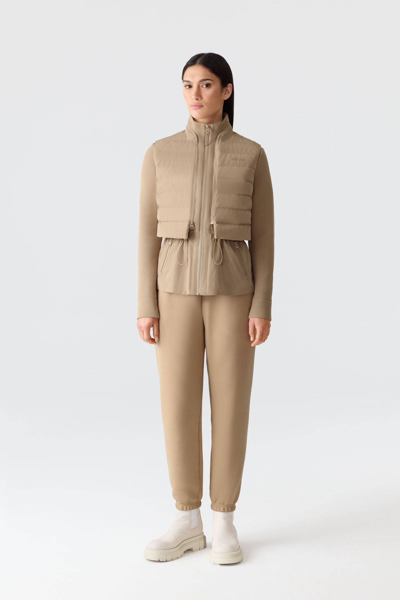 PRISCILLA is a 3-in-1 mixed-media jacket for women featuring a rainwear peplum and recycled lustrous light down front. An expertly tailored indoor-outdoor style, soft double-face jersey accents the sleeves, back, and collar. Perfect for everyday, the drawcord waist lends a custom fit and cinched silhouette. Remove the down vest layer for lighter shell jacket.