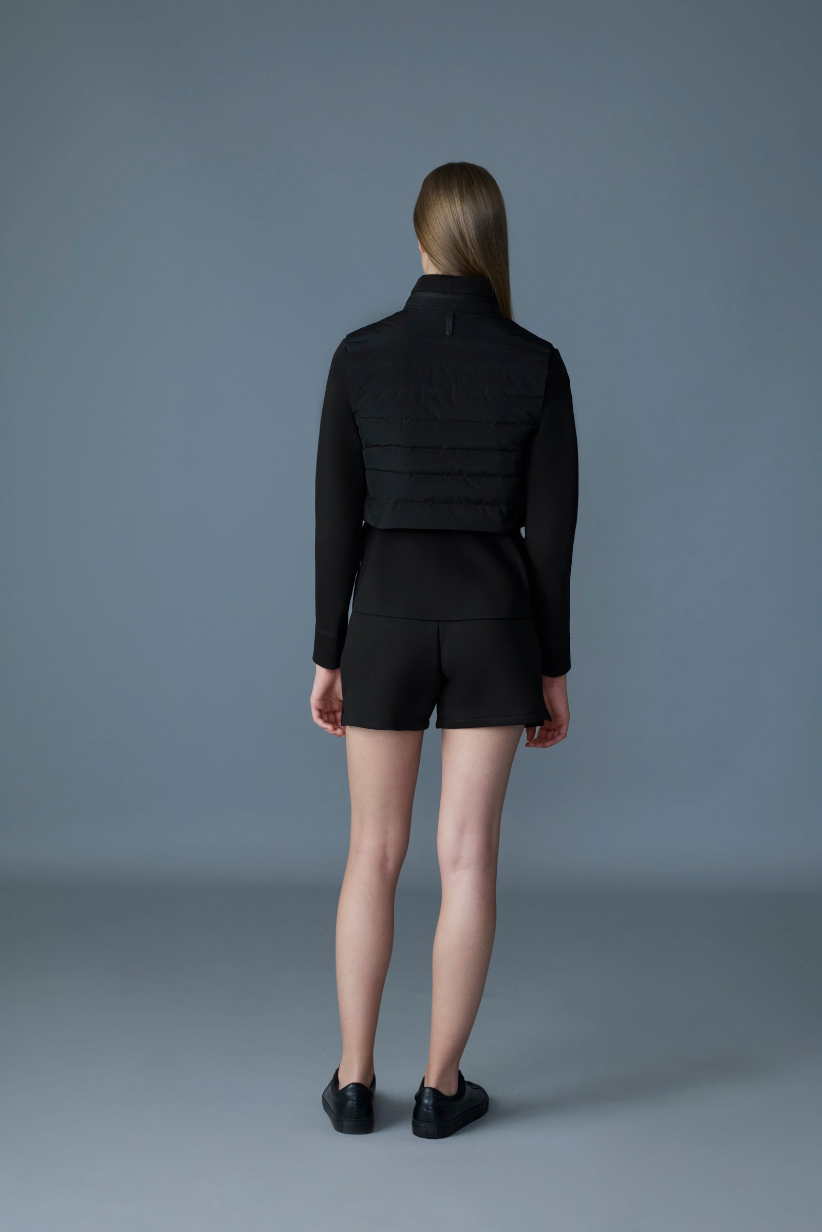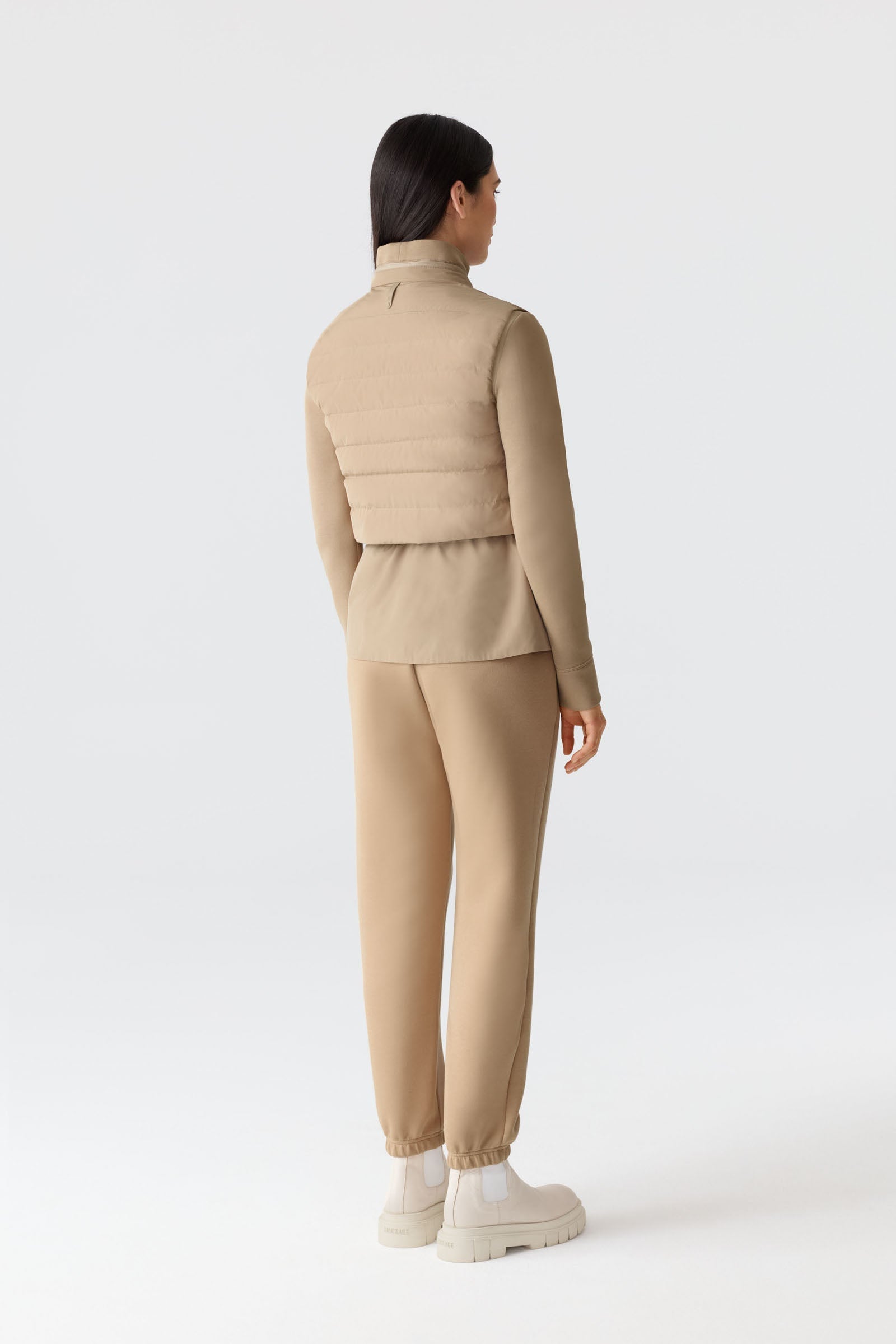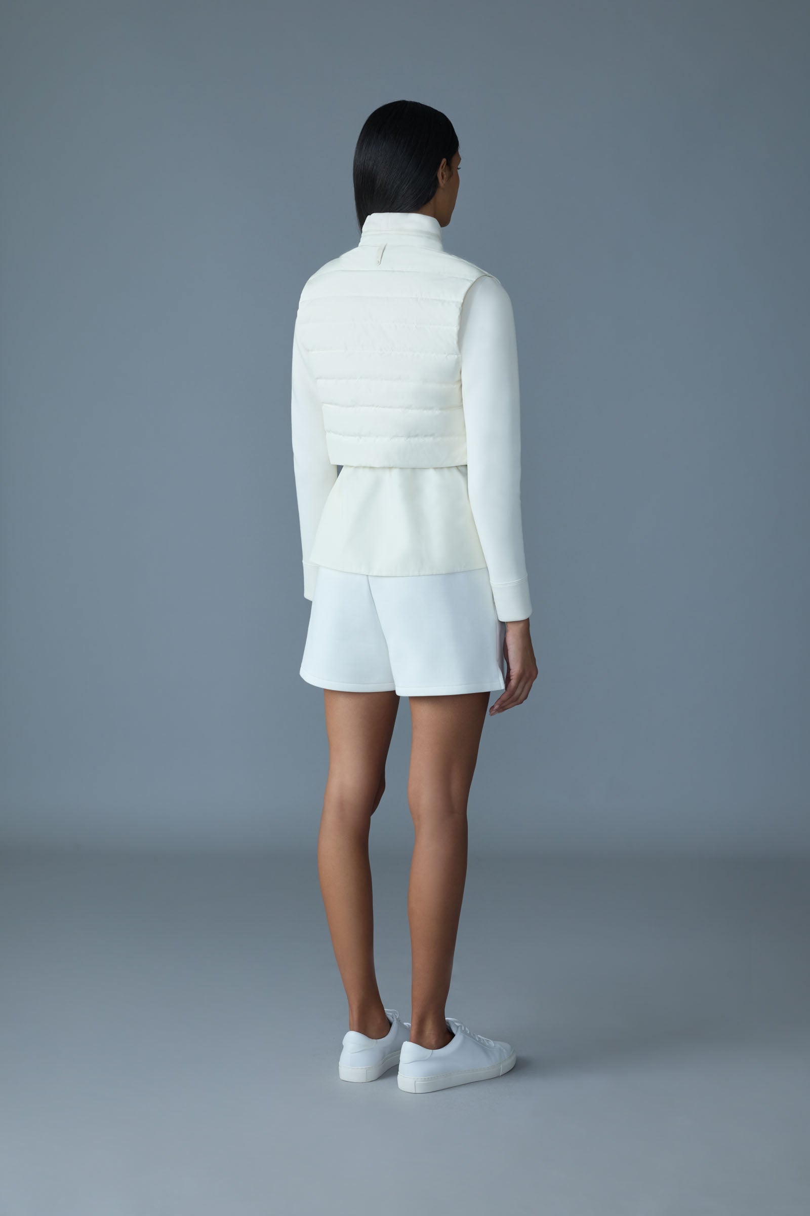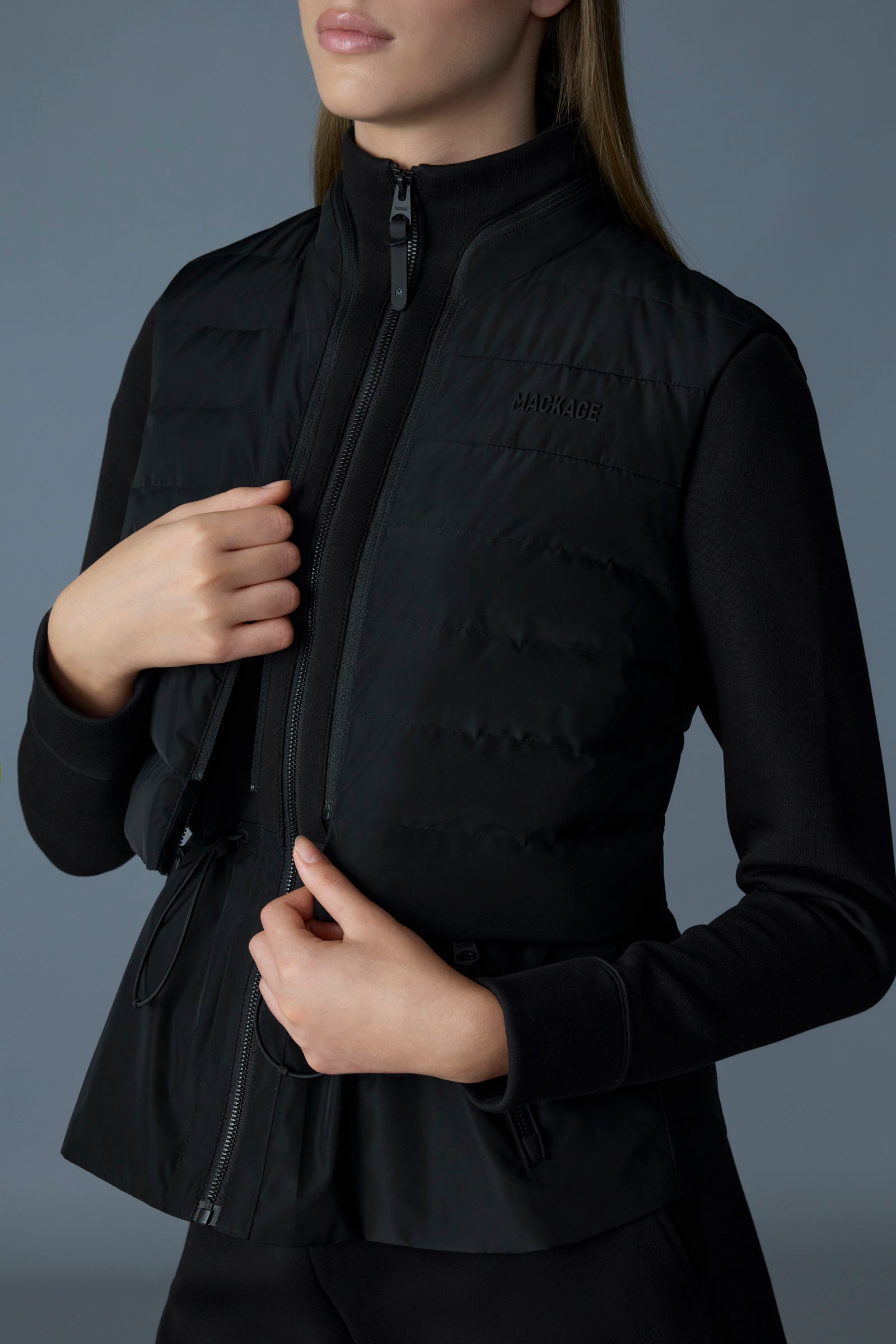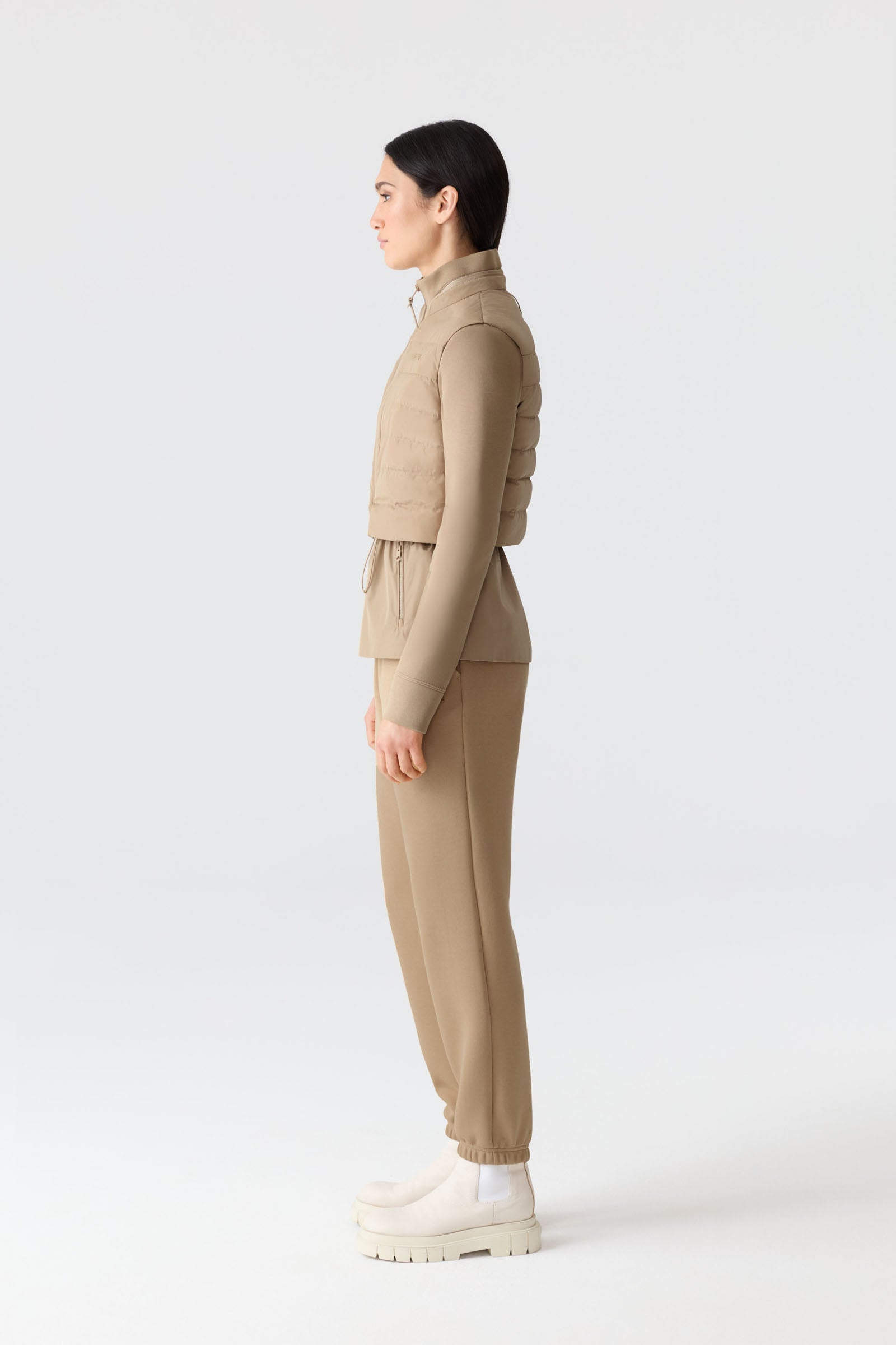 PRISCILLA is a 3-in-1 mixed-media jacket for women featuring a rainwear peplum and recycled lustrous light down front. An expertly tailored indoor-outdoor style, soft double-face jersey accents the sleeves, back, and collar. Perfect for everyday, the drawcord waist lends a custom fit and cinched silhouette. Remove the down vest layer for lighter shell jacket.