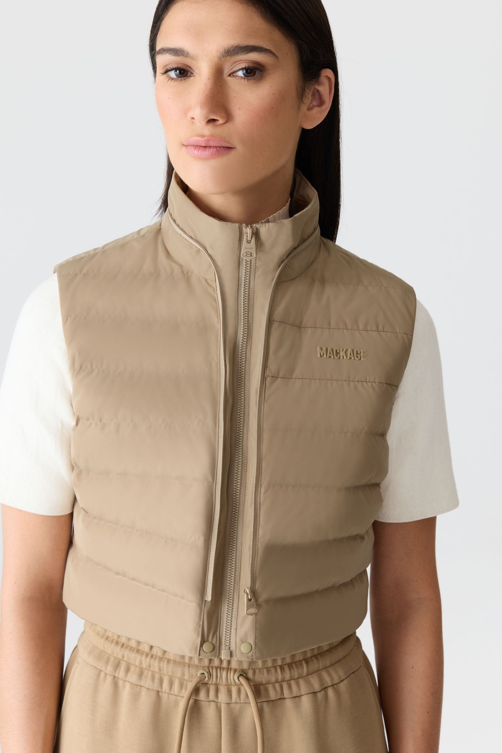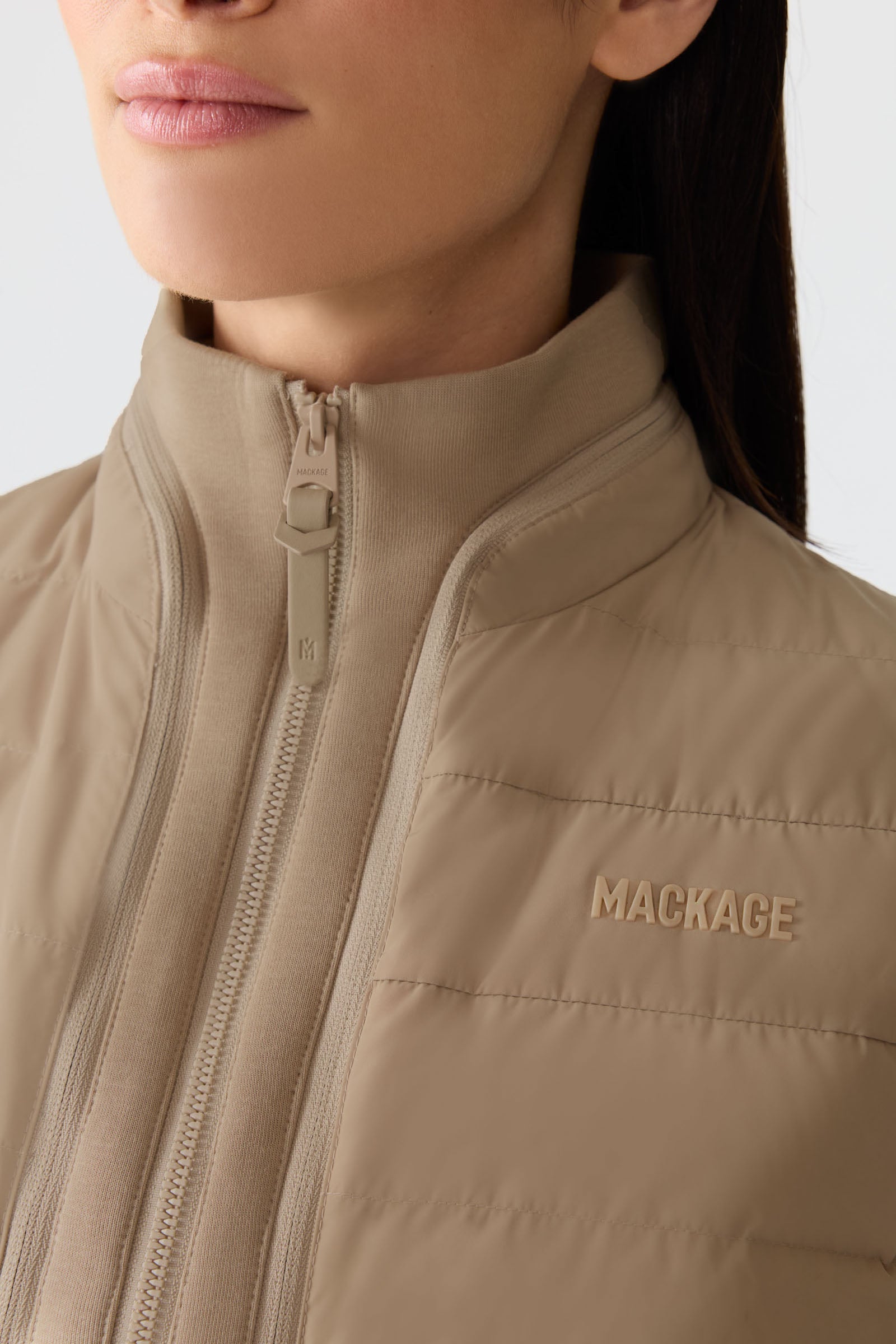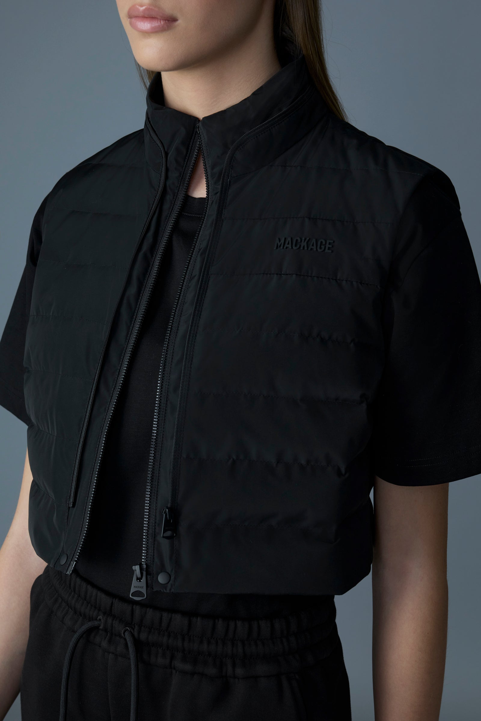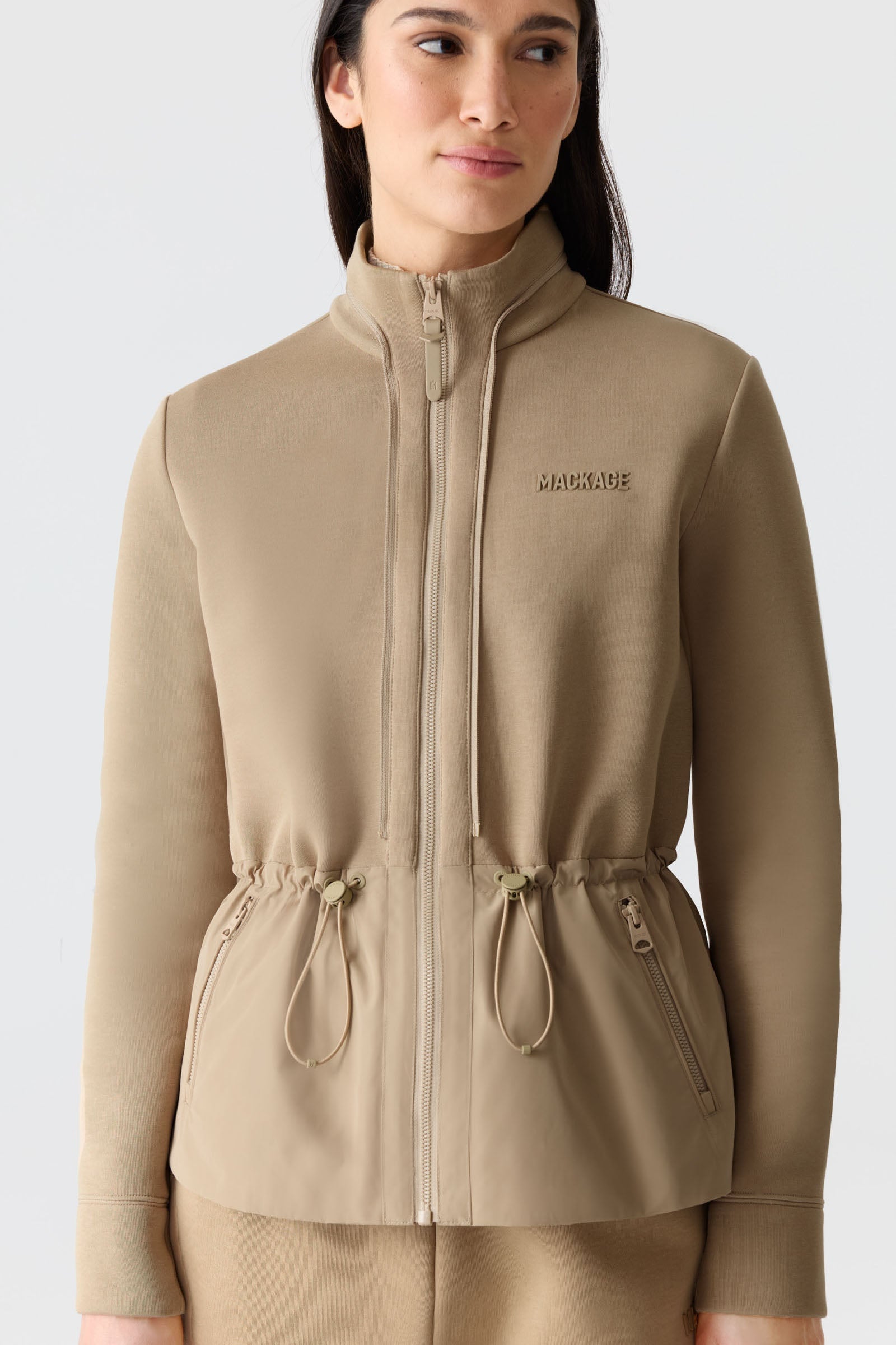 PRISCILLA is a 3-in-1 mixed-media jacket for women featuring a rainwear peplum and recycled lustrous light down front. An expertly tailored indoor-outdoor style, soft double-face jersey accents the sleeves, back, and collar. Perfect for everyday, the drawcord waist lends a custom fit and cinched silhouette. Remove the down vest layer for lighter shell jacket.