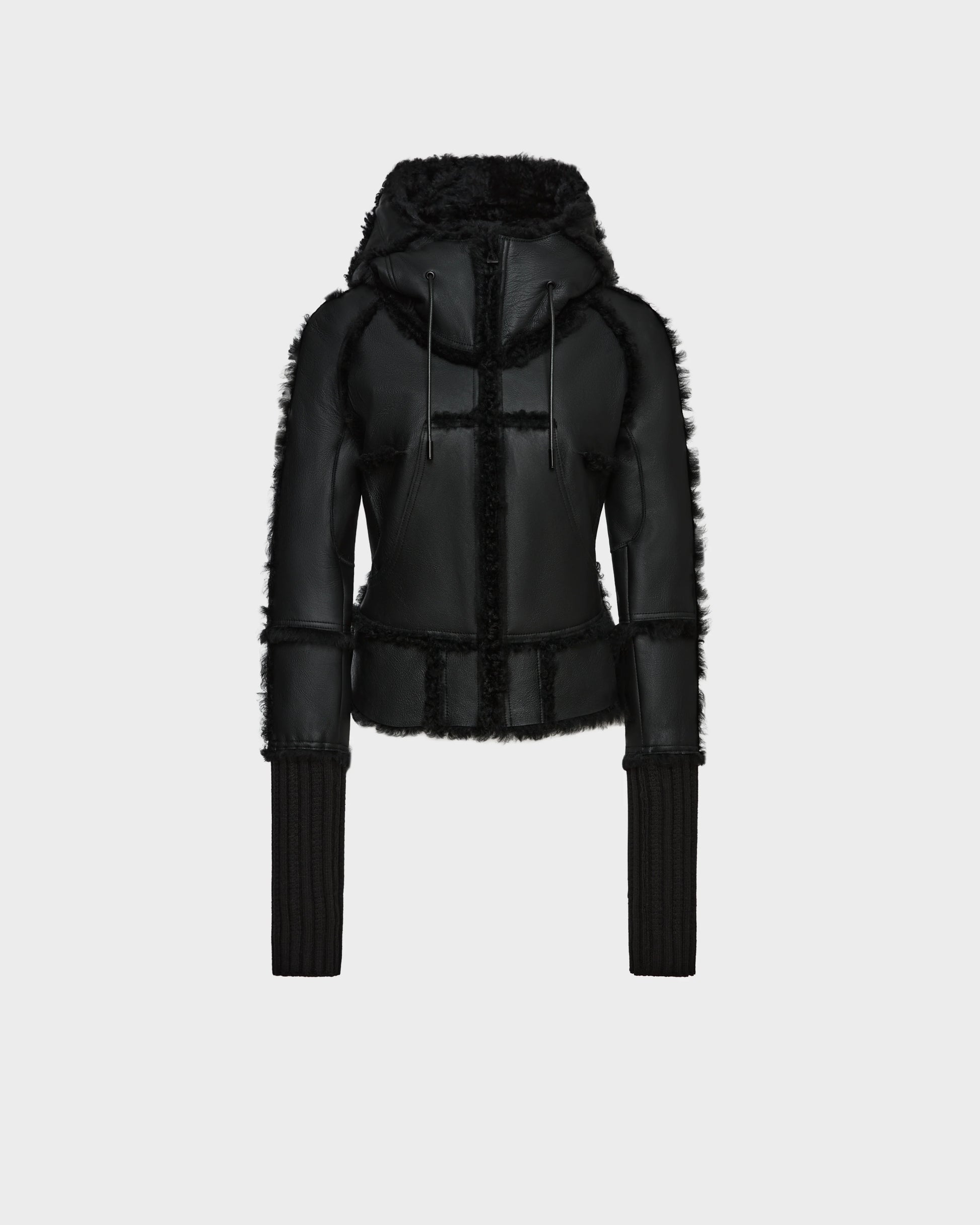 The ROBERTA by RUDSAK is a women's fitted cropped bomber jacket with hood designed in a luxurious shearling with and tonal knit arm details, offering a perfect blend of warmth and style. The sleek silhouette accentuates the figure, while the cropped length adds a modern edge. Ideal for layering, this bomber jacket combines the cozy feel of shearling with the versatility of knit, making it a chic addition to any cold-weather wardrobe. Stay fashion-forward and warm with the ROBERTA bomber.